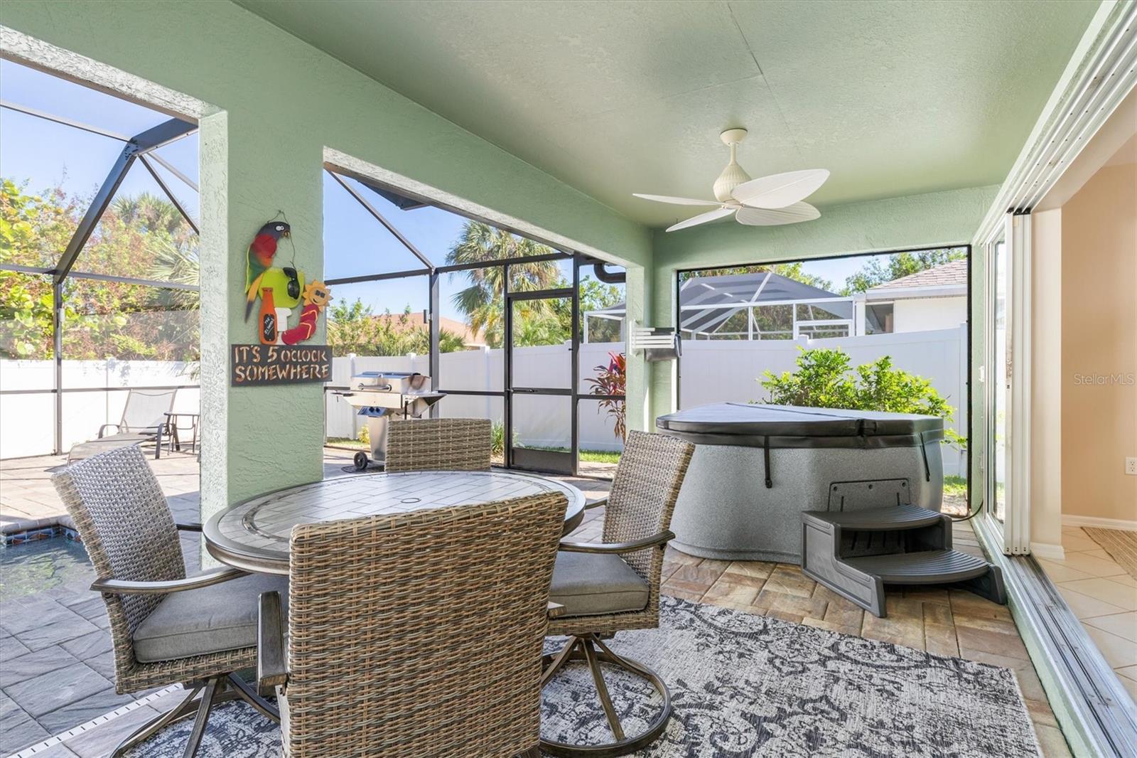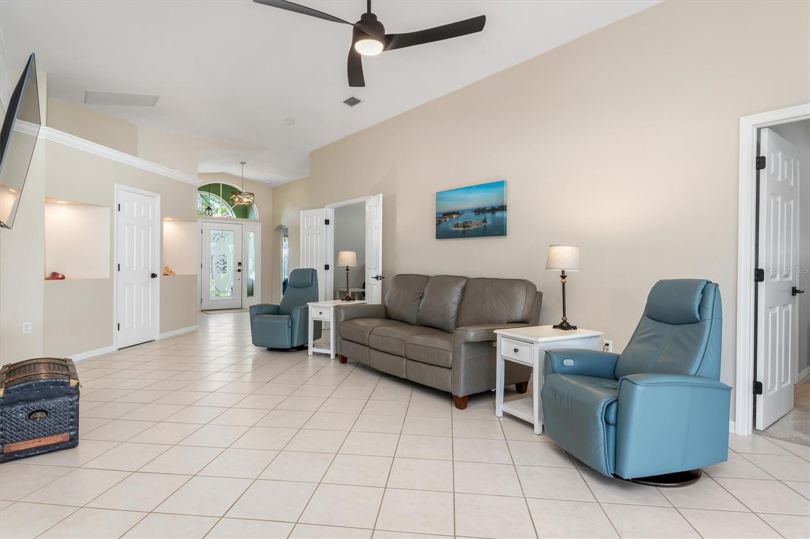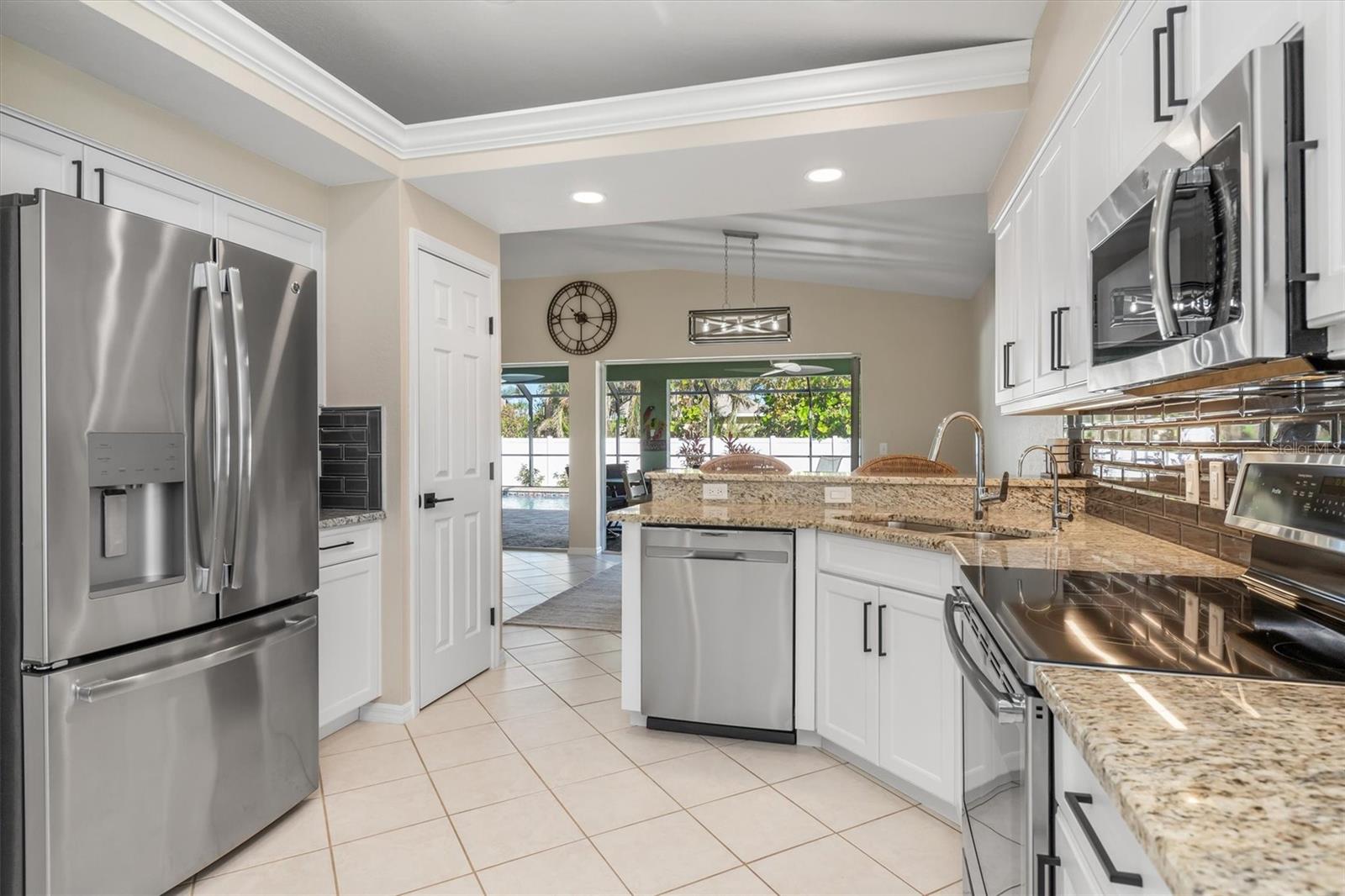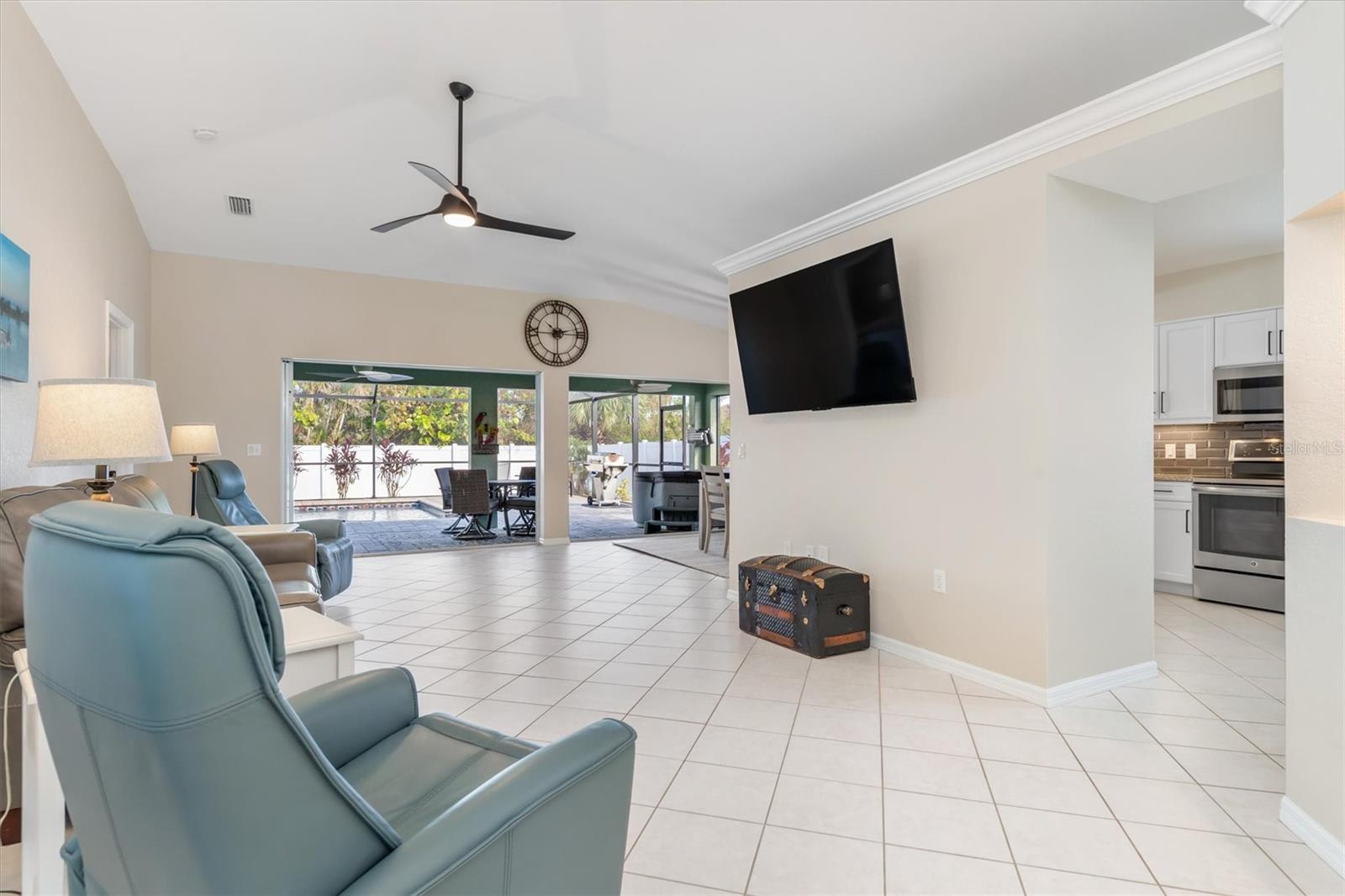 Huge price adjustment! Welcome to this beautifully updated 3-bedroom, 2-bath home with a garage, offering a perfect blend of comfort and style. Featuring high ceilings and two sets of sliding wall doors that lead to a spacious screened lanai, this home is ideal for both relaxation and entertaining. Freshly painted throughout with new door hardware and updated light fixtures, every detail has been thoughtfully designed. The garage is a standout, with an epoxy-coated floor and a convenient washtub. Outside, enjoy a heated gunite saltwater pool with a sunshelf, installed in 2021, and surrounded by a screened cage and newly resealed pavers. The pool area is perfect for year-round enjoyment. The property also includes a separate 6" concrete drive with a double gate that leads to RV parking and a 50 amp electric hookup. Plenty of room to store your trailers and extra vehicles within a secured gated area. Plenty of room to add a garage or mancave. (This property allows for a stand-alone structure. Does not require attachment to the home) Property had NO hurricane damage & is NOT IN A FLOOD ZONE. Located on a quiet, double lot with a privacy fence, you'll have plenty of space to relax. The irrigation system is supplied by a well, offering reduced water bills. Many recent large ticket improvements include: Roof (2022) HVAC (2024), Water Heater (2023), Additional insulation (2024), Kinetico water filtration/softener system w/reverse osmosis for kitchen (2023), Dishwasher (2025), New laundry cabinetry, Pool pavers cleaned & sealed (2024), Fresh interior paint, updated lighting fixtures & updated door hardware. Conveniently located close to marinas, beaches, restaurants, and shopping, this home offers the perfect combination of comfort, privacy, and location. Don't miss out on this amazing opportunity!