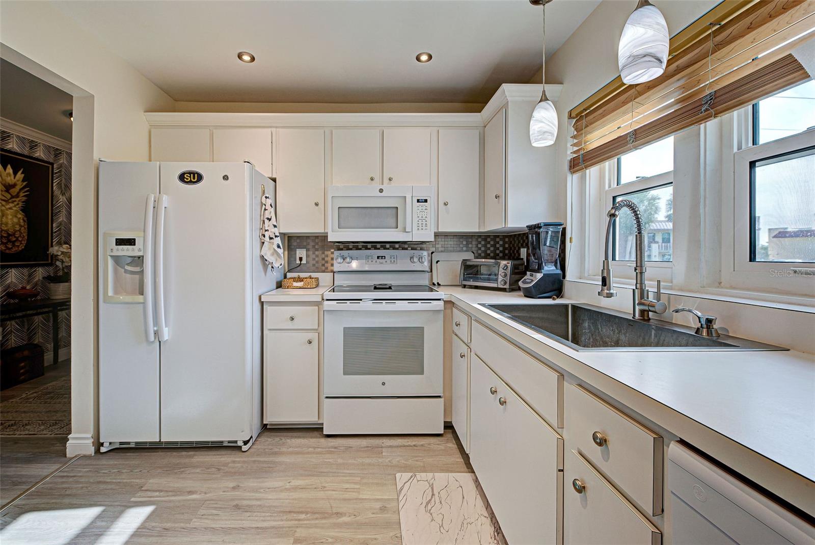 This is the ONE you have been waiting for: TURNKEY FURNISHED beautifully updated condo, located in the vibrant waterfront community of Riverhouse. This unique unit is one of only two ground floor end bungalows in the complex – no one living below nor above. This Bungolow Condo has one of the largest footprints in the complex and features a manicured lawn on three sides, along with beautiful gardens surrounding. This unique home has recently been updated with all these new items: Roof, HURRICANE IMPACT WINDOWS AND SLIDERS, Drywall, Crown molding, Circuit breaker Box, all Wall Switches and Plugs, new Vanities and Faucets in both bathrooms, Fans and Light Fixtures and the whole unit has been freshly painted in 2023. Great opportunity to swap snow for sunshine! When you pull into your reserved parking space and step through your front door, you are greeted with endless modern updates such as waterproof luxury vinyl plank flooring, 5-inch-high baseboards, crown molding, attractive wall colors and a console table in your entry. The kitchen offers ample counter and cabinet space. Your spacious great room flows right out to the back lanai, equipped with sofa, comfy chairs, large entertainment center including TV. Wake up in your large master bedroom with adjustable King Bed, Nightstands and Dresser and use your en-suite bathroom to get ready for the day. The Guest Bedroom comes with Queen Set and another great bathroom. Play Tennis, Pickleball, or Shuffleboard, relax by one of your two community pools, fish at the dock, or participate in one of the many community activities. Beaches, restaurants, shopping, and golf courses are just minutes away. The newly-installed kayak racks are another great feature of Riverhouse that may persuade you to paddle through the Rotonda River or bring them a short distance to Lemon Bay. Or just relax on your lanai with a good book! This unit is perfectly positioned, with no neighbors above you, so privacy is never a problem! The new stainless in-unit washer and dryer is a rarity for this complex, making it quick and convenient to do laundry. These units are rarely available, do not miss this, call today to start living the Florida lifestyle!
