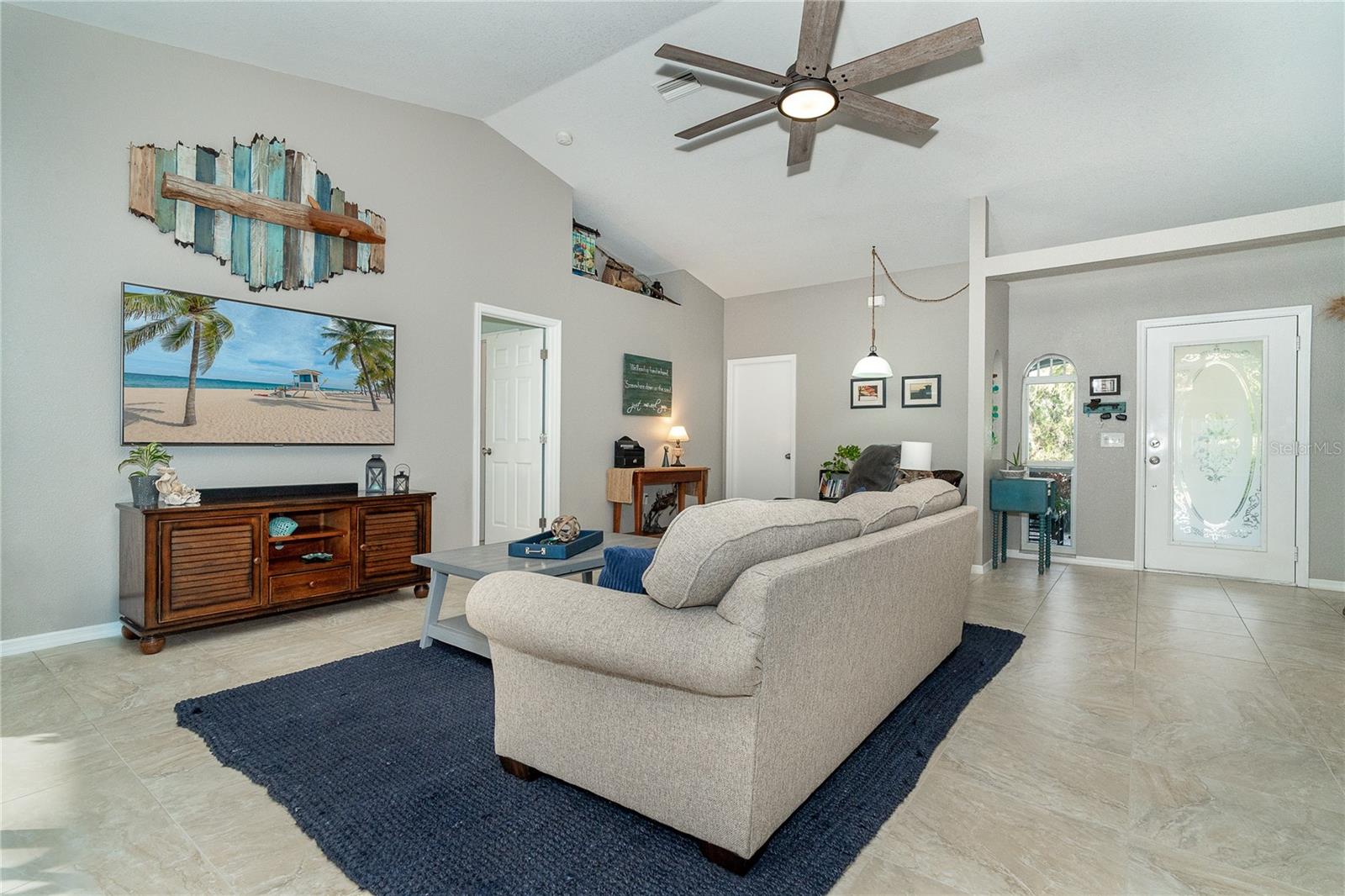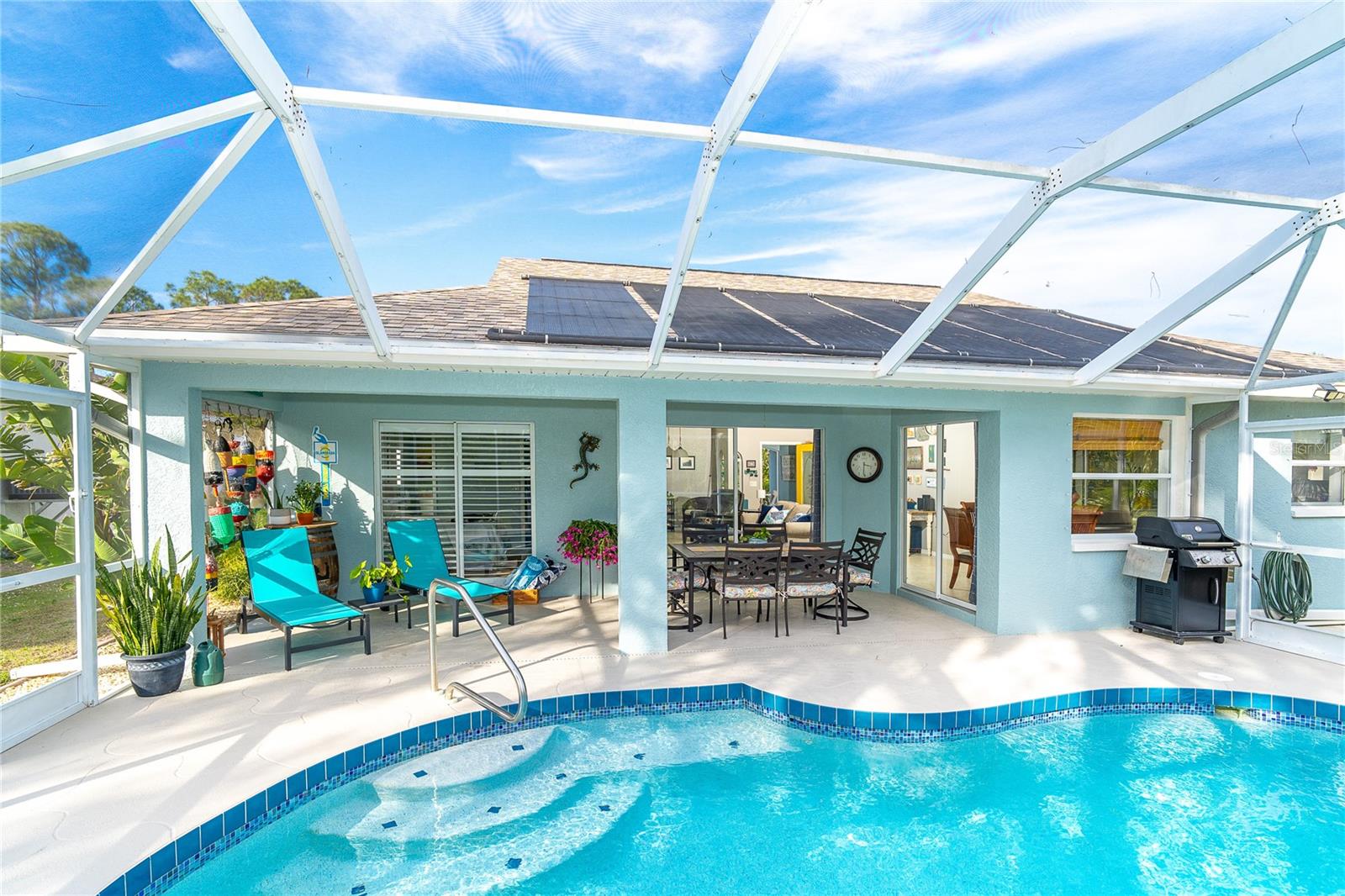 Welcome to your private oasis! This exceptional 3-bedroom, 2-bathroom POOL home is situated on a rare and expansive DOUBLE LOT in an X FLOOD ZONE (which does not Require Flood Insurance) and offers unparalleled space, privacy, and versatility. Thoughtfully updated and meticulously maintained, this property combines modern style with practical comforts. Step inside to an inviting open floor plan filled with natural light, enhanced by 3 sets of sliding glass doors in the living room, dining room, and primary bedroom that open to the outdoor space providing easy access to the patio and pool area. The updated kitchen (2021) boasts sleek finishes such as pine tongue and groove ceiling and a functional layout perfect for entertaining or everyday living. Both bathrooms have been tastefully updated, adding to the home’s contemporary charm. Your private backyard oasis is a true highlight of this property. The resurfaced and retiled solar-heated pool (2019) is perfect for relaxing or entertaining, complete with a 2015 pool heater and a 2022 pool pump for year-round enjoyment. Surrounded by mature landscaping and nestled within the privacy of a double lot, this outdoor space offers the perfect blend of tranquility and functionality. Additional features include hurricane shutters for added peace of mind, landscape curbing, gutters surrounding the entire home, and numerous updates: plantation shutters, newer flooring throughout (2019), a 2025 A/C system, a 2016 roof, and a 2015 hot water heater. Fresh exterior paint and interior paint (2022) ensure a modern and move-in-ready aesthetic. Furnishings are optional under a separate contract. Rotonda West offers an unbeatable location, with stunning beaches, boating, fishing, golfing, dining, and shopping all just 5 to 15 minutes away. Whether you prefer the serene shores of Englewood Beaches or the pristine sands of Boca Grande, this location truly has it all! Don’t miss the chance to own this beautifully updated and private retreat.