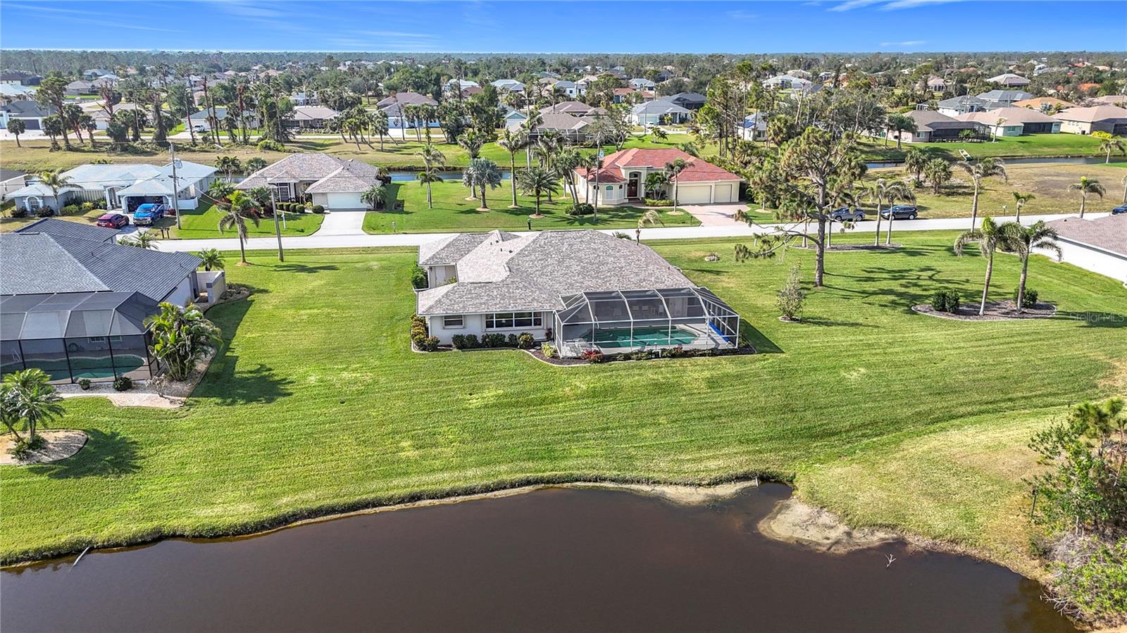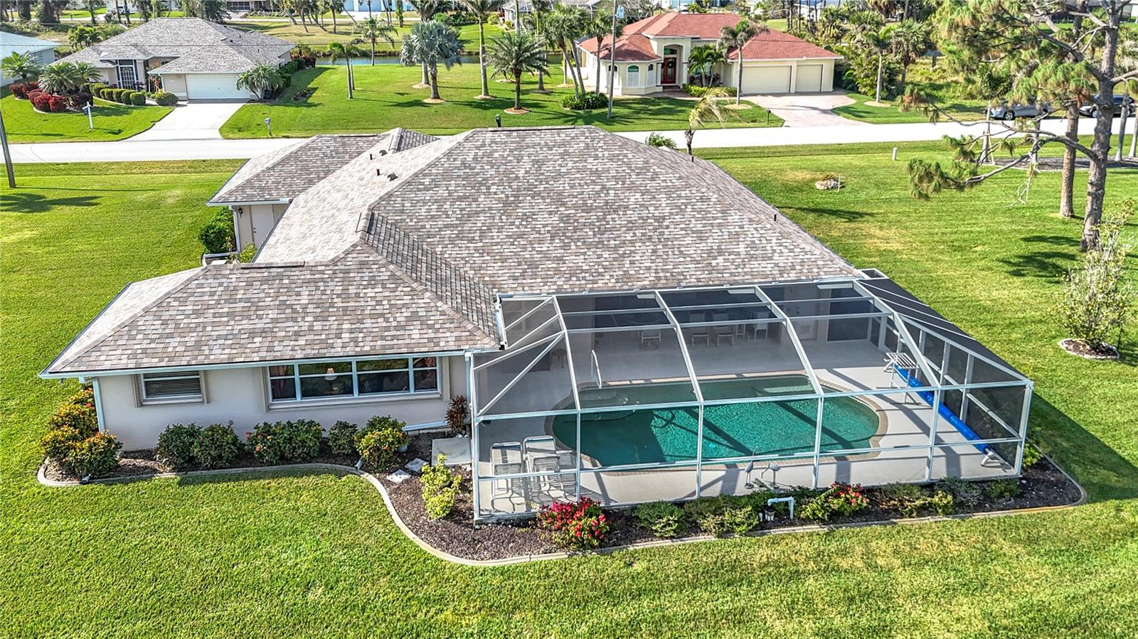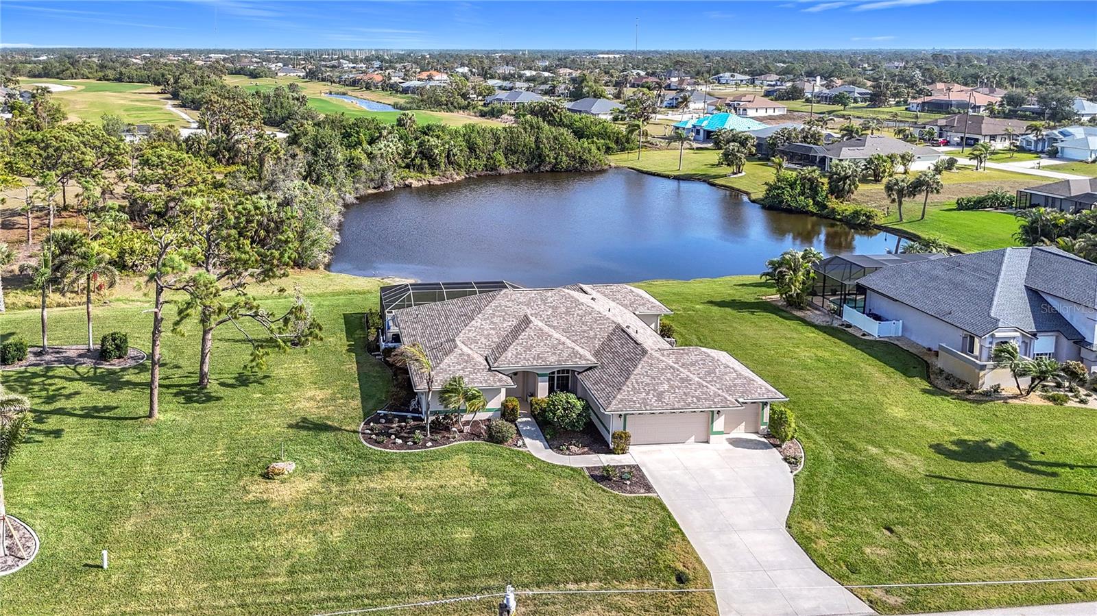 Open unobstructed Waterfront View. This meticulously maintained 3 Bedroom, 2 and 1/2 Bathroom 3 car Garage home is located on two 80 x 120 waterfront lots which overlook a Beautiful Pond and the Long Meadow Golf Course. There is a separate Living Room, Dining Room, Family Room and Private Office/Den. The home is bathed in natural light from its abundant windows, sliding glass doors and Soaring ceilings. Many upgrades have been performed such as New Water Heater in 2019, Irrigation Pump in 2022, Roof 2021, Gutters 2021, 1/2 Roof replacement 2023, Pool Heater 2023, Pool Pump 6/2025, Pool Cage 2023 and some carpet and vinyl replaced 2023. Hurricane accordion shutters have been installed on all windows and doors and there are electric roll down shutters on the lanai for added peace of mind. Beautifully Landscaped. Rotonda West is a Deed Restricted Subdivision with Central Water and Sewer. Conveniently located to Shopping, Restaurants, Gulf Beaches, Marinas with Direct Access to the Intercoastal Waterway and the Gulf of Mexico. Surrounded by Golf Courses and just a short distance to Boca Grande Island and World Class Fishing.