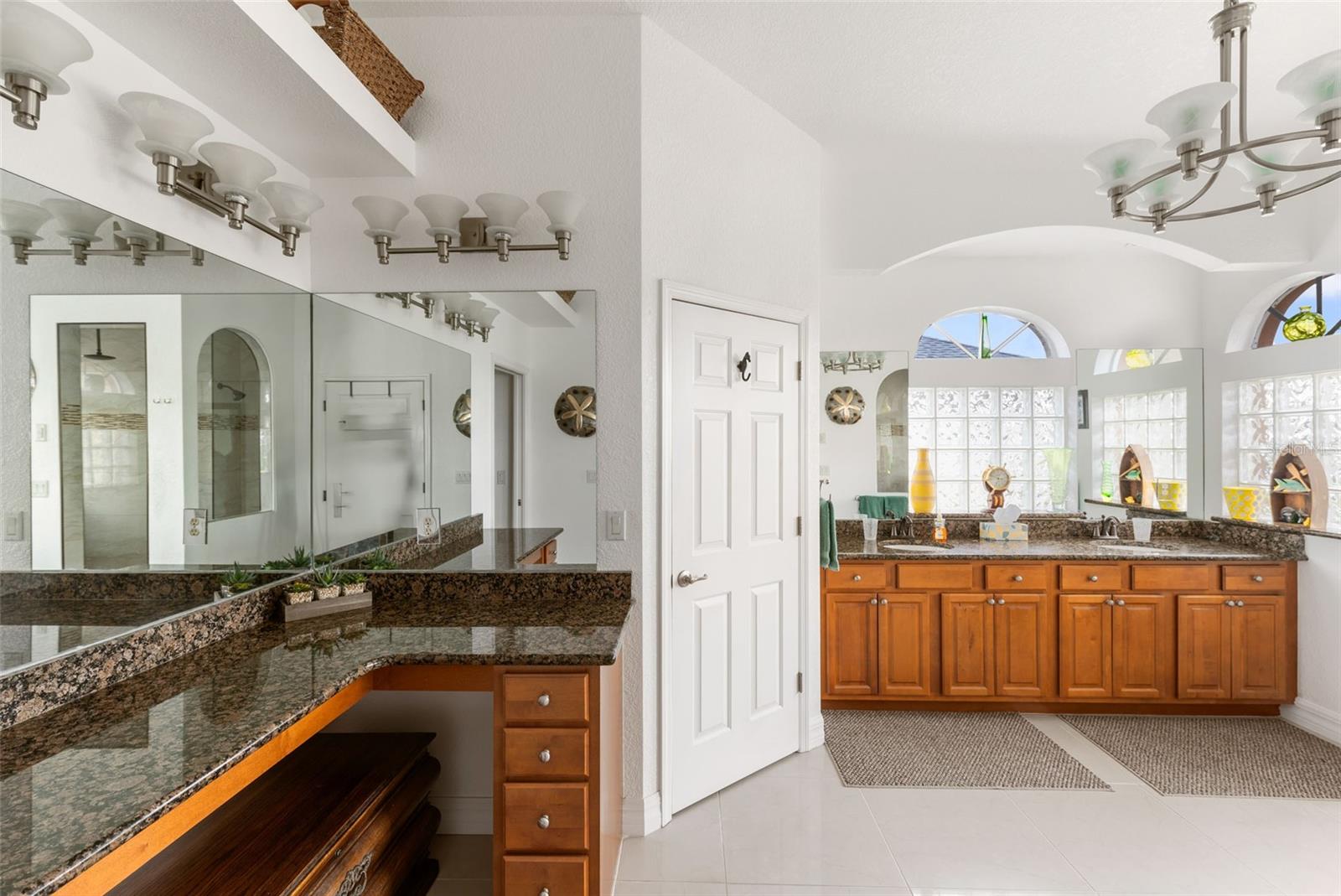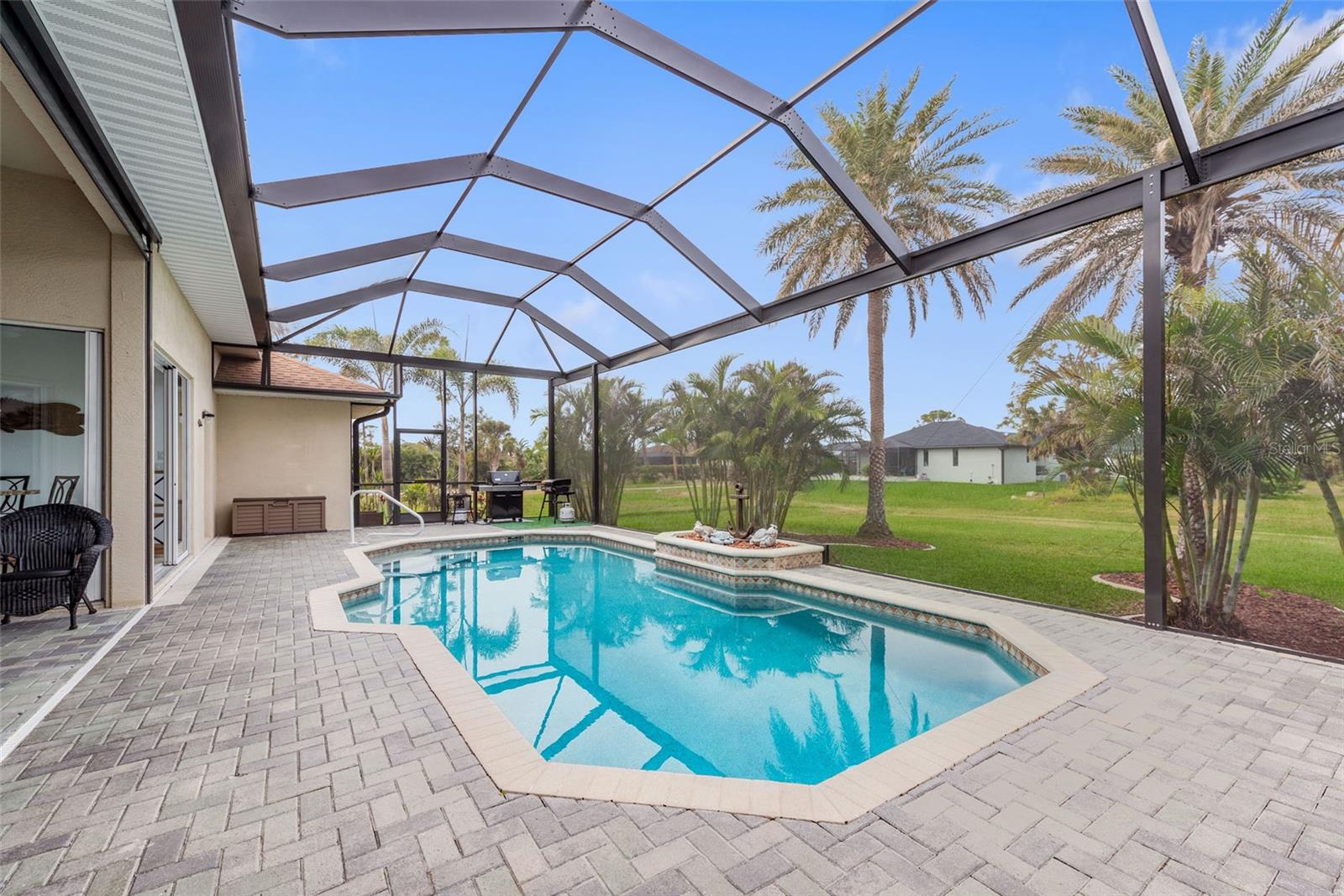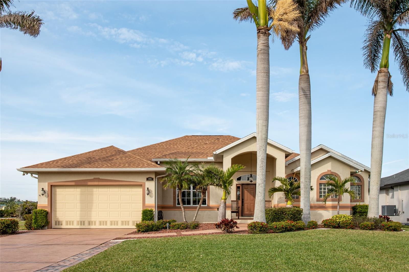 This stunning home, built as a "builder's model," boasts exceptional features throughout. 24x24 porcelain tile graces the living spaces, while luxury vinyl flooring adds warmth to all bedrooms. Situated on an oversized 200x80 lot on a serene greenbelt, this home offers a tranquil setting. Upon entering, you'll be greeted by 11-foot ceilings and a lighted art niche. The spacious living room features 11-foot ceilings with a captivating 12-foot tray ceiling, a ceiling fan, and a lighted display shelf. The kitchen showcases maple wood cabinets with elegant lighting above, granite countertops, and a stainless steel double sink with a disposal. Lighted display shelves, under-cabinet lights, a ceiling fan, and recessed lights enhance the ambiance and functionality. High-end LG stainless steel appliances with internet connectivity, including a stove, fridge, microwave, and dishwasher, complete this culinary haven. The dining room, adorned with 11-foot ceilings and an art niche, provides a formal space for entertaining. The master bedroom is a true retreat, featuring 10-foot tray ceilings, an 8-foot slider leading to the pool, and a spacious walk-in closet with a 9-foot ceiling and additional shelving above the clothes rack. The master bathroom is a spa-like oasis with cathedral ceilings, glass block windows, and a double sink vanity with a stone countertop. A jetted tub and a large shower with four showerheads (two standard, two rain) offer ultimate relaxation. Tile floors and walls, a glass door, a private toilet room, large linen closet, chandelier, and recessed lights complete this luxurious space. The expansive lanai is an entertainer's paradise. A sparkling pebble tech pool, heated and adorned with a waterfall, is the centerpiece. The pool cage features a panorama screen, and the surrounding pool deck is complete with pavers. An outdoor shower, a covered sitting area, and an outdoor paver area for grilling provide ample space for relaxation and enjoyment. Rear landscape lighting adds a touch of magic to the evening. The guest bathroom features a tub/shower combination with a door leading to the pool, a single bowl sink, a wood vanity, Corian countertops, and storage cabinets above. The laundry room is equipped with a GE Profile washer and dryer, a storage closet for small appliances, a wood cabinet with a sink, and a convenient fold-down ironing board. The two-car garage boasts an epoxy floor, an 8-foot high hurricane-rated door, a 200-amp electrical panel, and an irrigation system. Additional features include special outlets in the front soffit for Christmas lights with an inside switch and 8-foot high doors throughout the home. If you’re looking for a home that is truly exceptional, offering a luxurious and comfortable lifestyle, than look no further. Schedule your private showing today!