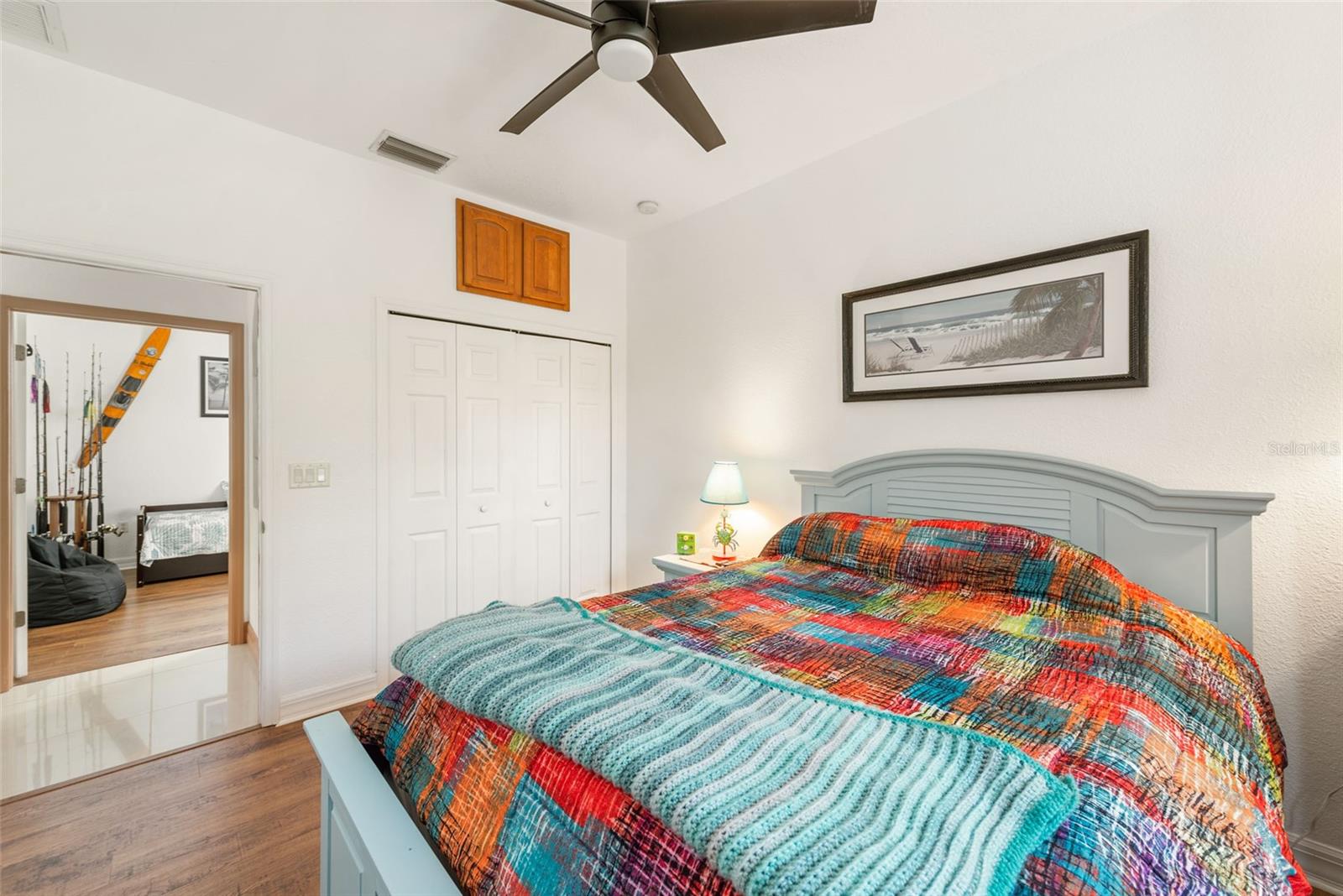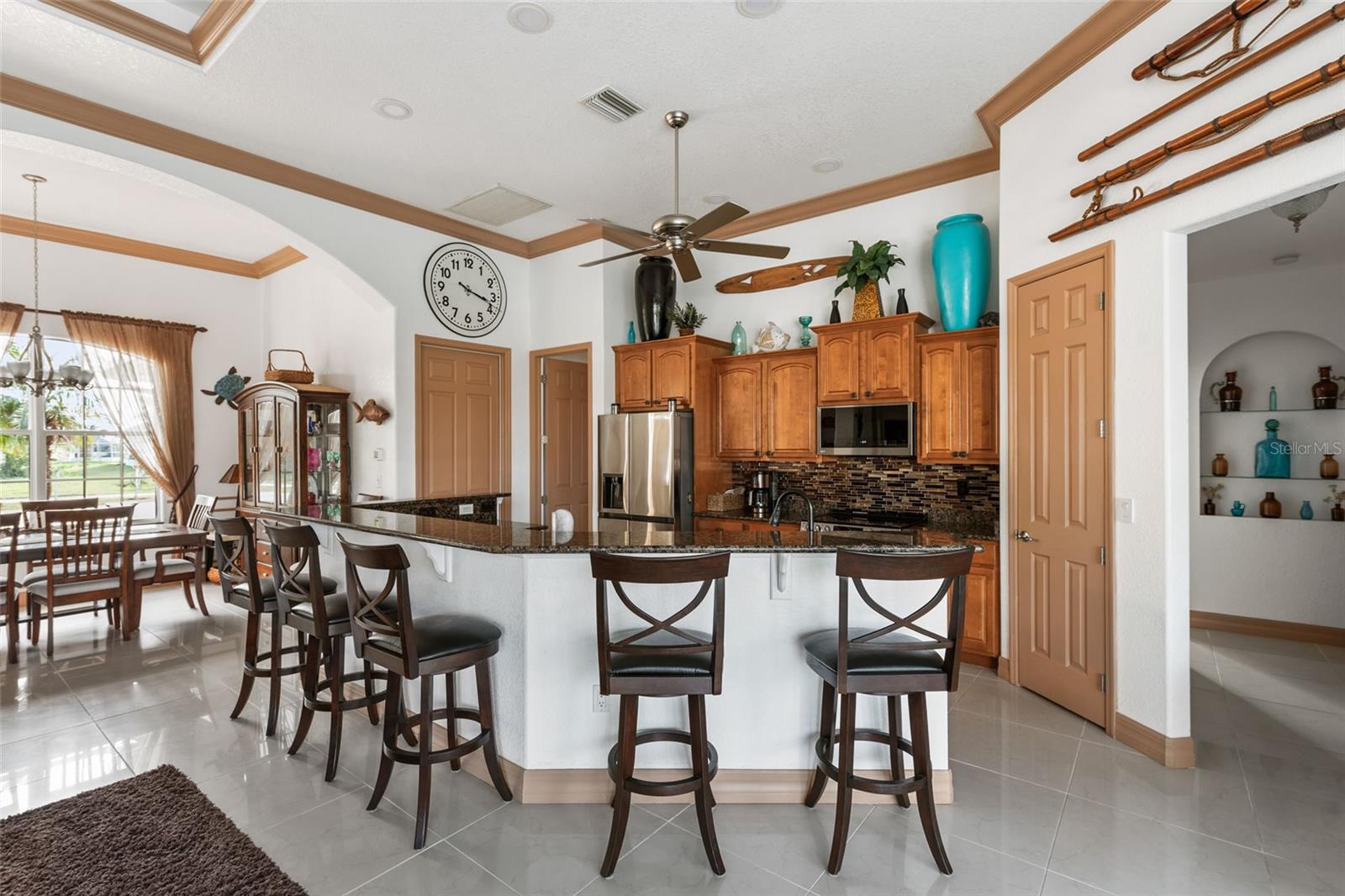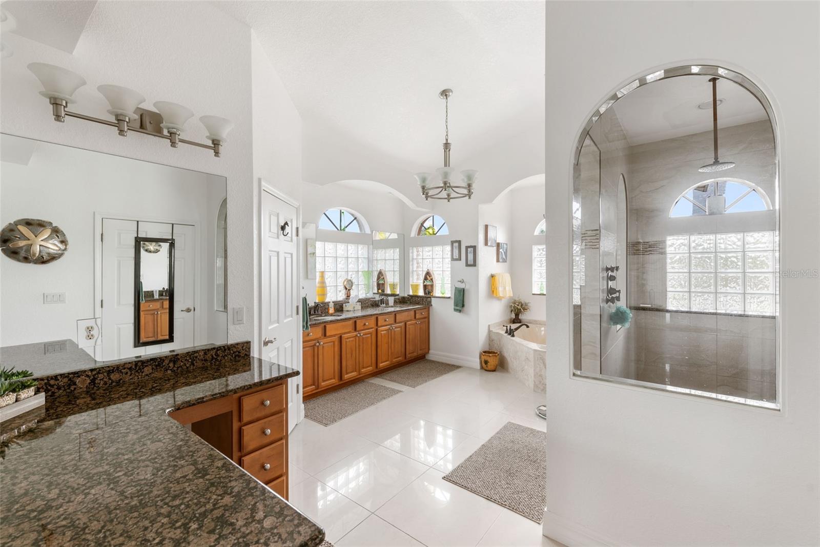 This stunning home, built as a "builder's model," boasts exceptional features throughout. 24x24 porcelain tile graces the living spaces, while luxury vinyl flooring adds warmth to all bedrooms. Situated on an oversized 200x80 lot on a serene greenbelt, this home offers a tranquil setting. Upon entering, you'll be greeted by 11-foot ceilings and a lighted art niche. The spacious living room features 11-foot ceilings with a captivating 12-foot tray ceiling, a ceiling fan, and a lighted display shelf. The kitchen showcases maple wood cabinets with elegant lighting above, granite countertops, and a stainless steel double sink with a disposal. Lighted display shelves, under-cabinet lights, a ceiling fan, and recessed lights enhance the ambiance and functionality. High-end LG stainless steel appliances with internet connectivity, including a stove, fridge, microwave, and dishwasher, complete this culinary haven. The dining room, adorned with 11-foot ceilings and an art niche, provides a formal space for entertaining. The master bedroom is a true retreat, featuring 10-foot tray ceilings, an 8-foot slider leading to the pool, and a spacious walk-in closet with a 9-foot ceiling and additional shelving above the clothes rack. The master bathroom is a spa-like oasis with cathedral ceilings, glass block windows, and a double sink vanity with a stone countertop. A jetted tub and a large shower with four showerheads (two standard, two rain) offer ultimate relaxation. Tile floors and walls, a glass door, a private toilet room, large linen closet, chandelier, and recessed lights complete this luxurious space. The expansive lanai is an entertainer's paradise. A sparkling pebble tech pool, heated and adorned with a waterfall, is the centerpiece. The pool cage features a panorama screen, and the surrounding pool deck is complete with pavers. An outdoor shower, a covered sitting area, and an outdoor paver area for grilling provide ample space for relaxation and enjoyment. Rear landscape lighting adds a touch of magic to the evening. The guest bathroom features a tub/shower combination with a door leading to the pool, a single bowl sink, a wood vanity, Corian countertops, and storage cabinets above. The laundry room is equipped with a GE Profile washer and dryer, a storage closet for small appliances, a wood cabinet with a sink, and a convenient fold-down ironing board. The two-car garage boasts an epoxy floor, an 8-foot high hurricane-rated door, a 200-amp electrical panel, and an irrigation system. Additional features include special outlets in the front soffit for Christmas lights with an inside switch and 8-foot high doors throughout the home. If you’re looking for a home that is truly exceptional, offering a luxurious and comfortable lifestyle, than look no further. Schedule your private showing today!
