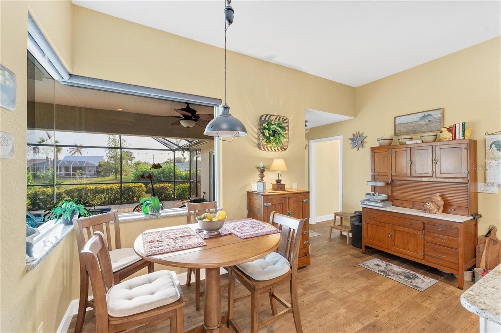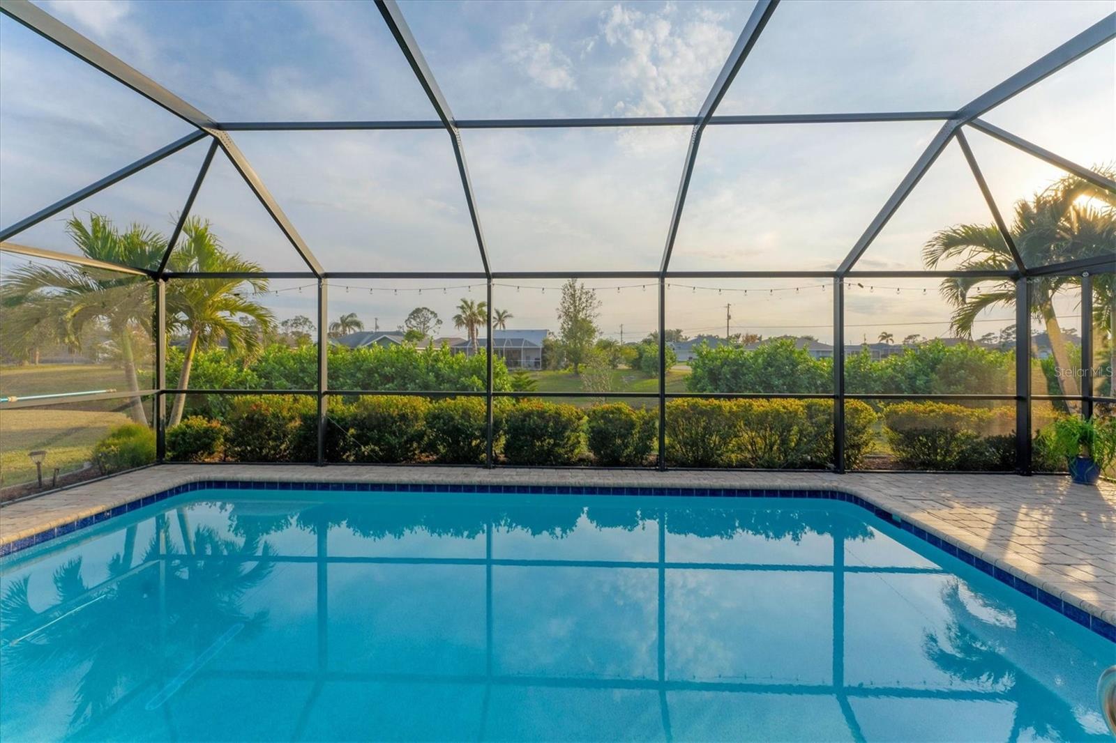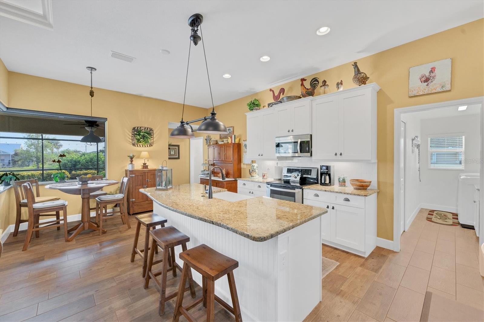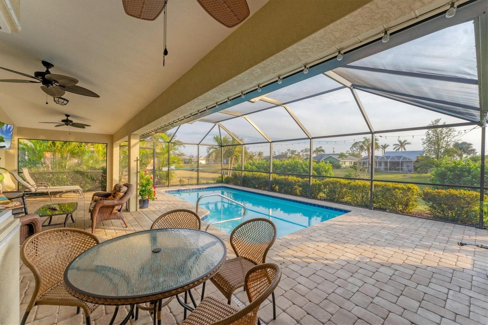 Allow the comforting ambiance of this 2019 Porter Construction home to invite you in for an escape from your worries and cares. Rife with abundant curb appeal, attention to detail, and quality construction; your Florida dream home can be found nestled on an over-sized corner lot within the highly desired community of Rotonda West. Upon entering the 8' glass-inlaid double front door, guests will appreciate spacious volume ceilings, wood-plank tile flooring, and a warm color palette that creates a welcoming feel throughout. Expansive 8' triple pocketing sliding glass doors open from the great room to the spacious lanai, gracefully integrating the indoor/outdoor living areas. Here, a sparkling pool, a brick paver pool deck, and a lush backyard await. To further enhance outdoor entertainment, the backyard features mature privacy landscaping, and the oversized corner lot provides room for ample outdoor games and activities. At the heart of this inviting residence is a well-appointed kitchen that is highlighted by soft-close wood cabinets, tile backsplash, an eat-in dinette surrounded by an aquarium window, a large work island, and abundant cabinetry that is further accentuated by a stainless-steel appliance package and granite countertops. The nearby dining room will comfortably accommodate larger crowds when needed, and a split floor plan provides privacy for owners and guests. After a fun-filled day in the sun, the Primary suite is a welcome respite. Just steps from the home’s private pool, it offers an adjacent spa-like bath with a large Roman shower featuring three showerheads, split/dual vanities, and a separate water closet. The home's 3-STALL GARAGE allows plenty of room to store your beach toys or create a hobbyist’s haven. For peace of mind and additional convenience, the home is located in the highly desirable X-FLOOD ZONE and includes an irrigation system for worry-free maintenance. The home is convenient to Broadmoor Park’s walking paths and a short drive to the Rotonda West Association offices and community center. Golf enthusiasts will appreciate the five championship courses found within the community, while beachcombers will delight in exploring the nearby beaches of Englewood and Boca Grande. If this sounds intriguing, call today to schedule a private showing, and prepare to be captivated by this vibrant, friendly community where your vacation never has to end!