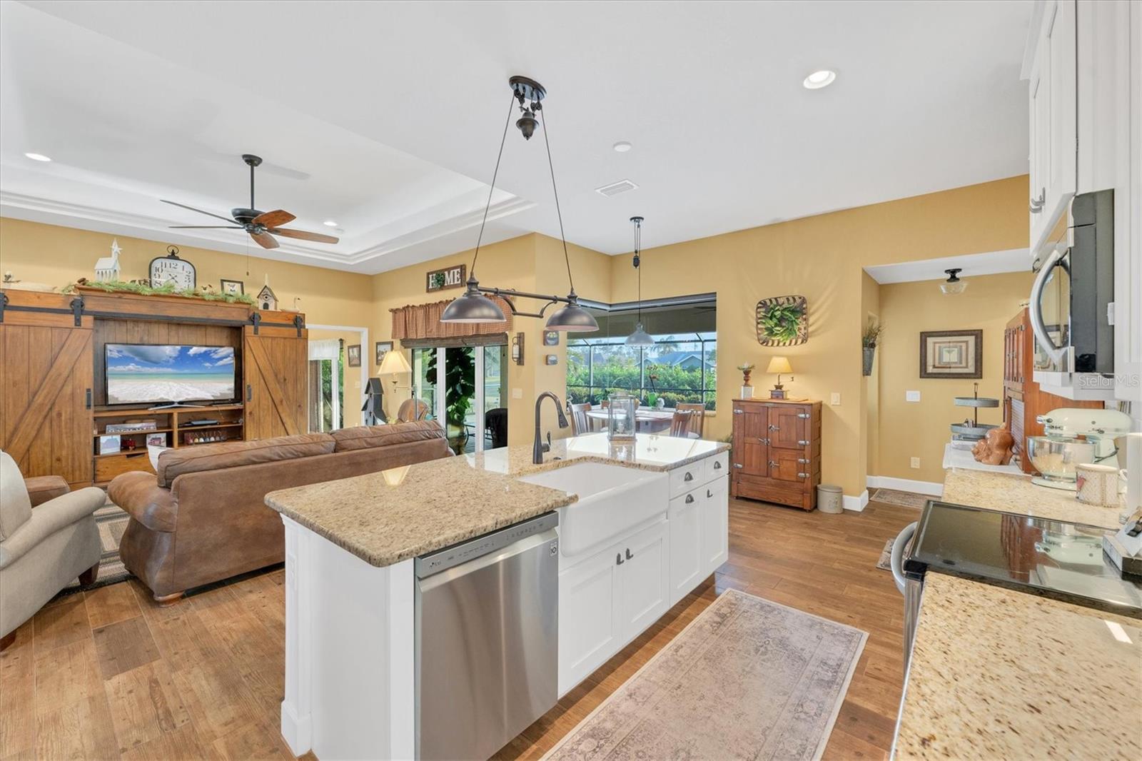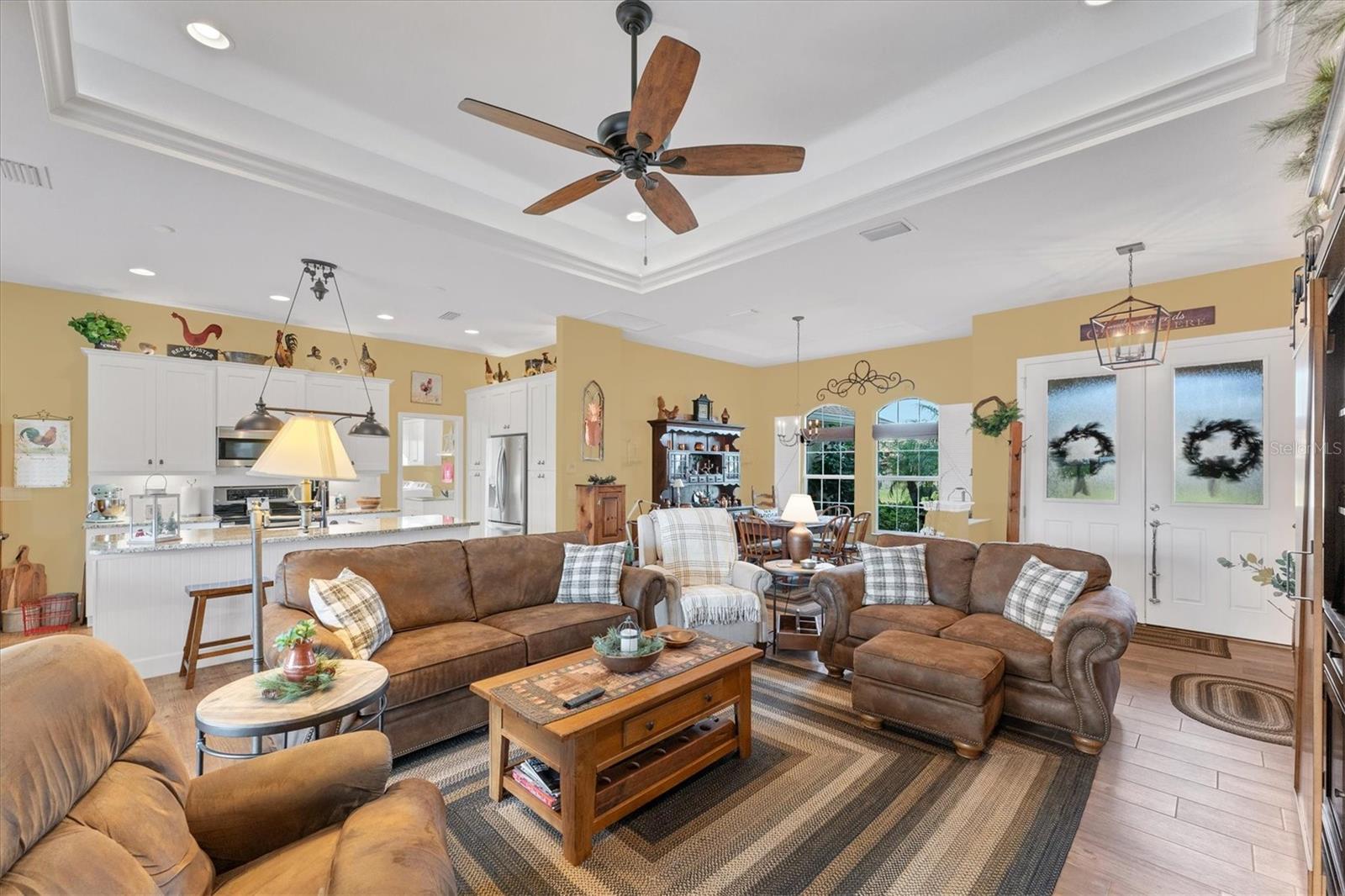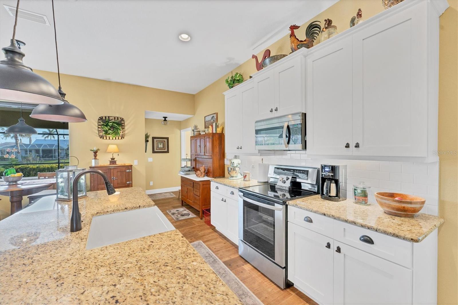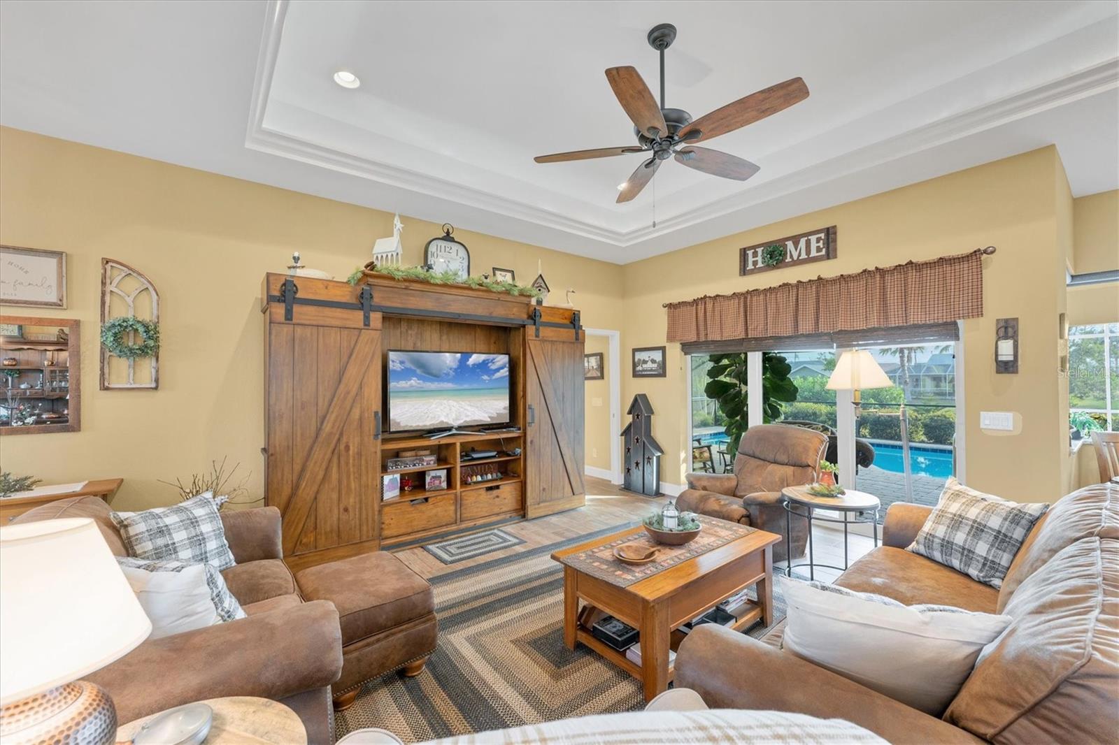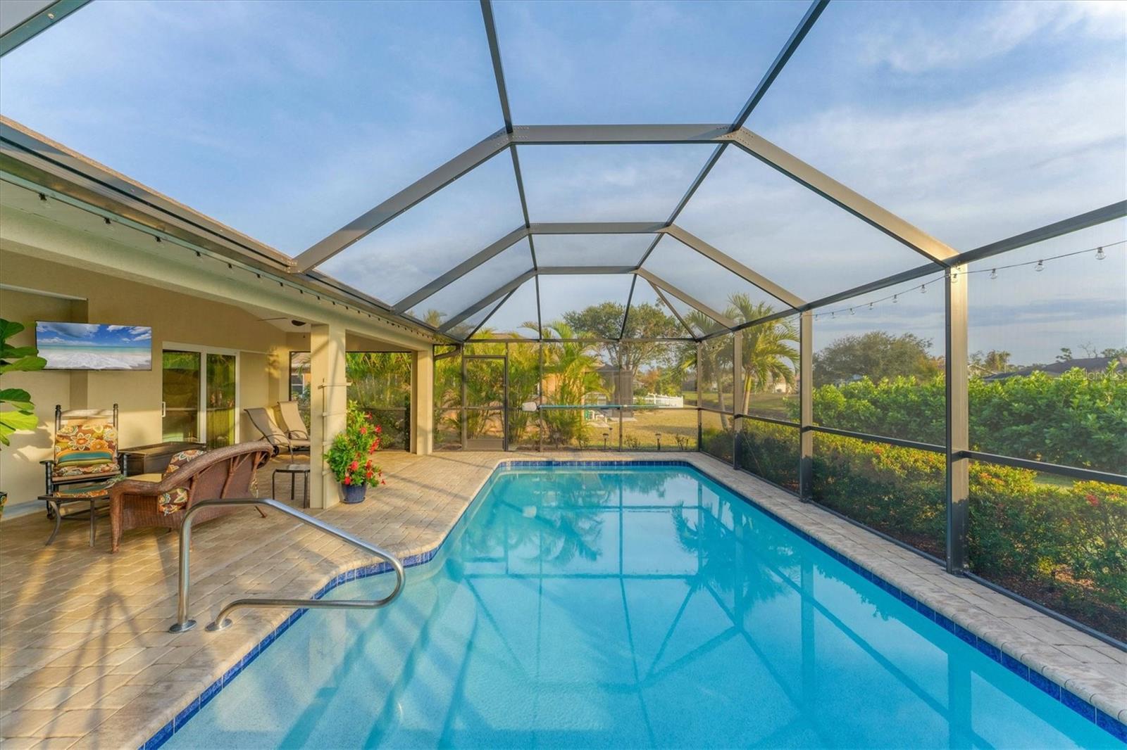 Allow the comforting ambiance of this 2019 Porter Construction home to invite you in for an escape from your worries and cares. Rife with abundant curb appeal, attention to detail, and quality construction; your Florida dream home can be found nestled on an over-sized corner lot within the highly desired community of Rotonda West. Upon entering the 8' glass-inlaid double front door, guests will appreciate spacious volume ceilings, wood-plank tile flooring, and a warm color palette that creates a welcoming feel throughout. Expansive 8' triple pocketing sliding glass doors open from the great room to the spacious lanai, gracefully integrating the indoor/outdoor living areas. Here, a sparkling pool, a brick paver pool deck, and a lush backyard await. To further enhance outdoor entertainment, the backyard features mature privacy landscaping, and the oversized corner lot provides room for ample outdoor games and activities. At the heart of this inviting residence is a well-appointed kitchen that is highlighted by soft-close wood cabinets, tile backsplash, an eat-in dinette surrounded by an aquarium window, a large work island, and abundant cabinetry that is further accentuated by a stainless-steel appliance package and granite countertops. The nearby dining room will comfortably accommodate larger crowds when needed, and a split floor plan provides privacy for owners and guests. After a fun-filled day in the sun, the Primary suite is a welcome respite. Just steps from the home’s private pool, it offers an adjacent spa-like bath with a large Roman shower featuring three showerheads, split/dual vanities, and a separate water closet. The home's 3-STALL GARAGE allows plenty of room to store your beach toys or create a hobbyist’s haven. For peace of mind and additional convenience, the home is located in the highly desirable X-FLOOD ZONE and includes an irrigation system for worry-free maintenance. The home is convenient to Broadmoor Park’s walking paths and a short drive to the Rotonda West Association offices and community center. Golf enthusiasts will appreciate the five championship courses found within the community, while beachcombers will delight in exploring the nearby beaches of Englewood and Boca Grande. If this sounds intriguing, call today to schedule a private showing, and prepare to be captivated by this vibrant, friendly community where your vacation never has to end!