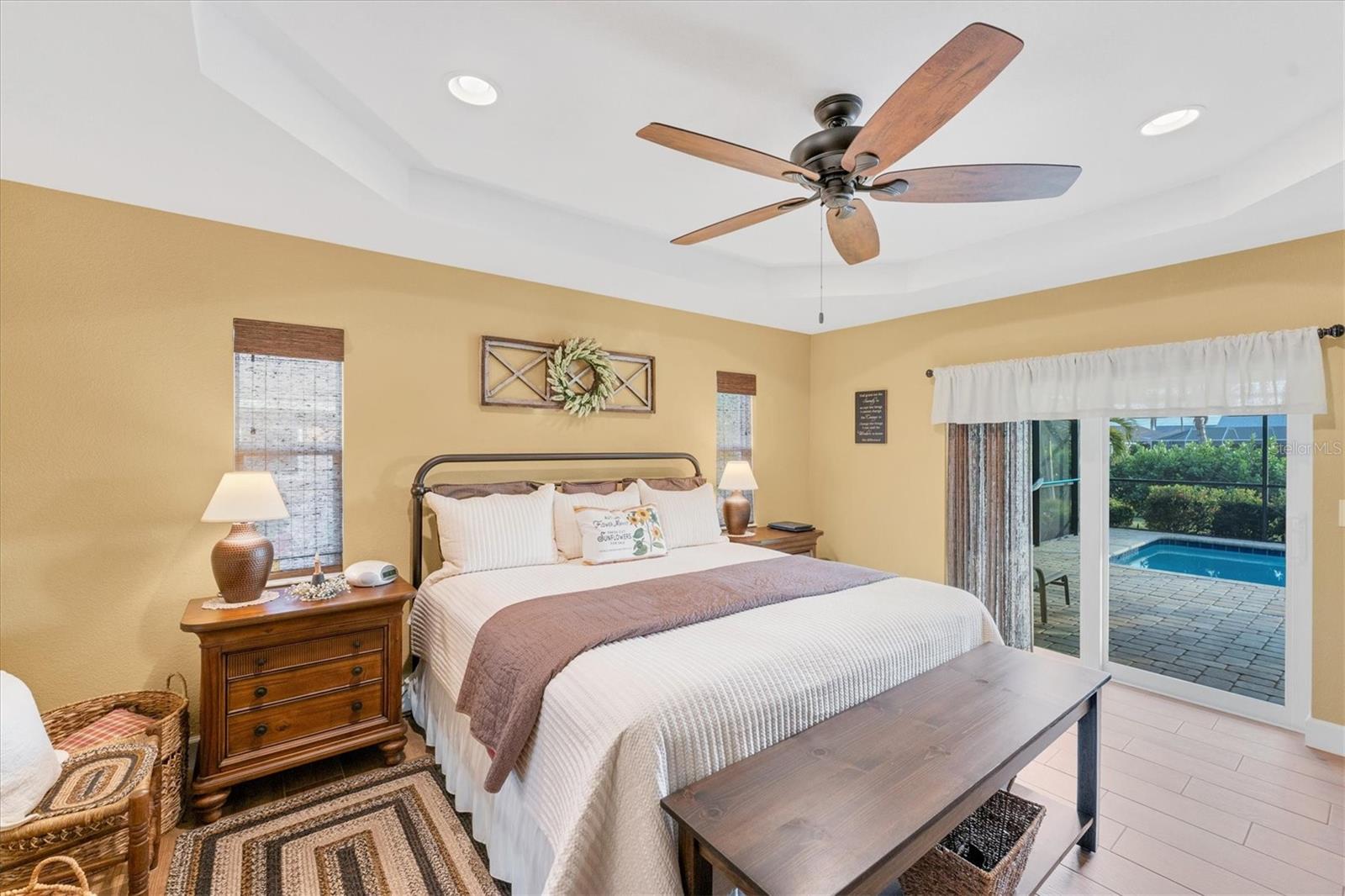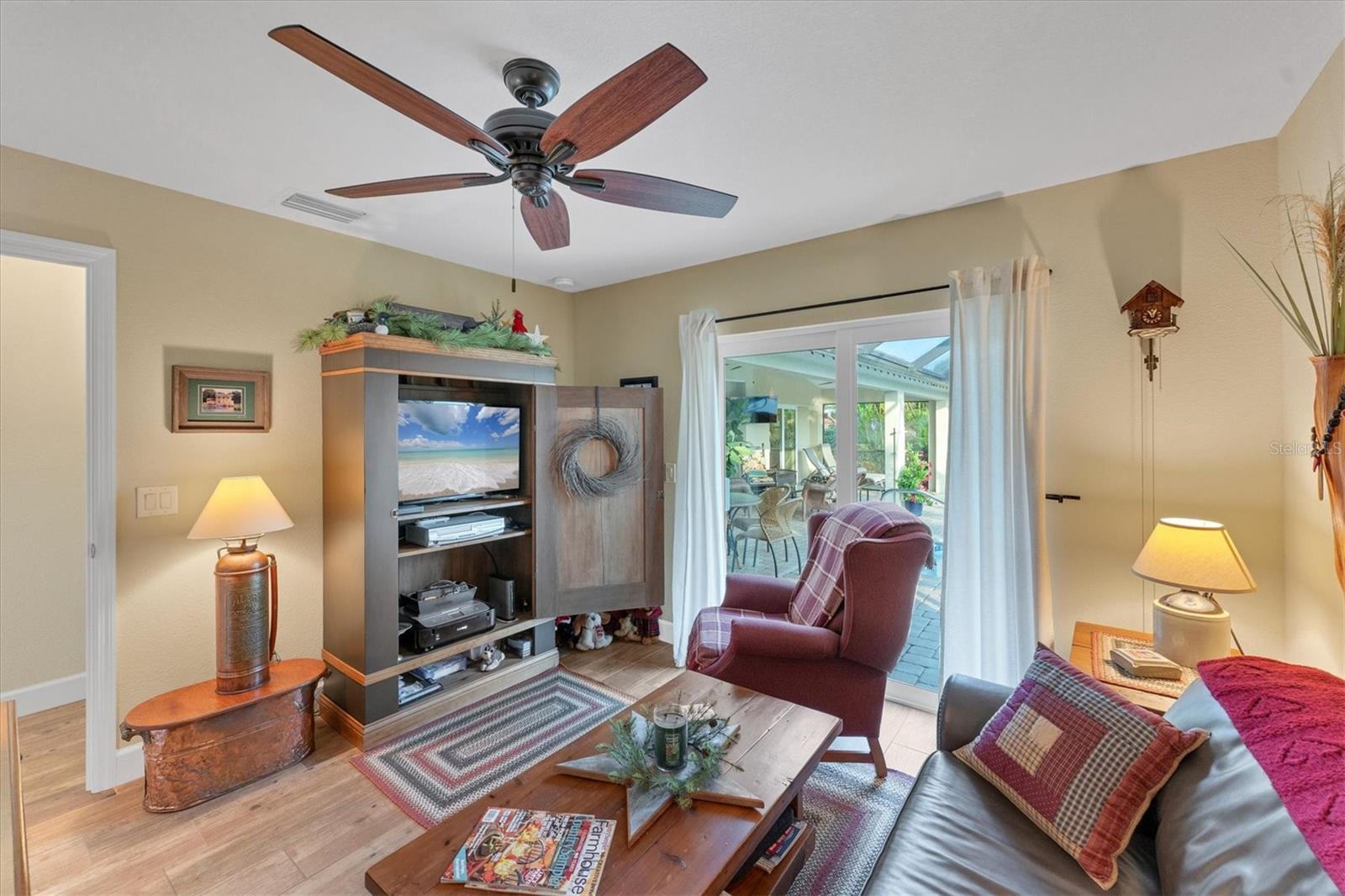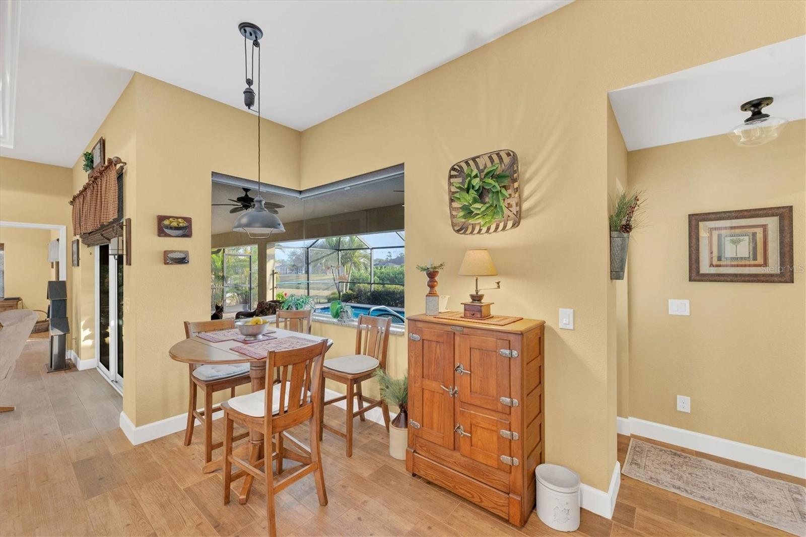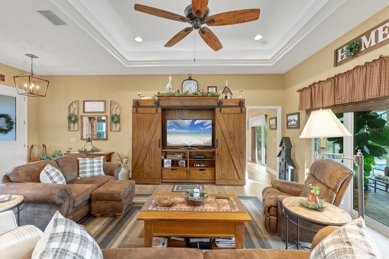 Allow the comforting ambiance of this 2019 Porter Construction home to invite you in for an escape from your worries and cares. Rife with abundant curb appeal, attention to detail, and quality construction; your Florida dream home can be found nestled on an over-sized corner lot within the highly desired community of Rotonda West. Upon entering the 8' glass-inlaid double front door, guests will appreciate spacious volume ceilings, wood-plank tile flooring, and a warm color palette that creates a welcoming feel throughout. Expansive 8' triple pocketing sliding glass doors open from the great room to the spacious lanai, gracefully integrating the indoor/outdoor living areas. Here, a sparkling pool, a brick paver pool deck, and a lush backyard await. To further enhance outdoor entertainment, the backyard features mature privacy landscaping, and the oversized corner lot provides room for ample outdoor games and activities. At the heart of this inviting residence is a well-appointed kitchen that is highlighted by soft-close wood cabinets, tile backsplash, an eat-in dinette surrounded by an aquarium window, a large work island, and abundant cabinetry that is further accentuated by a stainless-steel appliance package and granite countertops. The nearby dining room will comfortably accommodate larger crowds when needed, and a split floor plan provides privacy for owners and guests. After a fun-filled day in the sun, the Primary suite is a welcome respite. Just steps from the home’s private pool, it offers an adjacent spa-like bath with a large Roman shower featuring three showerheads, split/dual vanities, and a separate water closet. The home's 3-STALL GARAGE allows plenty of room to store your beach toys or create a hobbyist’s haven. For peace of mind and additional convenience, the home is located in the highly desirable X-FLOOD ZONE and includes an irrigation system for worry-free maintenance. The home is convenient to Broadmoor Park’s walking paths and a short drive to the Rotonda West Association offices and community center. Golf enthusiasts will appreciate the five championship courses found within the community, while beachcombers will delight in exploring the nearby beaches of Englewood and Boca Grande. If this sounds intriguing, call today to schedule a private showing, and prepare to be captivated by this vibrant, friendly community where your vacation never has to end!