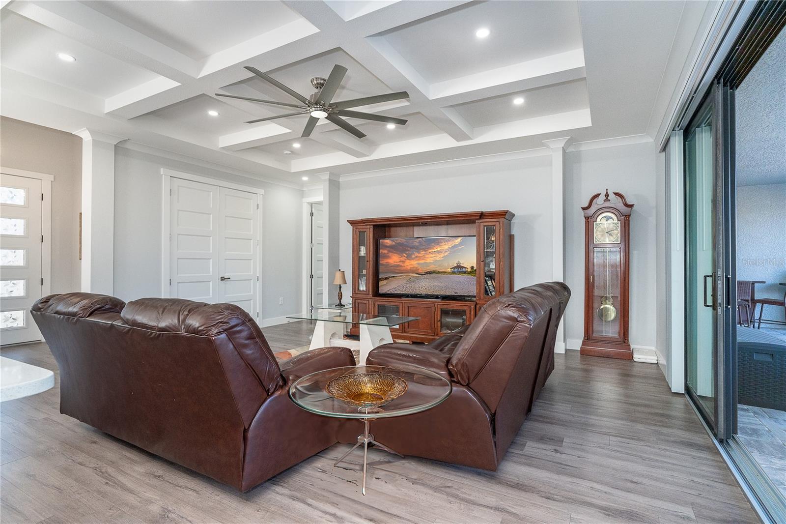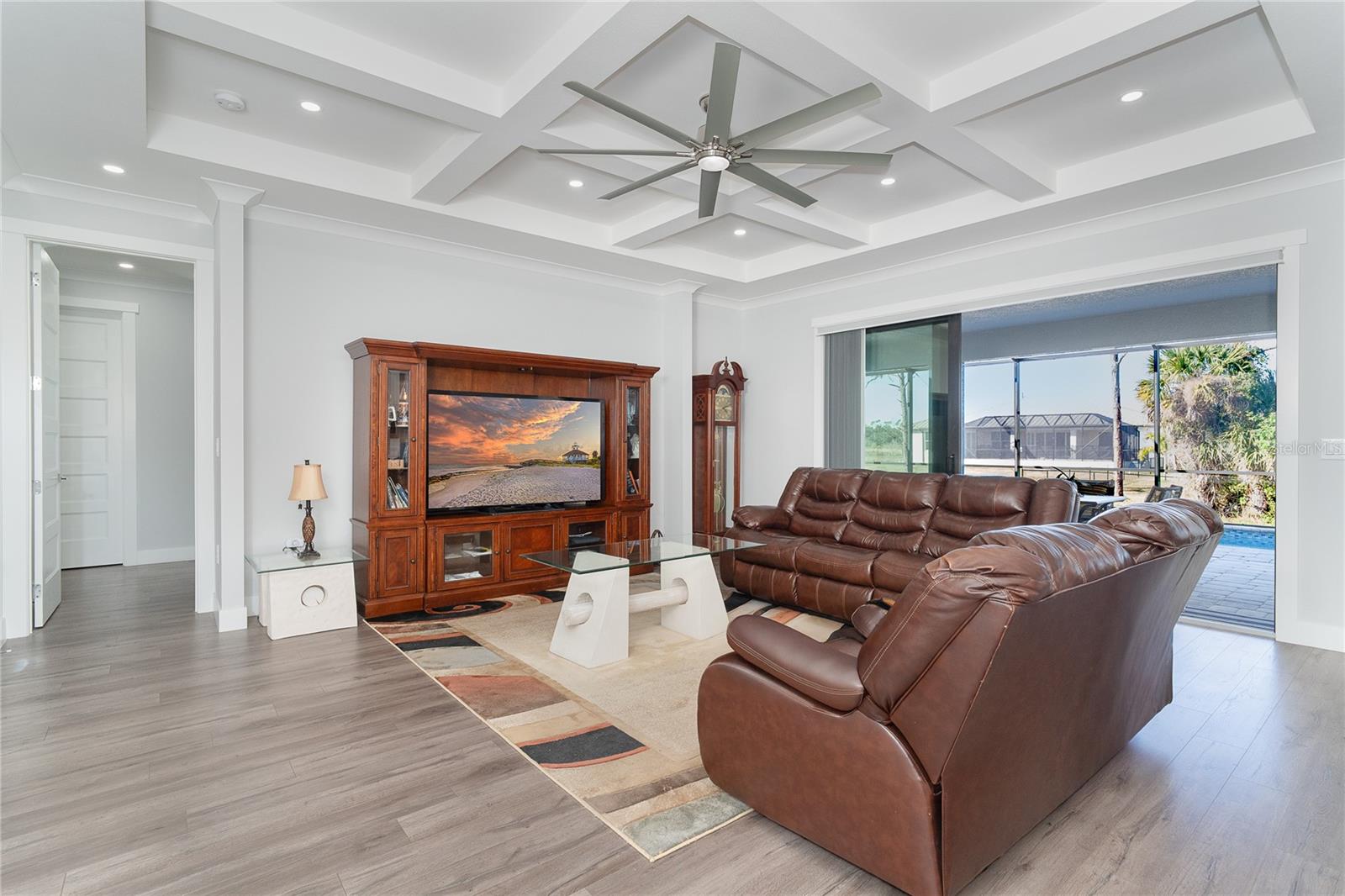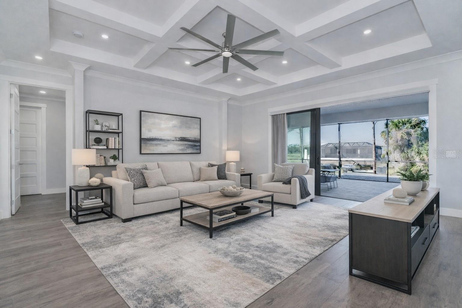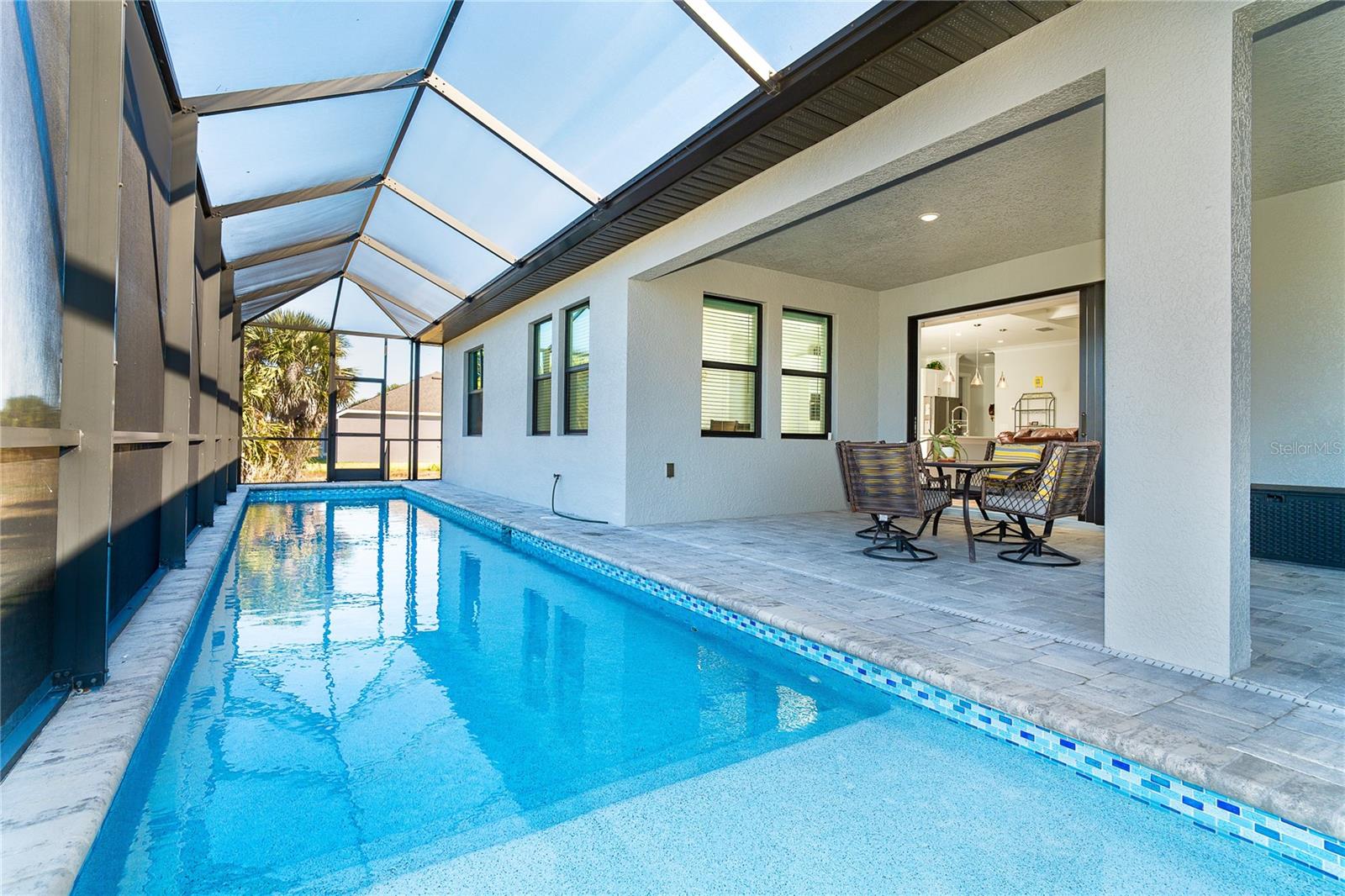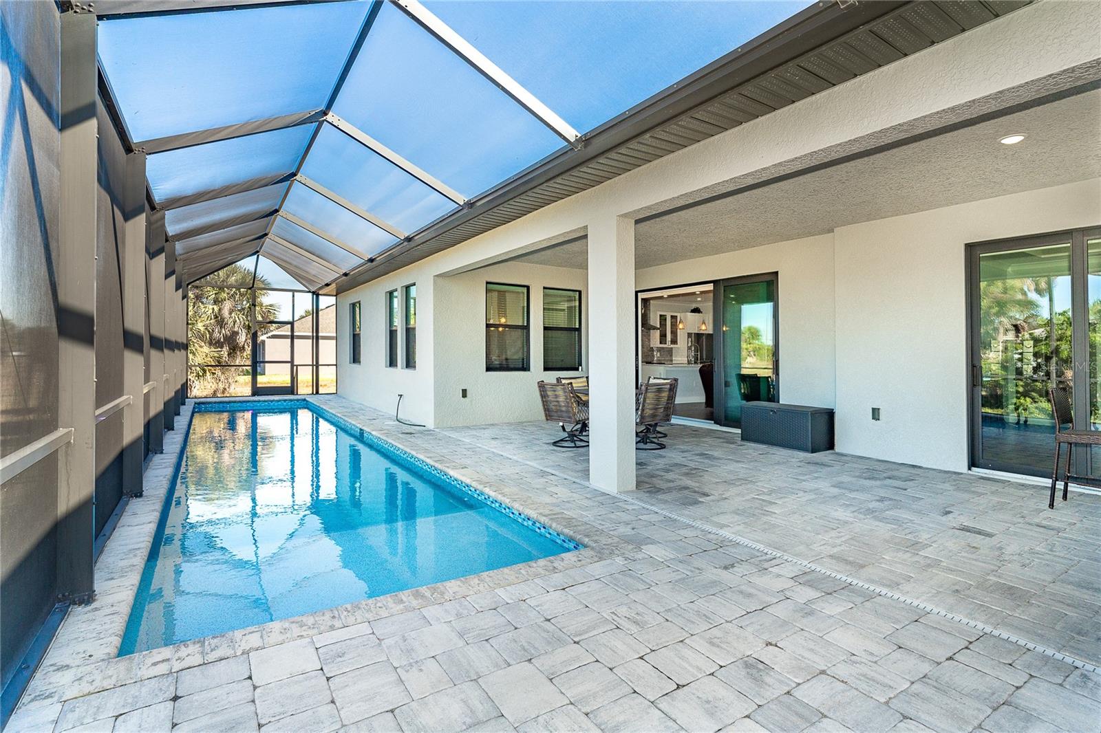 One or more photo(s) has been virtually staged. Prepare to be impressed when you step into your new home! Thoughtfully designed with soaring ceilings, 8-foot Doors, Coffered Ceilings, and Crown Molding throughout. This home offers a refined yet inviting atmosphere filled with natural light. The open-concept living area flows into a Chef’s Kitchen featuring a Bertazzoni range and top-of-the-line Bosch appliances, including a Built-in wall oven that also functions as a microwave. The luxurious primary suite is a true retreat, showcasing a spa-inspired bathroom with a stunning walk-in shower and soaking tub. A versatile fourth bedroom with double doors can easily serve as a home office or den. A stylish guest bathroom featuring double sinks is conveniently located between two additional guest bedrooms. Outdoors, enjoy your own private oasis with a spectacular Lap Pool complete with Lighting, Sun Shelf, and pool heater. The oversized screened lanai is the perfect place to spend your evenings relaxing or entertaining. This exceptional home is truly Move-in Ready. Schedule your private showing today.