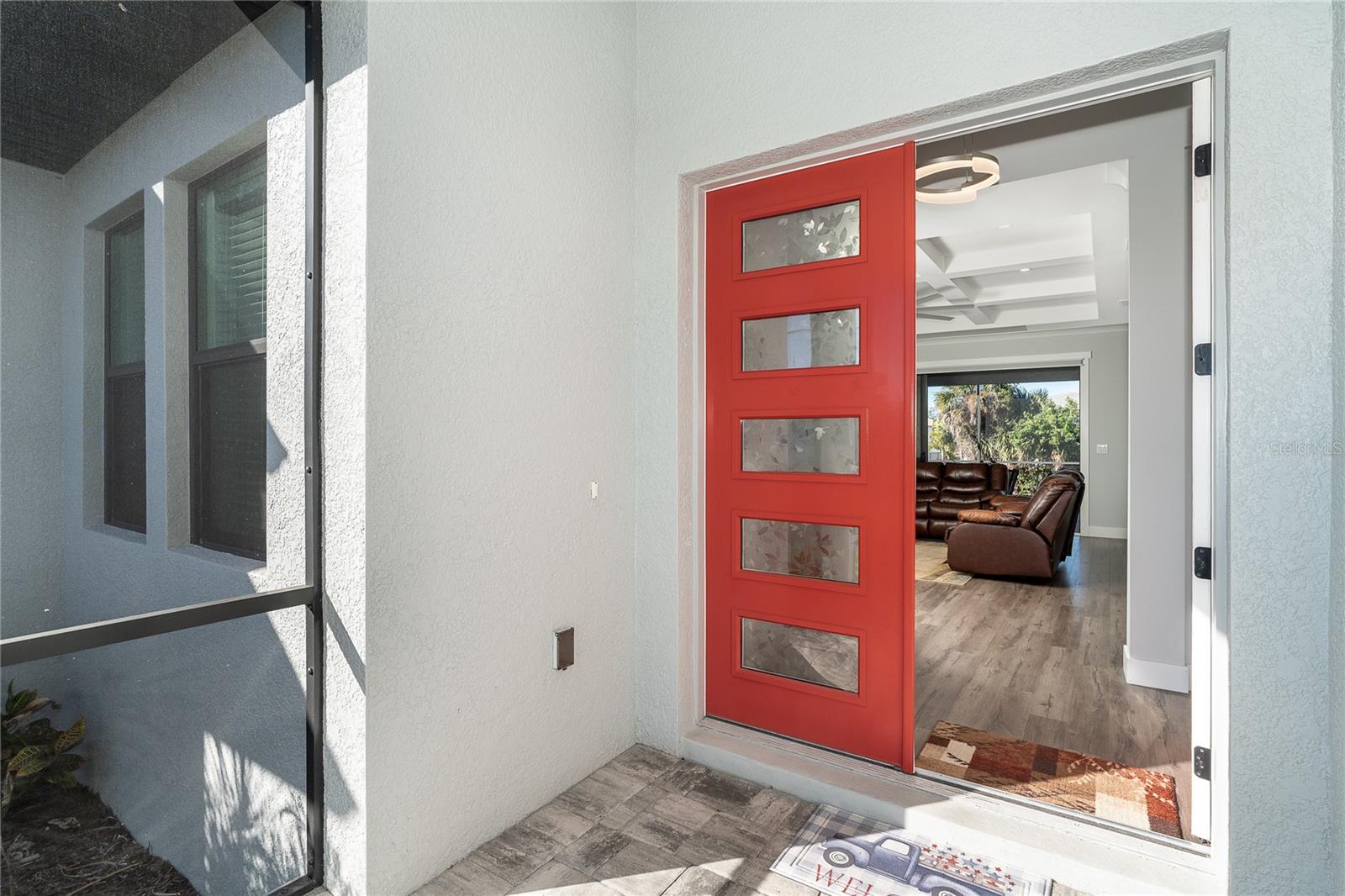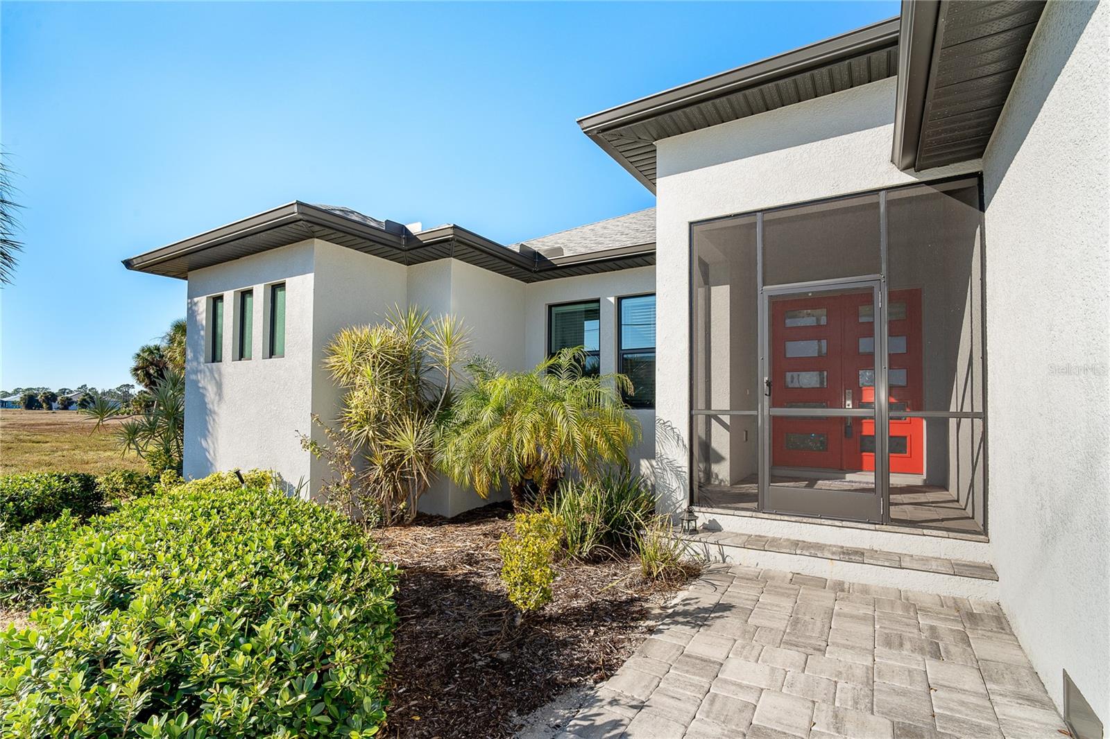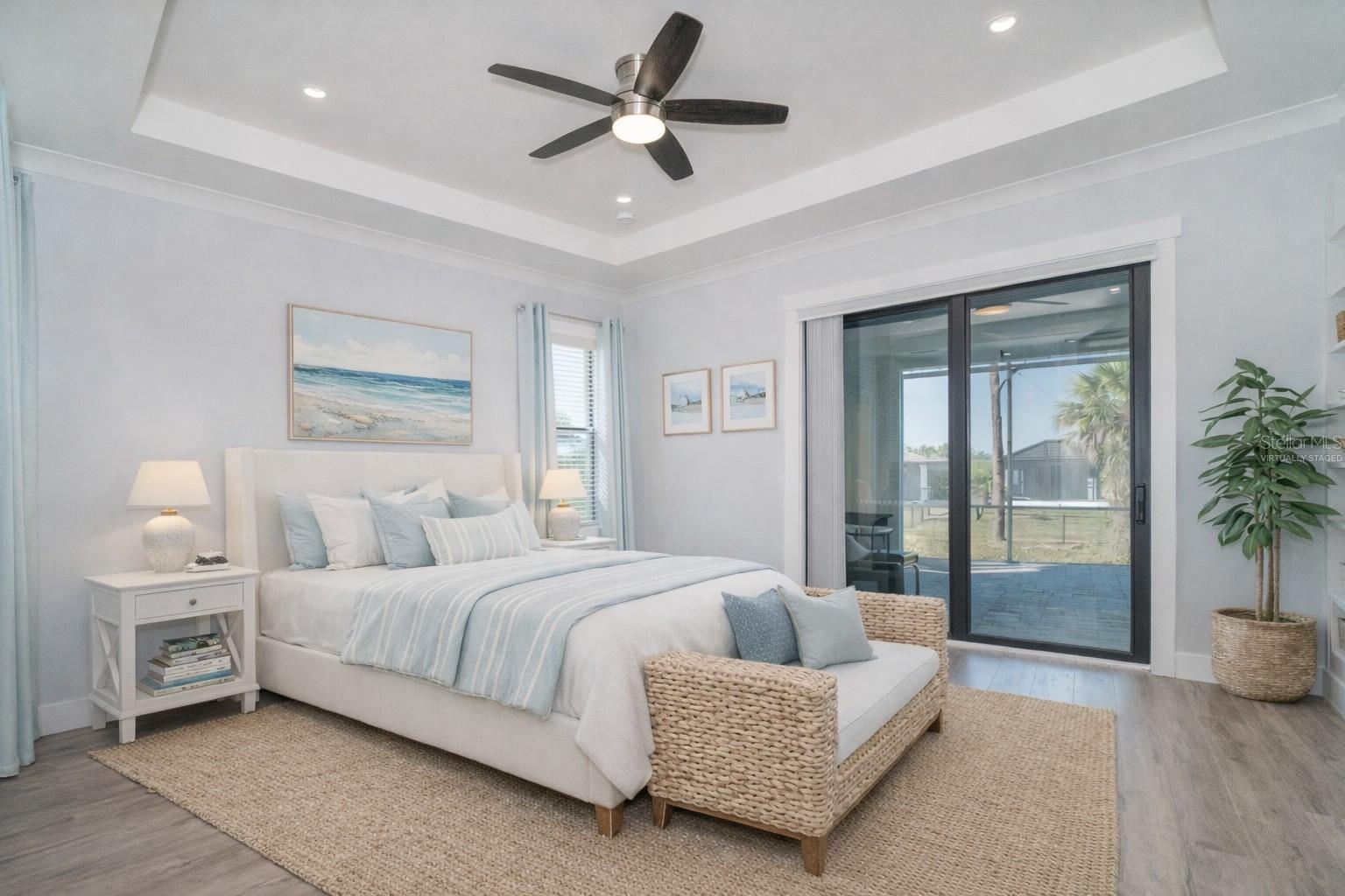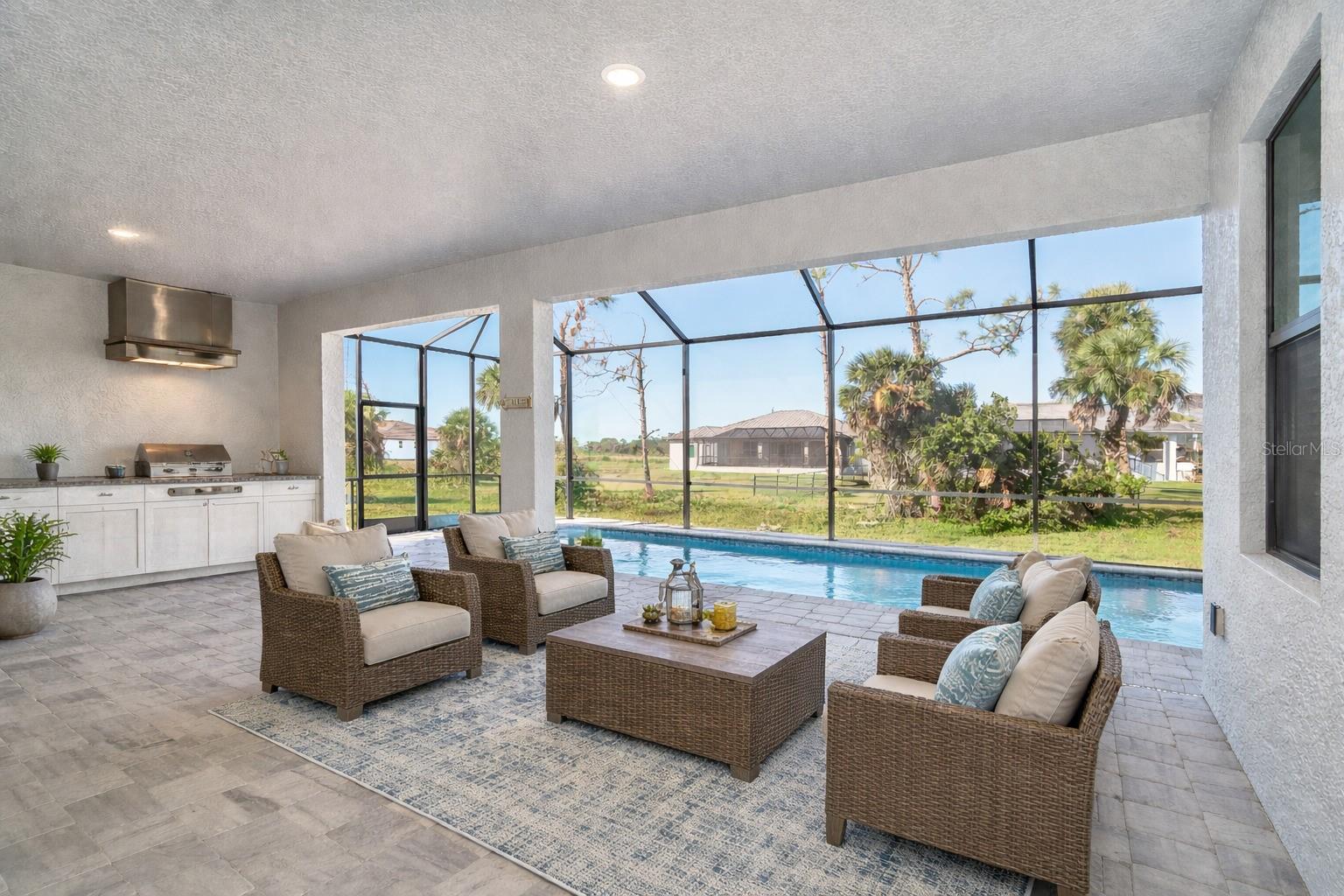 One or more photo(s) has been virtually staged. Prepare to be impressed when you step into your new home! Thoughtfully designed with soaring ceilings, 8-foot Doors, Coffered Ceilings, and Crown Molding throughout. This home offers a refined yet inviting atmosphere filled with natural light. The open-concept living area flows into a Chef’s Kitchen featuring a Bertazzoni range and top-of-the-line Bosch appliances, including a Built-in wall oven that also functions as a microwave. The luxurious primary suite is a true retreat, showcasing a spa-inspired bathroom with a stunning walk-in shower and soaking tub. A versatile fourth bedroom with double doors can easily serve as a home office or den. A stylish guest bathroom featuring double sinks is conveniently located between two additional guest bedrooms. Outdoors, enjoy your own private oasis with a spectacular Lap Pool complete with Lighting, Sun Shelf, and pool heater. The oversized screened lanai is the perfect place to spend your evenings relaxing or entertaining. This exceptional home is truly Move-in Ready. Schedule your private showing today.