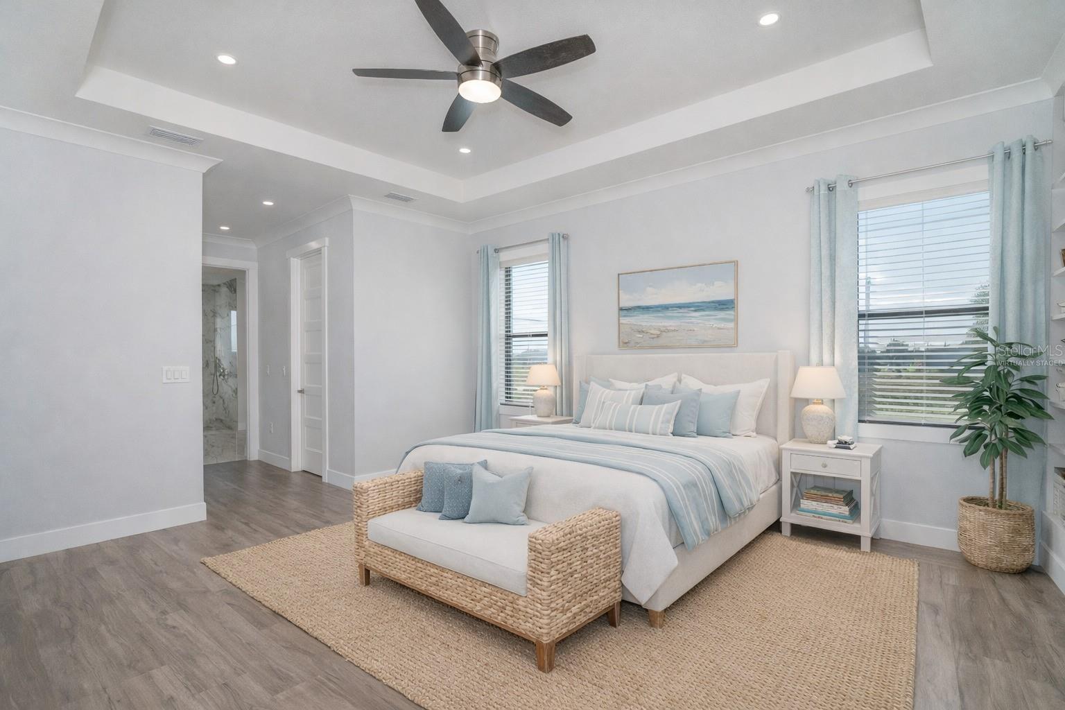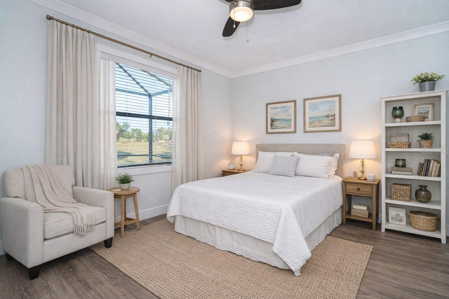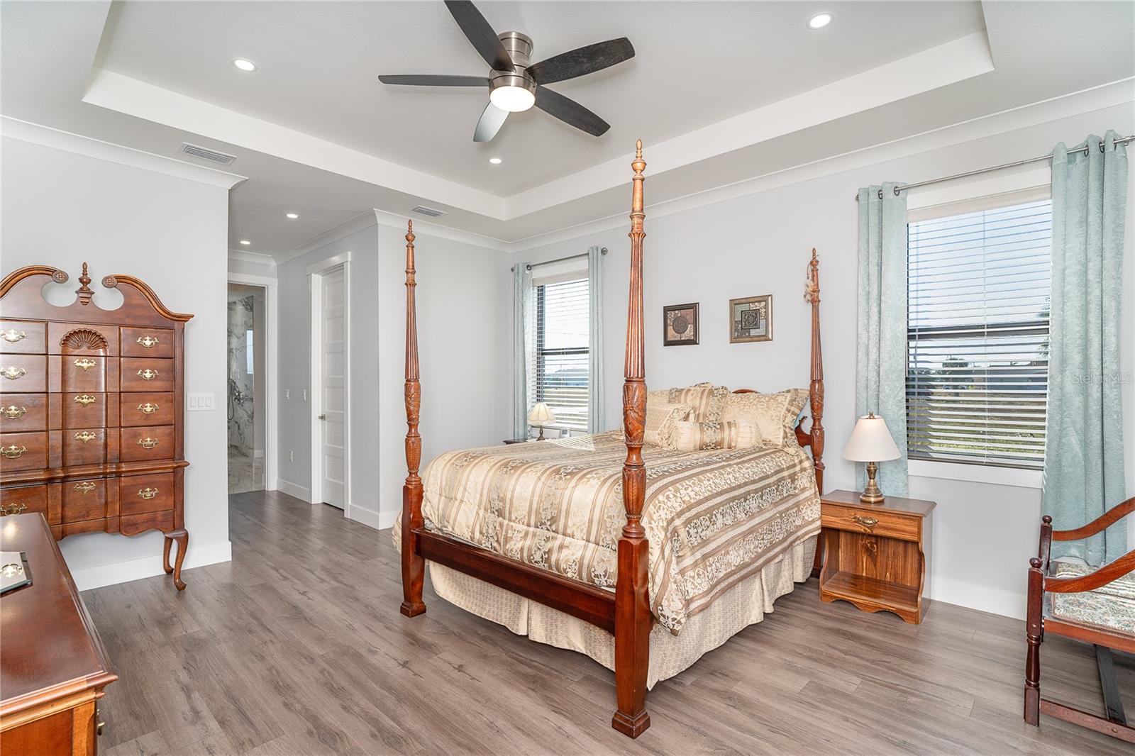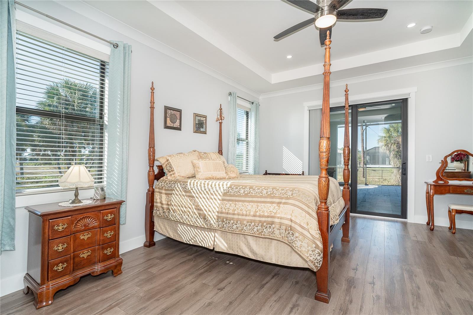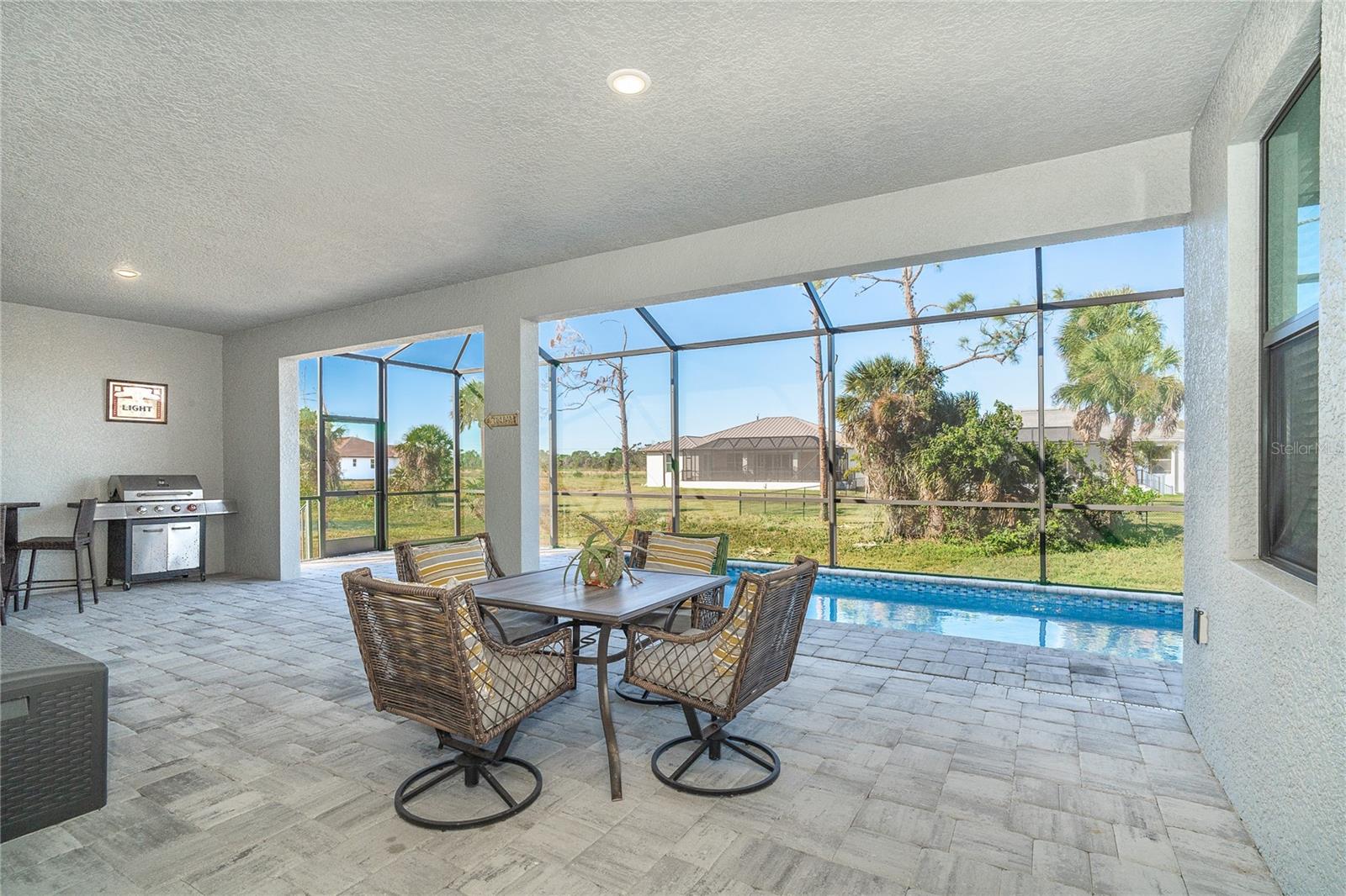One or more photo(s) has been virtually staged. Prepare to be impressed when you step into your new home! Thoughtfully designed with soaring ceilings, 8-foot Doors, Coffered Ceilings, and Crown Molding throughout. This home offers a refined yet inviting atmosphere filled with natural light. The open-concept living area flows into a Chef’s Kitchen featuring a Bertazzoni range and top-of-the-line Bosch appliances, including a Built-in wall oven that also functions as a microwave. The luxurious primary suite is a true retreat, showcasing a spa-inspired bathroom with a stunning walk-in shower and soaking tub. A versatile fourth bedroom with double doors can easily serve as a home office or den. A stylish guest bathroom featuring double sinks is conveniently located between two additional guest bedrooms. Outdoors, enjoy your own private oasis with a spectacular Lap Pool complete with Lighting, Sun Shelf, and pool heater. The oversized screened lanai is the perfect place to spend your evenings relaxing or entertaining. This exceptional home is truly Move-in Ready. Schedule your private showing today.