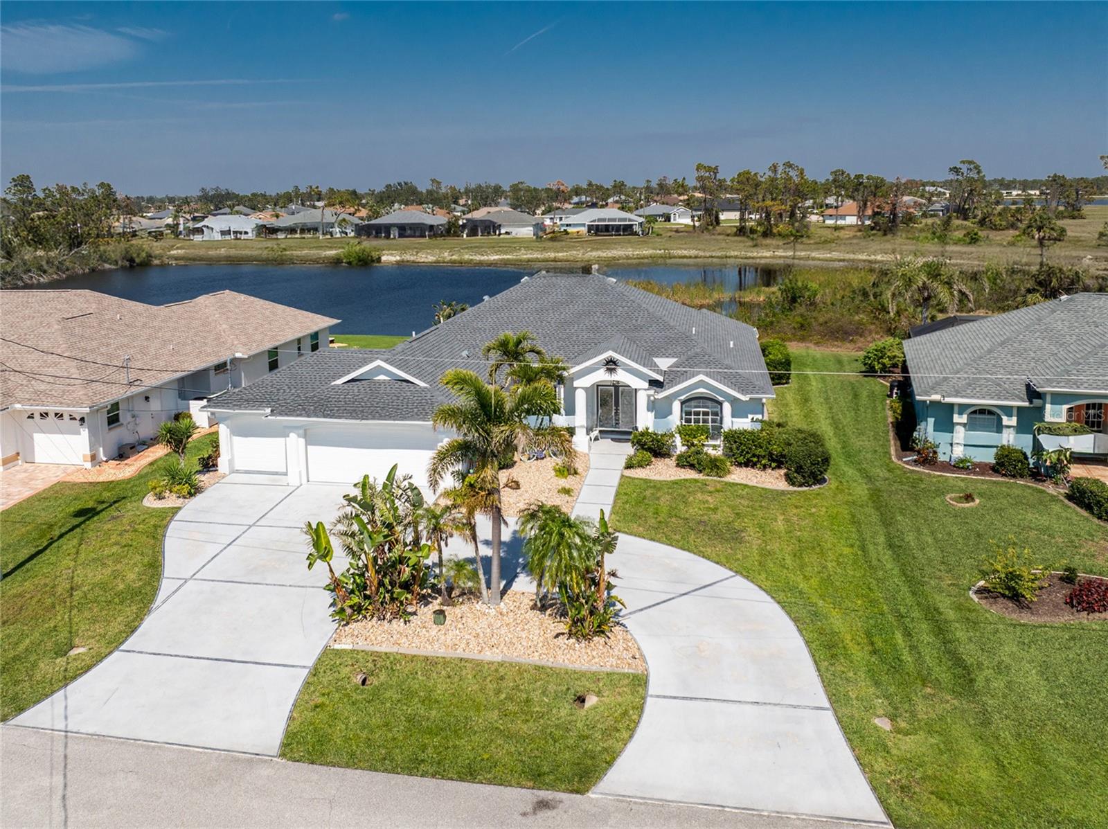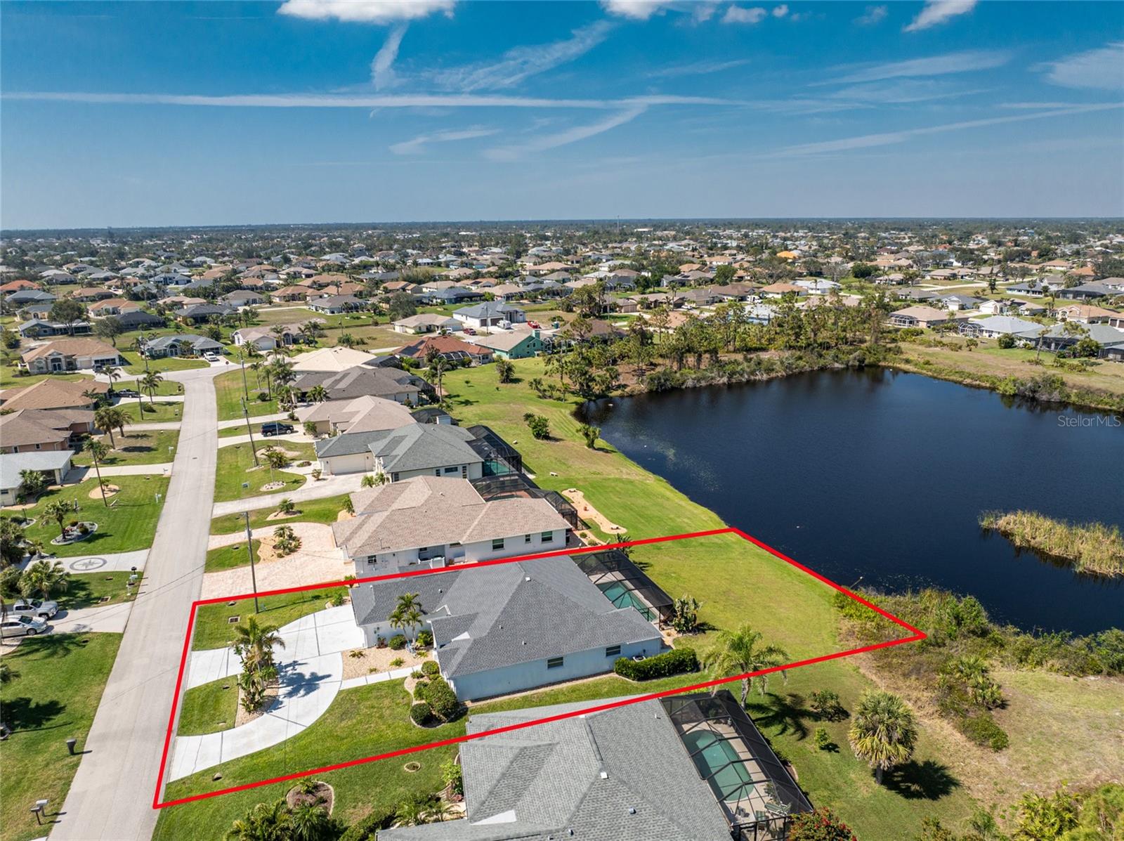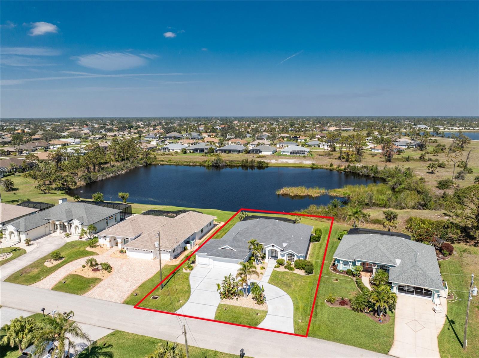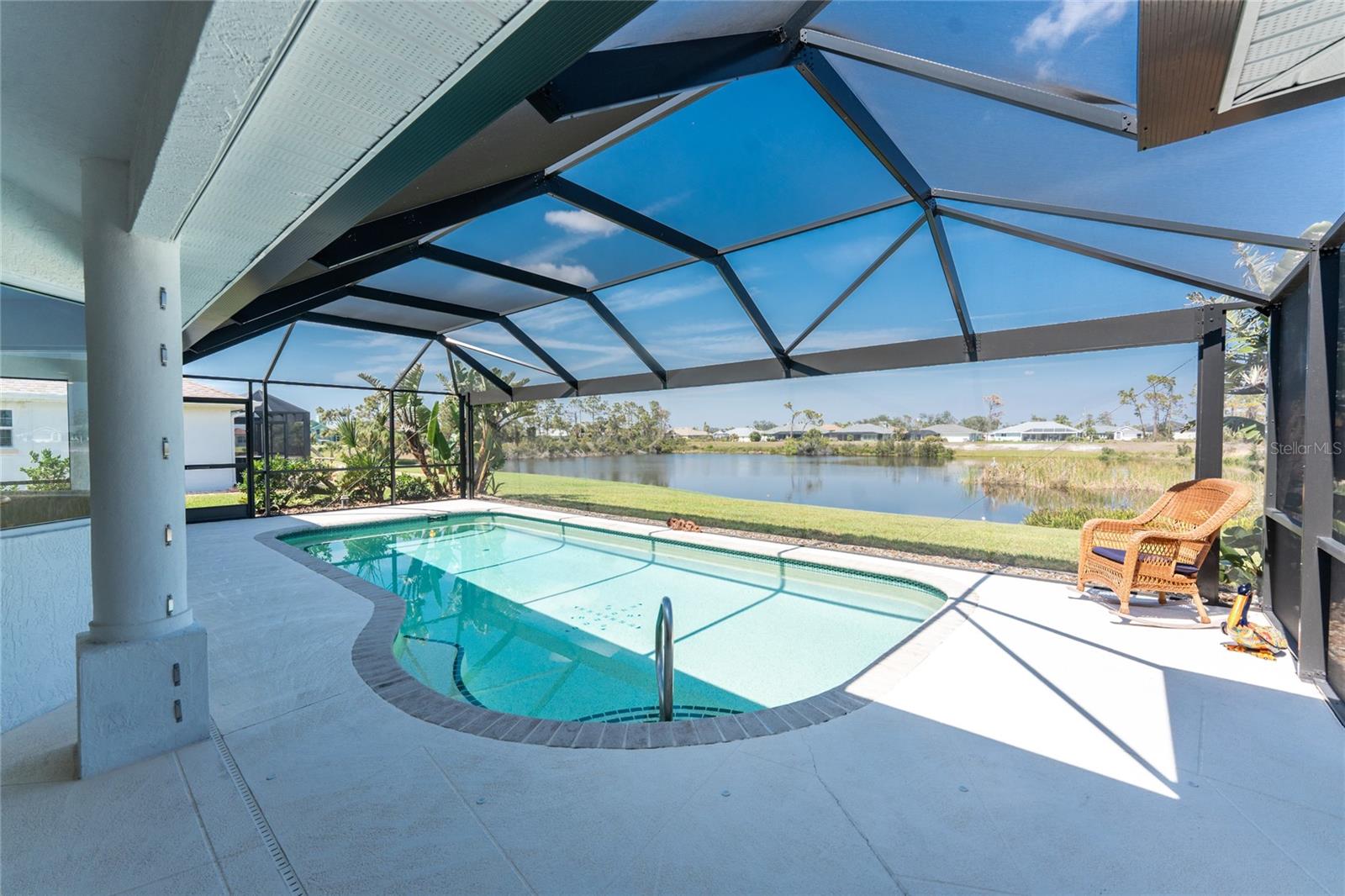 Live the Dream: Gorgeous Lakefront Property in Rotonda West! This exceptional 4-bedroom, 3-bath, 3-car garage pool home is located in an X flood zone and provides added peace of mind with Storm Smart hurricane protection on all windows and doors, except for an accordion shutter on the front door. As you approach, you'll appreciate the convenience and extra parking offered by the circular driveway, complemented by mature landscaping. The 2022 roof and stunning etched glass double front doors create a warm and inviting entrance. Inside, you'll discover a spacious open layout with soaring ceilings and pocketing sliding glass doors that seamlessly extend your living space to the screened lanai. The generous kitchen offers ample cabinet space, granite countertops, and stainless steel appliances. In the breakfast nook, panoramic windows frame breathtaking views of the lake, allowing you to enjoy local wildlife while preparing meals. The primary ensuite bedroom features soothing blue tones that create a relaxing atmosphere, complemented by tray ceilings and dual walk-in closets. Sliding doors offer direct access to the pool, while the spacious bathroom includes dual separate vanities (one with a makeup area), a jetted tub, and a large walk-in shower. There are two additional ensuite bedrooms, one of which also serves as an easily accessible pool bath, both featuring walk-in closets, great for family and guests. The fourth bedroom offers the flexibility to be used as extra living space, a home office, gym, or hobby room. Outside, you'll find a spacious bronzed cage with a panoramic screened lanai and a heated pool, offering unobstructed views of the beautiful lake. It's the perfect spot to float your cares away, while the mature landscaping surrounding the pool cage ensures plenty of privacy. Additional highlights include a 2018 A/C, new master bedroom flooring in 2023, a canal-fed irrigation system with a 2024 pump, an outdoor storage closet, and the home is being sold furnished. This home is located in the deed restricted community of Rotonda West where you can enjoy an active lifestyle with low HOA fees and access to multiple walking and biking trails, pickleball, tennis courts and a clubhouse where you can participate in year round activities and events. Love to golf? You are within minutes of 5 premier courses! When you want to explore the area you will find multiple white sandy beaches, boat ramps, kayak launches, shopping, dining, live entertainment, two MLB spring training facilities are close by. This is a great home for those needing space for everyone, contact us today to schedule your private showing.