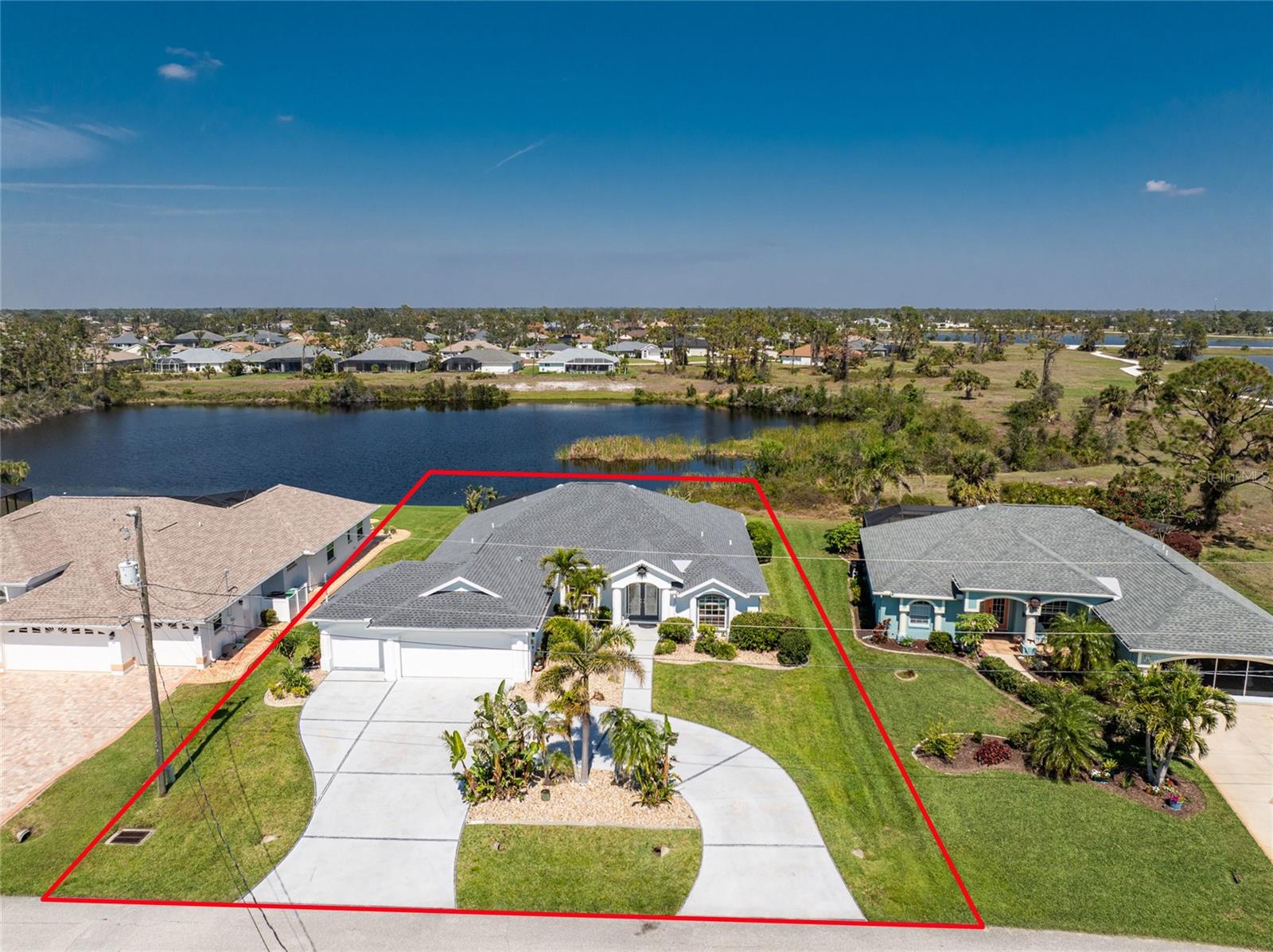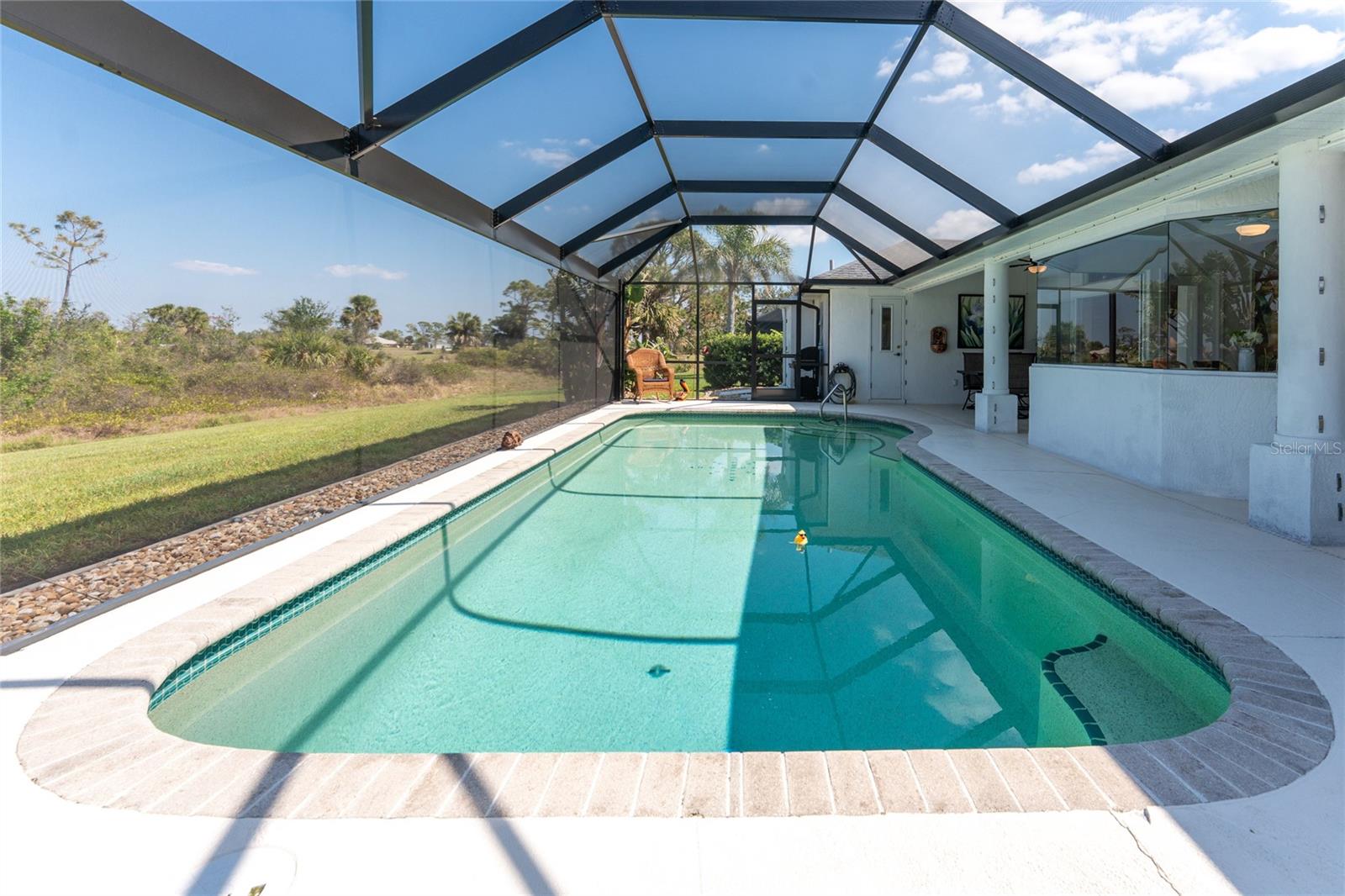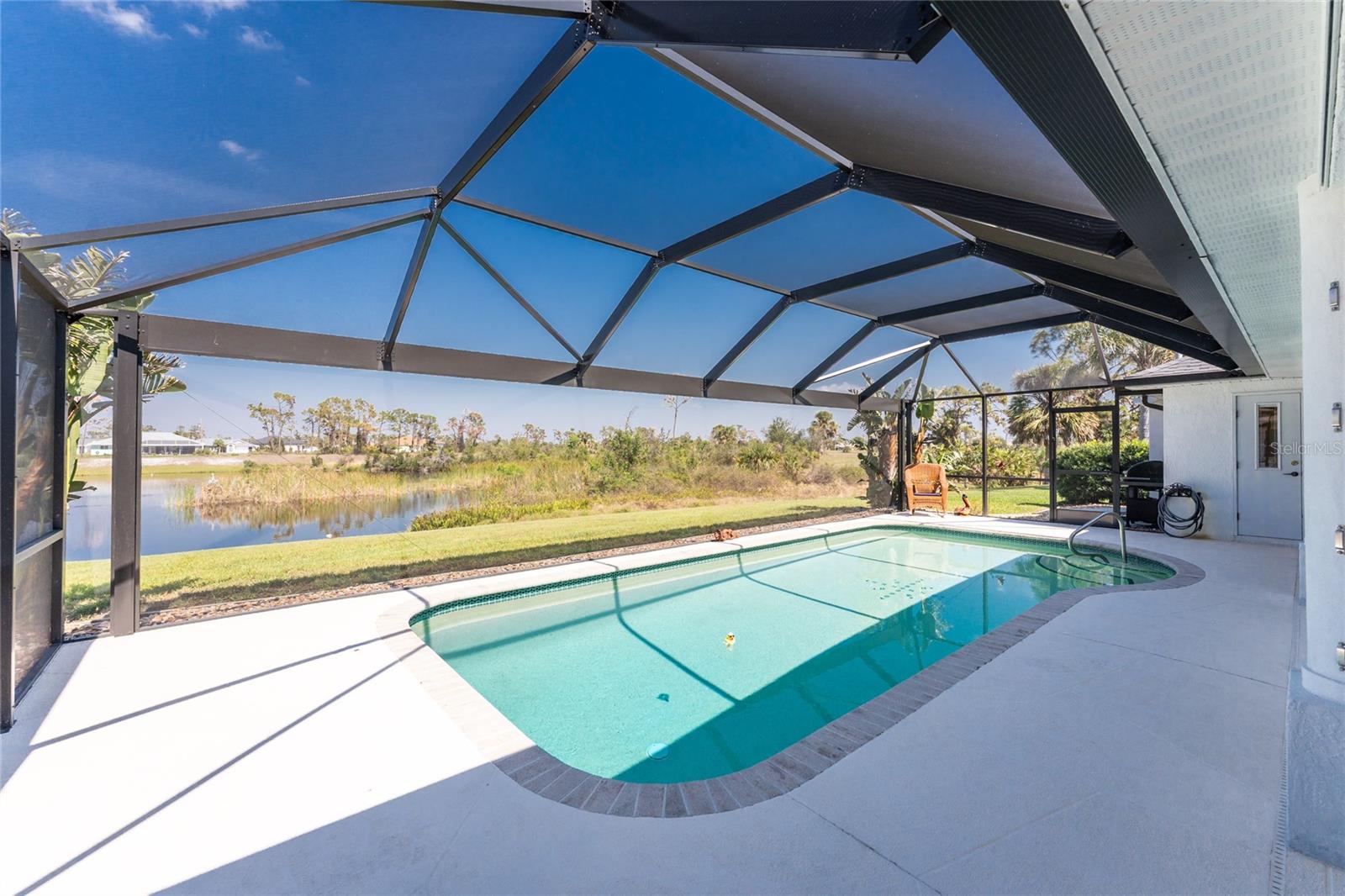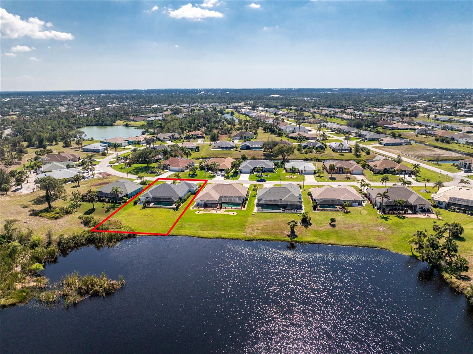 Live the Dream: Gorgeous Lakefront Property in Rotonda West! This exceptional 4-bedroom, 3-bath, 3-car garage pool home is located in an X flood zone and provides added peace of mind with Storm Smart hurricane protection on all windows and doors, except for an accordion shutter on the front door. As you approach, you'll appreciate the convenience and extra parking offered by the circular driveway, complemented by mature landscaping. The 2022 roof and stunning etched glass double front doors create a warm and inviting entrance. Inside, you'll discover a spacious open layout with soaring ceilings and pocketing sliding glass doors that seamlessly extend your living space to the screened lanai. The generous kitchen offers ample cabinet space, granite countertops, and stainless steel appliances. In the breakfast nook, panoramic windows frame breathtaking views of the lake, allowing you to enjoy local wildlife while preparing meals. The primary ensuite bedroom features soothing blue tones that create a relaxing atmosphere, complemented by tray ceilings and dual walk-in closets. Sliding doors offer direct access to the pool, while the spacious bathroom includes dual separate vanities (one with a makeup area), a jetted tub, and a large walk-in shower. There are two additional ensuite bedrooms, one of which also serves as an easily accessible pool bath, both featuring walk-in closets, great for family and guests. The fourth bedroom offers the flexibility to be used as extra living space, a home office, gym, or hobby room. Outside, you'll find a spacious bronzed cage with a panoramic screened lanai and a heated pool, offering unobstructed views of the beautiful lake. It's the perfect spot to float your cares away, while the mature landscaping surrounding the pool cage ensures plenty of privacy. Additional highlights include a 2018 A/C, new master bedroom flooring in 2023, a canal-fed irrigation system with a 2024 pump, an outdoor storage closet, and the home is being sold furnished. This home is located in the deed restricted community of Rotonda West where you can enjoy an active lifestyle with low HOA fees and access to multiple walking and biking trails, pickleball, tennis courts and a clubhouse where you can participate in year round activities and events. Love to golf? You are within minutes of 5 premier courses! When you want to explore the area you will find multiple white sandy beaches, boat ramps, kayak launches, shopping, dining, live entertainment, two MLB spring training facilities are close by. This is a great home for those needing space for everyone, contact us today to schedule your private showing.