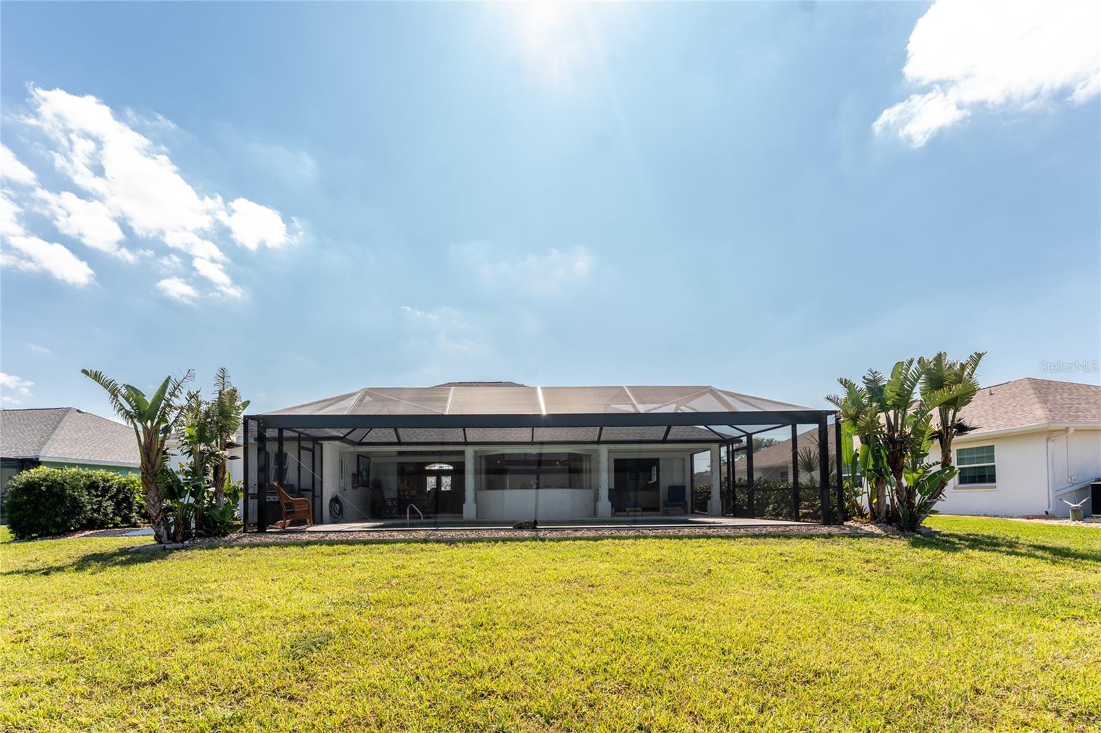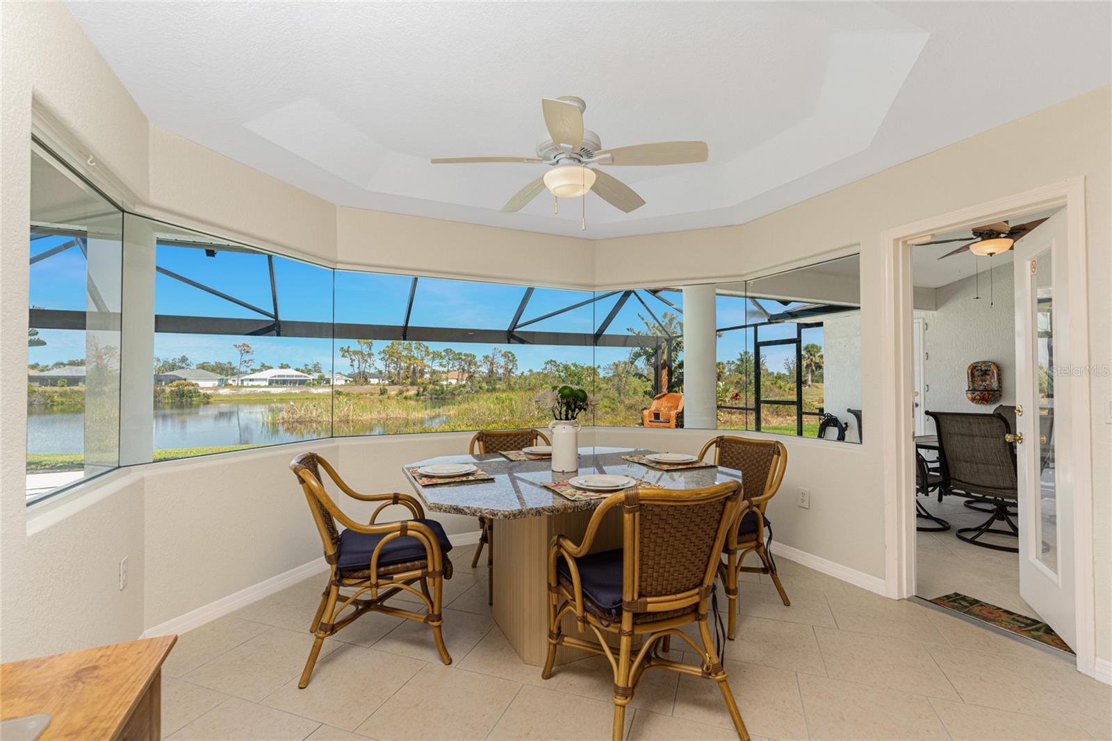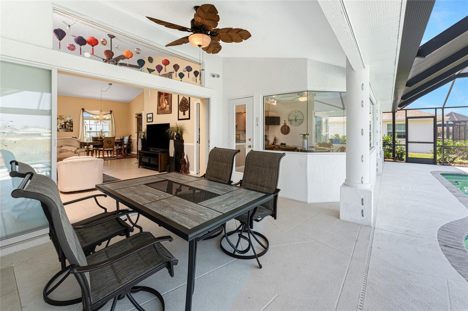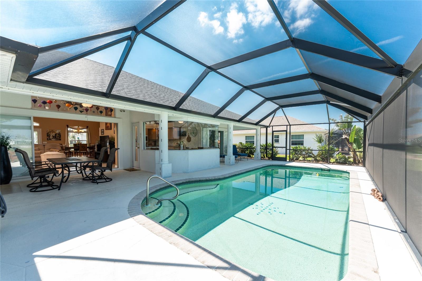 Live the Dream: Gorgeous Lakefront Property in Rotonda West! This exceptional 4-bedroom, 3-bath, 3-car garage pool home is located in an X flood zone and provides added peace of mind with Storm Smart hurricane protection on all windows and doors, except for an accordion shutter on the front door. As you approach, you'll appreciate the convenience and extra parking offered by the circular driveway, complemented by mature landscaping. The 2022 roof and stunning etched glass double front doors create a warm and inviting entrance. Inside, you'll discover a spacious open layout with soaring ceilings and pocketing sliding glass doors that seamlessly extend your living space to the screened lanai. The generous kitchen offers ample cabinet space, granite countertops, and stainless steel appliances. In the breakfast nook, panoramic windows frame breathtaking views of the lake, allowing you to enjoy local wildlife while preparing meals. The primary ensuite bedroom features soothing blue tones that create a relaxing atmosphere, complemented by tray ceilings and dual walk-in closets. Sliding doors offer direct access to the pool, while the spacious bathroom includes dual separate vanities (one with a makeup area), a jetted tub, and a large walk-in shower. There are two additional ensuite bedrooms, one of which also serves as an easily accessible pool bath, both featuring walk-in closets, great for family and guests. The fourth bedroom offers the flexibility to be used as extra living space, a home office, gym, or hobby room. Outside, you'll find a spacious bronzed cage with a panoramic screened lanai and a heated pool, offering unobstructed views of the beautiful lake. It's the perfect spot to float your cares away, while the mature landscaping surrounding the pool cage ensures plenty of privacy. Additional highlights include a 2018 A/C, new master bedroom flooring in 2023, a canal-fed irrigation system with a 2024 pump, an outdoor storage closet, and the home is being sold furnished. This home is located in the deed restricted community of Rotonda West where you can enjoy an active lifestyle with low HOA fees and access to multiple walking and biking trails, pickleball, tennis courts and a clubhouse where you can participate in year round activities and events. Love to golf? You are within minutes of 5 premier courses! When you want to explore the area you will find multiple white sandy beaches, boat ramps, kayak launches, shopping, dining, live entertainment, two MLB spring training facilities are close by. This is a great home for those needing space for everyone, contact us today to schedule your private showing.