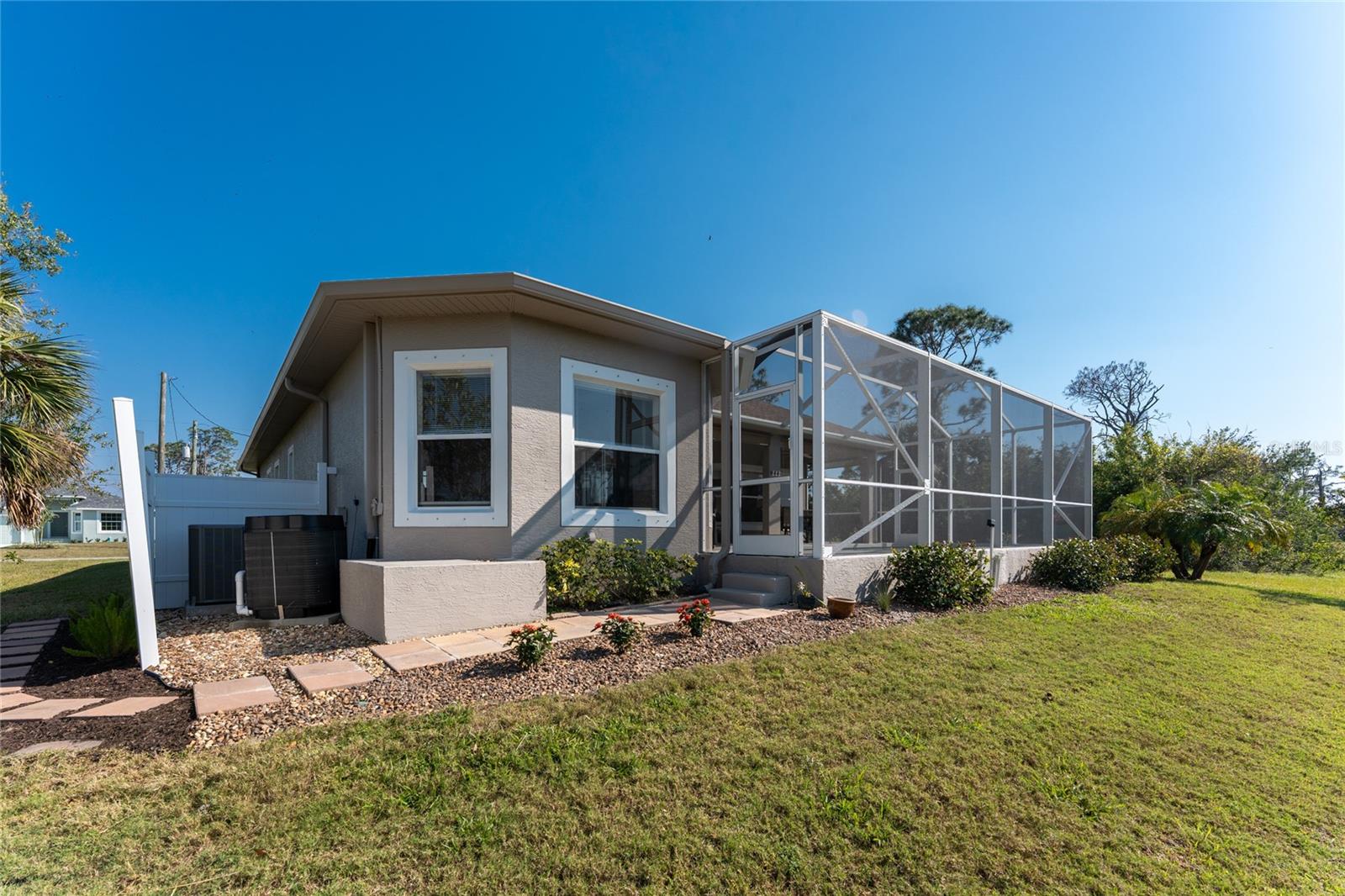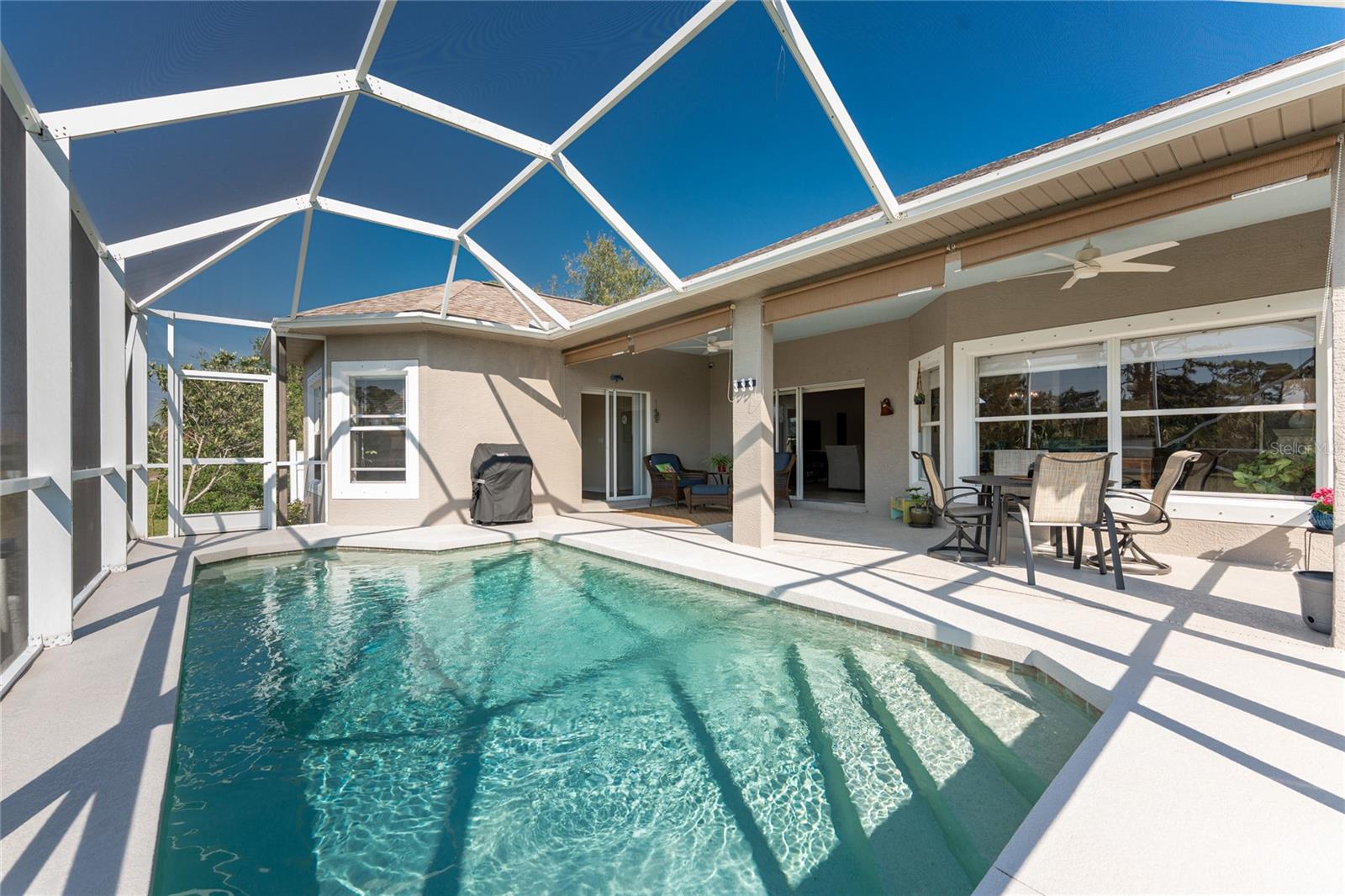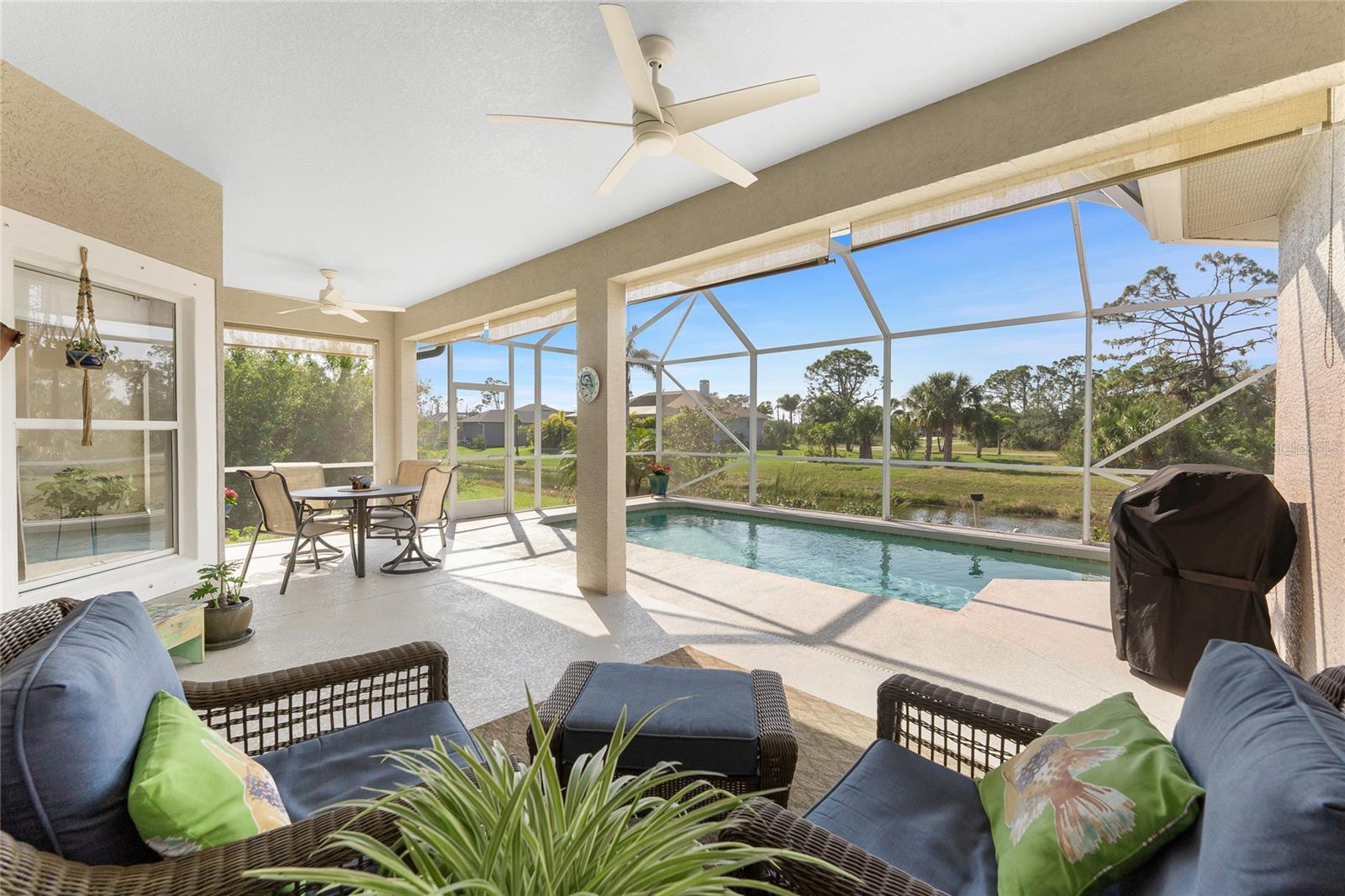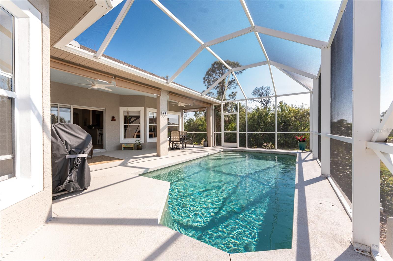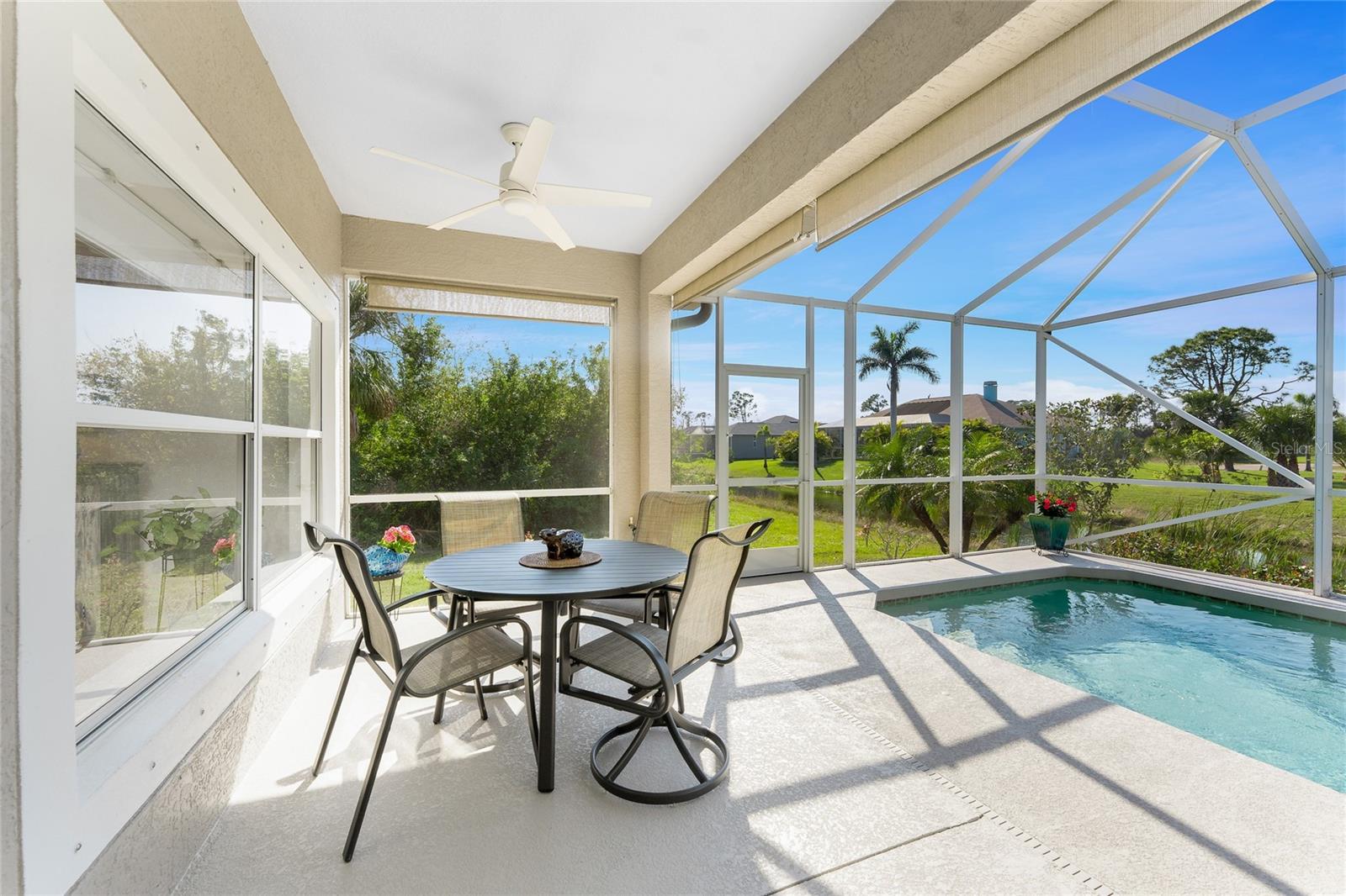 Stunning Upgraded Canal-Front Home in Serene Rotonda Lakes! Enjoy breathtaking sunsets and glimpses of local wildlife from this beautifully designed, turnkey furnished, three-bedroom, two-bath Boca Grande model. This elegant home offers great curb appeal with the mature landscaping, 2023 roof with warranty, and charming double door entry with transom window. Inside, the inviting open floor plan is filled with natural light, featuring ceramic tile flooring in the main living areas and bathrooms, along with luxury vinyl plank in the bedrooms, all installed in 2019. Fresh, neutral paint in the living area, formal dining, foyer, and kitchen (updated in 2023) enhances the home's bright and modern feel. The kitchen offers an abundance of Merliatt wood cabinetry, a raised breakfast bar, a built-in desk area, stainless steel appliances, and a spacious walk-in pantry. The adjoining casual dining space, framed by large windows overlooking the pool and canal, creates the perfect setting to enjoy your morning coffee with a view. The generously sized ensuite master bedroom features elegant tray ceilings, a wall of windows, a spacious walk-in closet, and sliding door access to the pool and lanai. The master bathroom offers a large dual sink vanity and a fully tiled walk-in shower, combining style and functionality. The two comfortable guest bedrooms feature reach-in closets. The well-appointed guest bathroom includes a tiled shower/tub combo, offering both style and convenience. Step outside to your private outdoor oasis, where an oversized screened lanai, a heated pool, and serene canal views await. Whether you're relaxing poolside or enjoying the view, this space is perfect for outdoor Florida living and entertaining. Additional updates include hurricane shutters, a canal-fed irrigation system, an R/O water system, and smart home-controlled security system, irrigation, and thermostat. Other updates are a brand-new 2024 pool heater, a 2022 HVAC system, new all-house gutters, interior and exterior lighting, and fresh exterior paint in 2021. For added privacy, the owner-owned vacant lot across the canal is available for purchase, ensuring a peaceful backyard retreat for years to come. Rotonda Lakes, a deed-restricted community, offers quick access to five premier golf courses, shopping, dining, fishing, medical facilities, pristine Gulf beaches, and spring professional baseball at Charlotte Sports Park. Set in a neighborhood perfect for walking and biking, this home offers the best of both tranquility and convenience. Don’t miss this opportunity - schedule your private showing today!