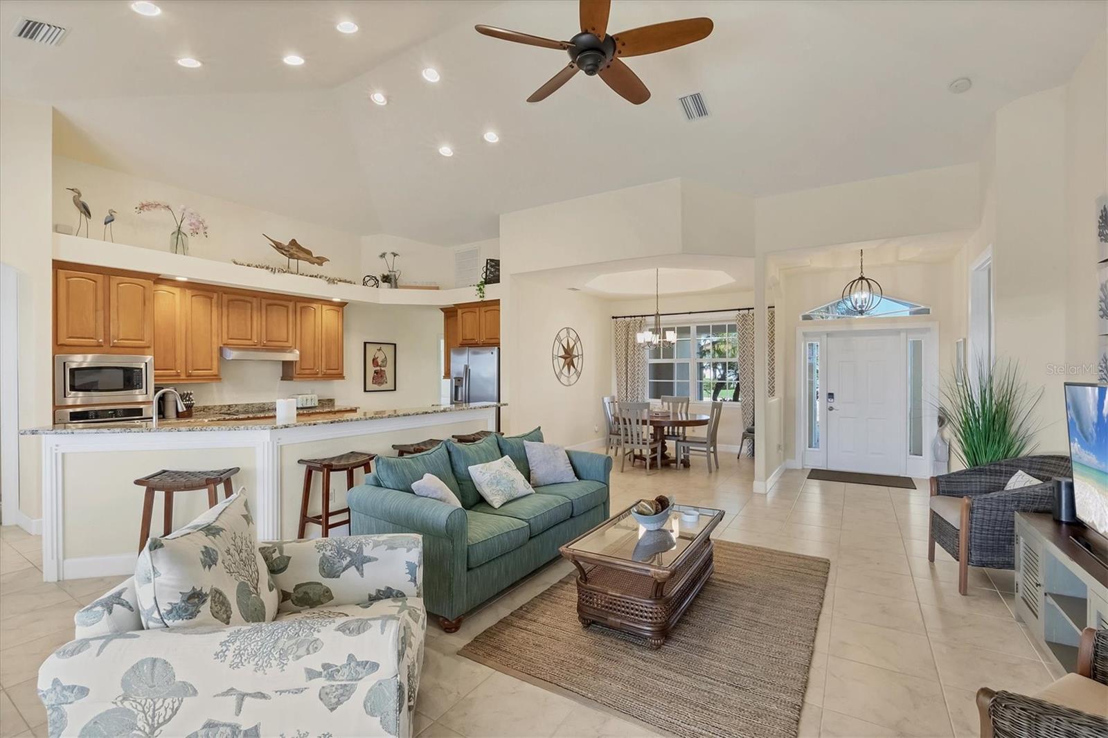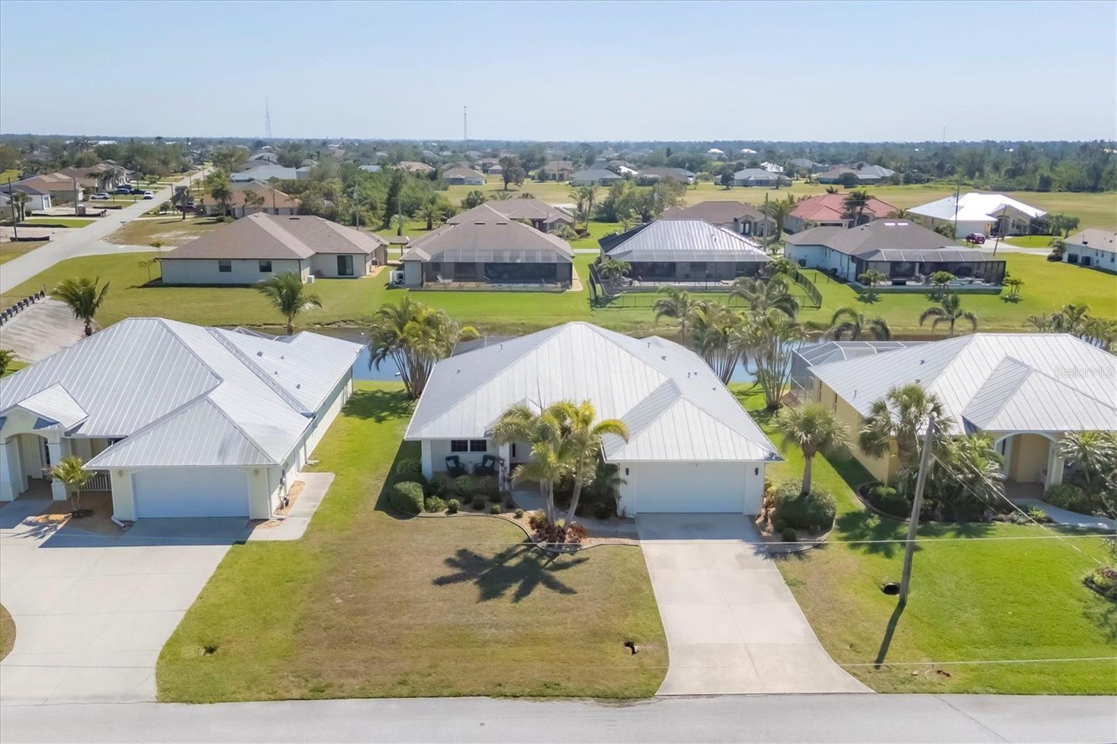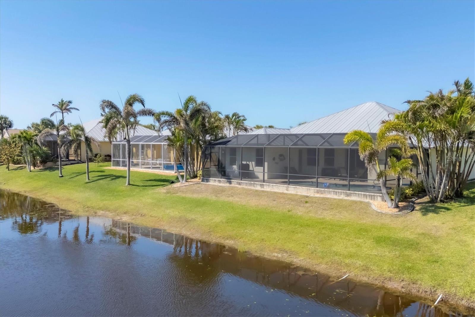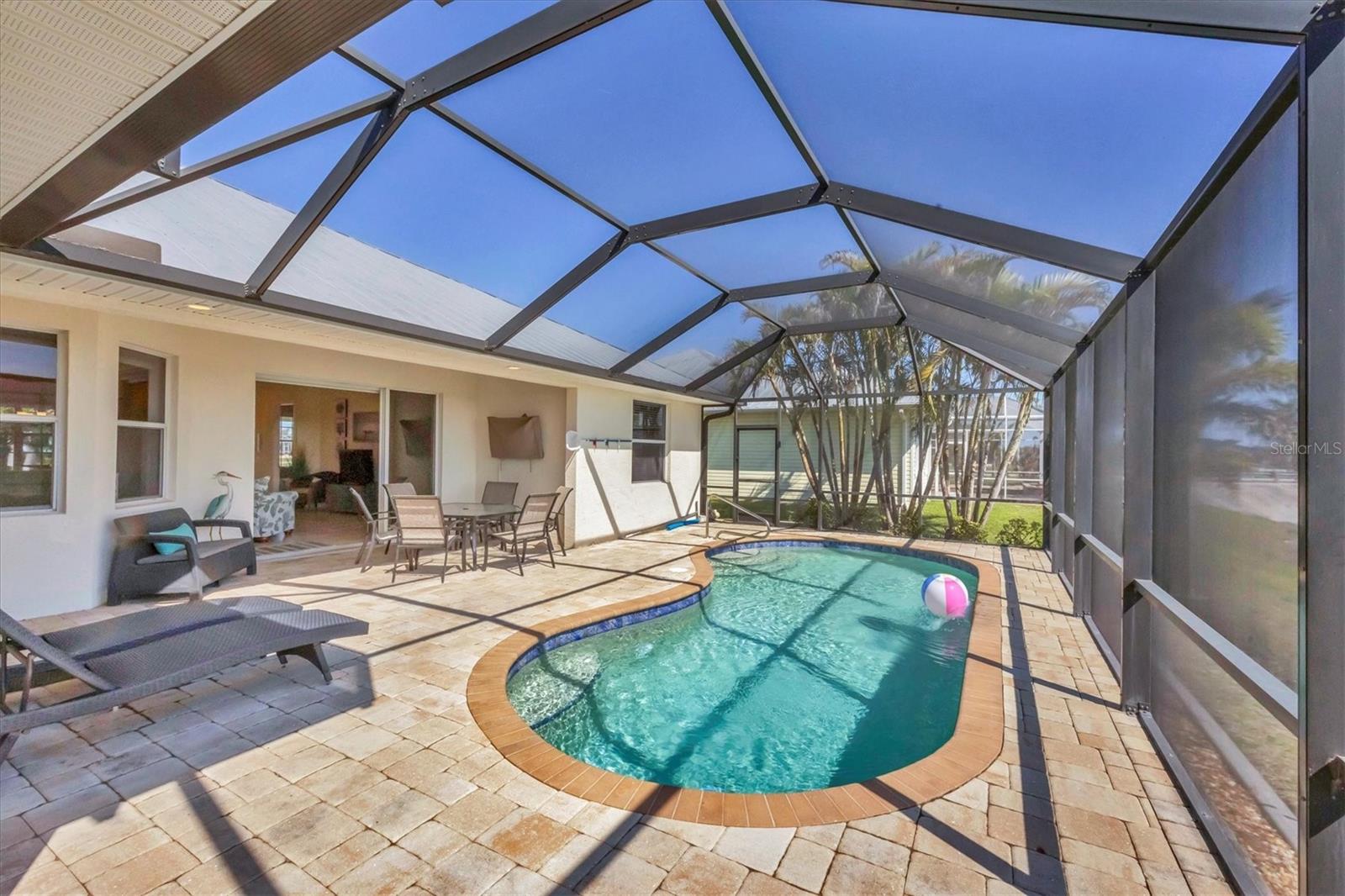 TURNKEY FURNISHED, SALTWATER POOL HOME IN ROTONDA WEST! This beautifully maintained 3-bedroom, 2-bath, 2-car garage home is located in the heart of Rotonda West, a sought-after golf course community. Featuring a 2024 AC, a durable METAL ROOF, and an X-FLOOD ZONE location, this property offers peace of mind and low maintenance. Step inside to a spacious living room with tile flooring, soaring cathedral ceilings, and triple sliding glass doors leading to the screened lanai and sparkling heated saltwater pool. The formal dining area is bathed in natural light from a large window and features a striking double tray ceiling for added elegance. The chef’s kitchen is designed for both function and style, showcasing granite countertops, stunning maple cabinetry, and GE stainless steel appliances. The open-concept layout is perfect for entertaining while enjoying beautiful views of the pool and canal beyond. The primary suite is a private retreat with direct lanai access, a spacious layout, and a large walk-in closet. The en-suite primary bath is well-appointed with dual vanities, a relaxing Jacuzzi tub, a walk-in shower with glass doors, a linen closet, and a private water closet. This home features a perfectly designed split floor plan with two well-placed guest rooms, offering privacy and functionality. The Jack-and-Jill guest bath is conveniently shared between them, featuring a double vanity, tub/shower combination, and a private water closet. The back guest bedroom enjoys stunning views of the freshwater canal, creating a peaceful retreat for family or visitors. Additional highlights include ceiling fans throughout, an interior laundry room with Samsung washer and dryer, upper cabinets, and a utility sink, plus a security system for added peace of mind. The lanai and pool area is designed for year-round enjoyment, featuring a paver pool deck, outdoor TV, and an electric pool heater to keep the water warm no matter the season. COASTAL GOLFING LIFESTYLE! Just minutes from multiple golf courses, pickleball courts, and a nearby park, this home is ideal for those who love outdoor recreation. Nestled on a tranquil freshwater canal, it offers privacy, scenic water views, and frequent wildlife sightings. Conveniently located near shopping, dining, and a short drive to area beaches.
