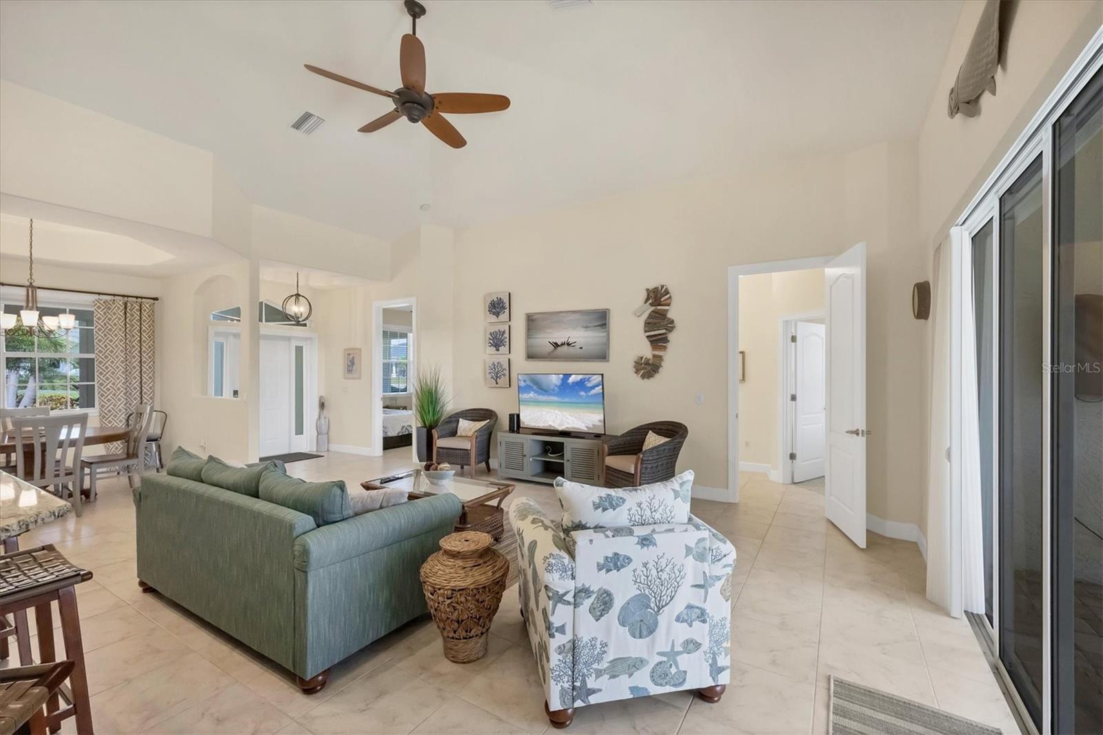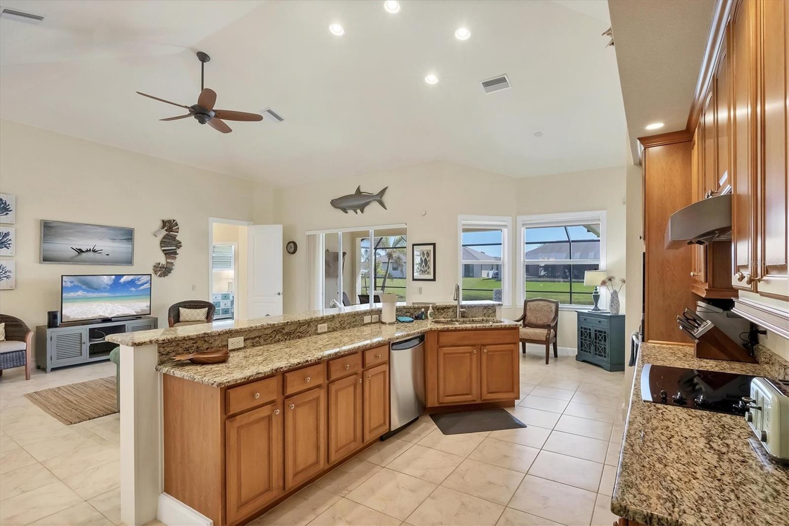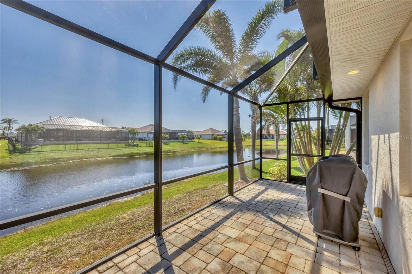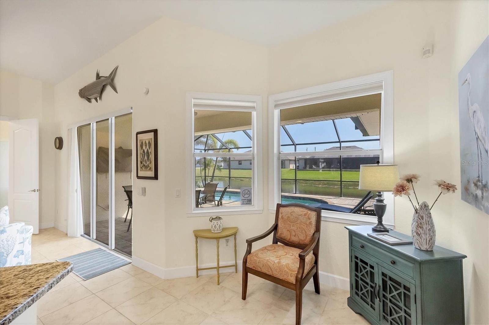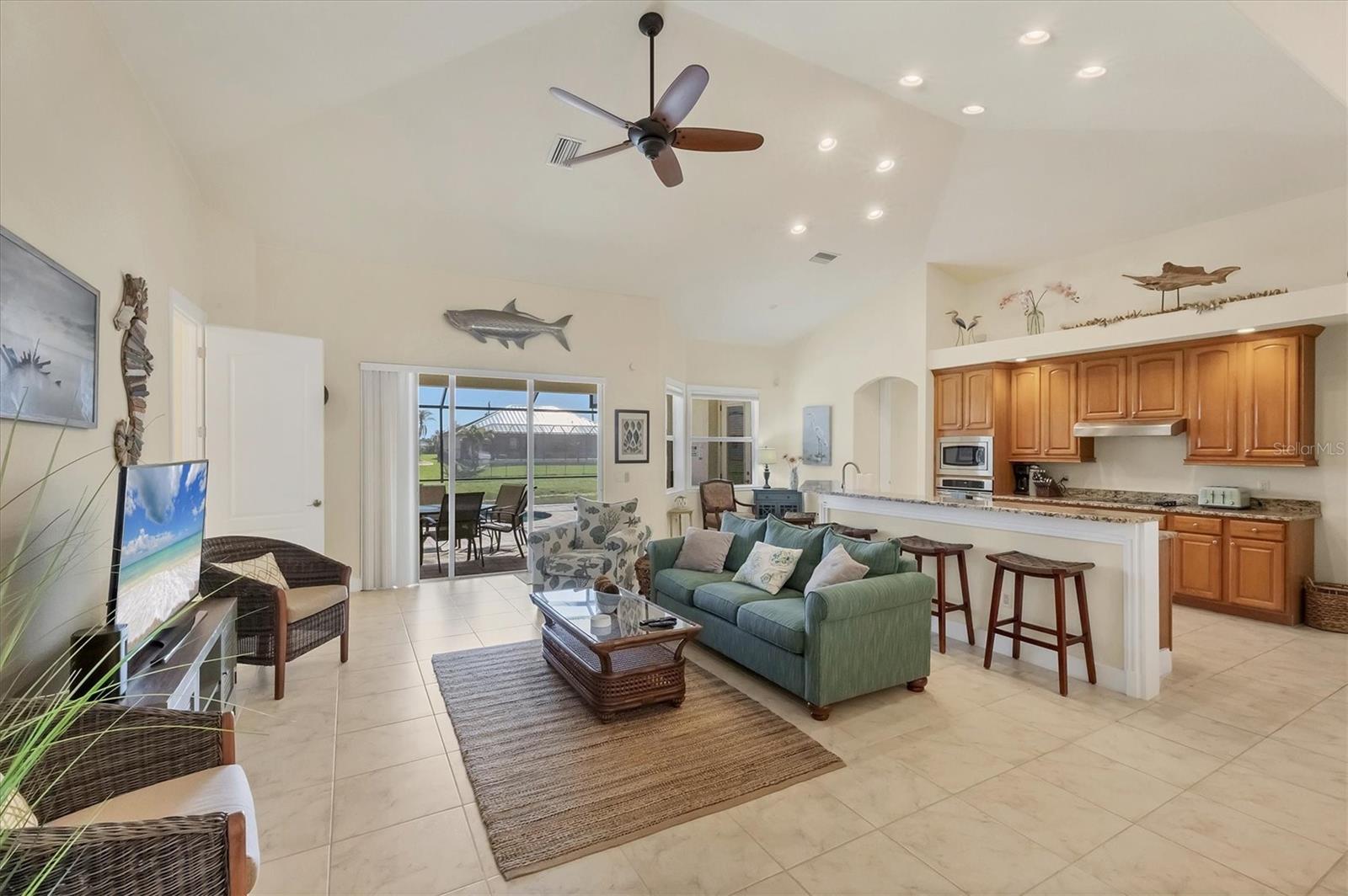 TURNKEY FURNISHED, SALTWATER POOL HOME IN ROTONDA WEST! This beautifully maintained 3-bedroom, 2-bath, 2-car garage home is located in the heart of Rotonda West, a sought-after golf course community. Featuring a 2024 AC, a durable METAL ROOF, and an X-FLOOD ZONE location, this property offers peace of mind and low maintenance. Step inside to a spacious living room with tile flooring, soaring cathedral ceilings, and triple sliding glass doors leading to the screened lanai and sparkling heated saltwater pool. The formal dining area is bathed in natural light from a large window and features a striking double tray ceiling for added elegance. The chef’s kitchen is designed for both function and style, showcasing granite countertops, stunning maple cabinetry, and GE stainless steel appliances. The open-concept layout is perfect for entertaining while enjoying beautiful views of the pool and canal beyond. The primary suite is a private retreat with direct lanai access, a spacious layout, and a large walk-in closet. The en-suite primary bath is well-appointed with dual vanities, a relaxing Jacuzzi tub, a walk-in shower with glass doors, a linen closet, and a private water closet. This home features a perfectly designed split floor plan with two well-placed guest rooms, offering privacy and functionality. The Jack-and-Jill guest bath is conveniently shared between them, featuring a double vanity, tub/shower combination, and a private water closet. The back guest bedroom enjoys stunning views of the freshwater canal, creating a peaceful retreat for family or visitors. Additional highlights include ceiling fans throughout, an interior laundry room with Samsung washer and dryer, upper cabinets, and a utility sink, plus a security system for added peace of mind. The lanai and pool area is designed for year-round enjoyment, featuring a paver pool deck, outdoor TV, and an electric pool heater to keep the water warm no matter the season. COASTAL GOLFING LIFESTYLE! Just minutes from multiple golf courses, pickleball courts, and a nearby park, this home is ideal for those who love outdoor recreation. Nestled on a tranquil freshwater canal, it offers privacy, scenic water views, and frequent wildlife sightings. Conveniently located near shopping, dining, and a short drive to area beaches.