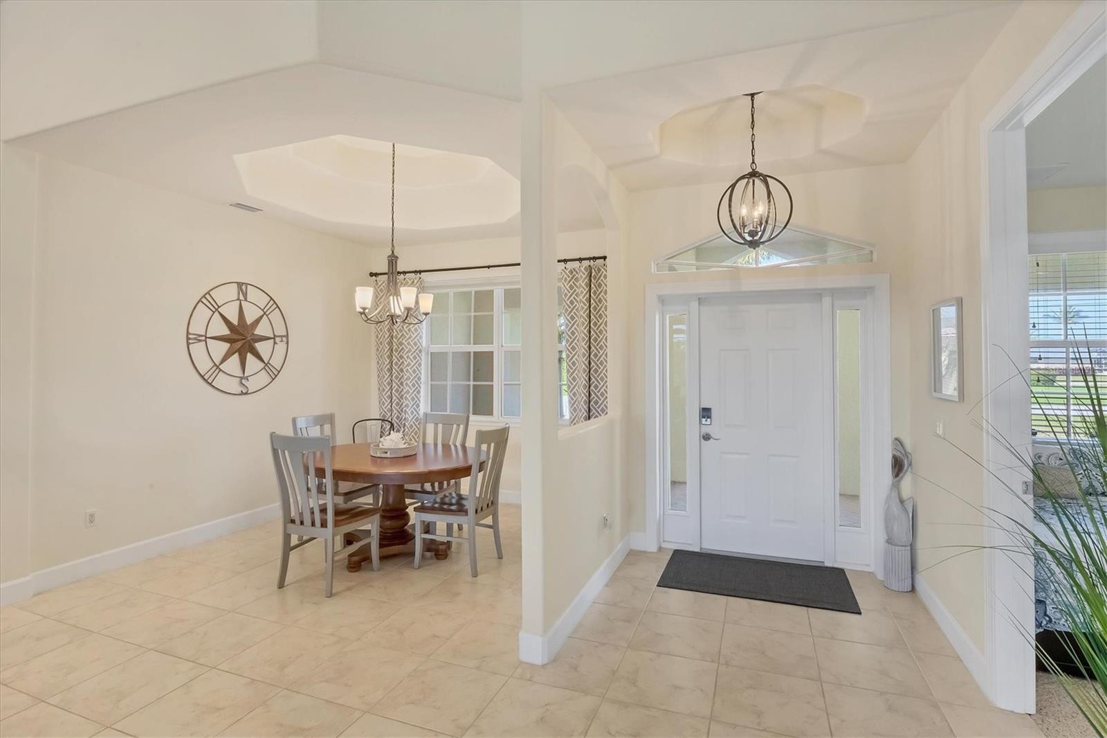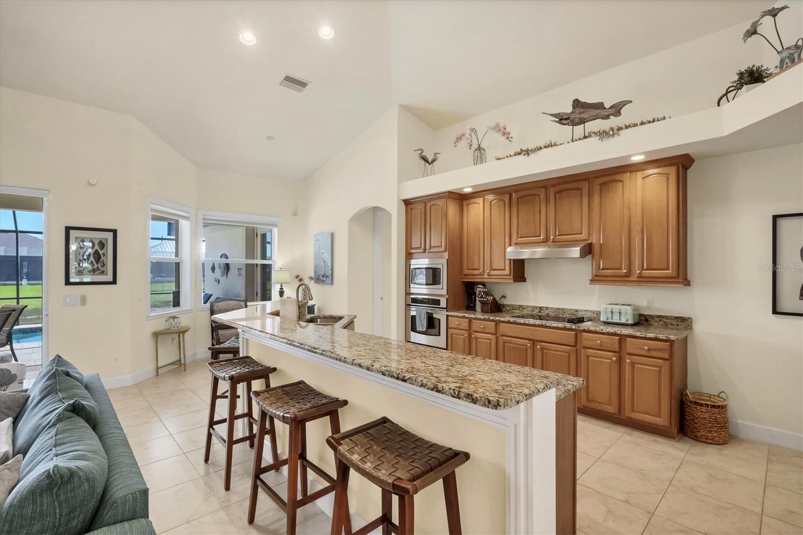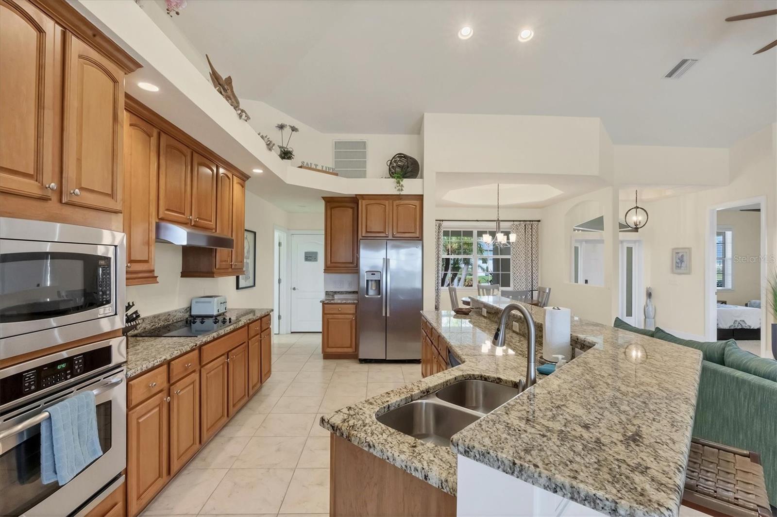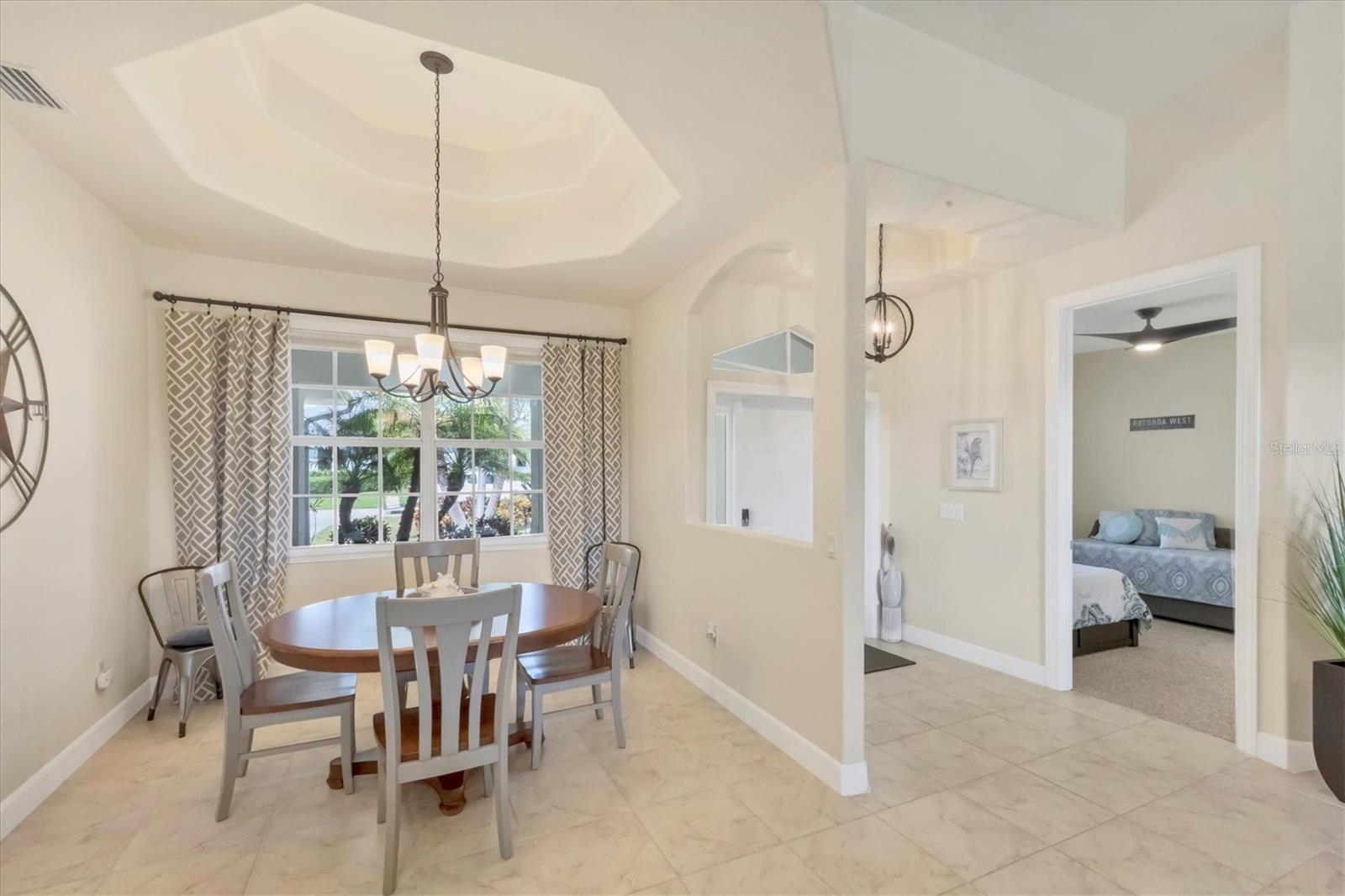 TURNKEY FURNISHED, SALTWATER POOL HOME IN ROTONDA WEST! This beautifully maintained 3-bedroom, 2-bath, 2-car garage home is located in the heart of Rotonda West, a sought-after golf course community. Featuring a 2024 AC, a durable METAL ROOF, and an X-FLOOD ZONE location, this property offers peace of mind and low maintenance. Step inside to a spacious living room with tile flooring, soaring cathedral ceilings, and triple sliding glass doors leading to the screened lanai and sparkling heated saltwater pool. The formal dining area is bathed in natural light from a large window and features a striking double tray ceiling for added elegance. The chef’s kitchen is designed for both function and style, showcasing granite countertops, stunning maple cabinetry, and GE stainless steel appliances. The open-concept layout is perfect for entertaining while enjoying beautiful views of the pool and canal beyond. The primary suite is a private retreat with direct lanai access, a spacious layout, and a large walk-in closet. The en-suite primary bath is well-appointed with dual vanities, a relaxing Jacuzzi tub, a walk-in shower with glass doors, a linen closet, and a private water closet. This home features a perfectly designed split floor plan with two well-placed guest rooms, offering privacy and functionality. The Jack-and-Jill guest bath is conveniently shared between them, featuring a double vanity, tub/shower combination, and a private water closet. The back guest bedroom enjoys stunning views of the freshwater canal, creating a peaceful retreat for family or visitors. Additional highlights include ceiling fans throughout, an interior laundry room with Samsung washer and dryer, upper cabinets, and a utility sink, plus a security system for added peace of mind. The lanai and pool area is designed for year-round enjoyment, featuring a paver pool deck, outdoor TV, and an electric pool heater to keep the water warm no matter the season. COASTAL GOLFING LIFESTYLE! Just minutes from multiple golf courses, pickleball courts, and a nearby park, this home is ideal for those who love outdoor recreation. Nestled on a tranquil freshwater canal, it offers privacy, scenic water views, and frequent wildlife sightings. Conveniently located near shopping, dining, and a short drive to area beaches.