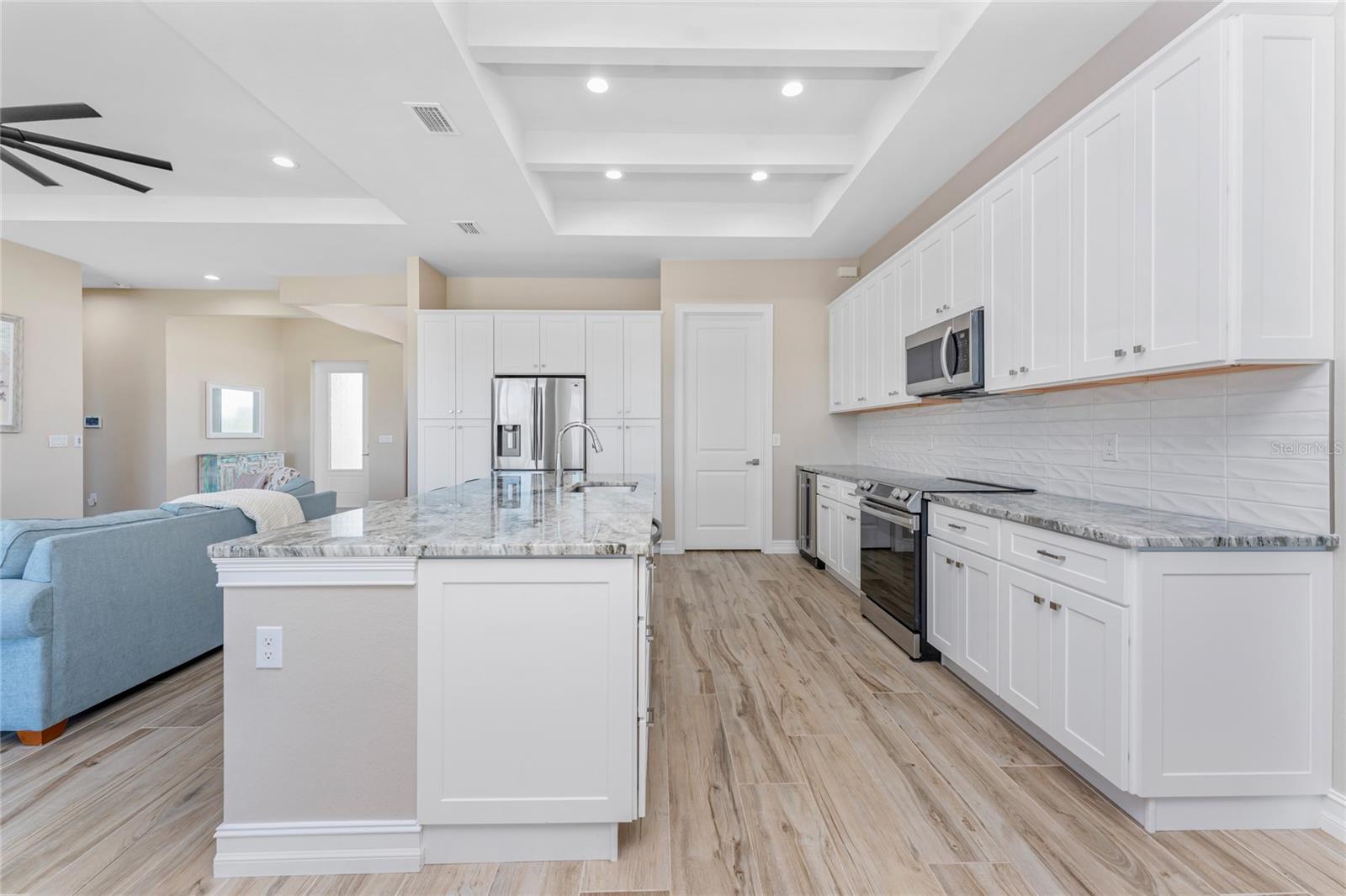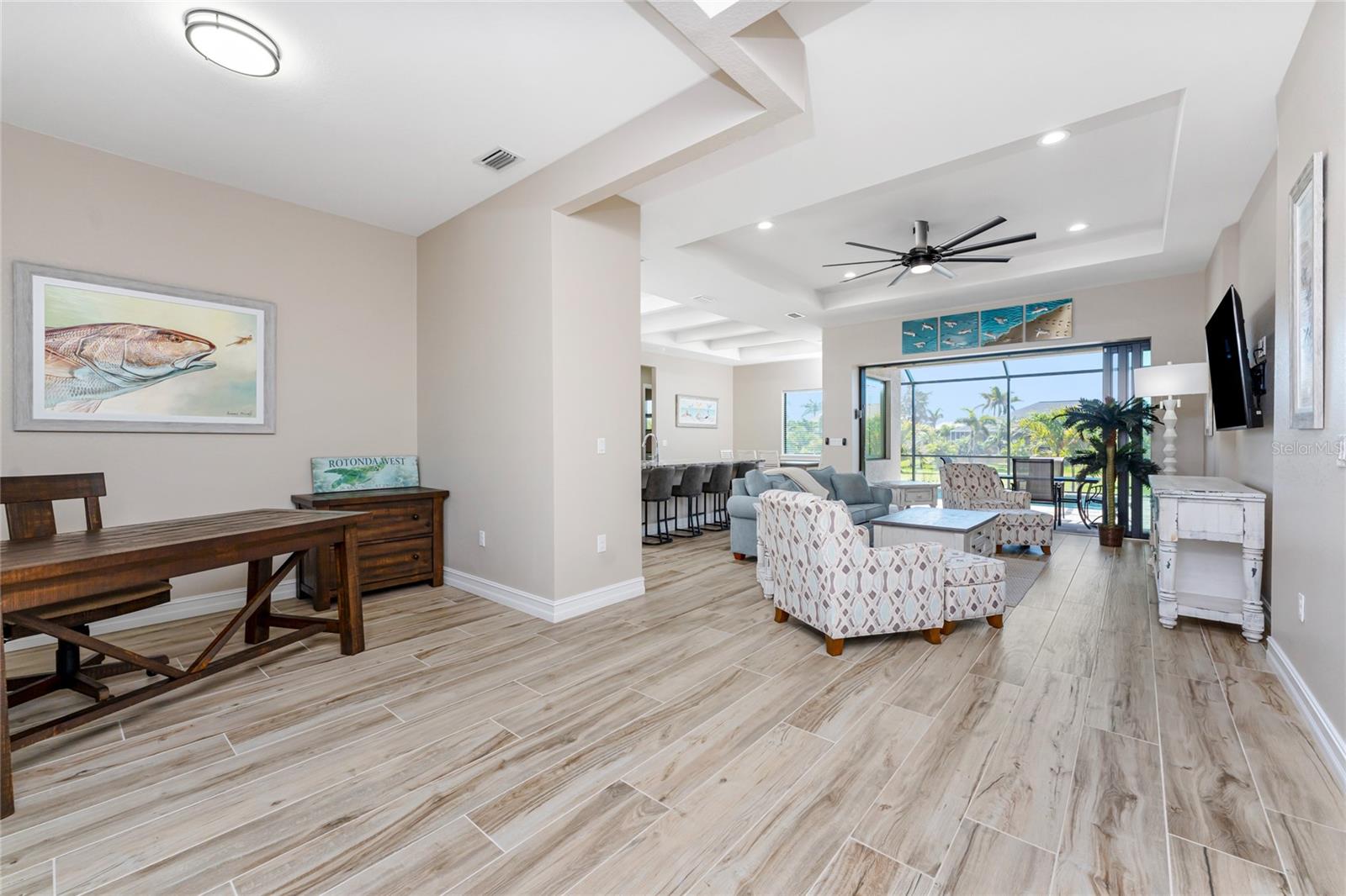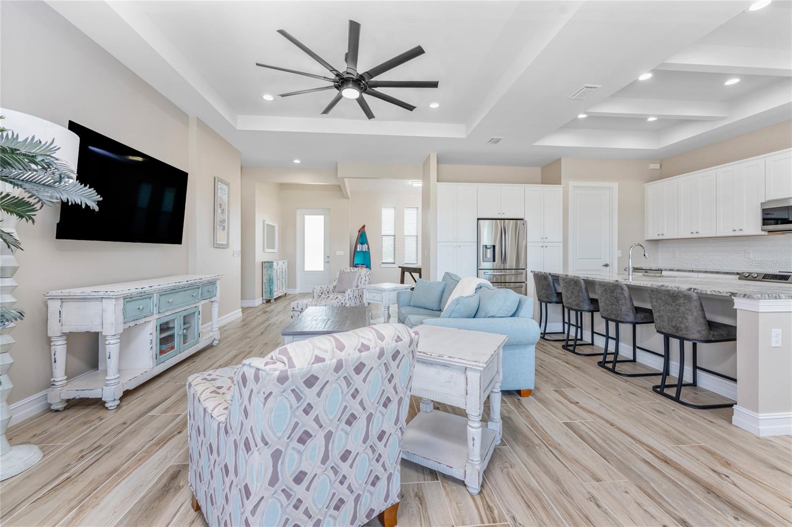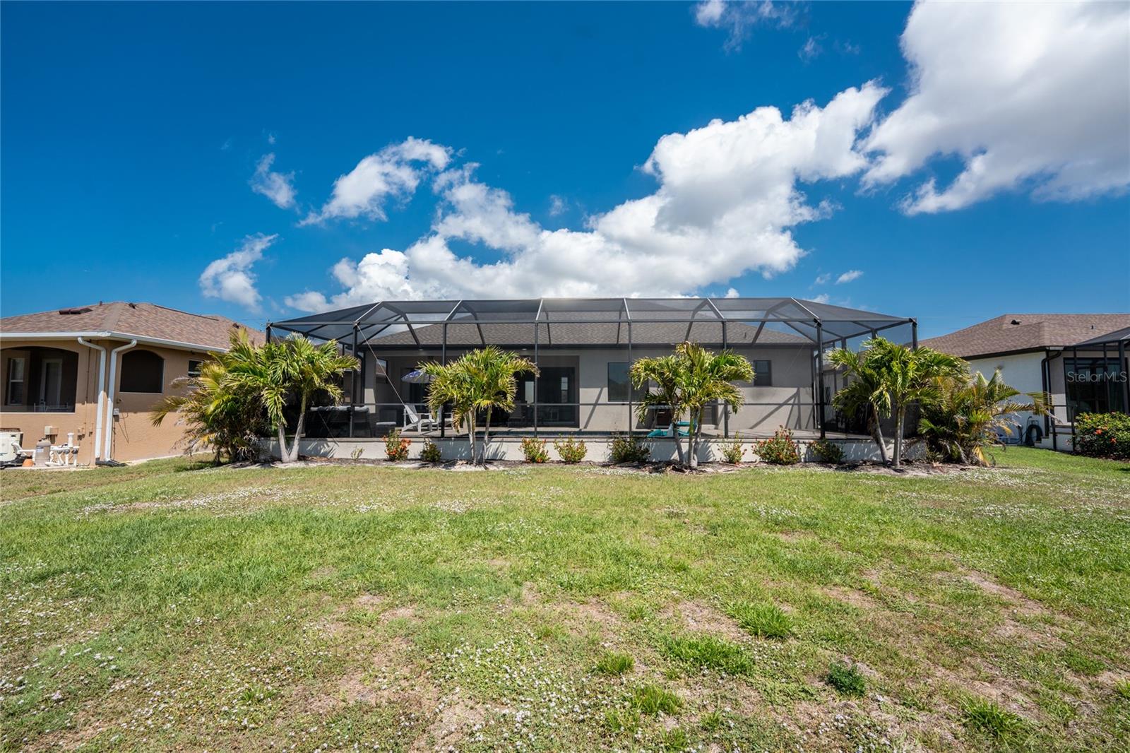 Step into luxury with this stunning turnkey-furnished 2022 custom-built pool home, set on an expansive lot in the sought-after golfing community of Rotonda West. Move-in ready and designed for effortless Florida living, this home is a showcase of modern elegance and thoughtful upgrades. From the moment you arrive, the striking contemporary exterior design, lush tropical landscaping, and paver driveway set the stage for what’s inside. The coveted three-car garage provides ample space for vehicles and storage, while the multi dimensional roof and architectural details at the entry welcomes you inside this three bedroom, two bath home. The well-planned split-bedroom layout has soaring coffered and tray ceilings, recessed lighting, and designer ceiling fans and light fixtures that add both style and function. Expansive pocketing sliders in the great room create a seamless transition to the lanai, offering breathtaking views of the sparkling pool. Wood-look tile flooring flows throughout, combining beauty with easy maintenance. The kitchen features granite countertops, glass tile backsplash, upgraded cabinetry, a center island, a double pantry, stainless steel appliances, and a wine fridge - perfect for entertaining. Just off the kitchen is a charming dining area with two large windows providing extraordinary views of the pool and backyard. The primary suite is a retreat of its own, with private pool access, walk-in closet, a spa-like bathroom with dual vanities, and a walk-in shower with stunning tilework and built-in bench and shelf. The additional two bedrooms both feature walk-in closets providing plenty of storage options. The guest bathroom is beautifully designed with a fully tiled walk-in shower and granite topped vanity providing comfort and convenience for family and friends. Step outside and find a beautiful outdoor living area where the large screened lanai and pool with sunshelf will be perfect for get togethers or floating your cares away. Spend your days away from home soaking up the Florida sun—whether on the nearby white-sand beaches, golfing on one of Rotonda West’s five premier courses, or launching your boat or kayak to explore the local waterways. Evenings can be spent unwinding by the pool, grilling on the lanai, or dining at a local clubhouse. With hurricane impact windows for peace of mind and an unbeatable location near beaches, marinas, shopping, and dining, this exceptional home is ready for you. Don’t miss out, schedule your showing today!