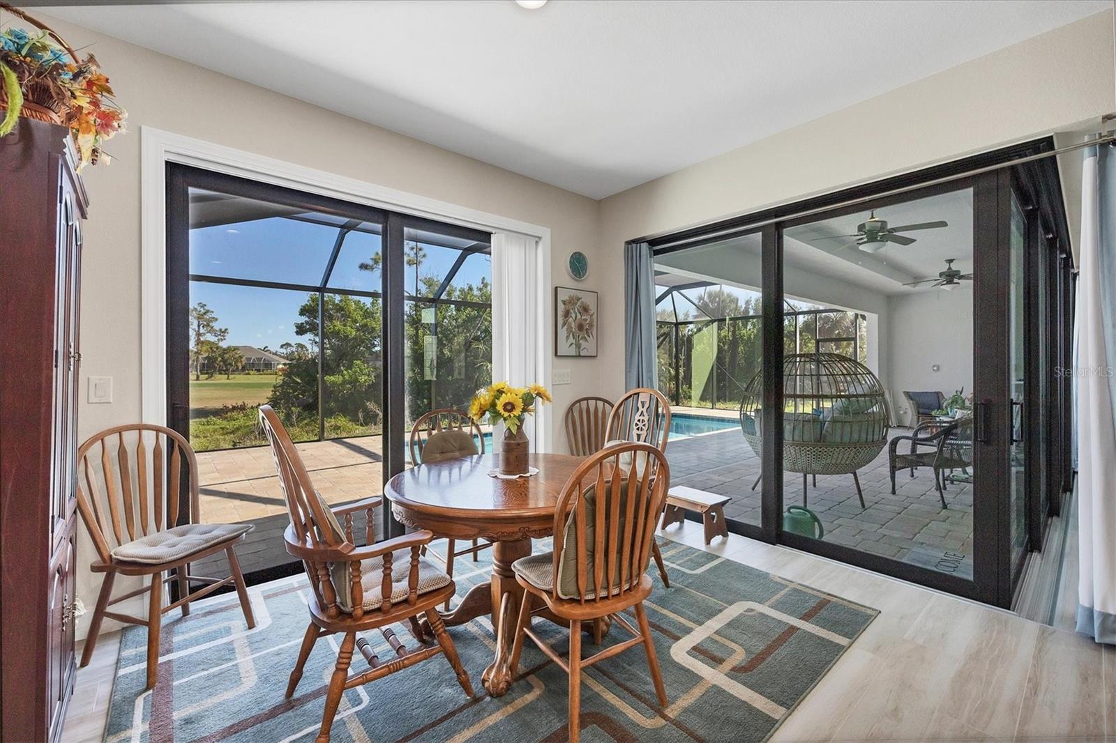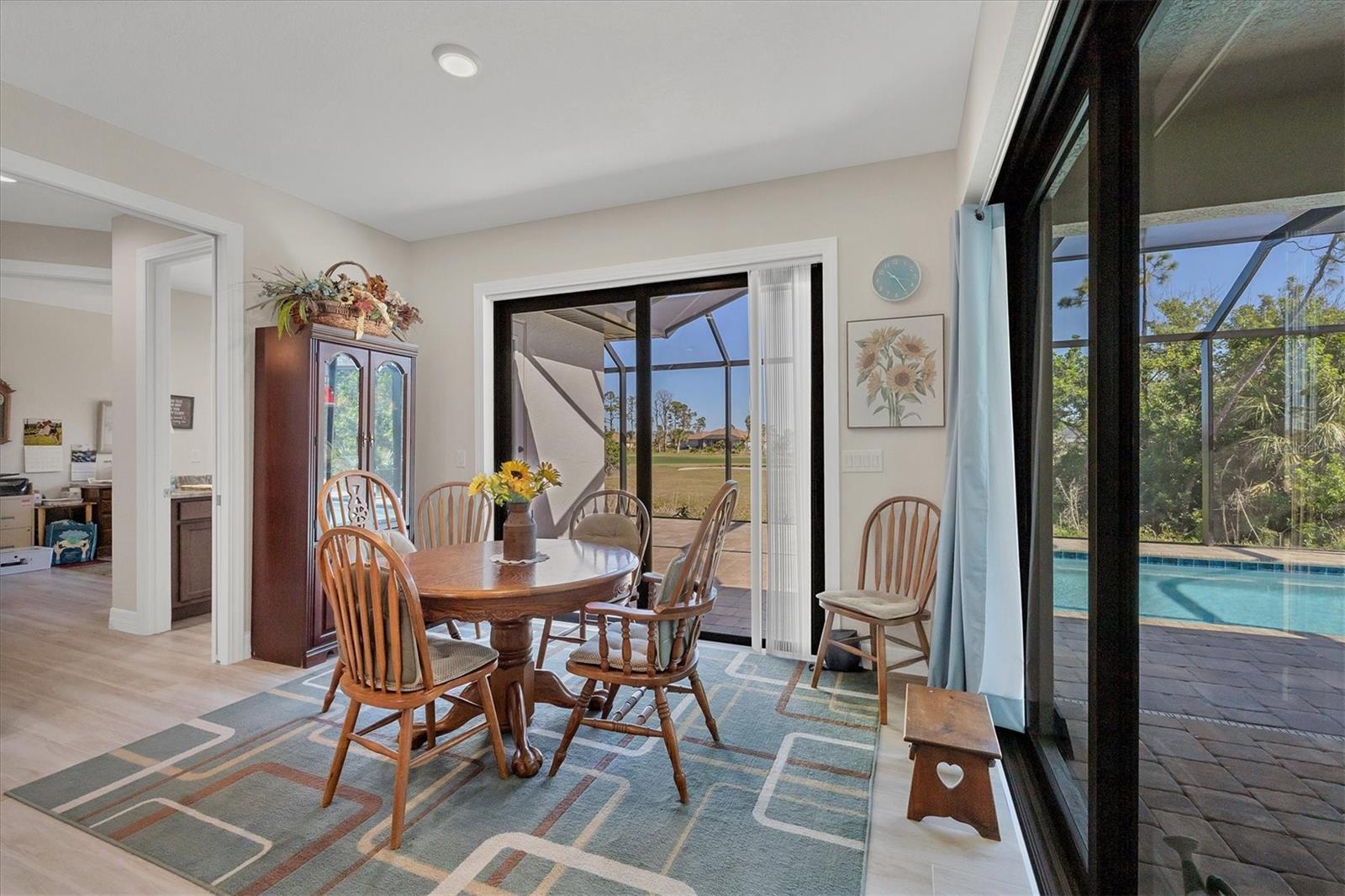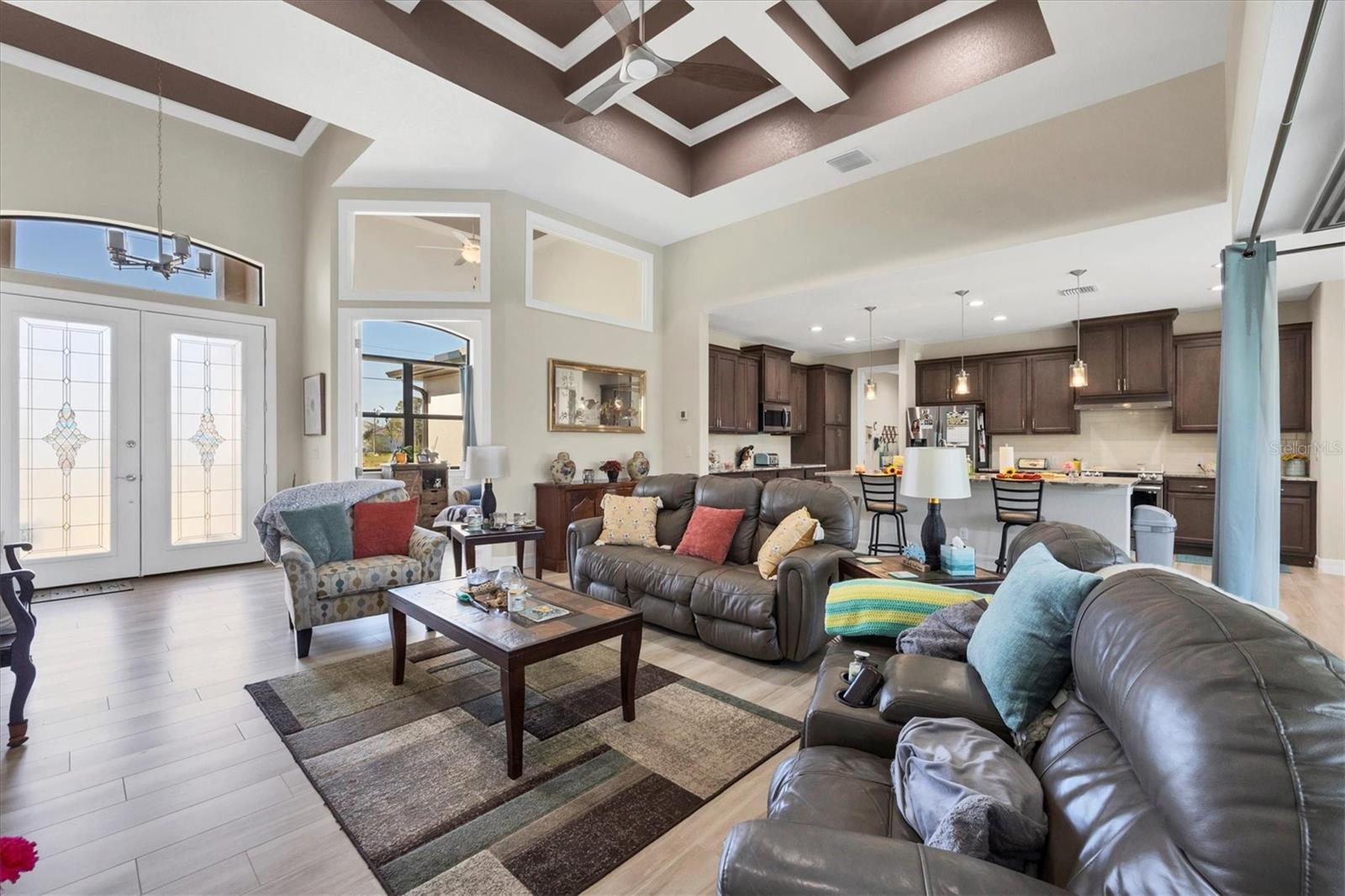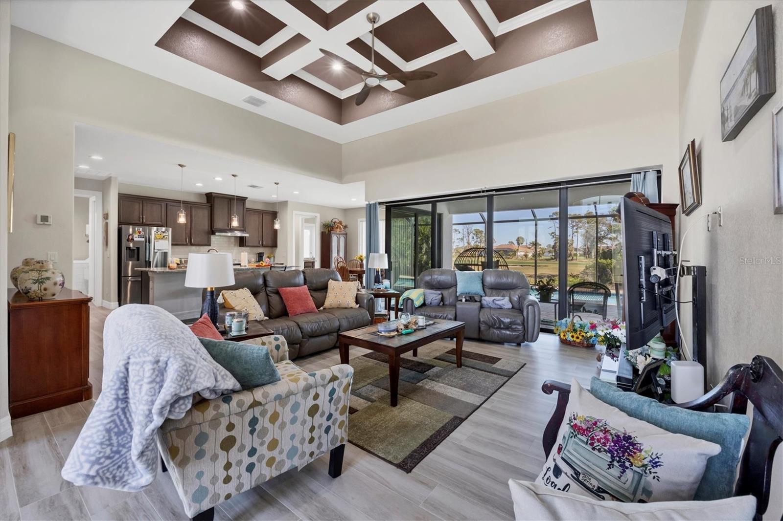 Priced to Sell!! Stunning 2023 DM Dean Custom Home on Golf Course Lot with Pool! Welcome to this beautifully crafted 3-bedroom, 2-bathroom DM Dean home, located on an oversized lot in the desirable Rotonda community—directly on the golf course! This home offers exceptional design, functionality, and luxurious finishes throughout. Step inside to a grand great room featuring a 14-foot coffered ceiling and impressive 8-foot impact-rated sliding glass doors that open at a 90-degree angle, creating a seamless transition to the outdoor living space. With 9-foot ceilings throughout and impact glass windows and doors, the home is both spacious and secure. The chef’s kitchen and bathrooms are appointed with soft-close cabinetry and elegant Level 3 Fantasy Brown granite countertops. Plank tile flooring flows throughout the home, and energy efficiency is enhanced with R-19 spray foam insulation. The den provides flexibility for a home office or additional living space, while the 3-car garage offers ample storage. The luxurious master suite features a spa-like bath with a walk-in shower equipped with both a rain head and handheld shower, a built-in bench, and ADA-compliant toilets for added comfort. The well-appointed laundry room includes a laundry tub for convenience. Step outside to your private backyard oasis—complete with a sparkling pool featuring a color-changing light, perfect for evening relaxation or entertaining guests. The homeowners flood insurance policy is assumable! Don’t miss the opportunity to own this move-in ready, high-quality home with stunning golf course views and top-tier finishes throughout!