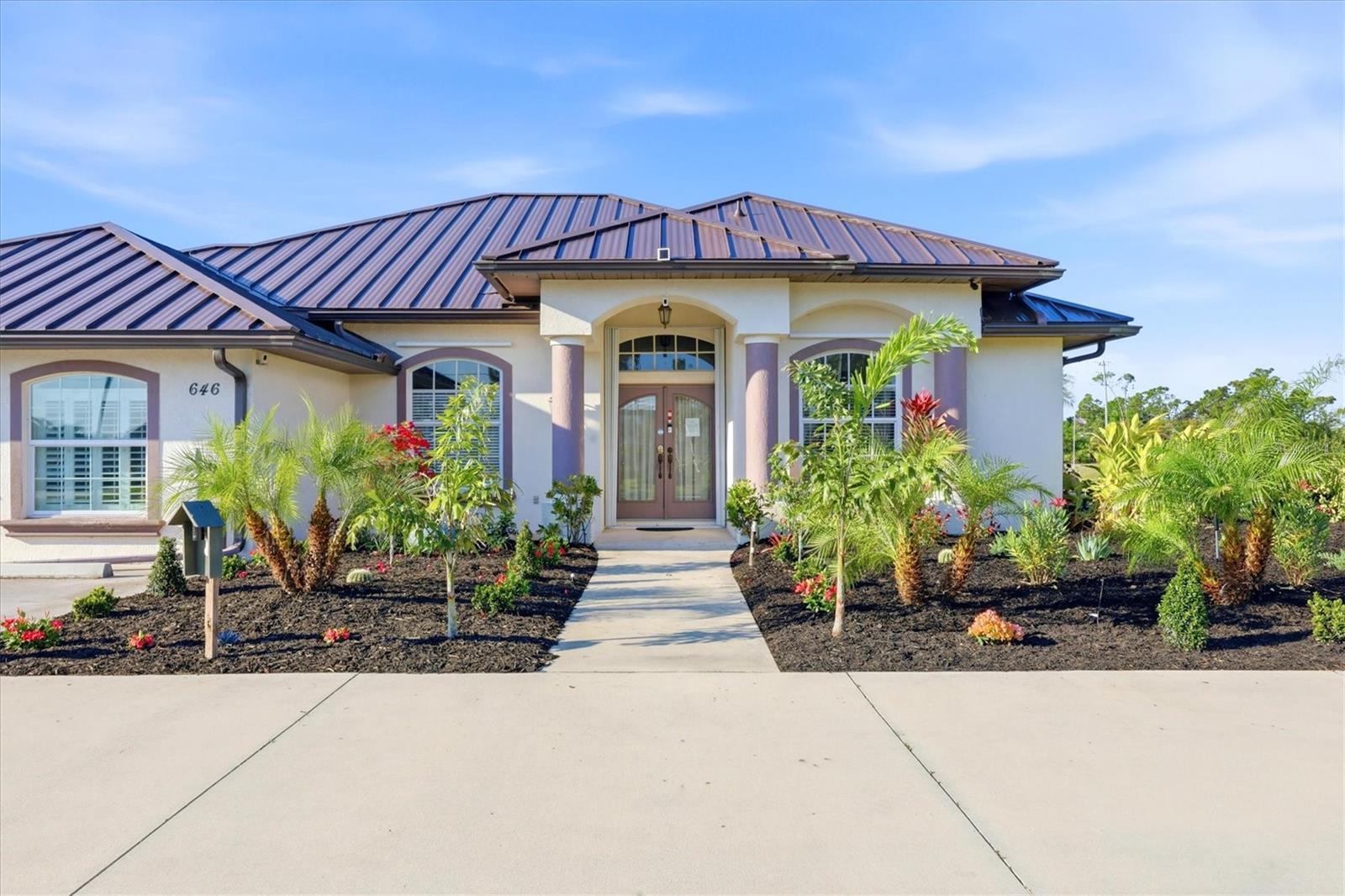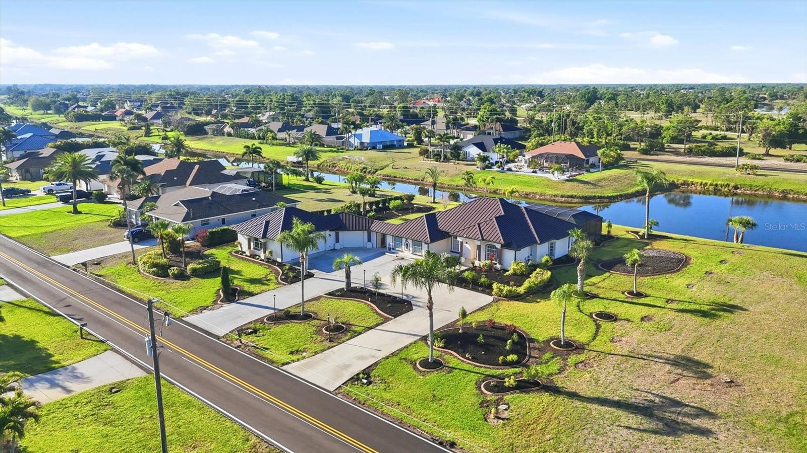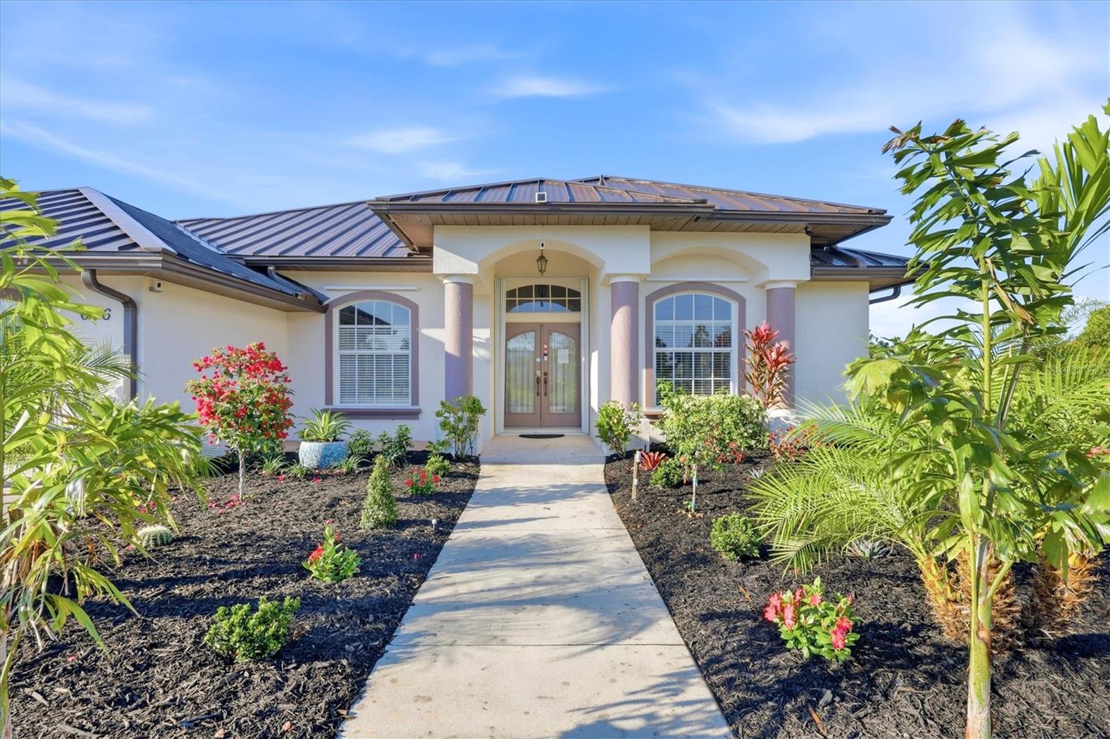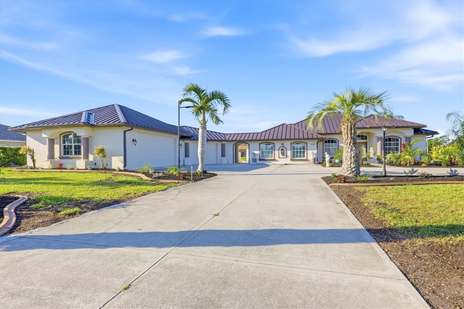 One or more photo(s) has been virtually staged. When heading down a new path, the journey becomes infinitely more pleasurable when your destination is this spacious and welcoming home. Rich with curb appeal, tropical landscaping nourished by a zoned irrigation system surrounds a distinctive circular driveway that marries practicality with aesthetic beauty, providing a timeless and elegant greeting for all who arrive. Situated on a highly desirable double waterfront estate lot in an X-flood zone (for insurance savings), bringing nature inside via seamless indoor-outdoor connections was paramount in the design of this home. The front entry provides a clear sightline to the lanai, featuring its sparkling pool, attractive paver patio, and panoramic pool screen (2023), which effectively showcases a wide, tranquil canal view. The home's thoughtfully designed spaces evolve visually and blend seamlessly with a neutral color palette that promotes a sense of calm, resulting in a clean, uncluttered look. Throughout the home, expansive sliders gracefully integrate indoor and outdoor living areas, effectively capturing the essence of Florida living. At the same time, the oversized lanai offers an all-season style conducive to al fresco living. This gathering spot provides privacy and a serene view of the canal. At the heart of the home is the kitchen, where a light, airy feel prevails and abundant cabinetry is paired with a prep island, upgraded stainless-steel appliances (including a double oven), and a Bosch dishwasher. A large laundry room is conveniently located nearby and offers built-in cabinetry, a washer/dryer, and a laundry sink. After a fun-filled day spent at Englewood Beach, relaxation is encouraged by the Primary suite, which opens to the pool through sliding doors. Its ensuite bathroom is a spa-inspired space. Highlights include a generous walk-in shower, a soaking tub, and dual vanities. Guest privacy is ensured, with three additional bedrooms, a convenient flex room, and a shared bath outfitted with a tub/shower combination. Resident hobbyists, car enthusiasts, or contractors will appreciate the SPACIOUS 1125 SQ.FT. GARAGE with illuminated attic storage and ample room to house multiple cars, a boat, or a home workshop--the choice is yours! OTHER NOTABLE UPDATES INCLUDE a standing seam metal roof with dry-in underlayment designed for long-term durability and insurance favorability (2023), a 50 amp Level 2 EV charging outlet, a professionally installed transfer switch for easy generator hook-up, Hansgrohe faucets, Schonbek chandeliers in the dining room and foyer, and for additional peace of mind, there is a security system comprised of Lorax, Ring cameras, and ADT w/wireless back-up, whole-house hurricane protection, dual AC units, and reinforced garage doors. This distinctive home, which celebrates cohesive and thoughtful design, is situated on a double estate lot in the heart of the highly desirable Rotonda West community. It is within a short drive to the pristine Gulf beaches of Boca Grande and Englewood. There are world-class fishing and boating opportunities, as well as various delectable dining establishments, farmer's markets, and eclectic shopping venues, nearby. Additionally, Rotonda West is a golfer's paradise with five courses within the community. If this sounds intriguing, call today to schedule a private showing and prepare to be captivated by this vibrant community, where every day feels like a vacation. SELLER FINANCING AVAILABLE AT 4.25% FOR QUALIFIED BUYERS.