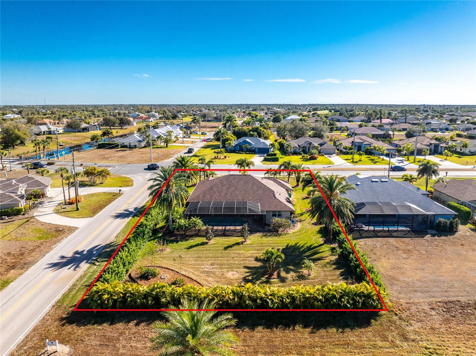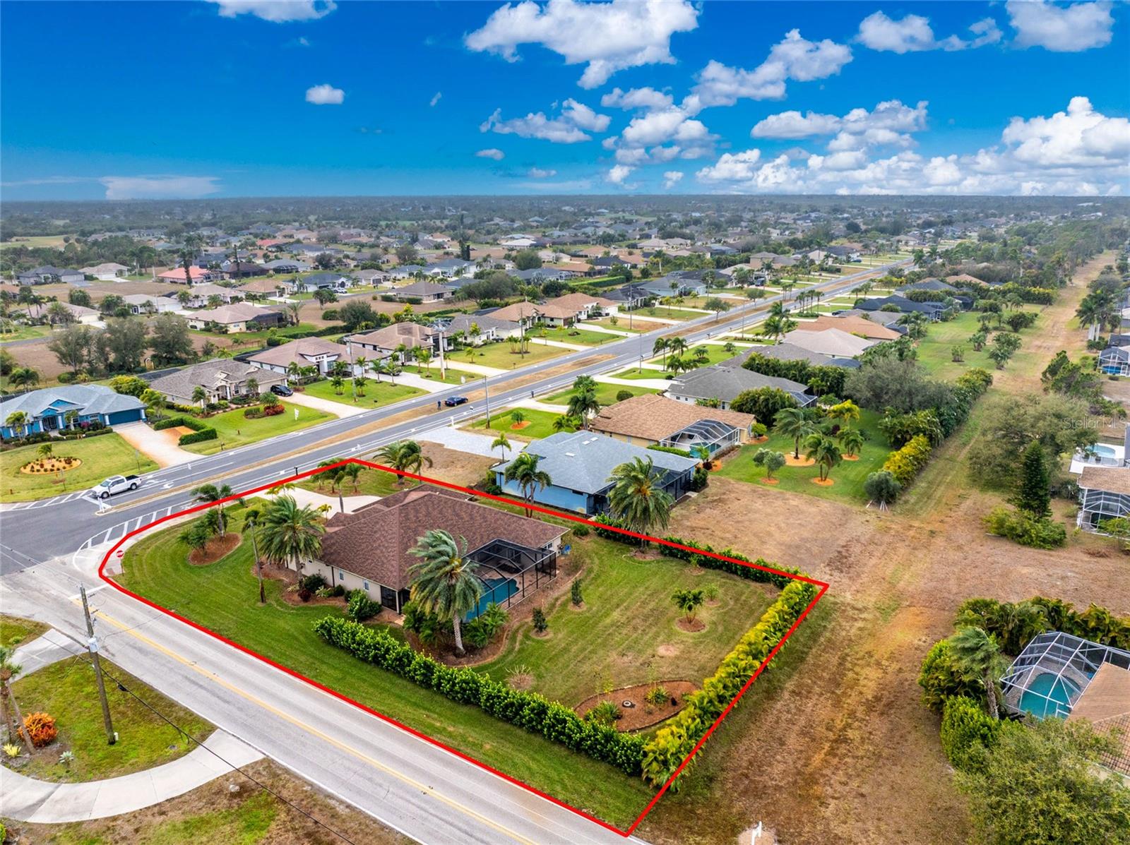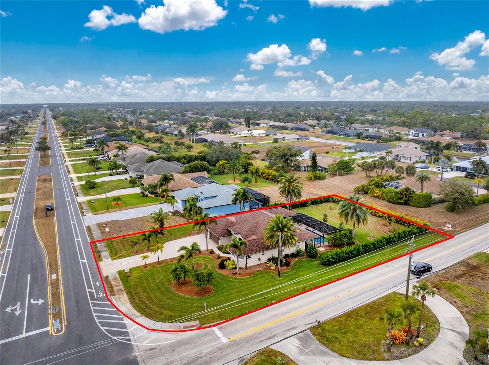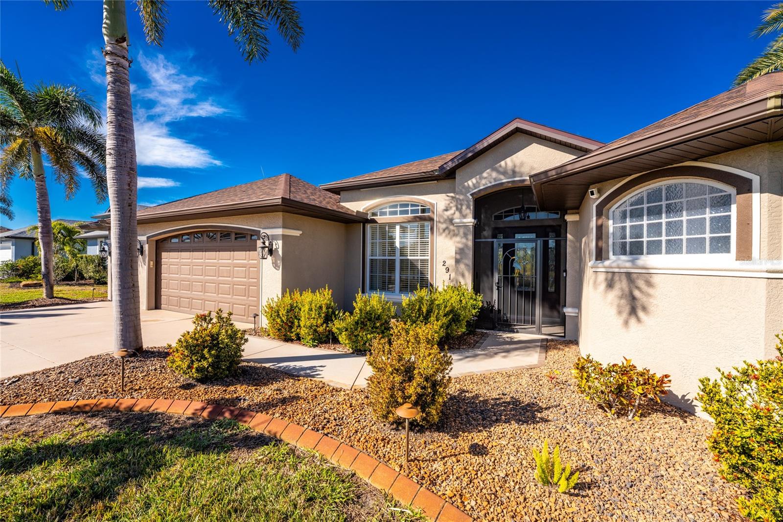 Stunning Former Model Pool Home that has been completely remodeled, transforming it into a modern Florida masterpiece! Set on an expansive, rare nearly half-acre corner lot in an X Flood Zone on one of the most desirable boulevards within the deed-restricted Rotonda West community, this 3-bedroom + den or 4th bedroom, 2-bathroom, 3-car garage shows like a brand new model home, and truly represents the epitome of contemporary Florida living! From the moment you set foot on this property, you’ll immediately be struck by how this home’s curb appeal “pops.” You’ll be greeted by a custom medallion-inlay, grand palm-lined driveway, curbed beds with towering palm trees, and a multitude of flowering shrubs. A custom screened front porch beckons you inside, where you’ll be amazed by the incredible natural light that floods throughout the main living area, accentuating the soaring 13-foot coffered ceiling and a clear line-of-sight through the home to the sparkling lanai and updated pool. Modern wood-look tile flooring flows throughout the main living areas, while architectural details abound, including custom plant shelves, niches, and crown molding, giving the home a truly upscale feel. The centerpiece of the great room is a stunning, floor-to-ceiling marble mosaic-tiled accent wall, with a linear fireplace, built-in cabinetry, and beautiful wood floating shelves. The open-plan chef-inspired kitchen includes abundant white shaker-style cabinetry, soft-close doors, sparkling white quartz counters, a custom tile backsplash, an oversized “statement” island with seating for five, a coffee bar, an additional center island with shiplap siding, and a huge walk-in pantry. The eat-in space has a spectacular view of the pool through a large aquarium-glass window. The ensuite primary bedroom is a stunner, w/super-plush carpeting, a light-drenched bay window wall, direct pool access, and two walk-in closets. The primary bath is jaw-dropping, with custom floor and wall tile, a free-standing soaker tub, a Roman style walk-in shower with dual heads, and dual vanities with vessel sinks, fully remodeled in 2022. Two guest bedrooms are separated from the main common area via a pocketed door, with one providing direct pool access through a sliding-glass door. The large den area features a double-door entry and can easily serve as a true fourth bedroom, office, gym, or hobby room. The laundry room features newer washer and dryer and floating shelves for storage. The oversized 3-car garage has epoxy flooring and new custom pull-down screens to allow a comfortable breeze while working in the garage. The spacious lanai includes updated stained and stamped concrete decking, a custom ceiling fan, and a large double-Roman freshly resurfaced pool. The back yard is your private oasis, with amazing landscaping beds and complete privacy via 7-foot tall Clusia hedges across both sides and 8-foot Areca Palms across the back. With a new roof and HVAC in 2022, plus a full interior remodel that same year, you’ll have nothing to do at the fully remodeled 291 Rotonda Blvd East but move in and immediately start enjoying the amazing Florida sunshine! Rotonda West is an expanding community that includes canals, lakes, golf courses, playground, pickleball courts, bike paths, w/easy access to beaches, a 10-mile “rail trail,” boating, and world-class fishing. Welcome to your dream home!