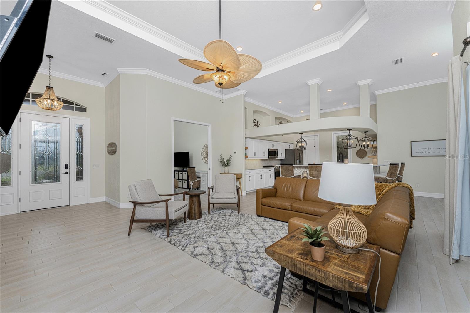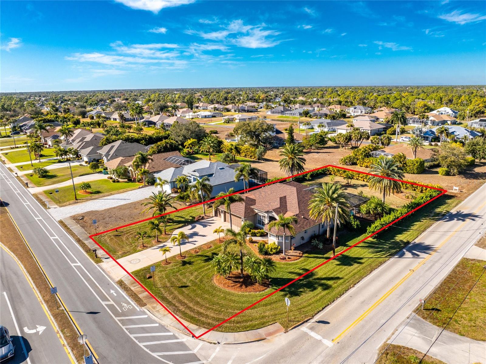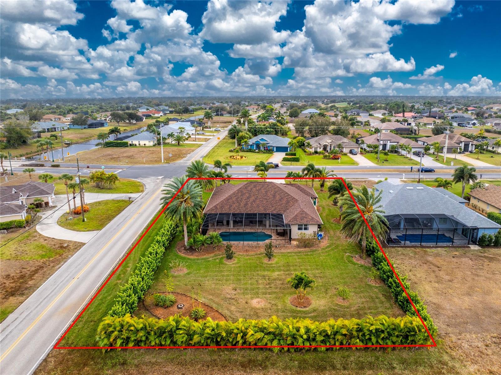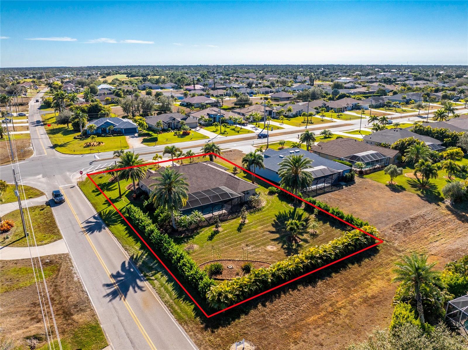 Stunning Former Model Pool Home that has been completely remodeled, transforming it into a modern Florida masterpiece! Set on an expansive, rare nearly half-acre corner lot in an X Flood Zone on one of the most desirable boulevards within the deed-restricted Rotonda West community, this 3-bedroom + den or 4th bedroom, 2-bathroom, 3-car garage shows like a brand new model home, and truly represents the epitome of contemporary Florida living! From the moment you set foot on this property, you’ll immediately be struck by how this home’s curb appeal “pops.” You’ll be greeted by a custom medallion-inlay, grand palm-lined driveway, curbed beds with towering palm trees, and a multitude of flowering shrubs. A custom screened front porch beckons you inside, where you’ll be amazed by the incredible natural light that floods throughout the main living area, accentuating the soaring 13-foot coffered ceiling and a clear line-of-sight through the home to the sparkling lanai and updated pool. Modern wood-look tile flooring flows throughout the main living areas, while architectural details abound, including custom plant shelves, niches, and crown molding, giving the home a truly upscale feel. The centerpiece of the great room is a stunning, floor-to-ceiling marble mosaic-tiled accent wall, with a linear fireplace, built-in cabinetry, and beautiful wood floating shelves. The open-plan chef-inspired kitchen includes abundant white shaker-style cabinetry, soft-close doors, sparkling white quartz counters, a custom tile backsplash, an oversized “statement” island with seating for five, a coffee bar, an additional center island with shiplap siding, and a huge walk-in pantry. The eat-in space has a spectacular view of the pool through a large aquarium-glass window. The ensuite primary bedroom is a stunner, w/super-plush carpeting, a light-drenched bay window wall, direct pool access, and two walk-in closets. The primary bath is jaw-dropping, with custom floor and wall tile, a free-standing soaker tub, a Roman style walk-in shower with dual heads, and dual vanities with vessel sinks, fully remodeled in 2022. Two guest bedrooms are separated from the main common area via a pocketed door, with one providing direct pool access through a sliding-glass door. The large den area features a double-door entry and can easily serve as a true fourth bedroom, office, gym, or hobby room. The laundry room features newer washer and dryer and floating shelves for storage. The oversized 3-car garage has epoxy flooring and new custom pull-down screens to allow a comfortable breeze while working in the garage. The spacious lanai includes updated stained and stamped concrete decking, a custom ceiling fan, and a large double-Roman freshly resurfaced pool. The back yard is your private oasis, with amazing landscaping beds and complete privacy via 7-foot tall Clusia hedges across both sides and 8-foot Areca Palms across the back. With a new roof and HVAC in 2022, plus a full interior remodel that same year, you’ll have nothing to do at the fully remodeled 291 Rotonda Blvd East but move in and immediately start enjoying the amazing Florida sunshine! Rotonda West is an expanding community that includes canals, lakes, golf courses, playground, pickleball courts, bike paths, w/easy access to beaches, a 10-mile “rail trail,” boating, and world-class fishing. Welcome to your dream home!