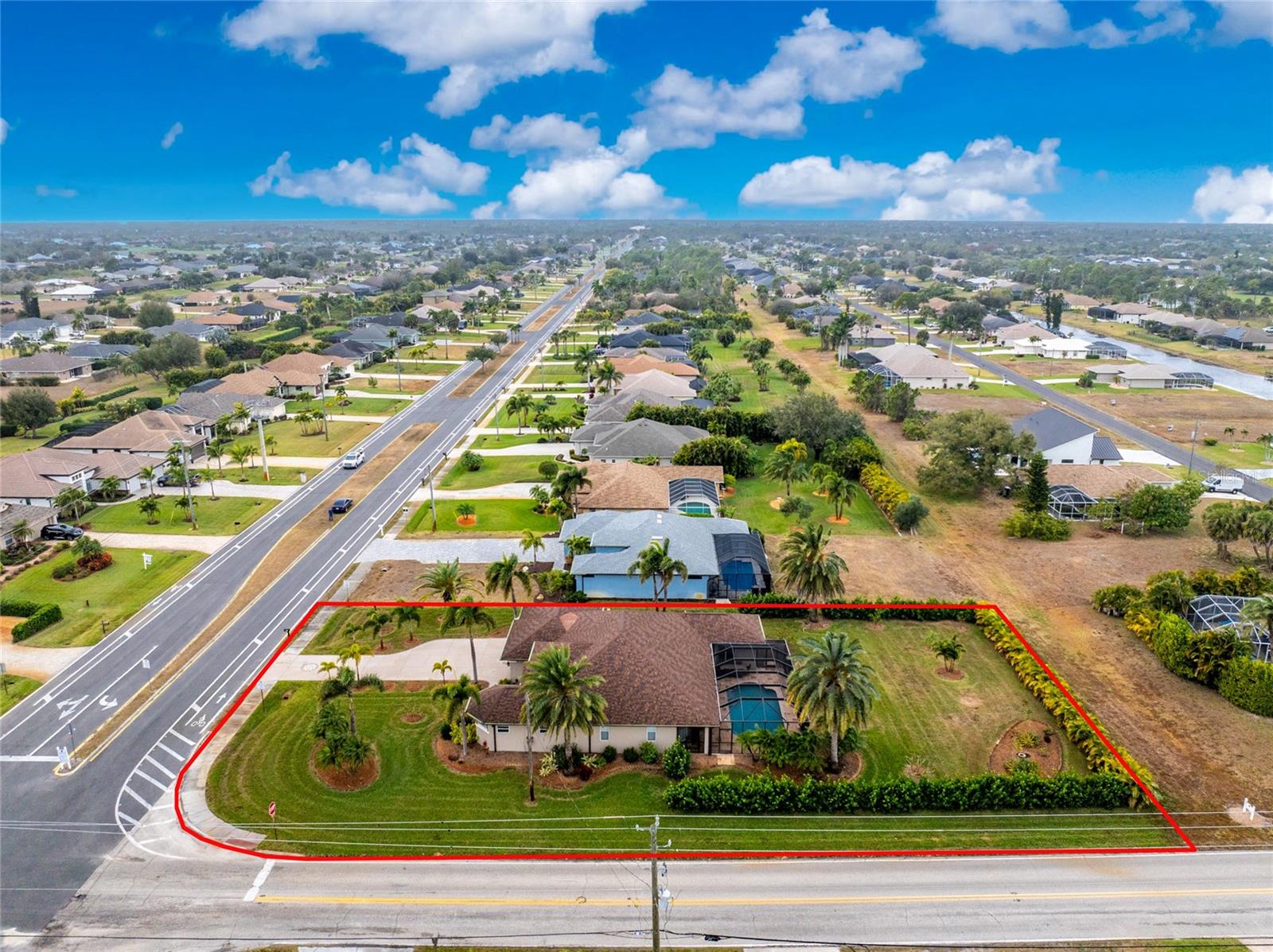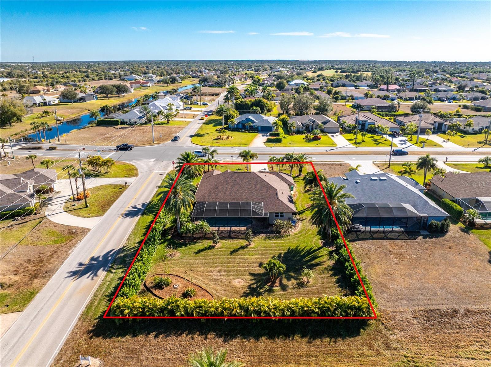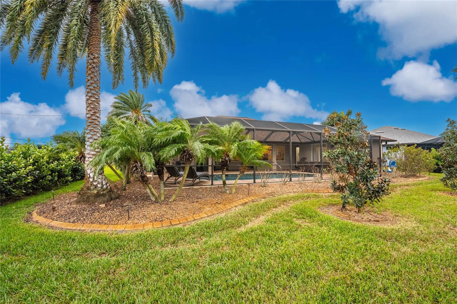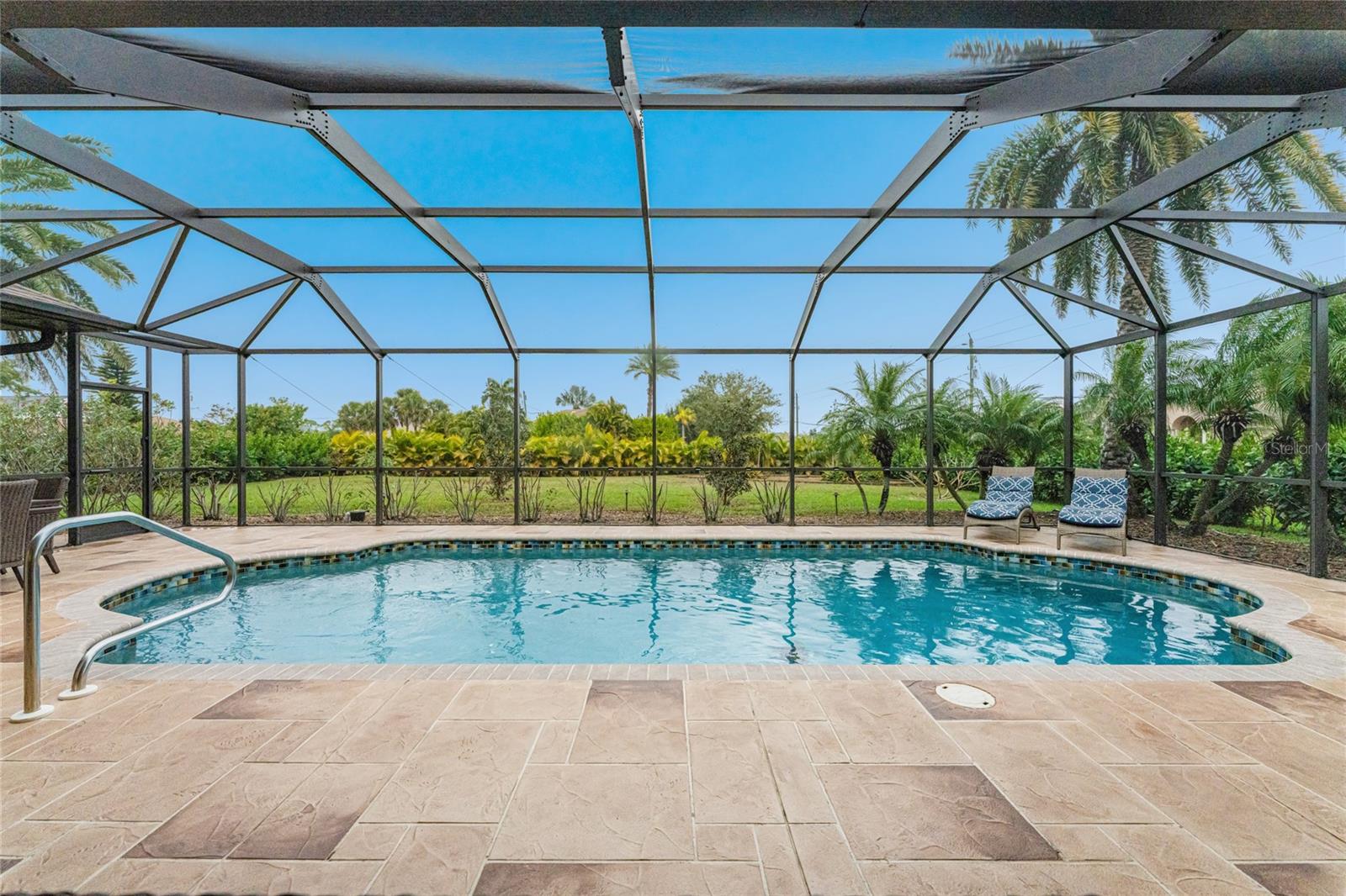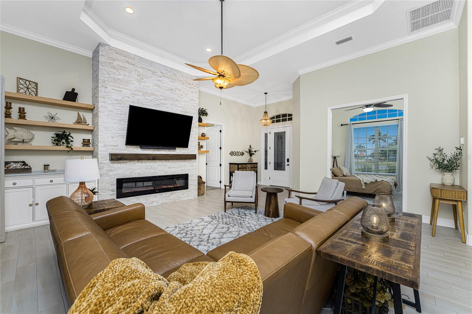 Stunning Former Model Pool Home that has been completely remodeled, transforming it into a modern Florida masterpiece! Set on an expansive, rare nearly half-acre corner lot in an X Flood Zone on one of the most desirable boulevards within the deed-restricted Rotonda West community, this 3-bedroom + den or 4th bedroom, 2-bathroom, 3-car garage shows like a brand new model home, and truly represents the epitome of contemporary Florida living! From the moment you set foot on this property, you’ll immediately be struck by how this home’s curb appeal “pops.” You’ll be greeted by a custom medallion-inlay, grand palm-lined driveway, curbed beds with towering palm trees, and a multitude of flowering shrubs. A custom screened front porch beckons you inside, where you’ll be amazed by the incredible natural light that floods throughout the main living area, accentuating the soaring 13-foot coffered ceiling and a clear line-of-sight through the home to the sparkling lanai and updated pool. Modern wood-look tile flooring flows throughout the main living areas, while architectural details abound, including custom plant shelves, niches, and crown molding, giving the home a truly upscale feel. The centerpiece of the great room is a stunning, floor-to-ceiling marble mosaic-tiled accent wall, with a linear fireplace, built-in cabinetry, and beautiful wood floating shelves. The open-plan chef-inspired kitchen includes abundant white shaker-style cabinetry, soft-close doors, sparkling white quartz counters, a custom tile backsplash, an oversized “statement” island with seating for five, a coffee bar, an additional center island with shiplap siding, and a huge walk-in pantry. The eat-in space has a spectacular view of the pool through a large aquarium-glass window. The ensuite primary bedroom is a stunner, w/super-plush carpeting, a light-drenched bay window wall, direct pool access, and two walk-in closets. The primary bath is jaw-dropping, with custom floor and wall tile, a free-standing soaker tub, a Roman style walk-in shower with dual heads, and dual vanities with vessel sinks, fully remodeled in 2022. Two guest bedrooms are separated from the main common area via a pocketed door, with one providing direct pool access through a sliding-glass door. The large den area features a double-door entry and can easily serve as a true fourth bedroom, office, gym, or hobby room. The laundry room features newer washer and dryer and floating shelves for storage. The oversized 3-car garage has epoxy flooring and new custom pull-down screens to allow a comfortable breeze while working in the garage. The spacious lanai includes updated stained and stamped concrete decking, a custom ceiling fan, and a large double-Roman freshly resurfaced pool. The back yard is your private oasis, with amazing landscaping beds and complete privacy via 7-foot tall Clusia hedges across both sides and 8-foot Areca Palms across the back. With a new roof and HVAC in 2022, plus a full interior remodel that same year, you’ll have nothing to do at the fully remodeled 291 Rotonda Blvd East but move in and immediately start enjoying the amazing Florida sunshine! Rotonda West is an expanding community that includes canals, lakes, golf courses, playground, pickleball courts, bike paths, w/easy access to beaches, a 10-mile “rail trail,” boating, and world-class fishing. Welcome to your dream home!