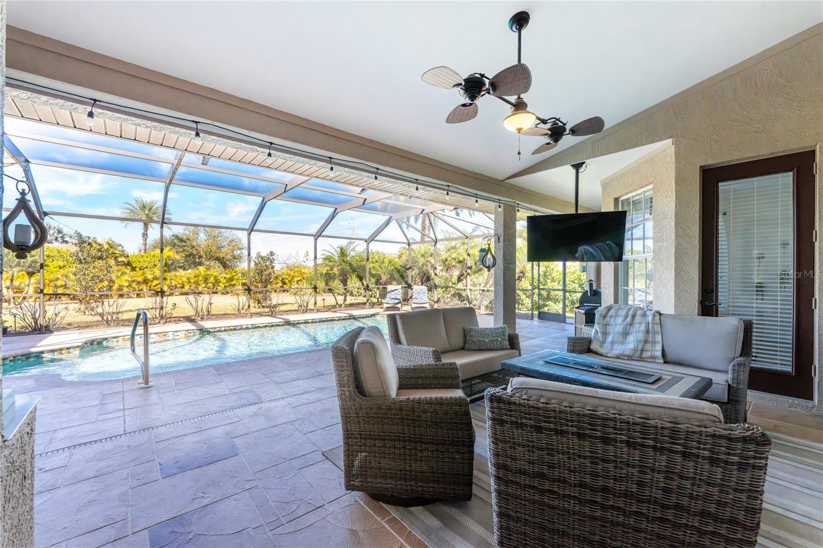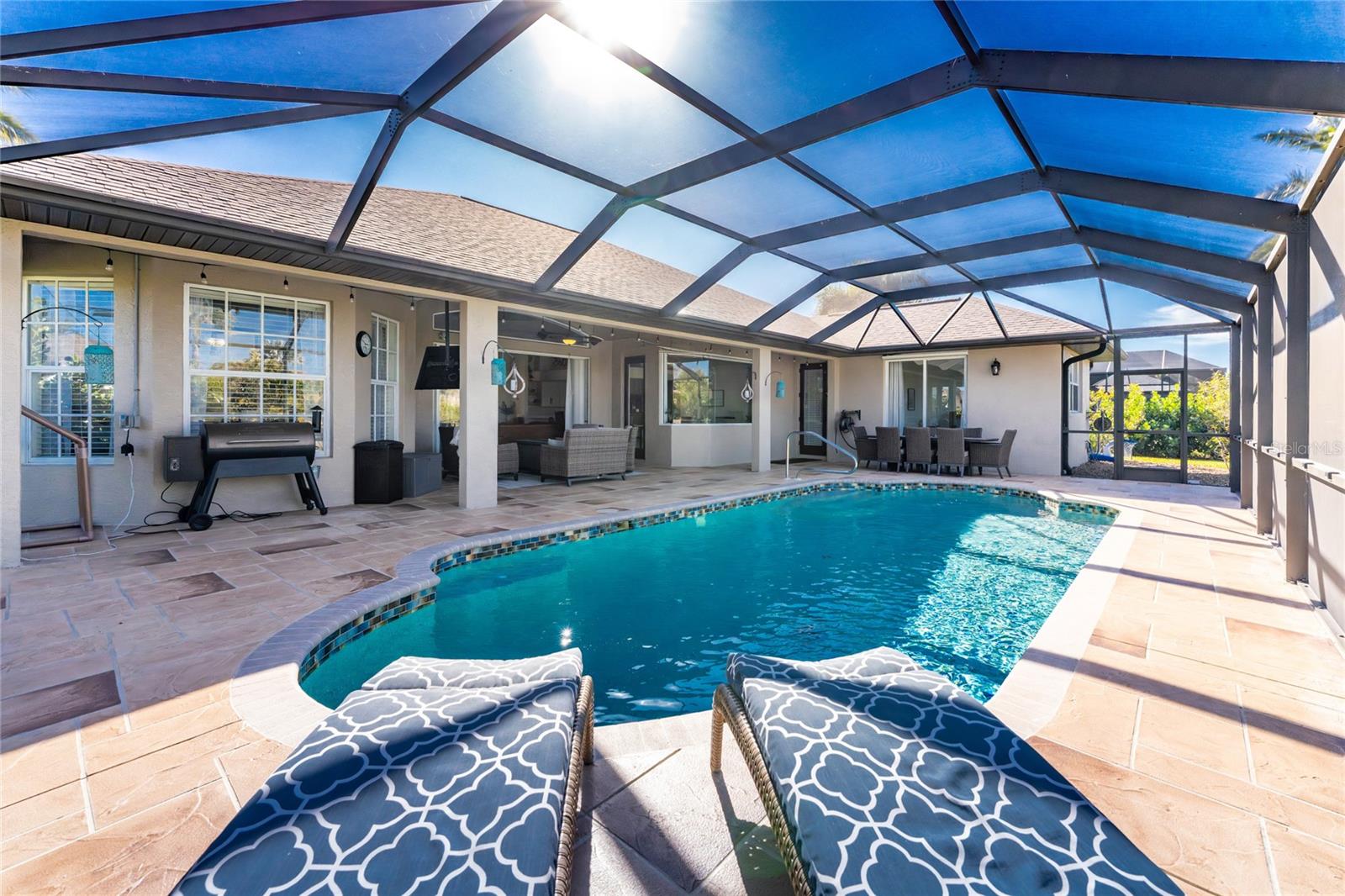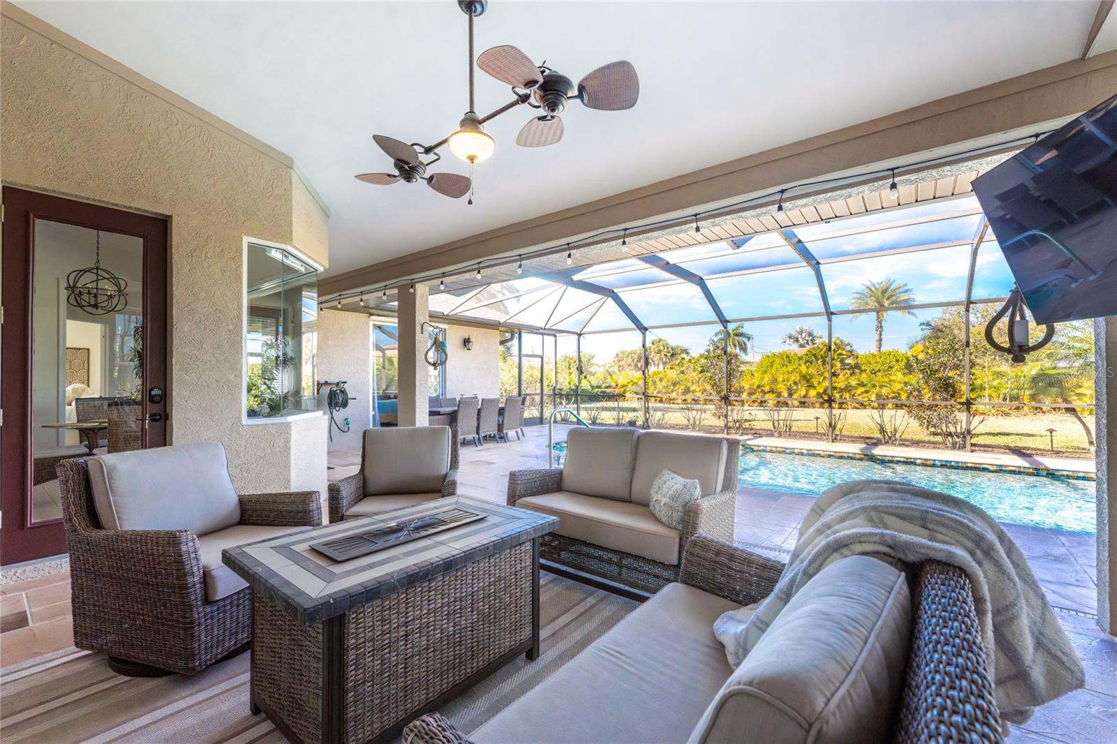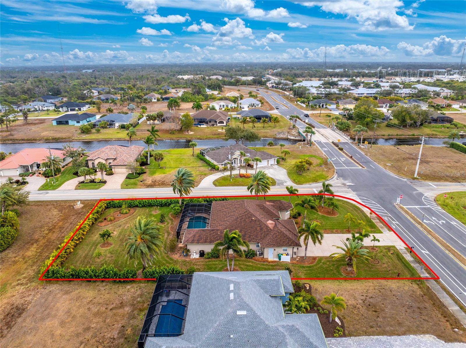 Stunning Former Model Pool Home that has been completely remodeled, transforming it into a modern Florida masterpiece! Set on an expansive, rare nearly half-acre corner lot in an X Flood Zone on one of the most desirable boulevards within the deed-restricted Rotonda West community, this 3-bedroom + den or 4th bedroom, 2-bathroom, 3-car garage shows like a brand new model home, and truly represents the epitome of contemporary Florida living! From the moment you set foot on this property, you’ll immediately be struck by how this home’s curb appeal “pops.” You’ll be greeted by a custom medallion-inlay, grand palm-lined driveway, curbed beds with towering palm trees, and a multitude of flowering shrubs. A custom screened front porch beckons you inside, where you’ll be amazed by the incredible natural light that floods throughout the main living area, accentuating the soaring 13-foot coffered ceiling and a clear line-of-sight through the home to the sparkling lanai and updated pool. Modern wood-look tile flooring flows throughout the main living areas, while architectural details abound, including custom plant shelves, niches, and crown molding, giving the home a truly upscale feel. The centerpiece of the great room is a stunning, floor-to-ceiling marble mosaic-tiled accent wall, with a linear fireplace, built-in cabinetry, and beautiful wood floating shelves. The open-plan chef-inspired kitchen includes abundant white shaker-style cabinetry, soft-close doors, sparkling white quartz counters, a custom tile backsplash, an oversized “statement” island with seating for five, a coffee bar, an additional center island with shiplap siding, and a huge walk-in pantry. The eat-in space has a spectacular view of the pool through a large aquarium-glass window. The ensuite primary bedroom is a stunner, w/super-plush carpeting, a light-drenched bay window wall, direct pool access, and two walk-in closets. The primary bath is jaw-dropping, with custom floor and wall tile, a free-standing soaker tub, a Roman style walk-in shower with dual heads, and dual vanities with vessel sinks, fully remodeled in 2022. Two guest bedrooms are separated from the main common area via a pocketed door, with one providing direct pool access through a sliding-glass door. The large den area features a double-door entry and can easily serve as a true fourth bedroom, office, gym, or hobby room. The laundry room features newer washer and dryer and floating shelves for storage. The oversized 3-car garage has epoxy flooring and new custom pull-down screens to allow a comfortable breeze while working in the garage. The spacious lanai includes updated stained and stamped concrete decking, a custom ceiling fan, and a large double-Roman freshly resurfaced pool. The back yard is your private oasis, with amazing landscaping beds and complete privacy via 7-foot tall Clusia hedges across both sides and 8-foot Areca Palms across the back. With a new roof and HVAC in 2022, plus a full interior remodel that same year, you’ll have nothing to do at the fully remodeled 291 Rotonda Blvd East but move in and immediately start enjoying the amazing Florida sunshine! Rotonda West is an expanding community that includes canals, lakes, golf courses, playground, pickleball courts, bike paths, w/easy access to beaches, a 10-mile “rail trail,” boating, and world-class fishing. Welcome to your dream home!