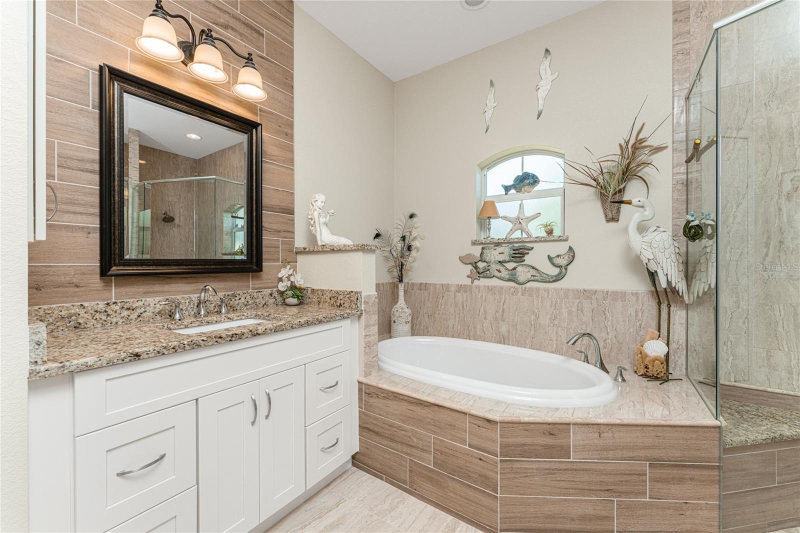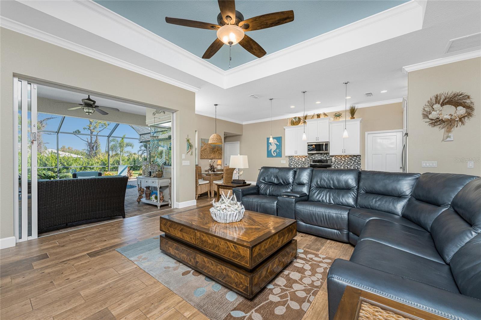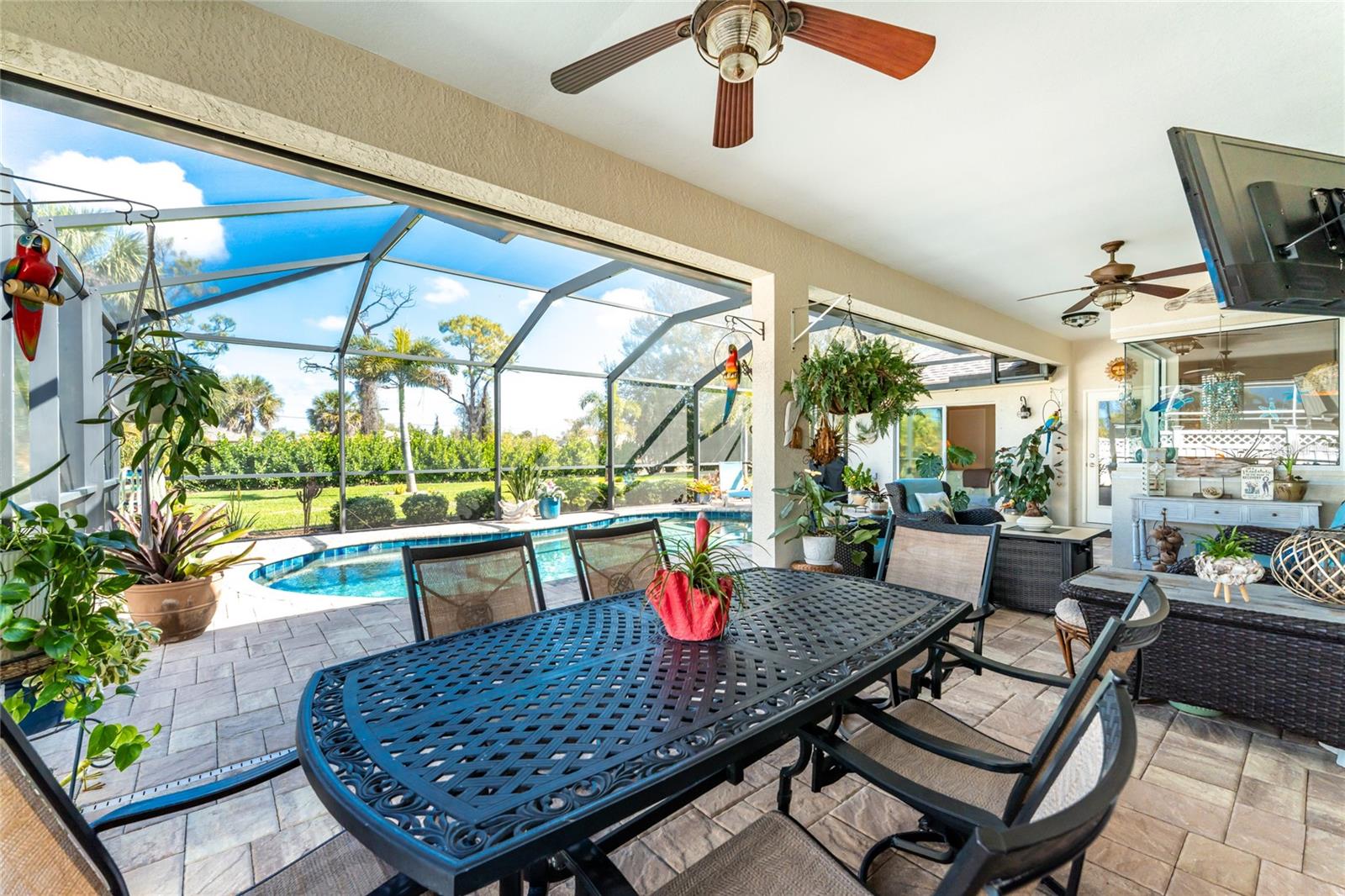 Welcome to Your Florida Dream Pool Home in Rotonda West! This beautifully maintained residence, built by Porter Contracting, offers three bedrooms, two bathrooms, and an oversized three car garage, blending refined design with relaxed luxury. Located in the X flood zone, the property offers valuable peace of mind with a 2023 roof along with hurricane shutters. From the moment of arrival, this home makes an impression. Lush tropical landscaping frames the property as the long driveway leads to a welcoming paver front porch accented by columns and a decorative glass entry door with sidelights, perfect for relaxing outdoors and enjoying the quiet neighborhood setting. Inside, the exceptional level of care and craftsmanship is immediately apparent. Wood look tile flooring flows throughout the main living areas, complemented by crown molding, plantation shutters, tray ceilings, and designer lighting and ceiling fans. Triple pocketing sliding glass doors in the great room fill the open layout space with plenty of natural light. The kitchen is both beautiful and functional, featuring white shaker style cabinetry with crown molding and soft close hinges, granite countertops, a glass tile backsplash, and a spacious center island with striking blue and white detail that creates a stunning focal point. An aquarium window in the adjoining breakfast nook frames panoramic views of the pool area. The interior laundry room is designed with a built-in utility sink cabinet that provides additional storage. The primary suite offers a peaceful retreat with generous space for furnishings, a tray ceiling with crown molding, sliding glass doors to access the pool area, and dual walk-in closets. The ensuite bathroom creates a spa inspired atmosphere with a large soaking tub, European style frameless glass enclosed walk-in shower, separate vanities, and beautiful tile work that extends halfway up the walls and fully throughout the shower. Both guest bedrooms are spacious and inviting, with one featuring sliding glass doors to the pool area along with a walk-in closet. The guest bathroom is equally well appointed with an oversized granite topped vanity and a large frameless glass enclosed shower finished with full tile walls. Outdoor living here is truly spectacular. The screened pool enclosure surrounds a partially covered paver pool deck and a heated saltwater pool, creating a private oasis designed for relaxation and entertaining. Privacy fencing along the sides of the screen enclosure, combined with lush landscaping behind the home, creates a sense of seclusion while still allowing views of the open backyard and mature trees that invite you to enjoy the natural surroundings. Located in the deed restricted community of Rotonda West, residents enjoy an active lifestyle with five premier golf courses, miles of lakes and canals ideal for fishing and wildlife viewing, tennis and pickleball courts, walking trails, social clubs, and community activities. Several Gulf beaches, parks, shopping, restaurants, tiki bars, boat ramps, and medical facilities are all within ten miles. Baseball fans will also appreciate the nearby spring training facilities for two Major League teams. Whether enjoyed seasonally or year round, this exceptional home at 601 Boundary Boulevard offers a luxurious and comfortable setting to experience the very best of the Rotonda West lifestyle.