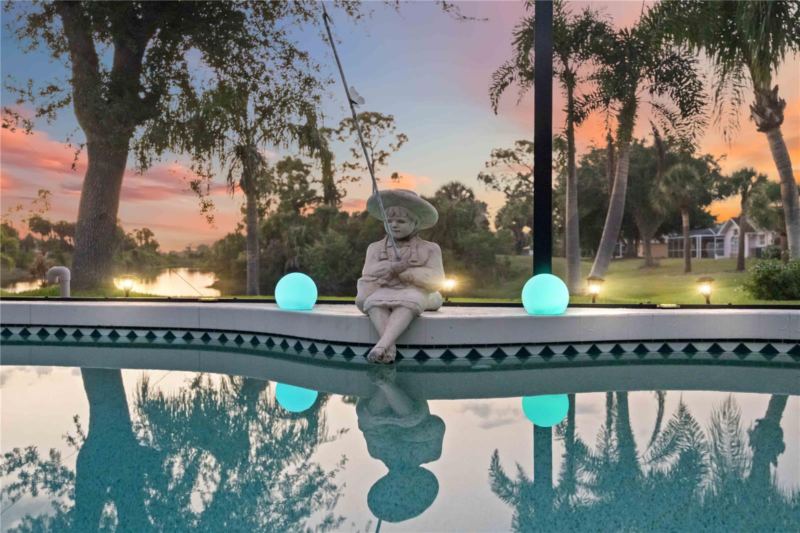 Stunning, one-of-a-kind WATER & BROADMOOR PARK VIEWS, a rare find in the desirable deed restricted community of Rotonda West. This 2 bed, 2 bath, 2-car garage home boasts a 918 sq. ft. lanai where you can watch beautiful Florida sunsets over the tranquil waters from your own backyard. The elegance this home offers is displayed throughout the interior with tile and laminate flooring throughout, 11' tall vaulted ceilings, a neutral and "beachy" color scheme & decor, an abundance of natural lighting in every room, updated kitchen and baths, plantation shutters throughout and more! Approaching the home you will notice the manicured lawn and landscaping with tropical plants, stone & concrete edging that welcomes you to the screened-in front entry and french doors leading inside. Upon entering, the beautiful water view greets you along with a spacious floor plan encompassing a formal living room with a custom shiplap accent wall, a dining room with a water view where you can gather with friends and family, and just steps away is the upgraded kitchen featuring granite countertops, subway tile backsplash, quality Whirlpool stainless steel appliances, crown molding, a closet pantry, a breakfast bar accented with shiplap, a large passthrough window above the kitchen sink so you can wash dishes while admiring the water view, and best of all is the 15' x 6' laundry room that doubles as a storage closet offering ample shelving and additional space plus a custom etched glass door allowing you to close this space off. The family room, open to the kitchen, makes entertaining a breeze and allows you to easily expand your living space outdoors with the double sliding glass doors to your private Florida oasis! Enjoy both the sun and shade with a 21' x 10' covered lanai offering ample space for seating & a ceiling fan-- the expansive screened lanai, recently resurfaced, with a panoramic pool cage (installed in 2023), and your very own ELECTRIC HEATED pool that you can enjoy year-round with a view that you will fall in love with--truly paradise! With the added protection of the accordion hurricane shutters, you can safely secure & store all your outdoor furniture. There is plenty of room inside with the "split" bedroom layout--the primary suite is separate with a spacious bedroom with a roomy walk-in closet & separate linen closet, sliding glass doors that lead to the lanai, wood-look laminate flooring, and an upgraded ensuite bathroom with a granite countertop & wood cabinetry accented with subway tile and a spacious Roman shower with tiled walls. On the opposite end of the home is the guest bedroom and bathroom-- the sizable bedroom has a large closet and ceiling fan and located across the hallway from the bathroom that has access to the pool and lanai, granite countertop & shower/tub combo. All of this plus a two car garage, irrigation from the pond, hurricane impact windows & shutters, and front doors, 2022 roof, A/C (2023), recently painted exterior, AND a transfer switch to hook-up your generator. This home is a MUST SEE, don't wait! Enjoy the five golf courses Rotonda West offers along with walking trails, pickleball courts and freshwater canals for kayaking all just minutes away. Conveniently located near shopping, restaurants, beaches, fishing, local farmers markets and so much more. Make this home your dream come true.