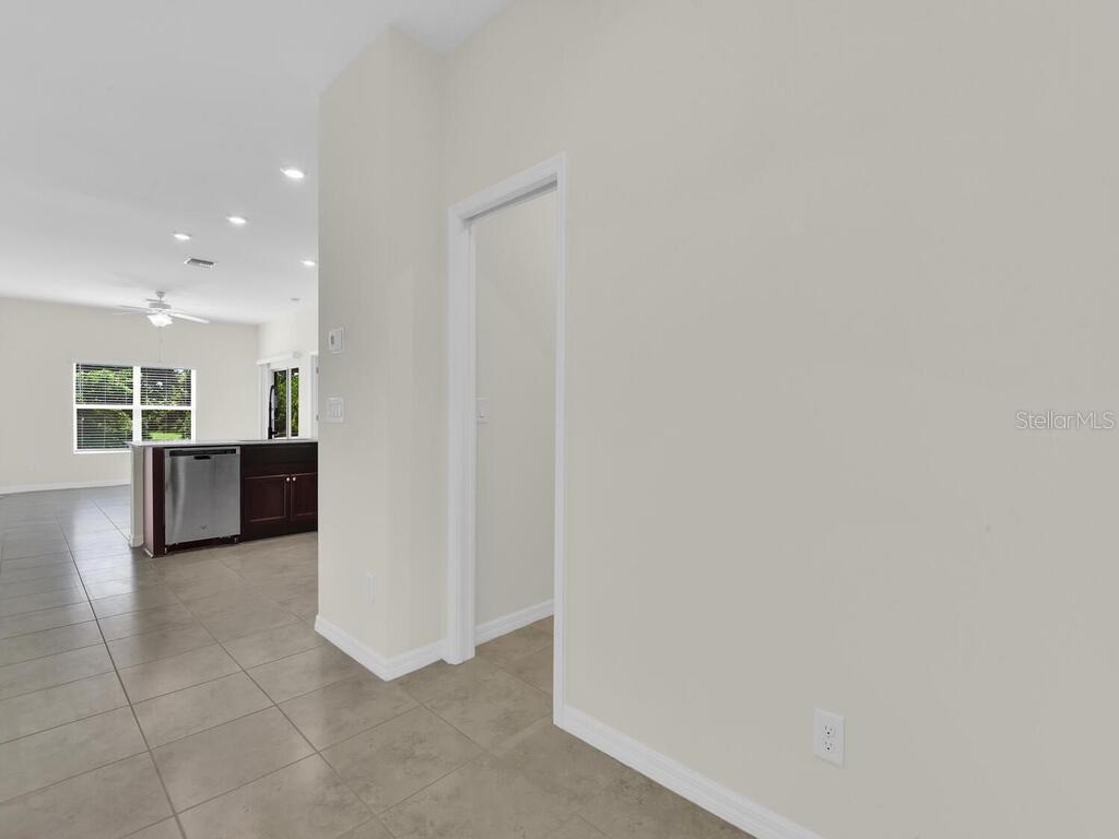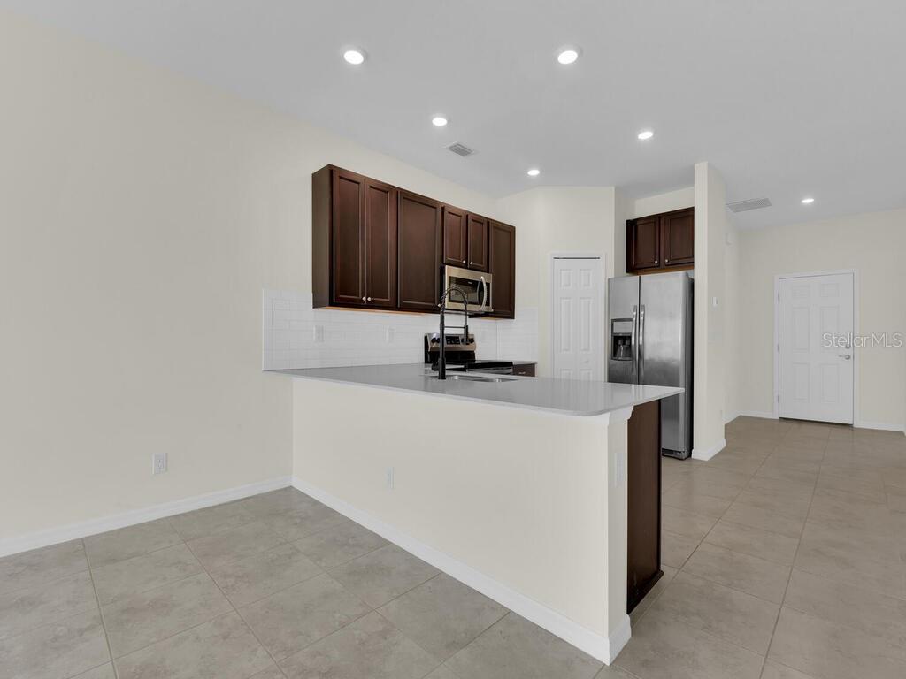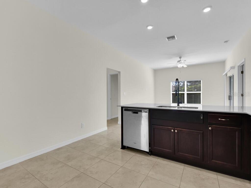 Introducing your new spacious single-family home in the Rotonda Lakes area. This property offers 3 bedrooms plus a den, 2 baths, and a 2-car garage. As you step inside, you'll find a large bonus room at the front of the home, suitable for an office, dining area, or family room. The open-concept great room features a kitchen with elegant dark wood cabinets, granite countertops, and stainless steel appliances, along with a dining area and living room space. Enjoy the luxury of tile and granite throughout, including the bathrooms. The master bedroom comes with walk-in closets and a stunning en-suite featuring a large shower and dual sinks. The additional bedrooms and bathroom are perfectly separated from the master suite, providing the privacy you deserve. The open-concept great room extends seamlessly to a screened-in lanai, creating the ideal space for entertaining. Rotonda Lakes offers easy access to shopping, schools, and entertainment, with Englewood beaches conveniently close by. NO HURRICANE DAMAGE.