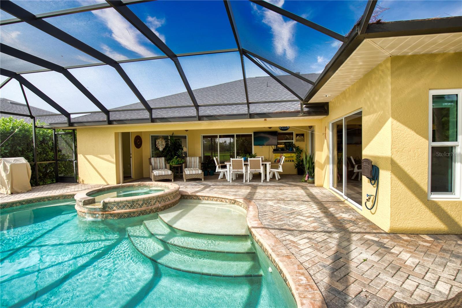 Welcome home! This 3 bedroom, 2.5 bath oasis is over 2200 sq ft of pure paradise and is uniquely equipped with two living areas. Leap into luxury with a custom saltwater pool and a covered lanai area that overlooks the 6th fairway on the Long Marsh course and a picturesque pond. The heated pool comes with a sundeck area and Jacuzzi, perfect for those lazy afternoons or hosting your own private pool party. And let's not forget the pavers that adorn the entire lanai area, adding that touch of elegance to the area. Inside, you'll find elegant Corian counters, 42" cabinets with crown molding, ceramic tile and Luxury Vinyl throughout the home. The master bathroom is a haven of relaxation with a marble spa tub, perfect for unwinding after a long day. The built-in entertainment center and custom lighting/fan package add that extra touch of sophistication. The 9'4" volume, vaulted, flat, and tray ceilings give the home an airy and spacious feel. And if you need a home office, we've got you covered! The large office can easily be utilized as a 4th bedroom or a creative space for all your DIY projects. Now let's talk upgrades! The roof, hot water heater, and pool screening were all replaced in 2023. New luxury vinyl flooring and impact resistant windows were added in 2022, along with a handy hurricane rolldown screen. The exterior of the home was freshly painted in 2022, giving it a rejuvenated look. And we haven't even mentioned the closet systems, plantation shutters, and tiled backsplash in the kitchen, all added within the past couple of years. Located on a quiet street with cul-de-sacs on both ends, this home offers the seclusion you desire without compromising on convenience. Furniture is not included. Only minutes away from the beautiful beaches of the Gulf of Mexico, marinas, shopping, restaurants, and year-round entertainment, your days will be filled with endless possibilities. Don't miss out on this incredible opportunity to own a home that truly has it all. Call now to schedule your private viewing before someone else scoops up this piece of paradise!