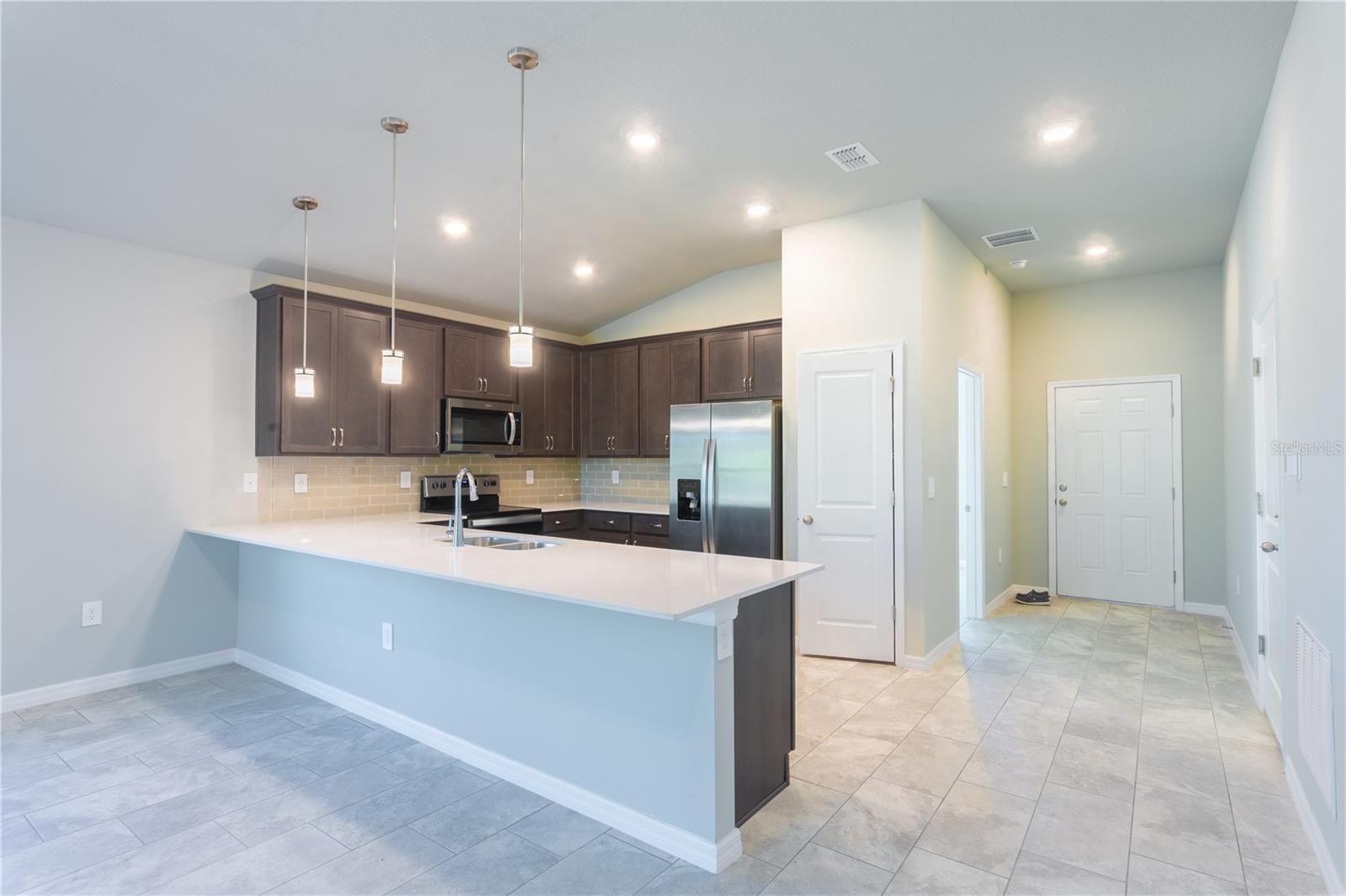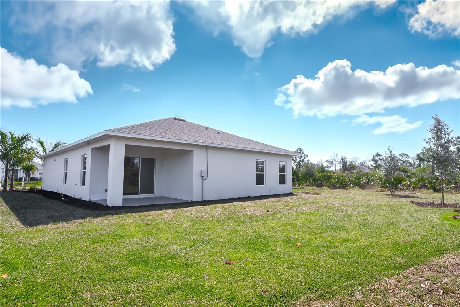 **NEW CONSTRUCTION, NO WAIT, MOVE IN READY!** (+$10,000 FLEX CASH incentive!) Elevate your lifestyle with the opulence of the Sanibel floorplan presented by Carpenter Homes—a masterpiece within the Florida Living Series, certified by the Florida Green Building Coalition (FGBC). This home features 4 bedrooms and 2 full bathrooms. This dream home is designed and built to immerse you in luxury. As you enter, a beautiful kitchen welcomes you, with an expansive, oversized bar that seamlessly flows into the living and dining area. The finesse of soft-close, Stained Basalt 42" cabinets, Bliss Element Earth 3x9 beveled glass subway tile backsplash, and upgraded Blanco Matrix quartz countertops add a functional touch of luxury to the kitchen. Kitchen upgrades include a Moen Sleek chrome kitchen faucet, garbage disposal, and sleek stainless steel energy efficient appliances. This home exudes sophistication with a vaulted ceiling that unveils a spacious lanai, creating an indoor-outdoor haven. Additionally, Carpenter Homes provides an upgraded Robi brushed nickel lighting package including pendants over the kitchen bar, and vanity fixtures in both bathrooms, accenting the overall lighting design. Monte Carlo Linden brushed steel finish ceiling fans in each bedroom, as well as the great room, helps to circulate air flow and keep you cool in the Florida weather. Complimenting the expansive living area is Veneta Grigio 12x24 ceramic tile flooring. The Owner's suite is a sanctuary of indulgence, showcasing dual sinks, impeccably tiled Magnisi White 8x12 walls in the shower, and a generously sized walk-in closet. The home boasts Magnisi White 8x12 upgraded tiled walls in in the second bath/shower, a Blanco Matrix quartz vanity top, and Moen Genta LX chrome faucets and shower/tub trim kits. The ampleness of this home continues with a utility room, and additions such as energy-efficient R-4.1 insulation on concrete exterior walls, Taexx tubes for pest control, and fabric hurricane shutters for every window. The Florida friendly landscaped yard is complemented by an irrigation system with a rain sensor to help maximize efficiency. The expansive 3-car garage, complete with two garage door openers and four remotes, not only provides ample space for your everyday needs but also ensures the utmost convenience and versatility for all your storage and parking requirements. Step into a world where extravagance meets eco-conscious living—your forever home awaits, a testament to timeless elegance and modern sustainability. Available to view any time!