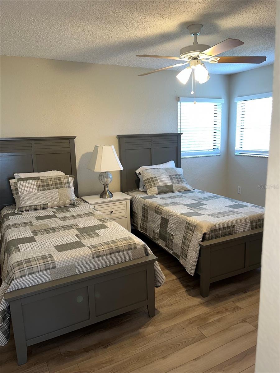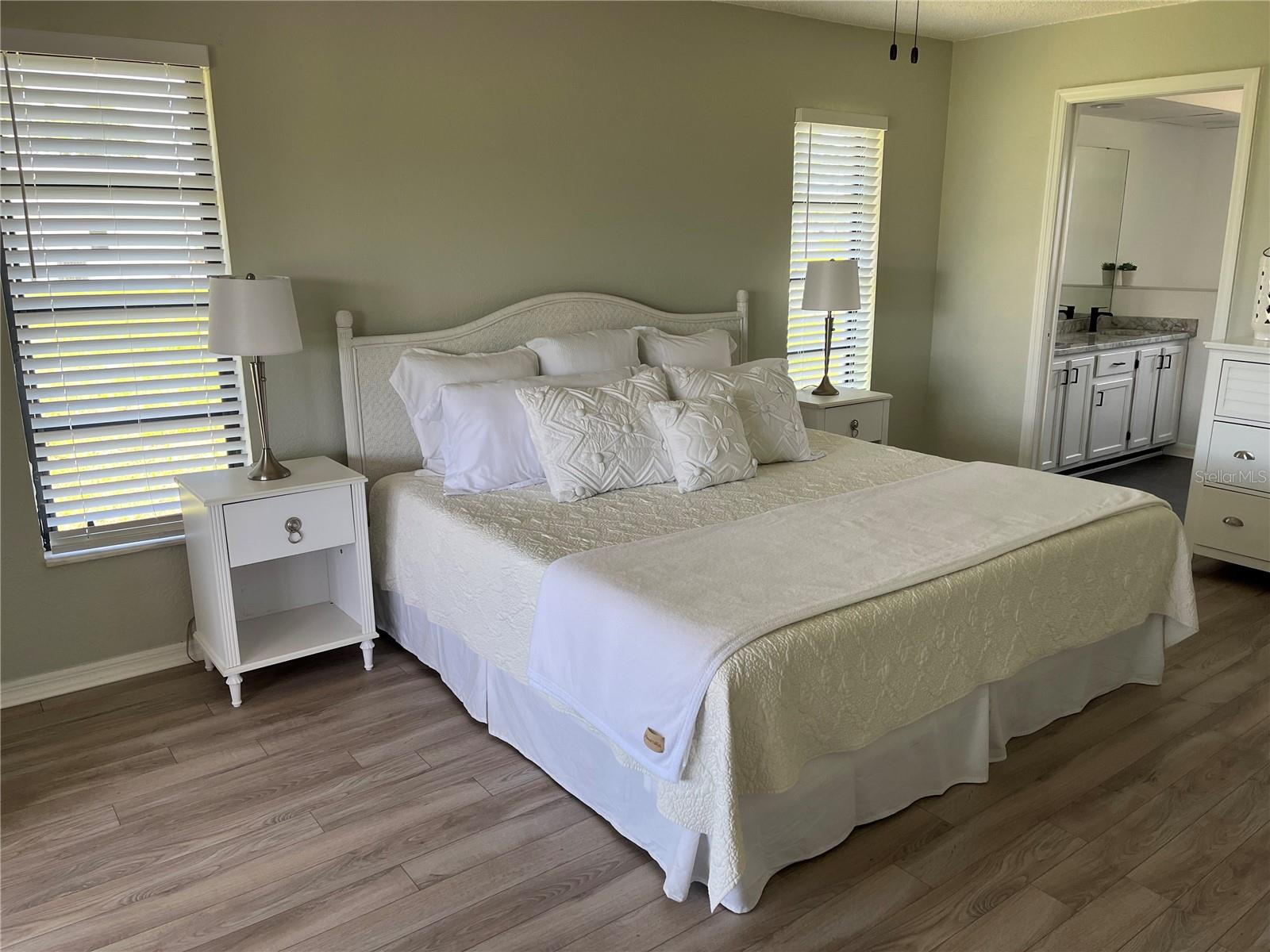 Updated home on lovely street of well kept homes. This 3 bedroom home has been newly painted inside and out. There is new flooring throughout. The bathrooms have been updated as well with newly tiled showers and new vanity in guest bath and new stone countertop in master. The large master suite has a walk-in closet and a sliding door to the lanai. The split floor plan gives you plenty of privacy. The kitchen has a built in pantry, updated LED lighting, stainless appliances and pass through window to the lanai. There is a large dining area with sliding door to lanai as well as a separate breakfast area also with a slider to lanai. The lanai is oversized with plenty of space for entertaining. There are new ceiling fans and window treatments. The roof is new in 2022 as well as a new impact resistant garage door. The large backyard has a seating area with pavers and a fire pit. This home is in a great area near beaches, boating, golfing and shopping