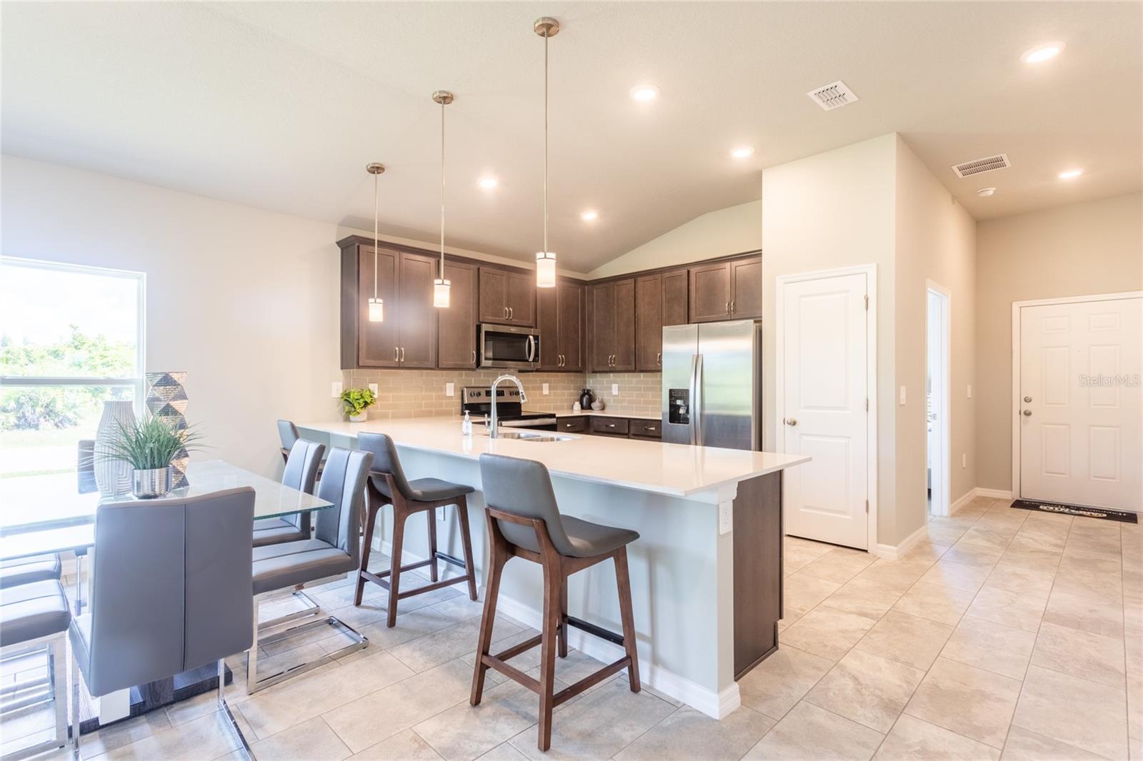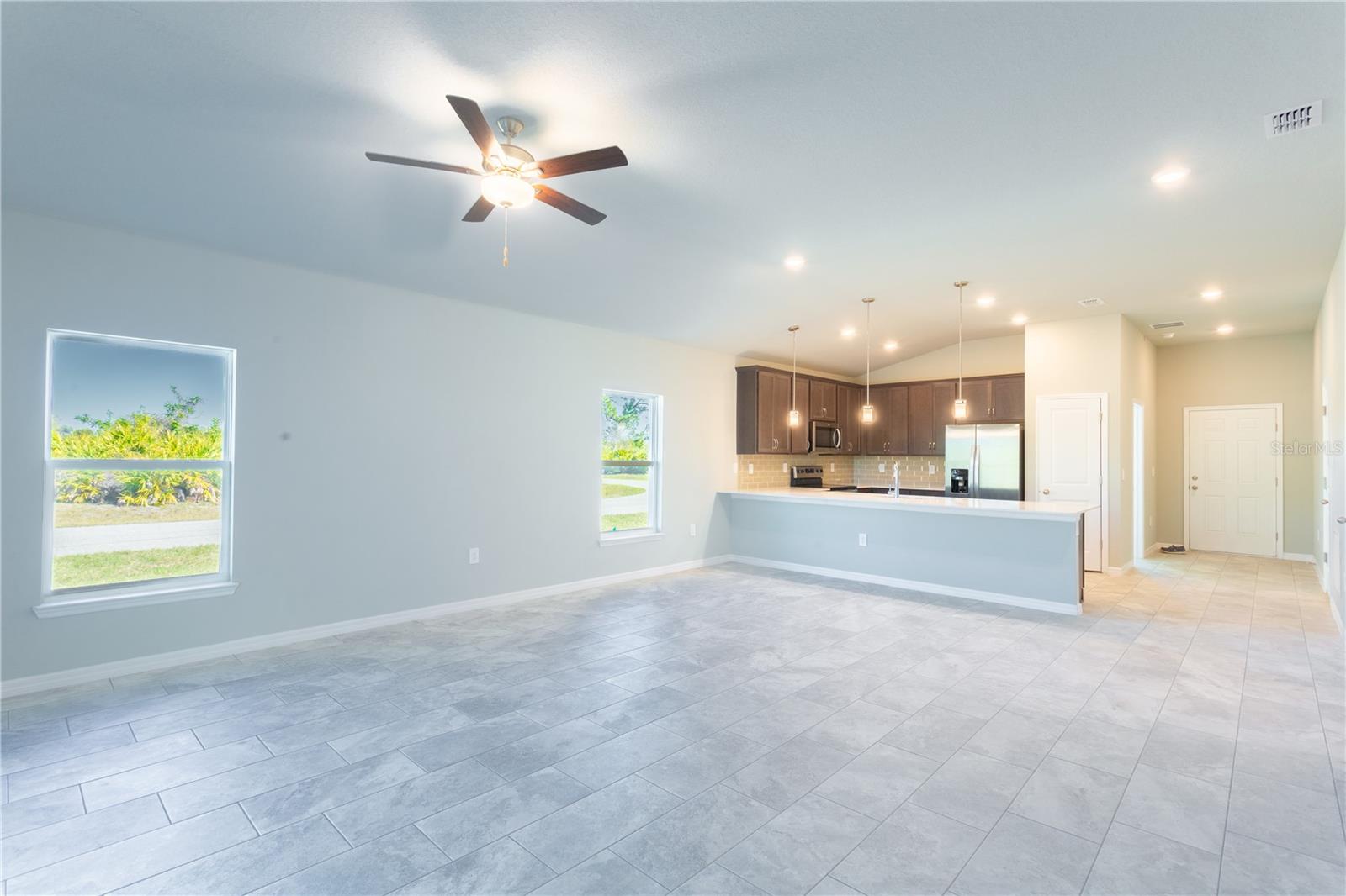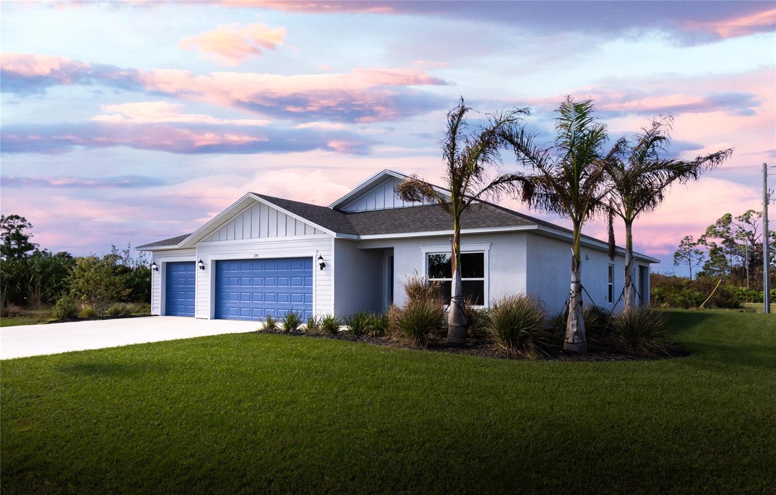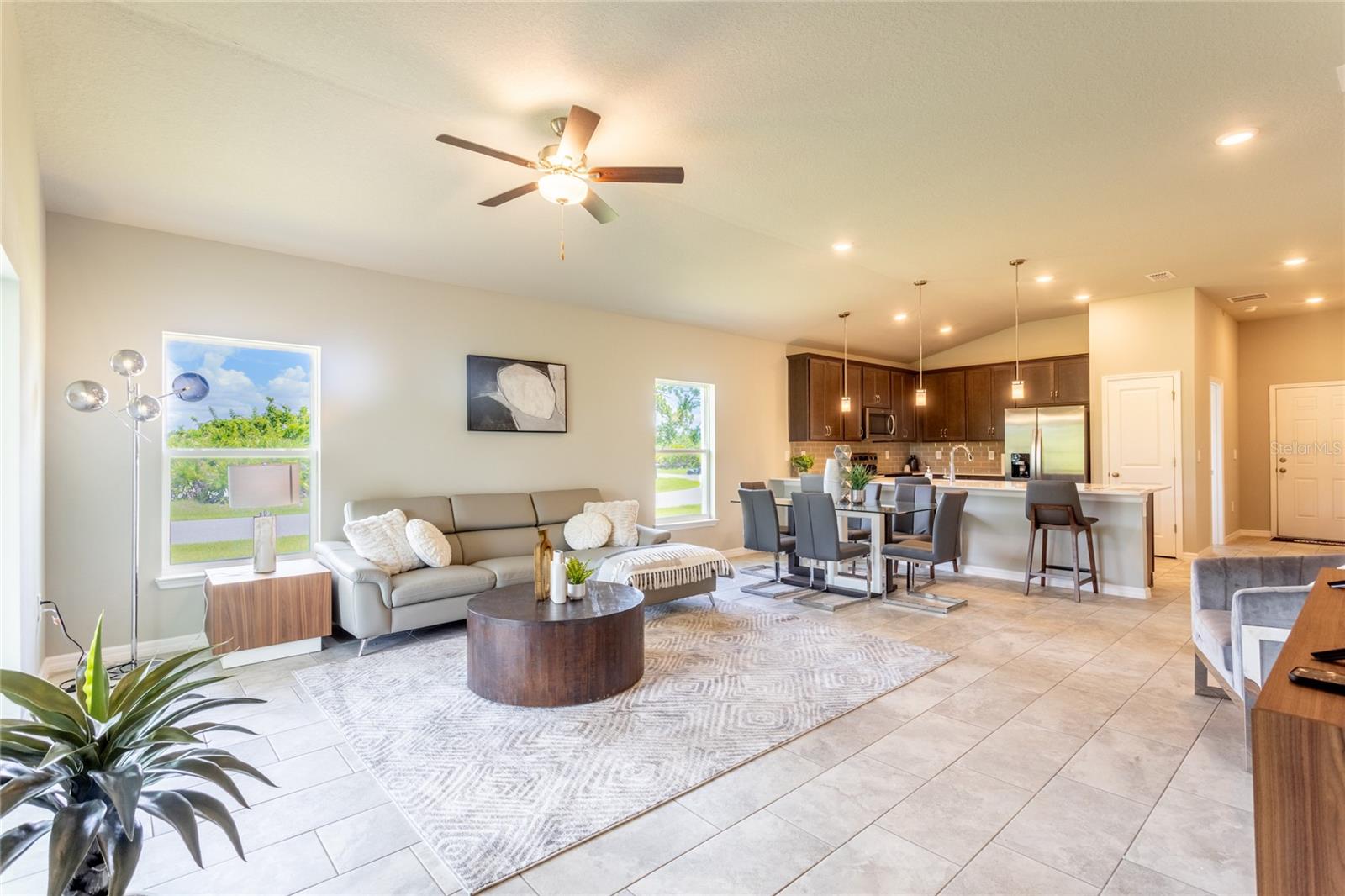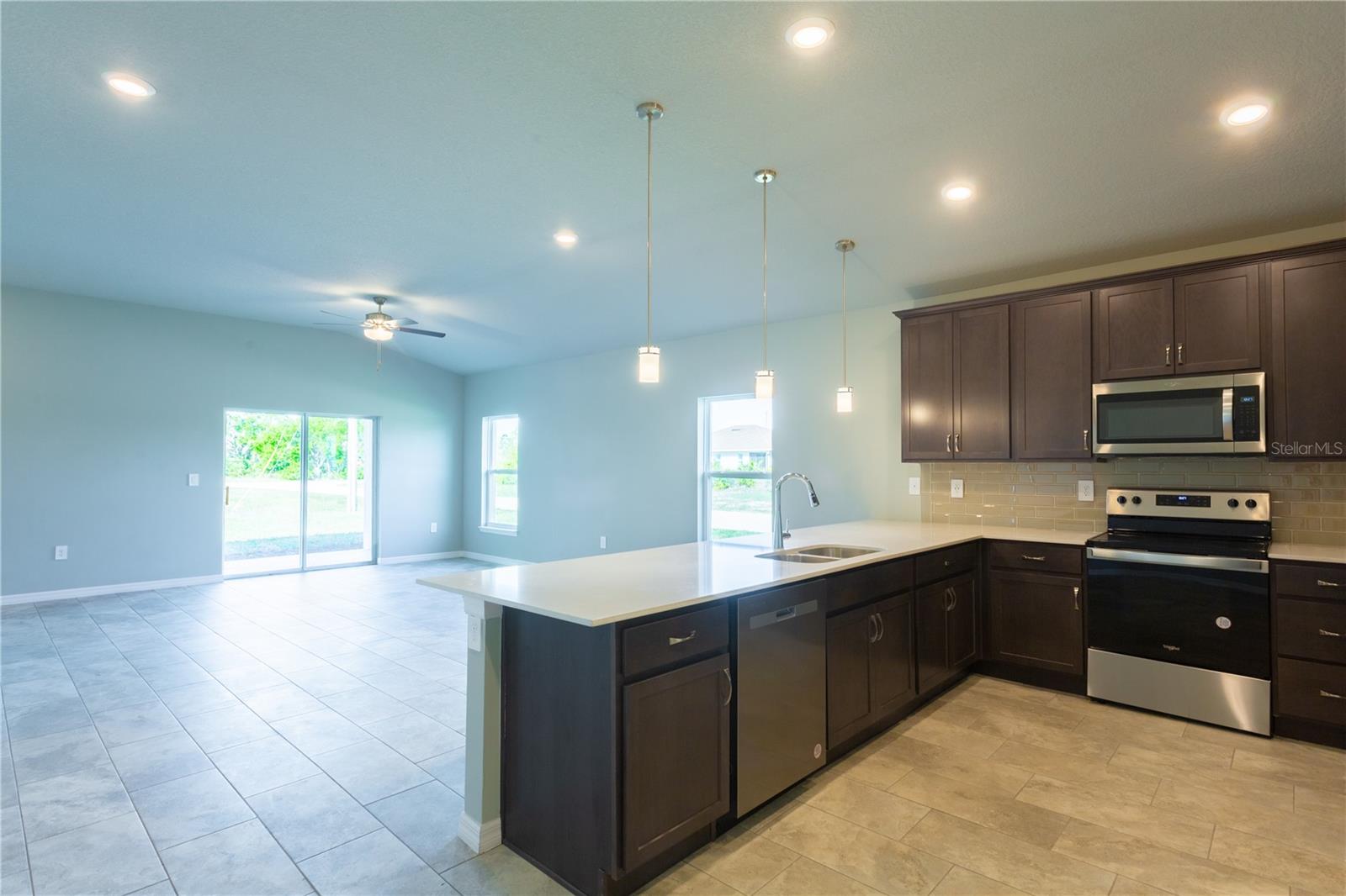 **NEW CONSTRUCTION, NO WAIT, MOVE IN READY!** Elevate your lifestyle with the opulence of the Sanibel floorplan presented by Carpenter Homes—a masterpiece within the Florida Living Series, certified by the Florida Green Building Coalition (FGBC). This home features 4 bedrooms and 2 full bathrooms. This dream home is designed and built to immerse you in luxury. As you enter, a beautiful kitchen welcomes you, with an expansive, oversized bar that seamlessly flows into the living and dining area! The finesse of soft-close, Stained Basalt 42" cabinets, Bliss Element Earth 3x9 beveled glass subway tile backsplash, and upgraded Blanco Matrix quartz countertops add a functional touch of luxury to the kitchen. Kitchen upgrades include a Moen Sleek chrome kitchen faucet, garbage disposal, and sleek stainless steel energy efficient appliances. This home exudes sophistication with a vaulted ceiling that unveils a spacious lanai, creating an indoor-outdoor haven. Additionally, Carpenter Homes provides an upgraded Robi brushed nickel lighting package including pendants over the kitchen bar, and vanity fixtures in both bathrooms, accenting the overall lighting design. Monte Carlo Linden brushed steel finish ceiling fans in each bedroom, as well as the great room, helps to circulate air flow and keep you cool in the Florida weather. Complimenting the expansive living area is Veneta Grigio 12x24 ceramic tile flooring. The Owner's suite is a sanctuary of indulgence, showcasing dual sinks, impeccably tiled Magnisi White 8x12 walls in the shower, and a generously sized walk-in closet. The home boasts Magnisi White 8x12 upgraded tiled walls in in the second bath/shower, a Blanco Matrix quartz vanity top, and Moen Genta LX chrome faucets and shower/tub trim kits. The ampleness of this home continues with a utility room, and additions such as energy-efficient R-4.1 insulation on concrete exterior walls, Taexx tubes for pest control, and fabric hurricane shutters for every window. The Florida friendly landscaped yard is complemented by an irrigation system with a rain sensor to help maximize efficiency. The expansive 3-car garage, complete with two garage door openers and four remotes, not only provides ample space for your everyday needs but also ensures the utmost convenience and versatility for all your storage and parking requirements. Step into a world where extravagance meets eco-conscious living—your forever home awaits, a testament to timeless elegance and modern sustainability. Available to view any time!