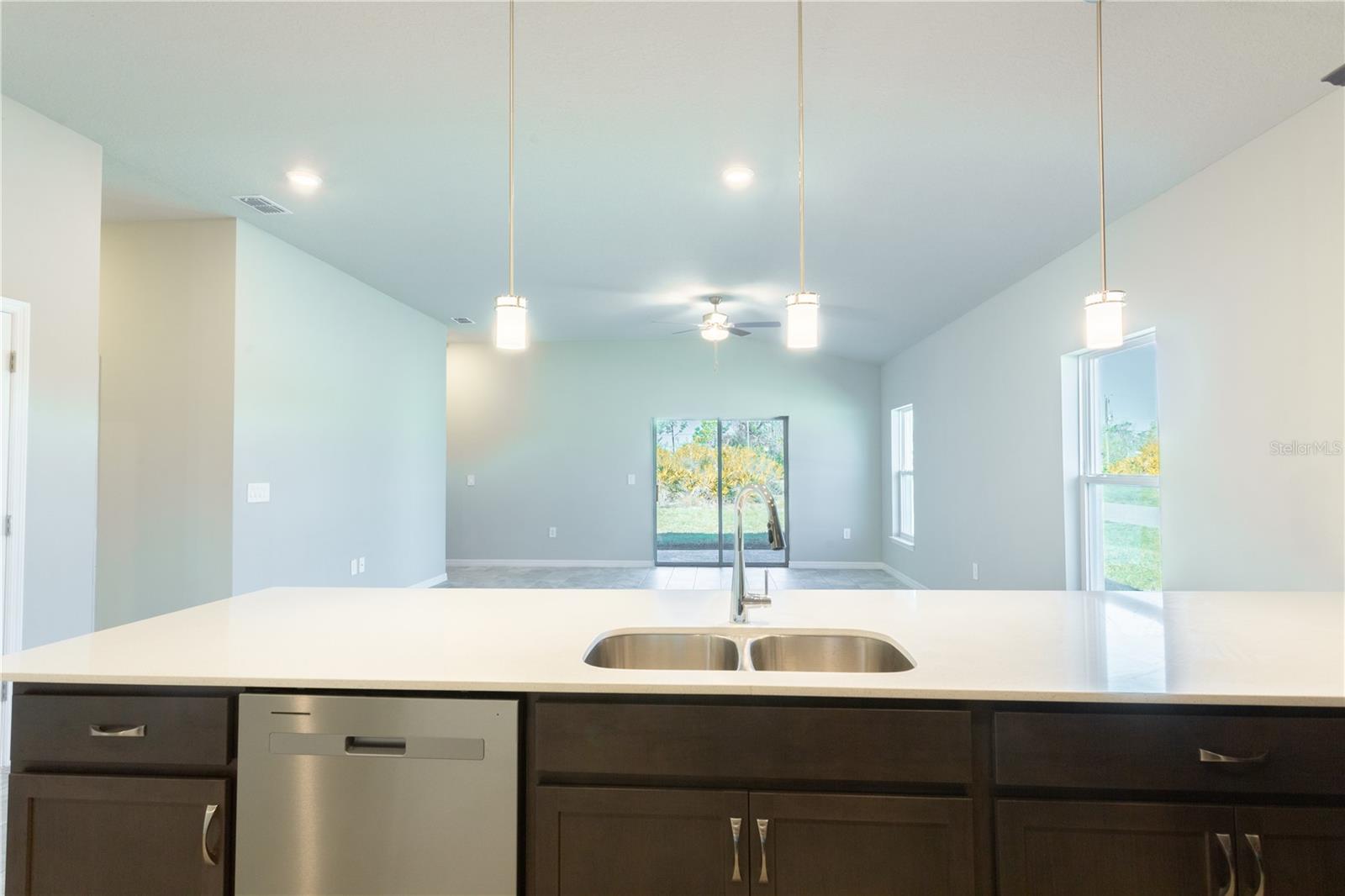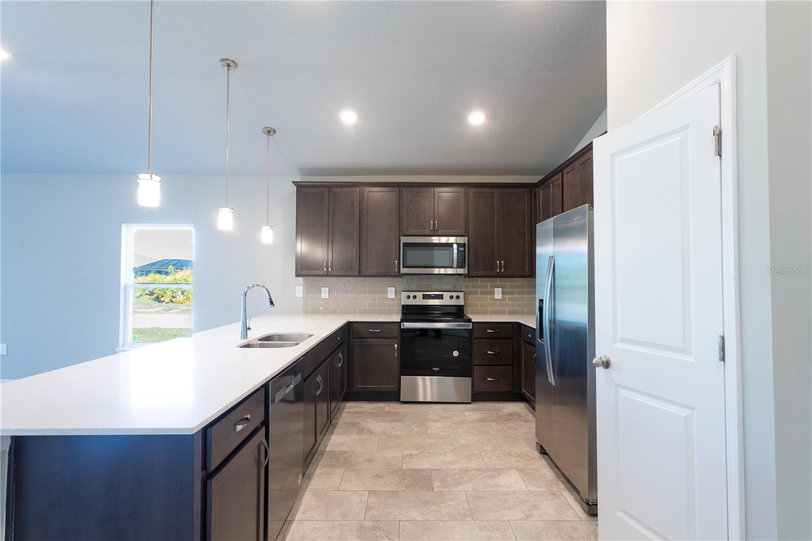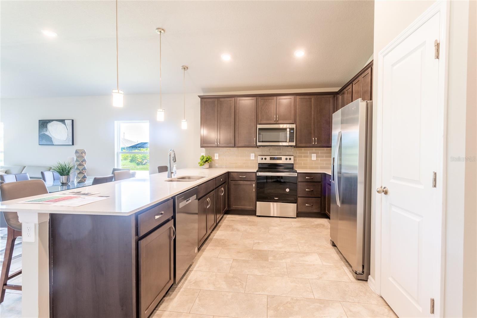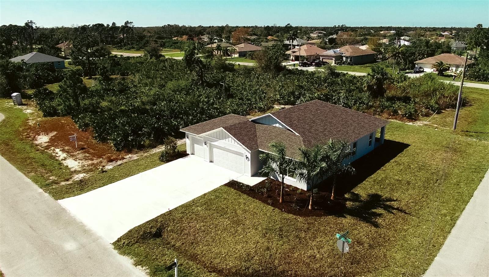 **NEW CONSTRUCTION, NO WAIT, MOVE IN READY!** Elevate your lifestyle with the opulence of the Sanibel floorplan presented by Carpenter Homes—a masterpiece within the Florida Living Series, certified by the Florida Green Building Coalition (FGBC). This home features 4 bedrooms and 2 full bathrooms. This dream home is designed and built to immerse you in luxury. As you enter, a beautiful kitchen welcomes you, with an expansive, oversized bar that seamlessly flows into the living and dining area! The finesse of soft-close, Stained Basalt 42" cabinets, Bliss Element Earth 3x9 beveled glass subway tile backsplash, and upgraded Blanco Matrix quartz countertops add a functional touch of luxury to the kitchen. Kitchen upgrades include a Moen Sleek chrome kitchen faucet, garbage disposal, and sleek stainless steel energy efficient appliances. This home exudes sophistication with a vaulted ceiling that unveils a spacious lanai, creating an indoor-outdoor haven. Additionally, Carpenter Homes provides an upgraded Robi brushed nickel lighting package including pendants over the kitchen bar, and vanity fixtures in both bathrooms, accenting the overall lighting design. Monte Carlo Linden brushed steel finish ceiling fans in each bedroom, as well as the great room, helps to circulate air flow and keep you cool in the Florida weather. Complimenting the expansive living area is Veneta Grigio 12x24 ceramic tile flooring. The Owner's suite is a sanctuary of indulgence, showcasing dual sinks, impeccably tiled Magnisi White 8x12 walls in the shower, and a generously sized walk-in closet. The home boasts Magnisi White 8x12 upgraded tiled walls in in the second bath/shower, a Blanco Matrix quartz vanity top, and Moen Genta LX chrome faucets and shower/tub trim kits. The ampleness of this home continues with a utility room, and additions such as energy-efficient R-4.1 insulation on concrete exterior walls, Taexx tubes for pest control, and fabric hurricane shutters for every window. The Florida friendly landscaped yard is complemented by an irrigation system with a rain sensor to help maximize efficiency. The expansive 3-car garage, complete with two garage door openers and four remotes, not only provides ample space for your everyday needs but also ensures the utmost convenience and versatility for all your storage and parking requirements. Step into a world where extravagance meets eco-conscious living—your forever home awaits, a testament to timeless elegance and modern sustainability. Available to view any time!
