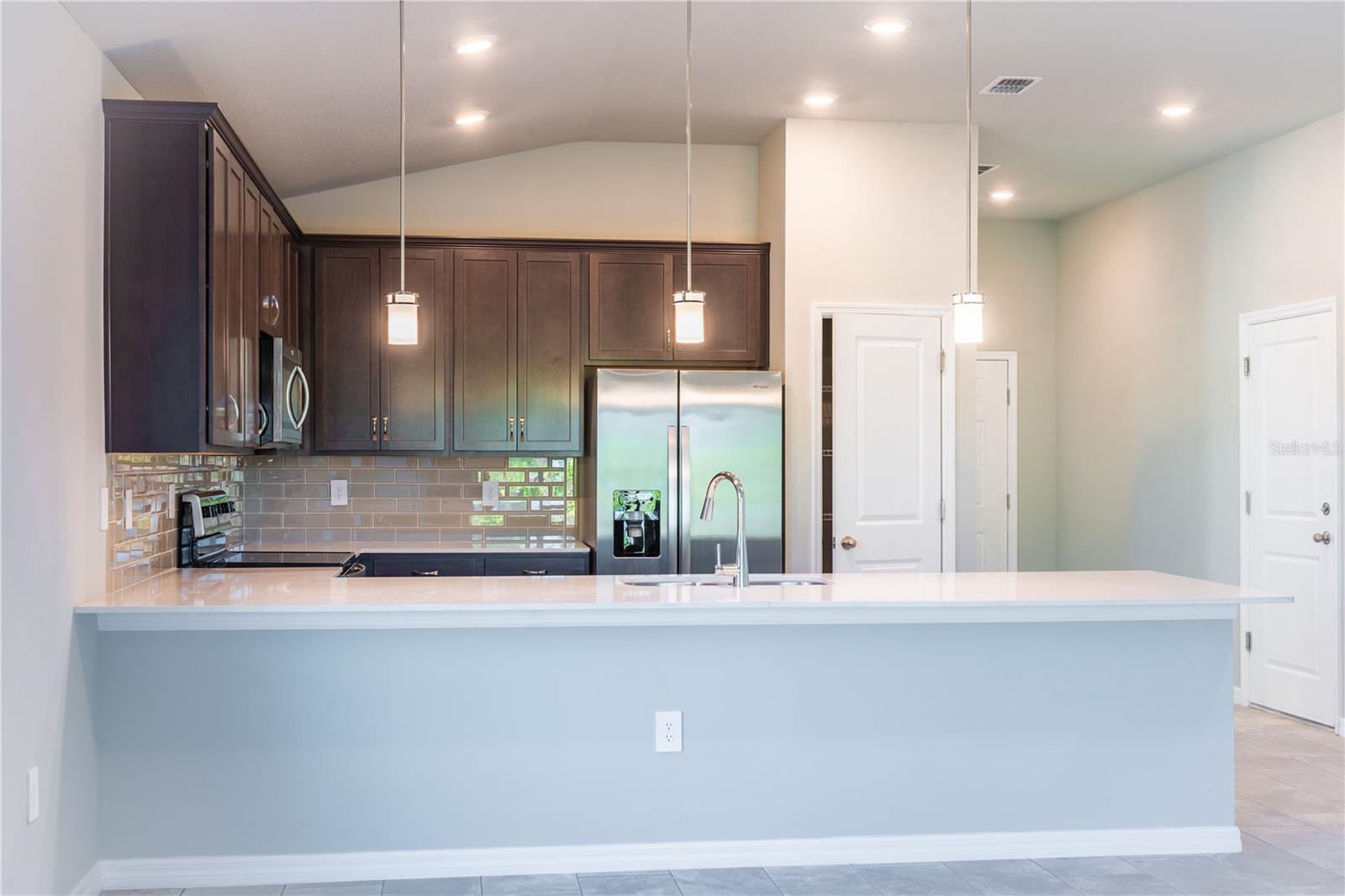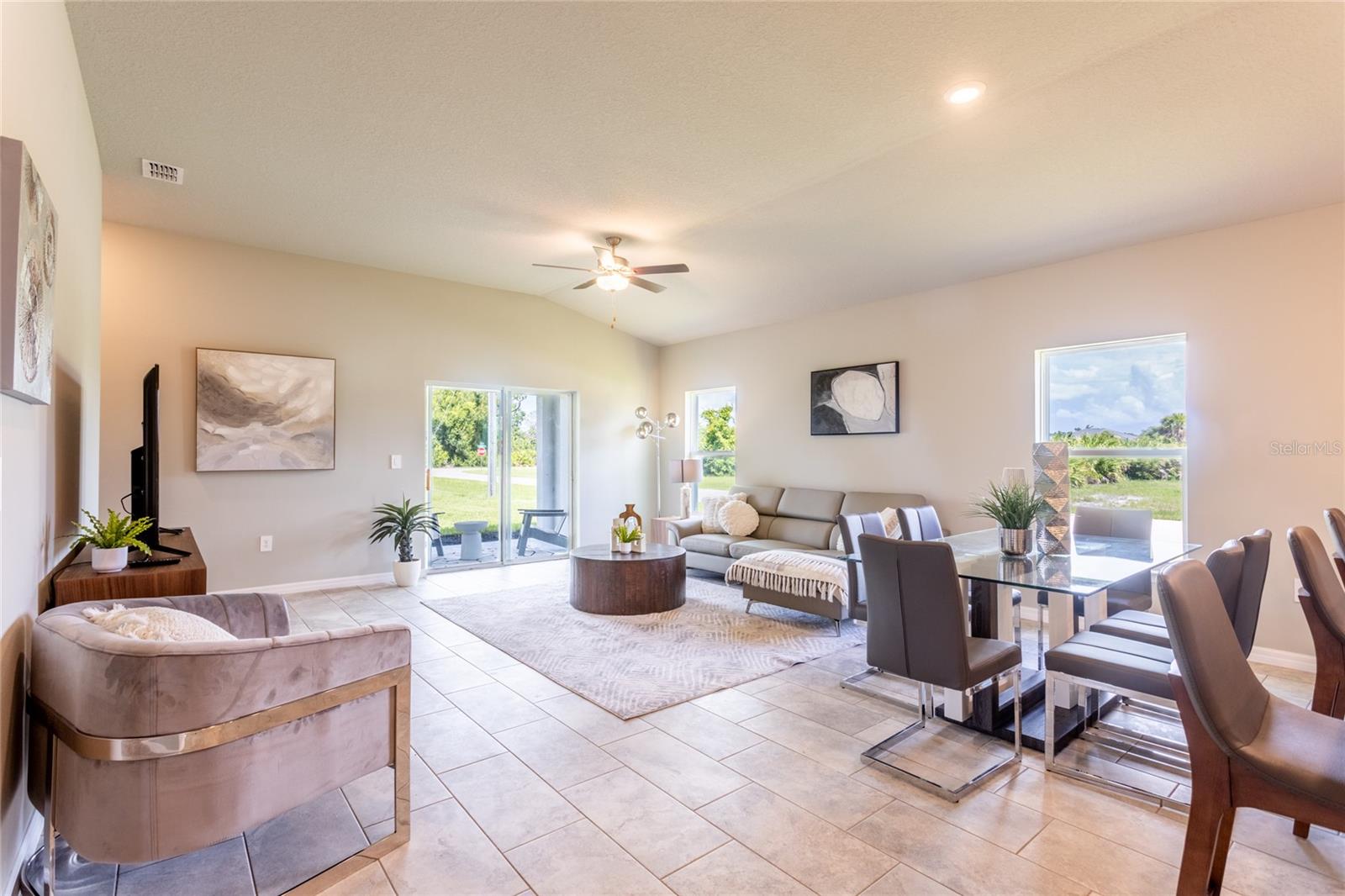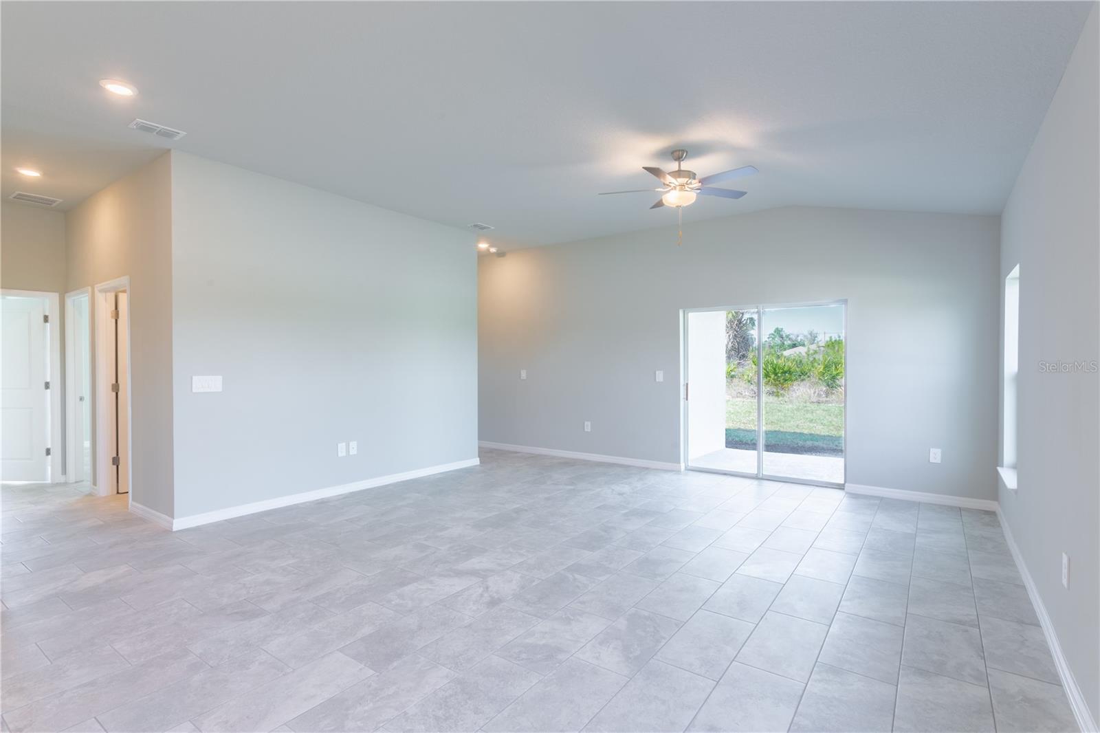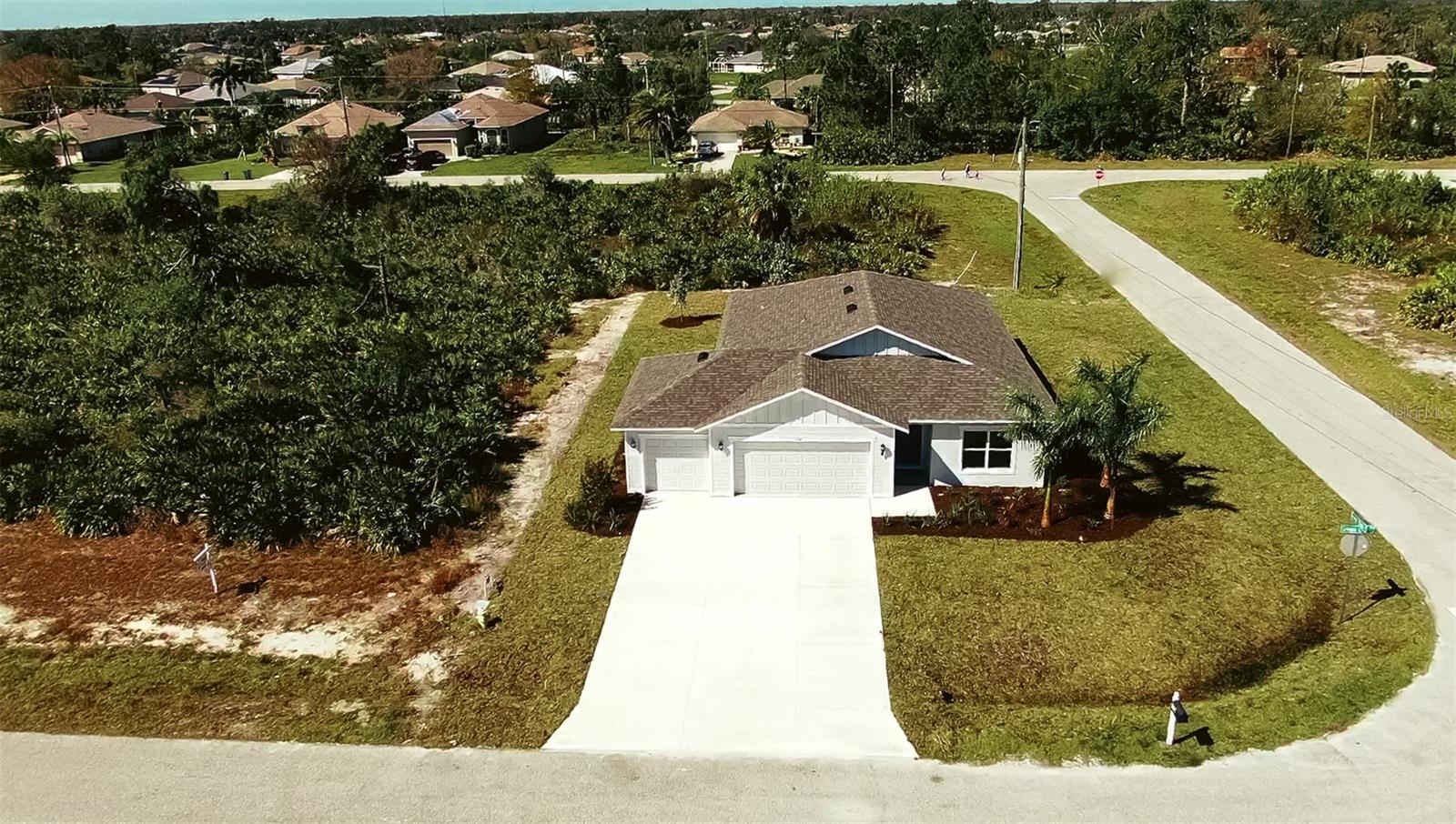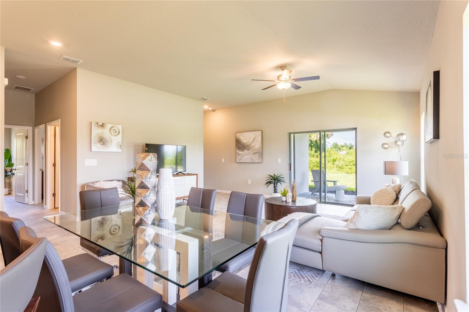 **NEW CONSTRUCTION, NO WAIT, MOVE IN READY!** Elevate your lifestyle with the opulence of the Sanibel floorplan presented by Carpenter Homes—a masterpiece within the Florida Living Series, certified by the Florida Green Building Coalition (FGBC). This home features 4 bedrooms and 2 full bathrooms. This dream home is designed and built to immerse you in luxury. As you enter, a beautiful kitchen welcomes you, with an expansive, oversized bar that seamlessly flows into the living and dining area! The finesse of soft-close, Stained Basalt 42" cabinets, Bliss Element Earth 3x9 beveled glass subway tile backsplash, and upgraded Blanco Matrix quartz countertops add a functional touch of luxury to the kitchen. Kitchen upgrades include a Moen Sleek chrome kitchen faucet, garbage disposal, and sleek stainless steel energy efficient appliances. This home exudes sophistication with a vaulted ceiling that unveils a spacious lanai, creating an indoor-outdoor haven. Additionally, Carpenter Homes provides an upgraded Robi brushed nickel lighting package including pendants over the kitchen bar, and vanity fixtures in both bathrooms, accenting the overall lighting design. Monte Carlo Linden brushed steel finish ceiling fans in each bedroom, as well as the great room, helps to circulate air flow and keep you cool in the Florida weather. Complimenting the expansive living area is Veneta Grigio 12x24 ceramic tile flooring. The Owner's suite is a sanctuary of indulgence, showcasing dual sinks, impeccably tiled Magnisi White 8x12 walls in the shower, and a generously sized walk-in closet. The home boasts Magnisi White 8x12 upgraded tiled walls in in the second bath/shower, a Blanco Matrix quartz vanity top, and Moen Genta LX chrome faucets and shower/tub trim kits. The ampleness of this home continues with a utility room, and additions such as energy-efficient R-4.1 insulation on concrete exterior walls, Taexx tubes for pest control, and fabric hurricane shutters for every window. The Florida friendly landscaped yard is complemented by an irrigation system with a rain sensor to help maximize efficiency. The expansive 3-car garage, complete with two garage door openers and four remotes, not only provides ample space for your everyday needs but also ensures the utmost convenience and versatility for all your storage and parking requirements. Step into a world where extravagance meets eco-conscious living—your forever home awaits, a testament to timeless elegance and modern sustainability. Available to view any time!