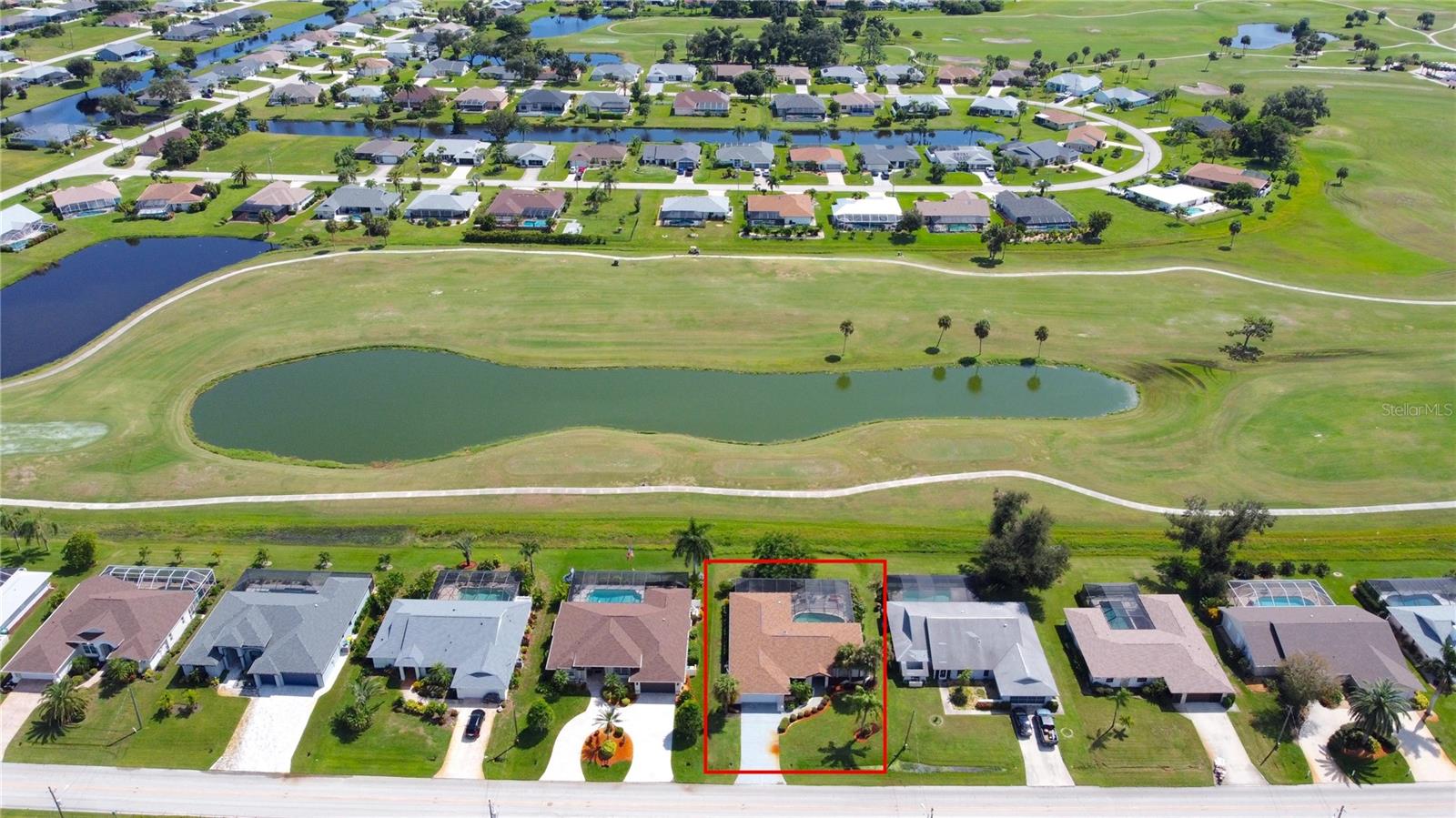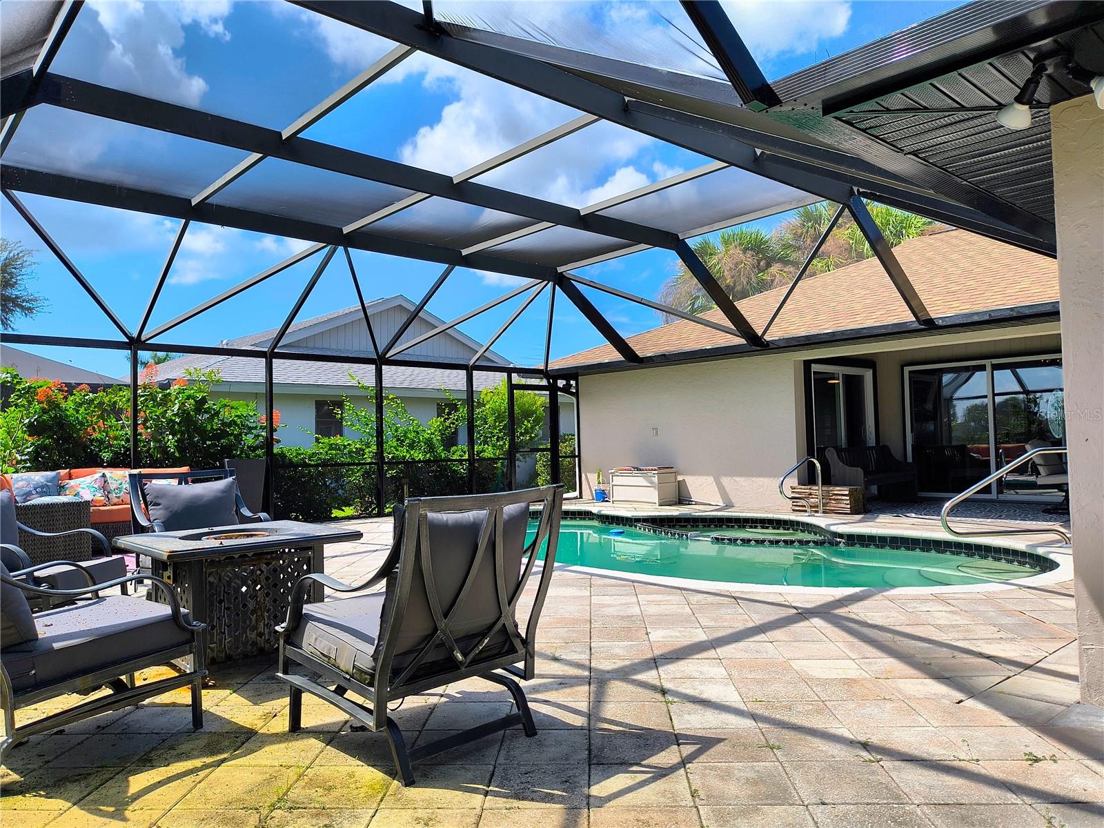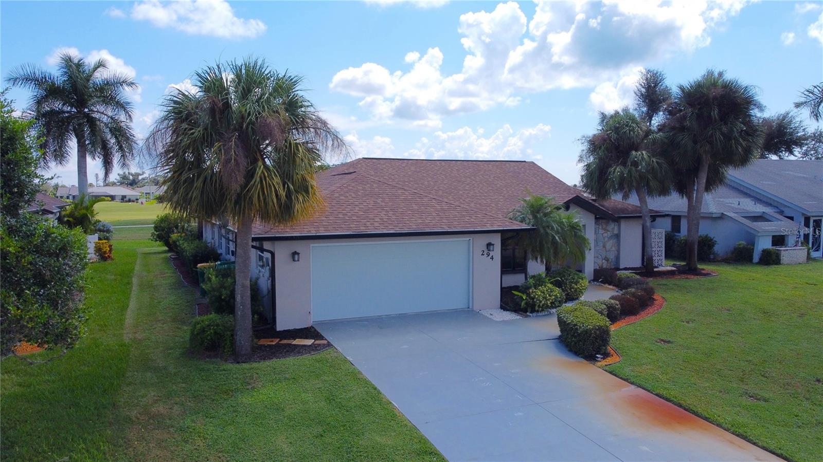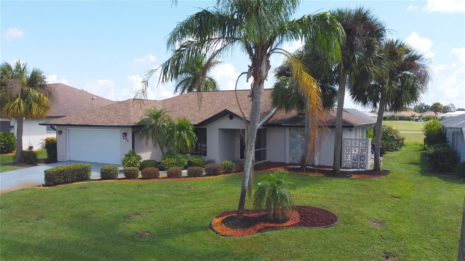 Imagine having your morning coffee on your oversized lanai overlooking a golf course. Looking for the perfect POOL home with plenty of room to entertain outdoors? This is it! This 3 bed, 2 bath home has the most amazing and expansive pool area you will find, with over 1300 sq. ft. of outdoor living overlooking the Palms Golf Course, which is an 18-hole par 72 championship course. Sliders from the living room, primary bedroom, dining room and hall give you beautiful views of your pool and spa. The interior of the home boasts high ceilings upon entry, with skylights throughout providing lots of extra lighting. The laundry room is conveniently located off of the kitchen area, and the oversized garage offers plenty of extra storage. This is truly an entertainers paradise and will not disappoint. For the beach lovers, this home is less than 20 minutes from Boca Grande and Englewood beaches! This property is what Florida living is all about. Make this one your forever home today! New roof 2022, water heater 2024, sprinkler upgrade 2024. Home comes fully furnished.