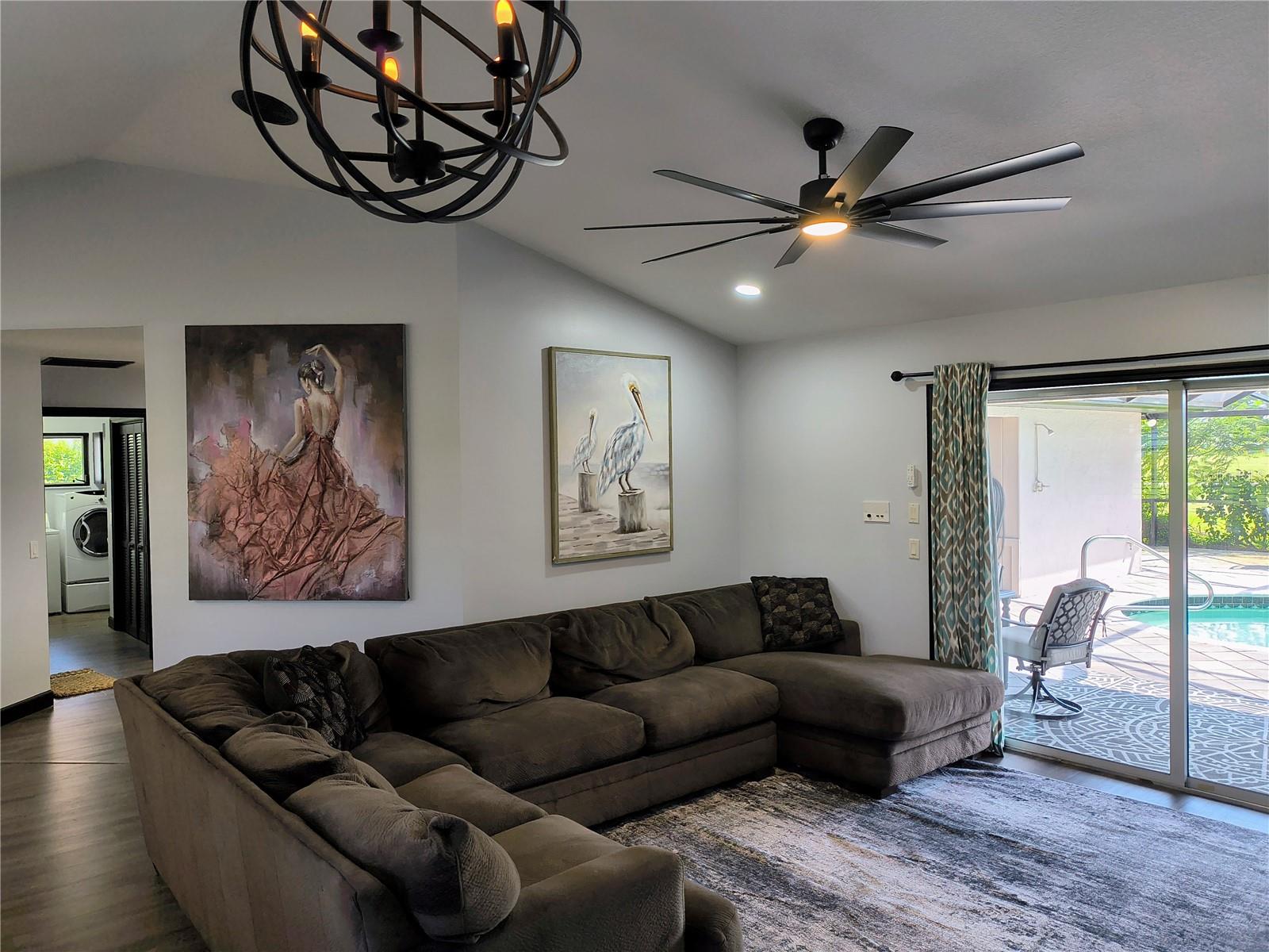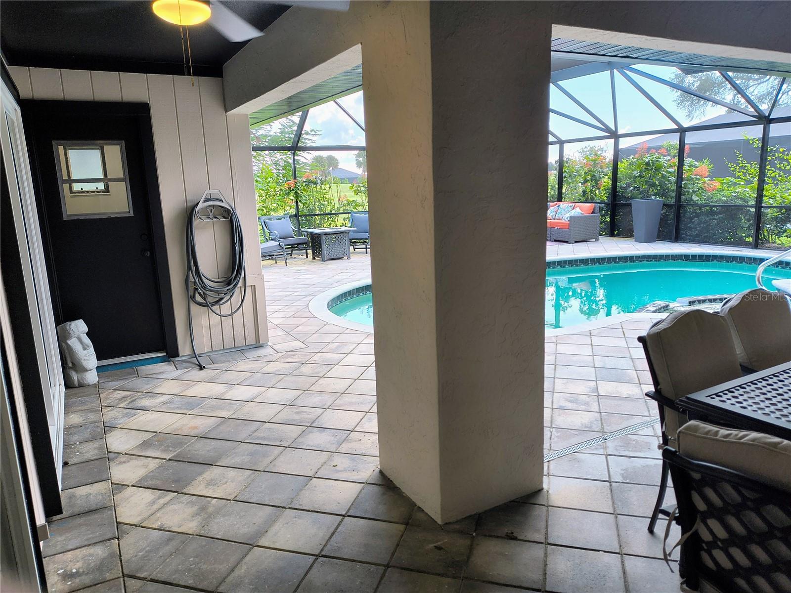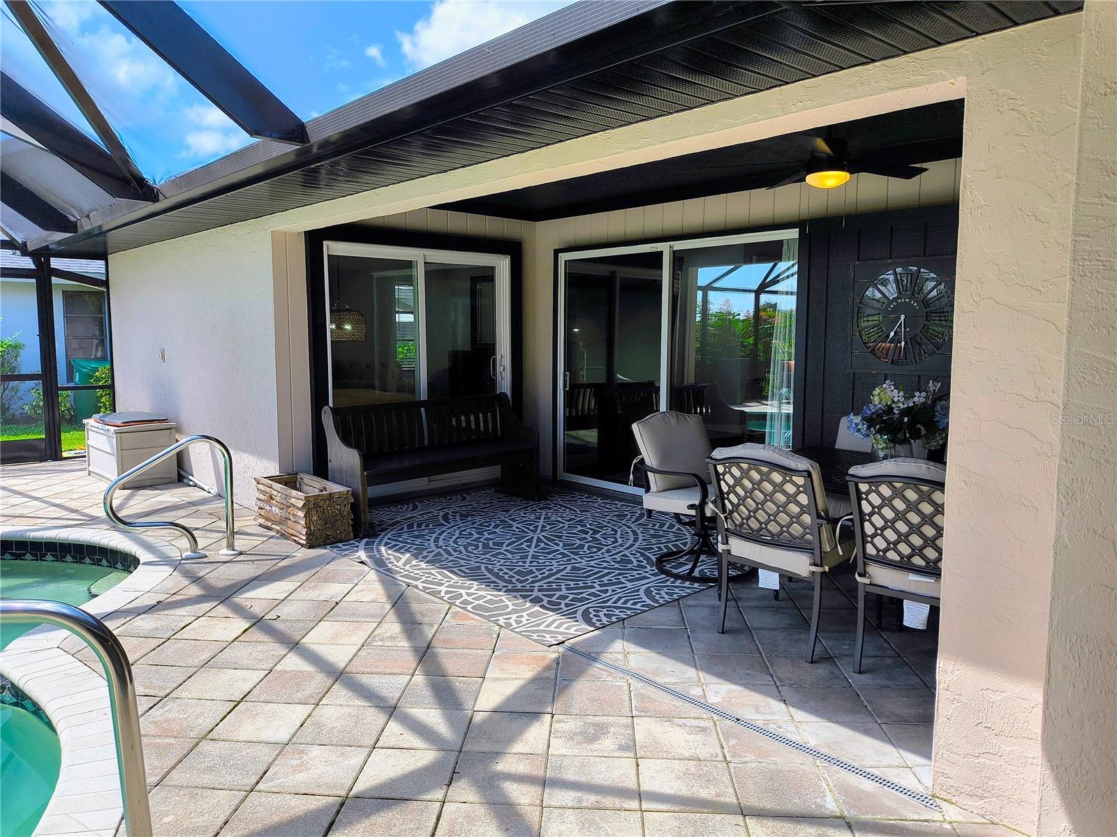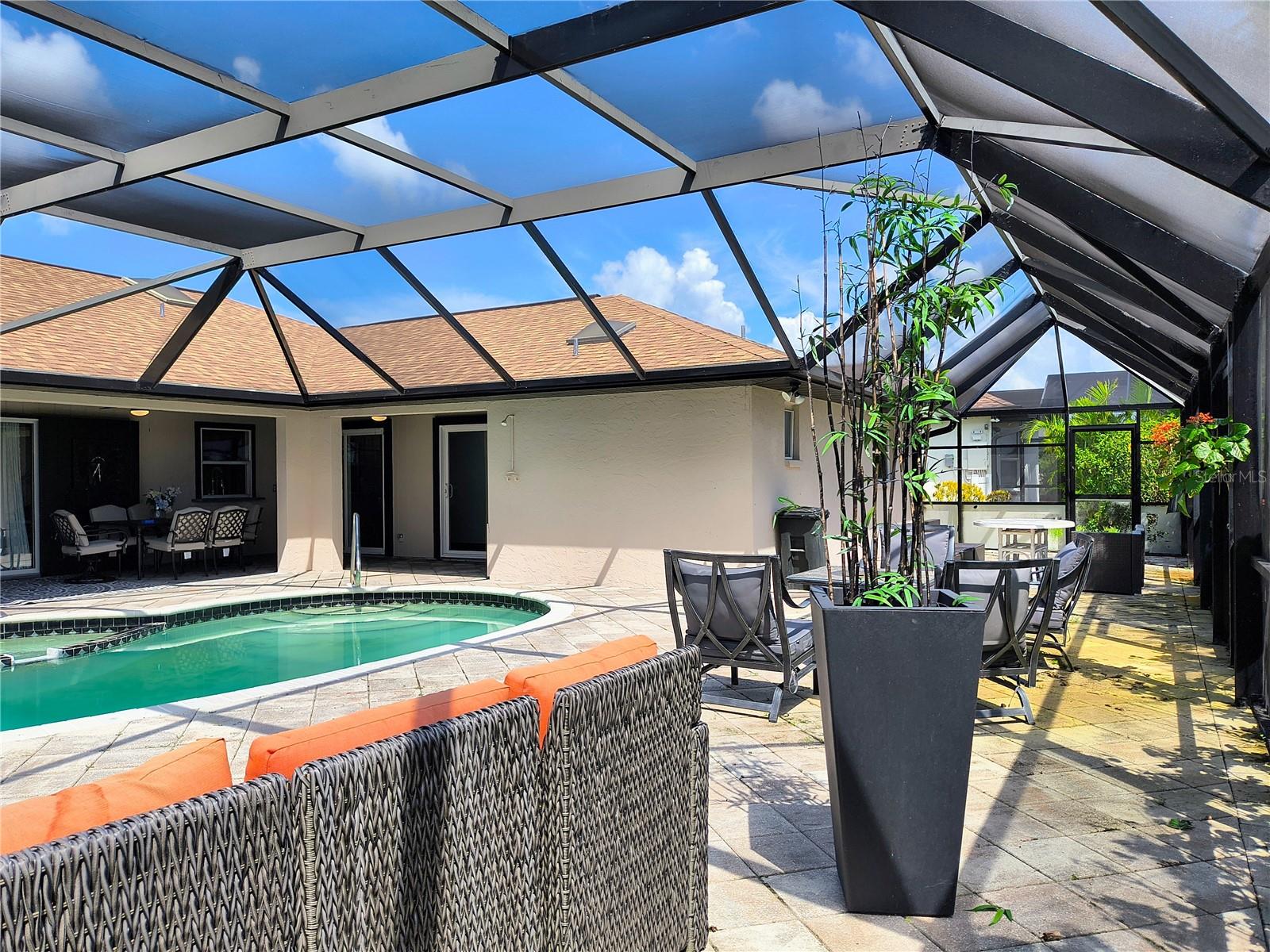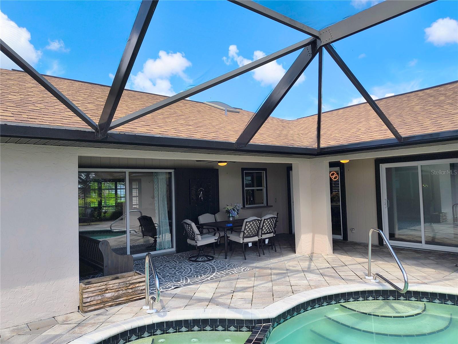 Imagine having your morning coffee on your oversized lanai overlooking a golf course. Looking for the perfect POOL home with plenty of room to entertain outdoors? This is it! This 3 bed, 2 bath home has the most amazing and expansive pool area you will find, with over 1300 sq. ft. of outdoor living overlooking the Palms Golf Course, which is an 18-hole par 72 championship course. Sliders from the living room, primary bedroom, dining room and hall give you beautiful views of your pool and spa. The interior of the home boasts high ceilings upon entry, with skylights throughout providing lots of extra lighting. The laundry room is conveniently located off of the kitchen area, and the oversized garage offers plenty of extra storage. This is truly an entertainers paradise and will not disappoint. For the beach lovers, this home is less than 20 minutes from Boca Grande and Englewood beaches! This property is what Florida living is all about. Make this one your forever home today! New roof 2022, water heater 2024, sprinkler upgrade 2024. Home comes fully furnished.
