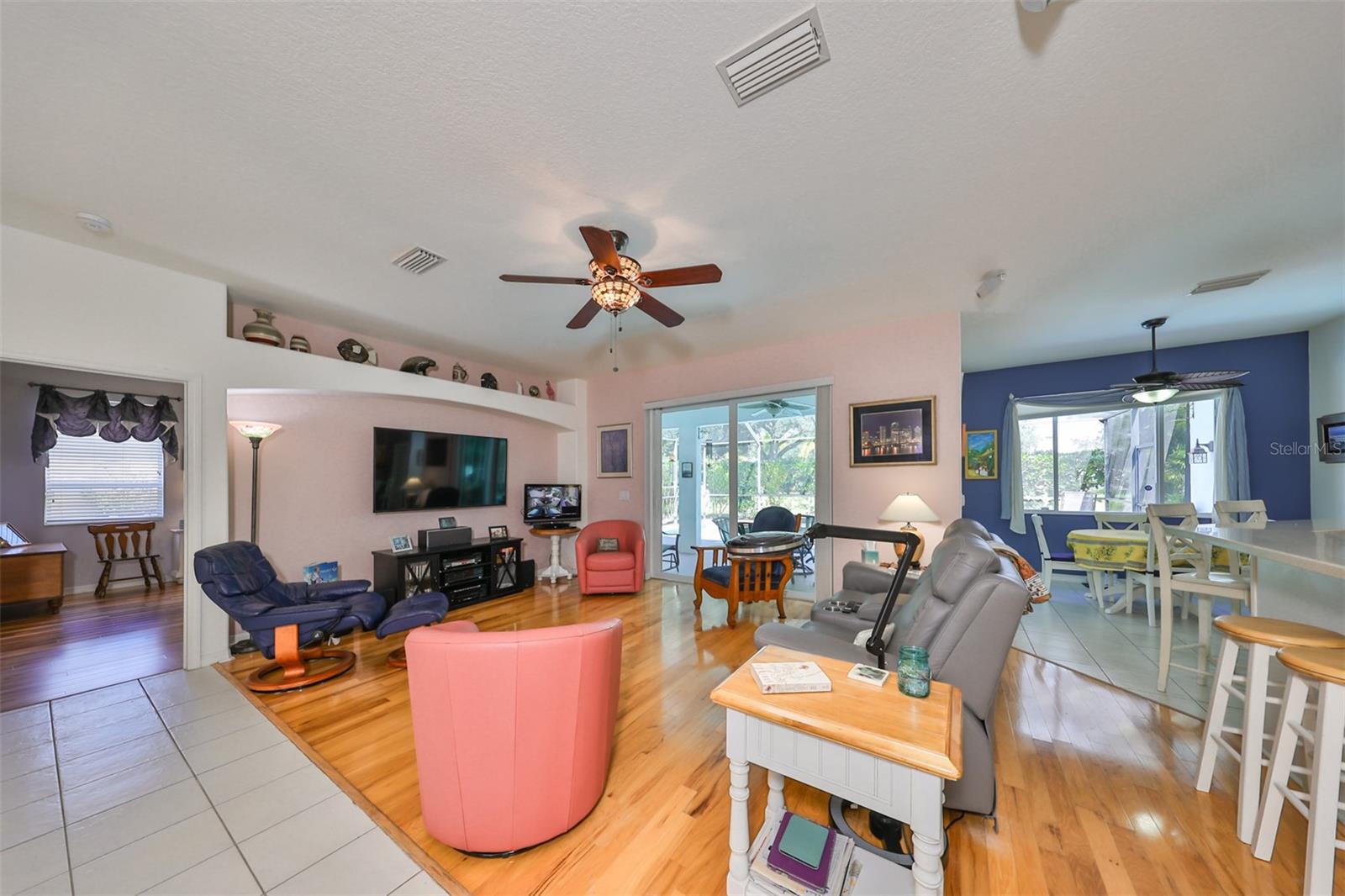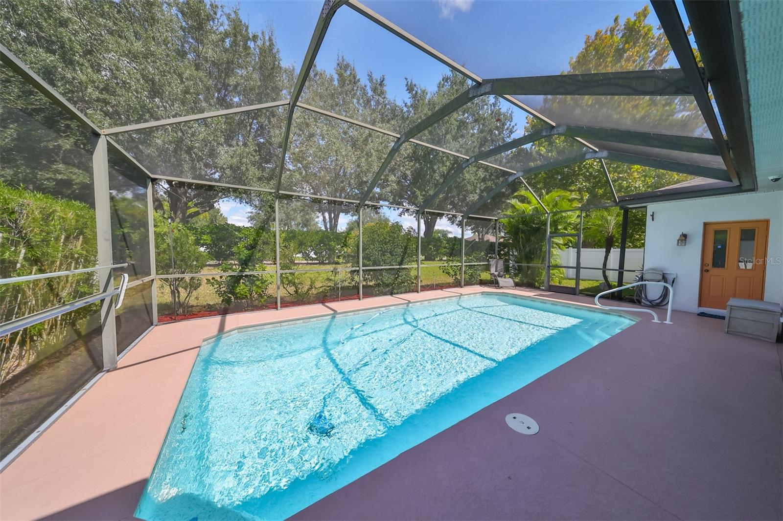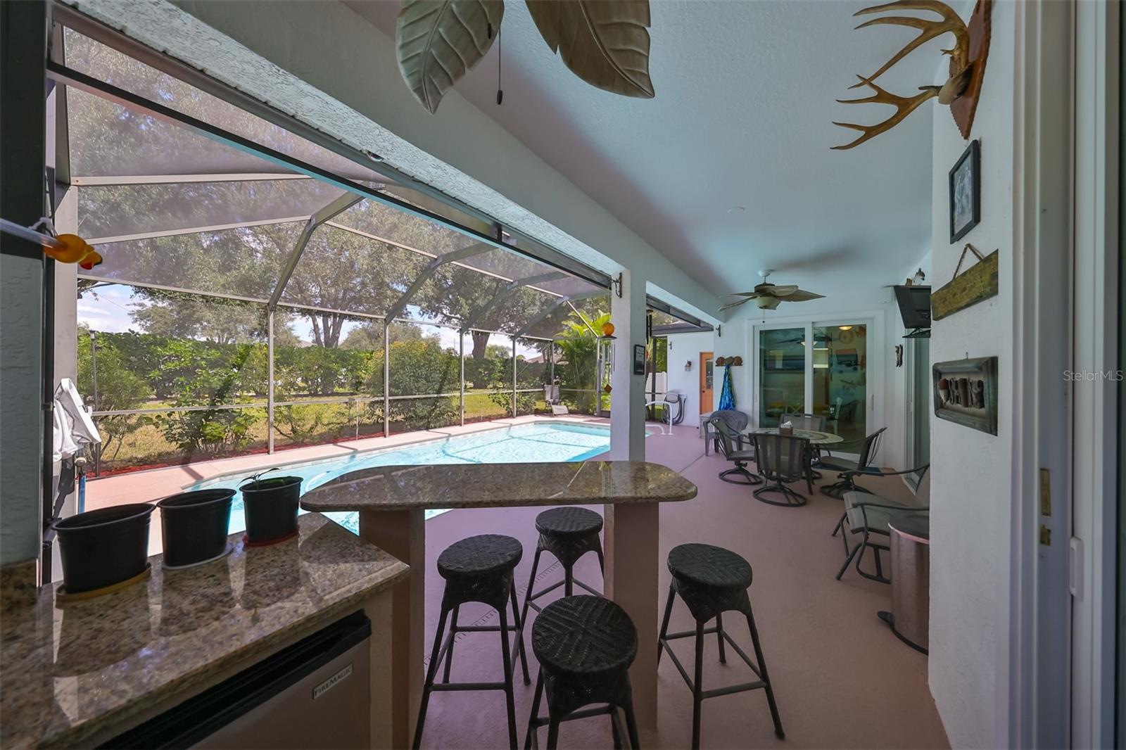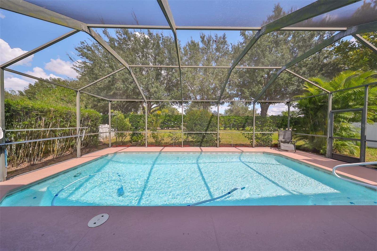 FULLY POWERED SOLAR home with a POOL on an oversized lot. This home features a NEW ROOF, three bedrooms, two bathrooms, and an OVERSIZED, AIR-CONDITIONED garage all within the desirable Cypress Village GOLF community. UTILITY BILLS average UNDER $50 per month. SOLAR will be completely PAID OFF, so the new buyer can enjoy the benefits from day 1. The open floor plan includes a formal dining area, an eat-in kitchen space, and a large breakfast bar overlooking the family room. The kitchen features white cabinets, Corian countertops, stainless steel appliances and a spacious corner pantry. The home boasts a split floor plan, highlighted by a spacious owner's suite that includes a sliding glass door opening to the pool deck, two walk-in closets, dual vanities, a walk-in shower, a garden tub, and a private commode room. The additional bedrooms are generously sized and offer extra storage above the large closets. The second bathroom features an exterior door for easy access from the pool deck. Outside through any of the hurricane impact sliders is your Florida oasis with a covered area and an outdoor kitchen. Beyond this you will find a sparkling pool with a screened cage. The back yard is private with no backyard neighbors. The numerous upgrades included are: 2024 appliances, 2023 solar panels, a new roof 2019, an A/C unit 2018, and resurfaced pool and patio in 2017. The oversized garage is 3 feet deeper, fully insulated and air-conditioned, with tons of storage making it ideal for a workshop year-round. Enjoy LOW HOA fees, NO CDD fees, and a golf cart-friendly neighborhood. The location offers convenient access to I-75, making trips to Tampa, Sarasota, and Bradenton a breeze. Nearby amenities include beaches, golf courses, medical facilities, restaurants, schools, shopping, and more.