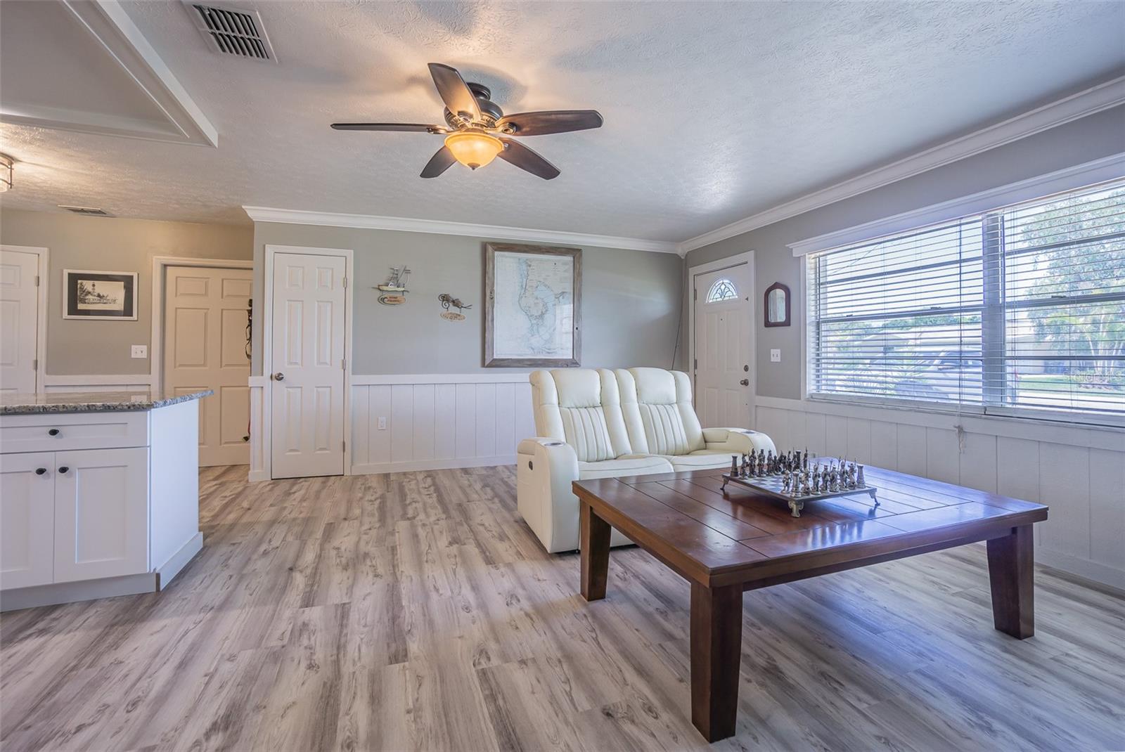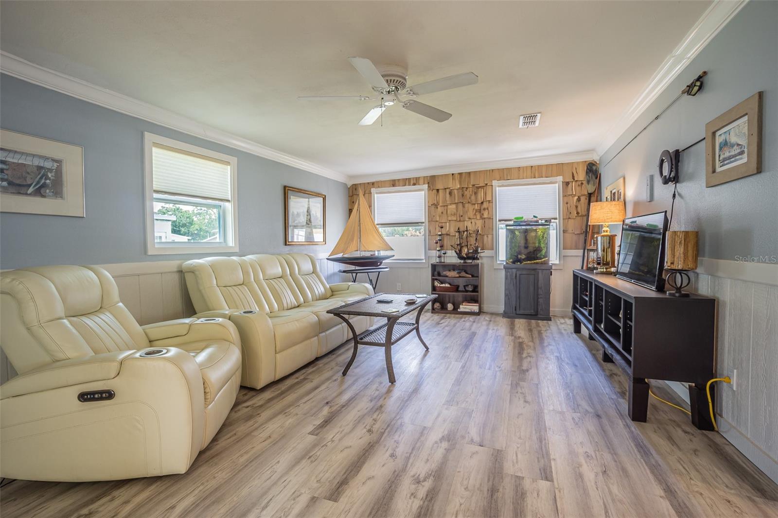Bring your toys and park them here! Don't miss this 2-bed, 1.5-bath, oversized 1-car garage remodeled FURNISHED home on 0.23-acre of NON-HOA/CDD land now for sale in Ruskin! This adorable home has a real coastal, beach cottage ambiance and features a FRONT DECK, landscaping, covered entryway, LUXURY VINYL FLOORING throughout, CROWN MOLDING, wainscoting, and more! Step into the GREAT ROOM to find the living area, garage access, and a half bathroom. The UPDATED KITCHEN steals the show with its BRAND NEW GRANITE COUNTERTOPS (May 2025), closet pantry, beautiful cabinetry, BREAKFAST BAR, and stainless steel appliances! Both bedrooms feature closets with CUSTOM SHELVING and are conveniently positioned near the full bathroom. The spacious FAMILY ROOM provides even more interior entertaining space, and also has FRENCH DOOR access to the COVERED LANAI with paver flooring and outdoor grilling setup on out to the FENCED backyard with storage shed! Ruskin offers small-town charm in its local gems such as its parks and restaurants, while also having access to major highways and being poised between Bradenton and Tampa. Jump on this wonderful opportunity today!