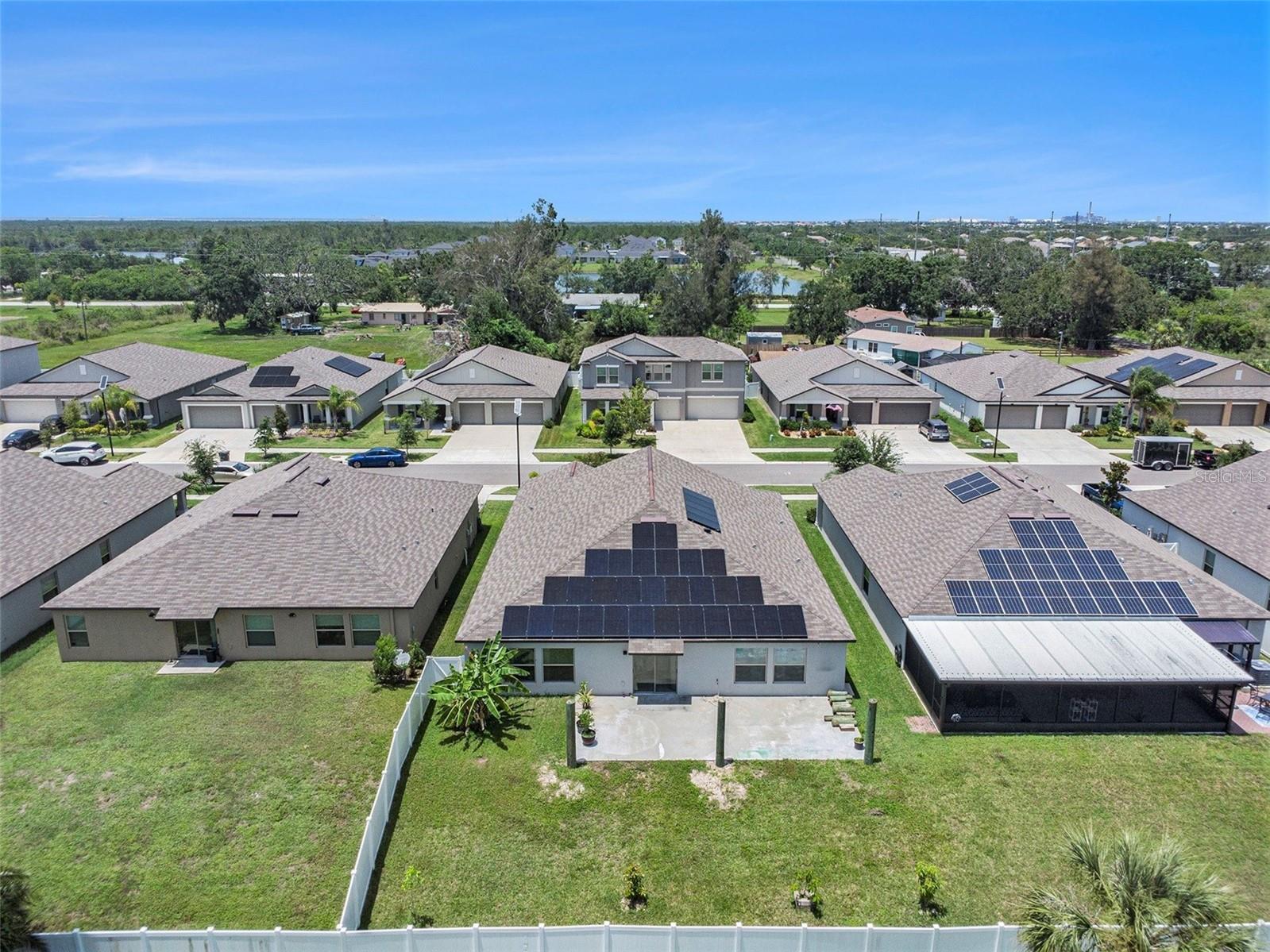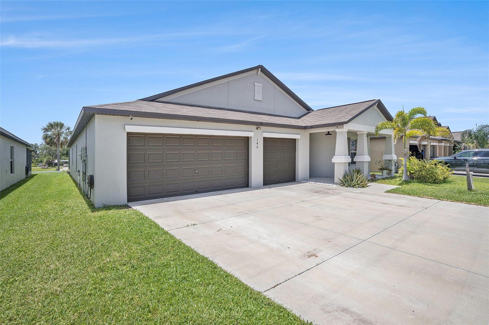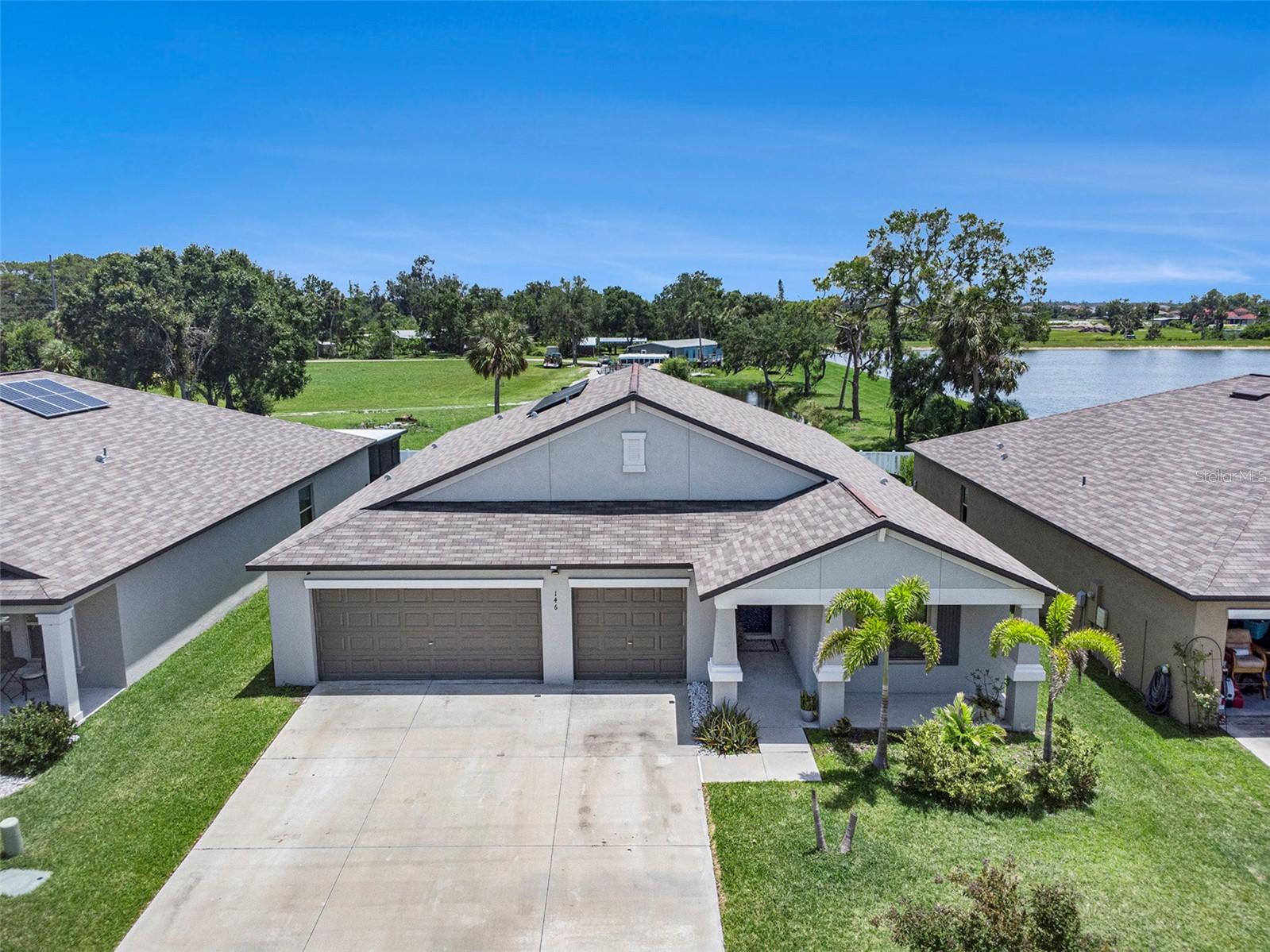 Come tour this exceptional 5-bedroom, 3-bathroom gem built in 2021, featuring an oversized 3-car garage and the only five-bedroom layout in the entire community! This remarkable home makes a lasting impression with its charming front porch framed by elegant columns, delivering timeless curb appeal from the moment you arrive. Inside, you're welcomed by soaring 9-foot ceilings, a spacious foyer, and a thoughtfully designed multi-generational split floor plan with not one, but TWO PRIVATE EN SUITES, each offering generous walk-in closets for ultimate comfort and convenience. Every bedroom offers ample space with no room measuring under 10 feet, and there are no small closets in sight—custom shelving has been added throughout to maximize functionality and style. At the heart of the home lies the expansive open-concept kitchen, living, and dining area. The kitchen is truly a showstopper, featuring an oversized island that comfortably seats five, rich dark wood cabinetry with extensive storage, and sleek dark granite countertops. Upgraded sink fixtures, stainless steel appliances, a large walk-in pantry, and a custom-installed stove vent—rarely included by builders—complete this high-performance culinary space. The kitchen flows seamlessly into a spacious 21-foot-wide living room that easily accommodates oversized furniture while maintaining an open and airy feel. Adjacent, the dining area is illuminated by a chic light fixture and perfectly suited for both formal gatherings and everyday meals. Throughout the home, you’ll find tasteful wooden backsplashes (removable if desired) and stylish upgraded light fixtures that add warmth and personality. The owner’s suite closet has been cleverly closed off from the bathroom to enhance privacy, space, and now features custom shelving—ready to be further tailored to its next owner. The laundry room is currently being used as an office, but can easily transition back into its original purpose. Meanwhile, the washer and dryer remain in the garage and will convey with the sale. The garage itself is a standout space, boasting added overhead storage shelving, a speaker system, and a mounted TV—all of which are included with the home! Step outside to enjoy partial water views and a sprawling patio area, ideal for entertaining or adding your own canopy to create the perfect shaded retreat. Energy-efficient solar panels keep electric bills as low as $65 a month (in the summertime!) and will be fully paid off for your benefit, and a comprehensive ADT security system with doorbell and perimeter cameras adds peace of mind. A fun, unique bonus to this home is the thriving aloe vera plant ready for use - your next home is ready to take care of you already! The home will be professionally cleaned prior to closing and is move-in ready for its next chapter. Located in the rapidly growing city of Ruskin, this home is minutes from everyday essentials, with new development and amenities continuously emerging. Just a few miles from I-75 and conveniently positioned along Highway 41, commuting is simple and stress-free. Schedule your private tour today—this is a rare opportunity to own a home that blends thoughtful upgrades, expansive space, and modern comfort in one remarkable package.