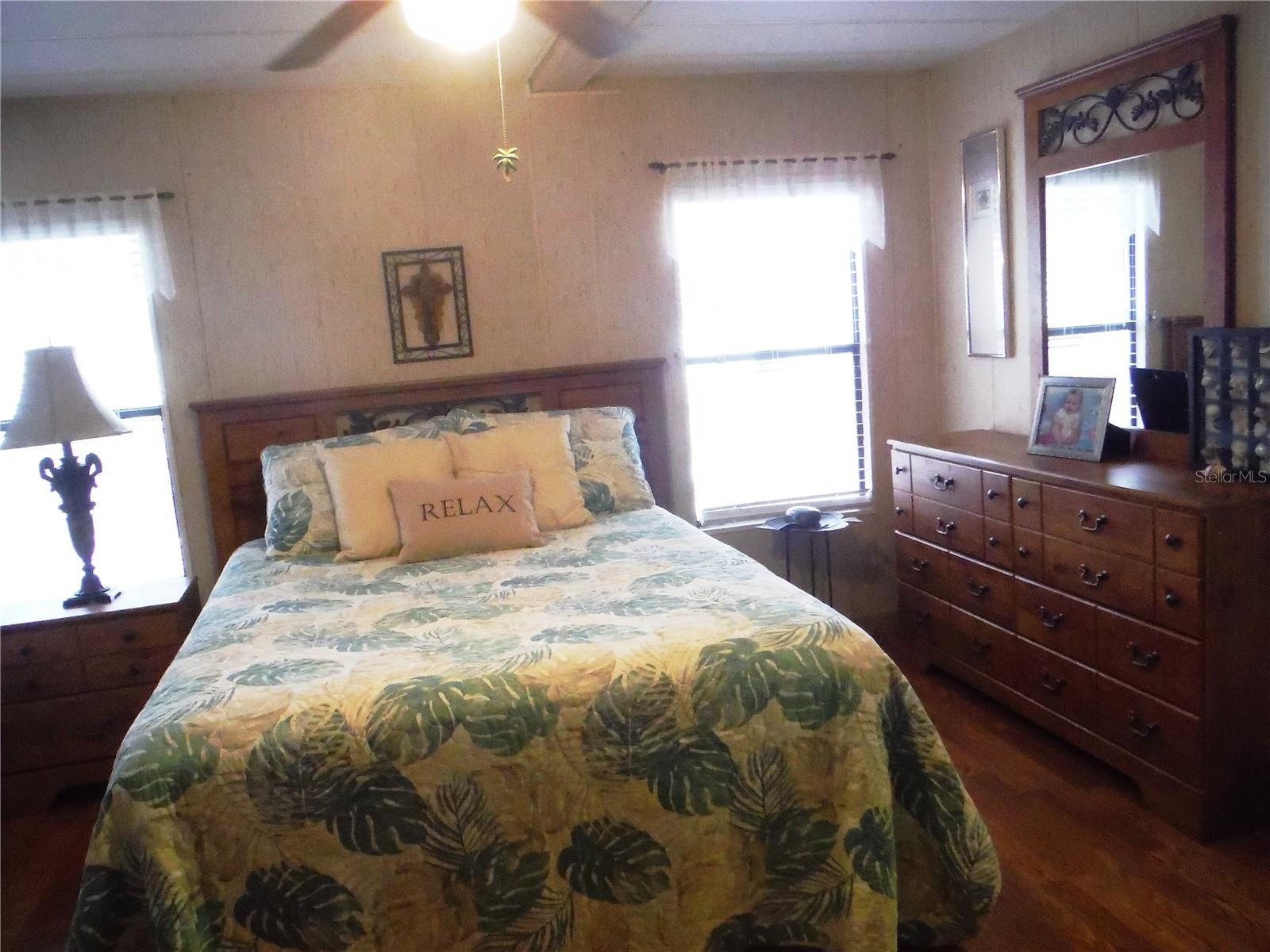 Furnished 2 bedroom 2 bath with an extra room being used as a 3rd bedroom. Large home in immaculate condition - 1354 square feet under central heat & air. Laminate & ceramic tile floors over 3/4" plywood subfloors. Stainless steel appliances - Range & microwave new and installed Jan 7/2025 in the island kitchen. This home has high ceilings and a woodburning fireplace in the living room. The bonus room was added behind the carport and in front of the laundry room so you can stay inside to do your laundry. When you go out the back door you will find a huge patio that extends the full length of the back of the house. This Jacobsen home is truly spotless and a real delight. You may have a cat or a dog up to 25 pounds in this 55 plus home. Room measurements approximate.