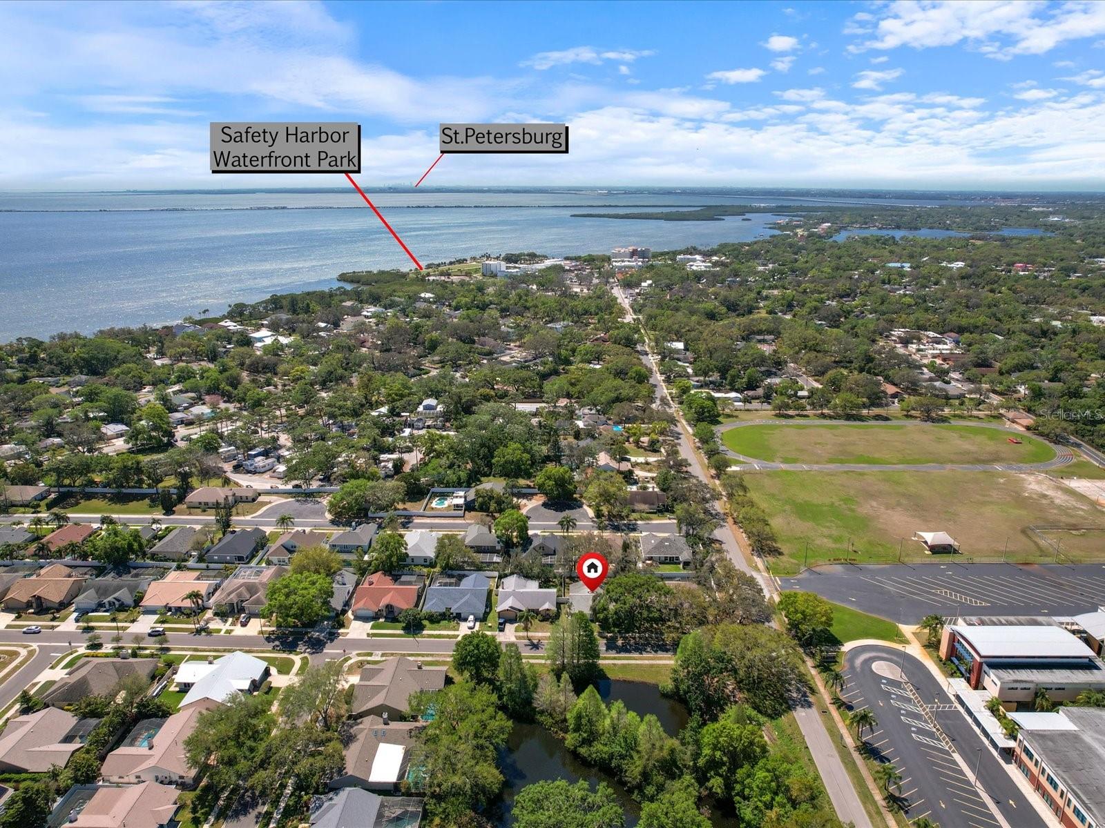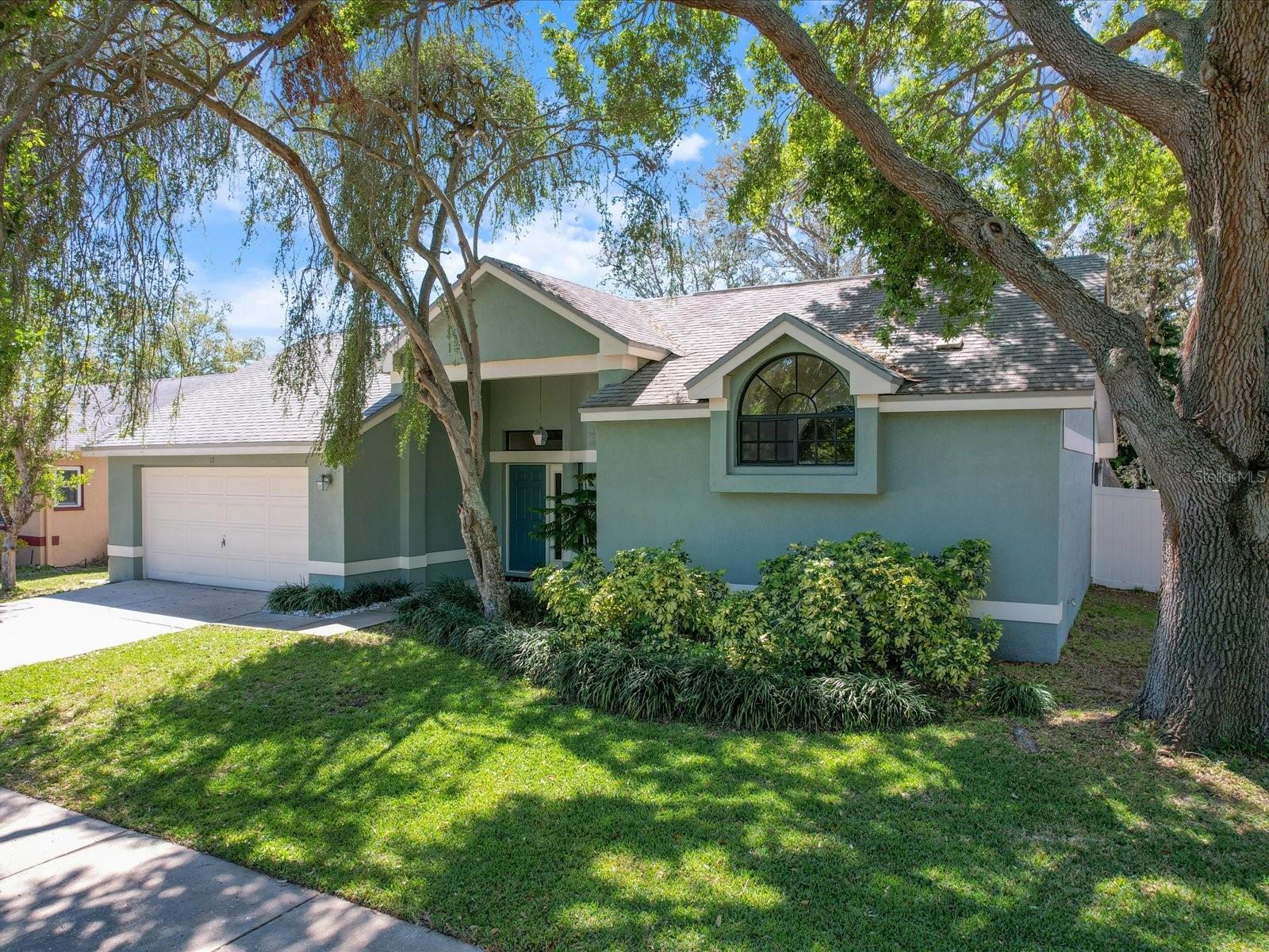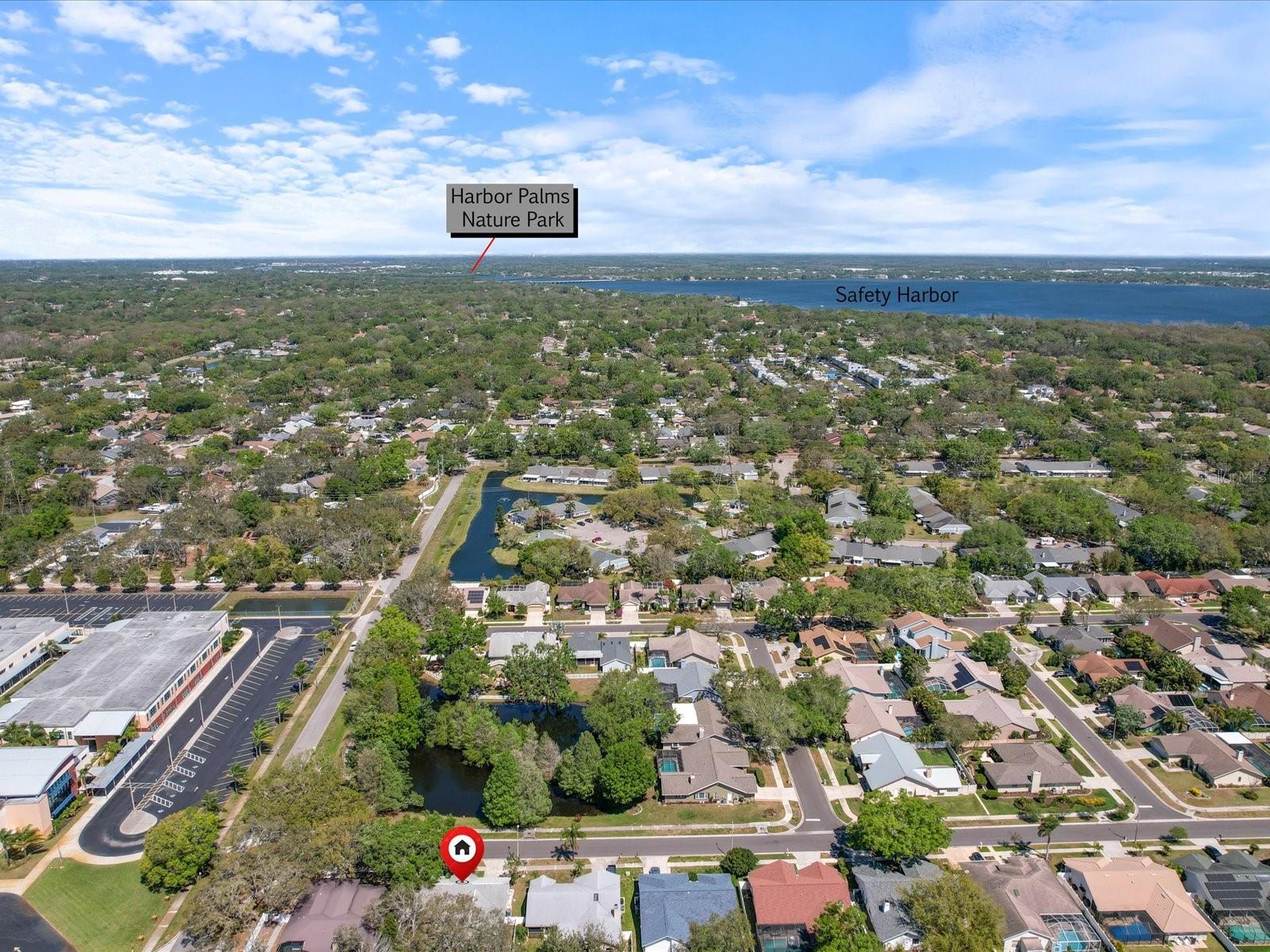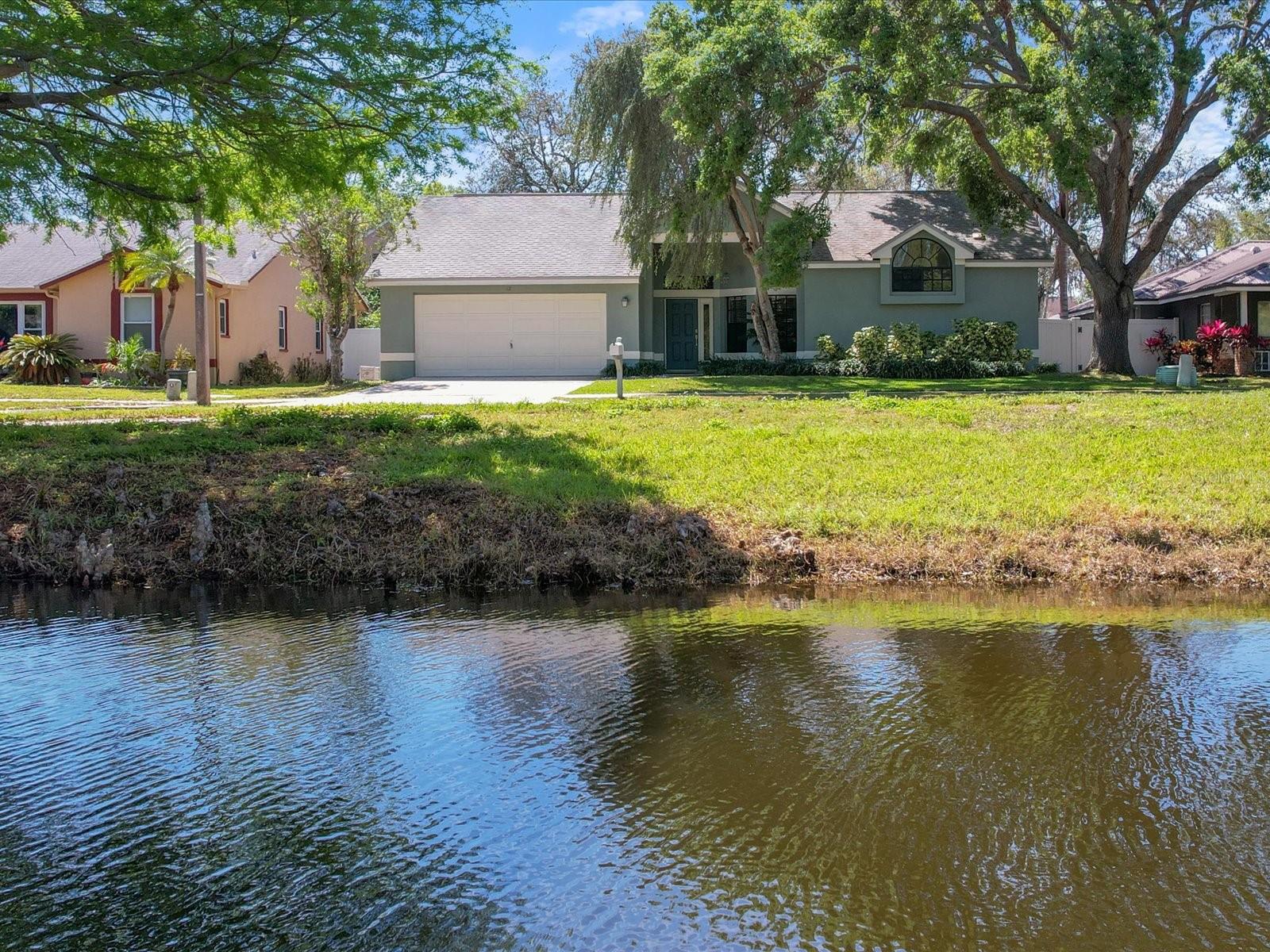 Within a few minutes of downtown Safety Harbor with its wide array of restaurants, unique shops, art gallery, Bayshore trail, and more, this home fits the bill of convenience along with architectural beauty. Positioned across the street from a lush, serene pond, this lovely home greets you with a look of fresh paint. As you walk through the front door you enter into a combined living room/dining room open plan complete with vaulted ceilings, sliding doors and windows all creating a large open feel. You will quickly notice the warm flow of new luxury vinyl flooring, carpet, and baseboards throughout the house installed in 2024. A Master ensuite is located on the right and has immediate access to the oversized porch through sliding glass doors. The vaulted ceilings, along with the light from the sliders provide a feeling of spaciousness. An updated Master bath offers Marble flooring with a wood vanity topped with quartz. The glass door enclosure for the shower allows the beauty of the matching Marble tiles that extend up the shower walls. A sliding door opens into a spacious walk-in closet. Near the back of the home, a family room combines with the kitchen area to provide great interaction with Family and friends. The custom wet bar, complete with granite top, provides another convenient entertaining feature while the breakfast bar is a great seating overflow. A breakfast nook at one end of the kitchen offers just the right space and a lovely view of the open backyard. An update of the kitchen included granite over custom stained wood cabinets complete with soft closing features. A new oven, refrigerator, and microwave were added in late 2022! Additional bedrooms share the 2nd updated bath with Marble floors, wood vanity with a solid surface countertop. The beauty of the lush backyard can be enjoyed from the covered porch at the back of the home or the lovely view of the pond at the start or end of your day. The backyard is large enough for a pool if one wants. Only a short walk will get you to both the local elementary and/or middle school. Newer items include a sprinkler system upgraded with a new timer and water-efficient heads in the front yard, garage door springs, water heater, and AC compressor