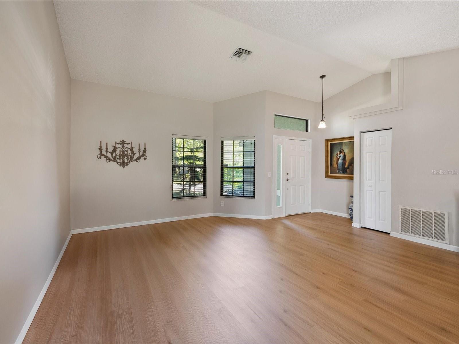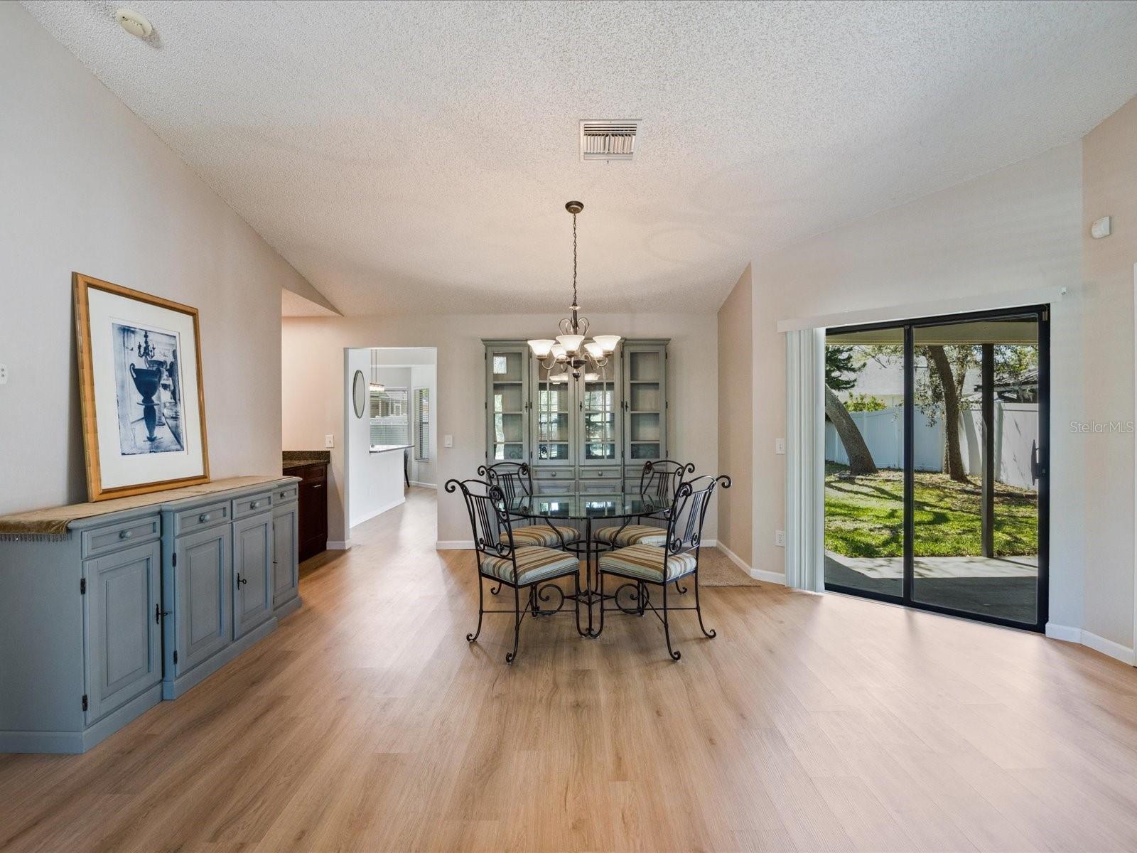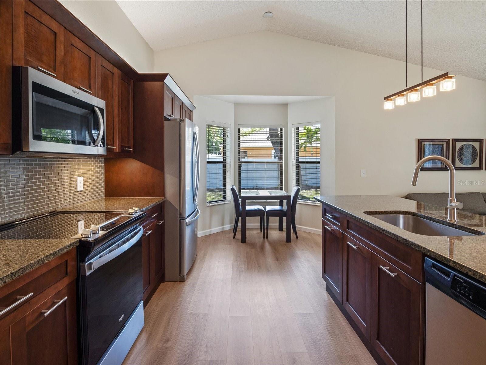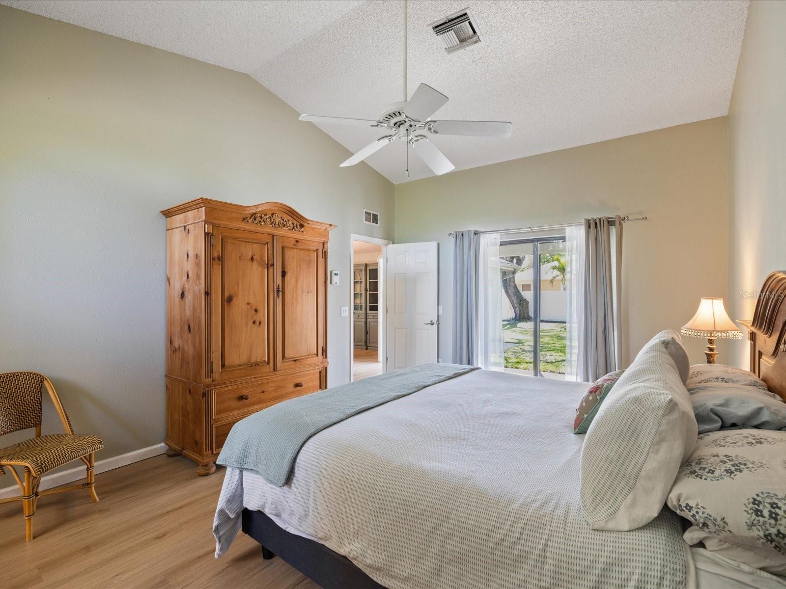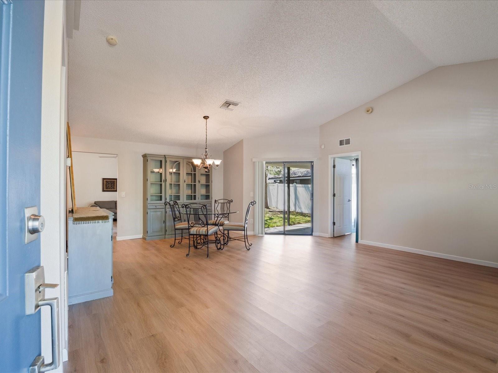 Within a few minutes of downtown Safety Harbor with its wide array of restaurants, unique shops, art gallery, Bayshore trail, and more, this home fits the bill of convenience along with architectural beauty. Positioned across the street from a lush, serene pond, this lovely home greets you with a look of fresh paint. As you walk through the front door you enter into a combined living room/dining room open plan complete with vaulted ceilings, sliding doors and windows all creating a large open feel. You will quickly notice the warm flow of new luxury vinyl flooring, carpet, and baseboards throughout the house installed in 2024. A Master ensuite is located on the right and has immediate access to the oversized porch through sliding glass doors. The vaulted ceilings, along with the light from the sliders provide a feeling of spaciousness. An updated Master bath offers Marble flooring with a wood vanity topped with quartz. The glass door enclosure for the shower allows the beauty of the matching Marble tiles that extend up the shower walls. A sliding door opens into a spacious walk-in closet. Near the back of the home, a family room combines with the kitchen area to provide great interaction with Family and friends. The custom wet bar, complete with granite top, provides another convenient entertaining feature while the breakfast bar is a great seating overflow. A breakfast nook at one end of the kitchen offers just the right space and a lovely view of the open backyard. An update of the kitchen included granite over custom stained wood cabinets complete with soft closing features. A new oven, refrigerator, and microwave were added in late 2022! Additional bedrooms share the 2nd updated bath with Marble floors, wood vanity with a solid surface countertop. The beauty of the lush backyard can be enjoyed from the covered porch at the back of the home or the lovely view of the pond at the start or end of your day. The backyard is large enough for a pool if one wants. Only a short walk will get you to both the local elementary and/or middle school. Newer items include a sprinkler system upgraded with a new timer and water-efficient heads in the front yard, garage door springs, water heater, and AC compressor