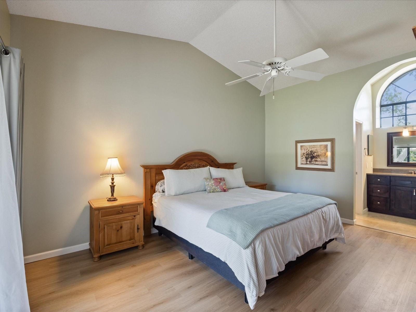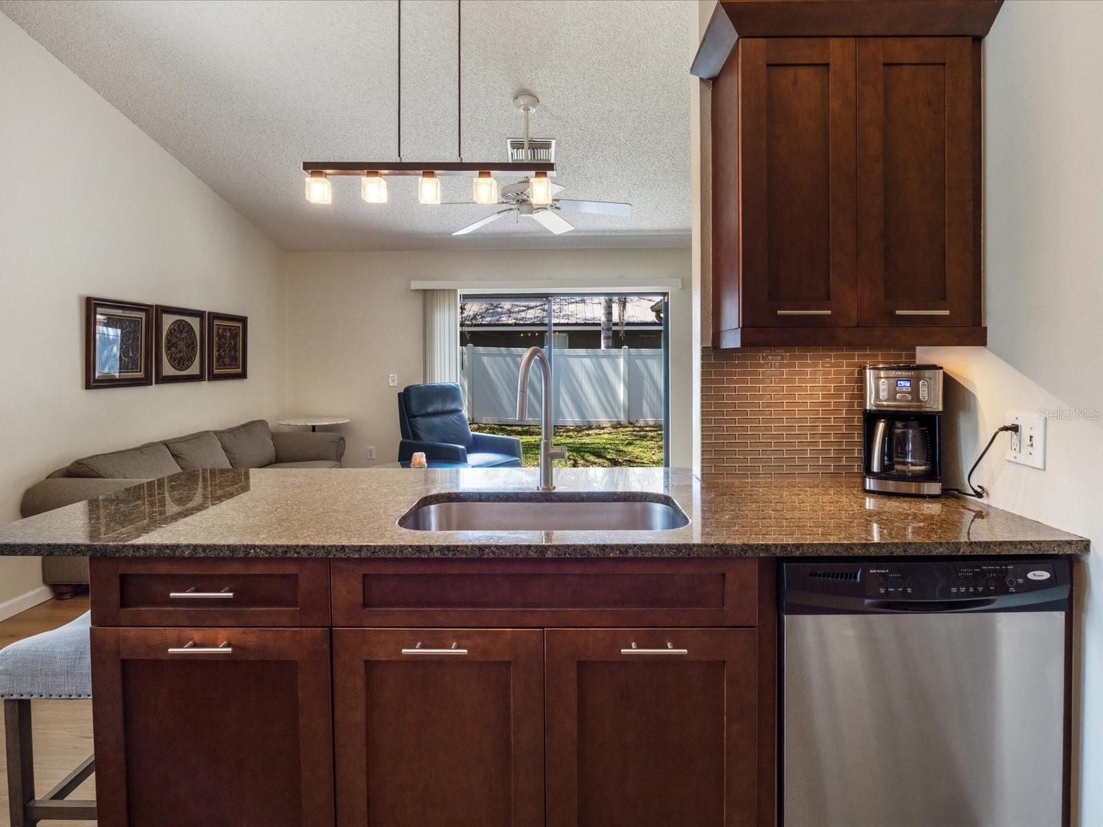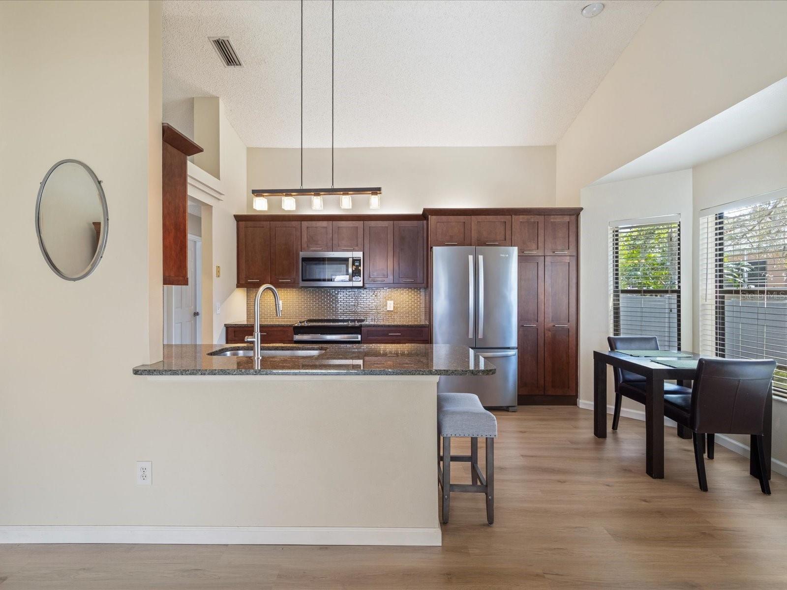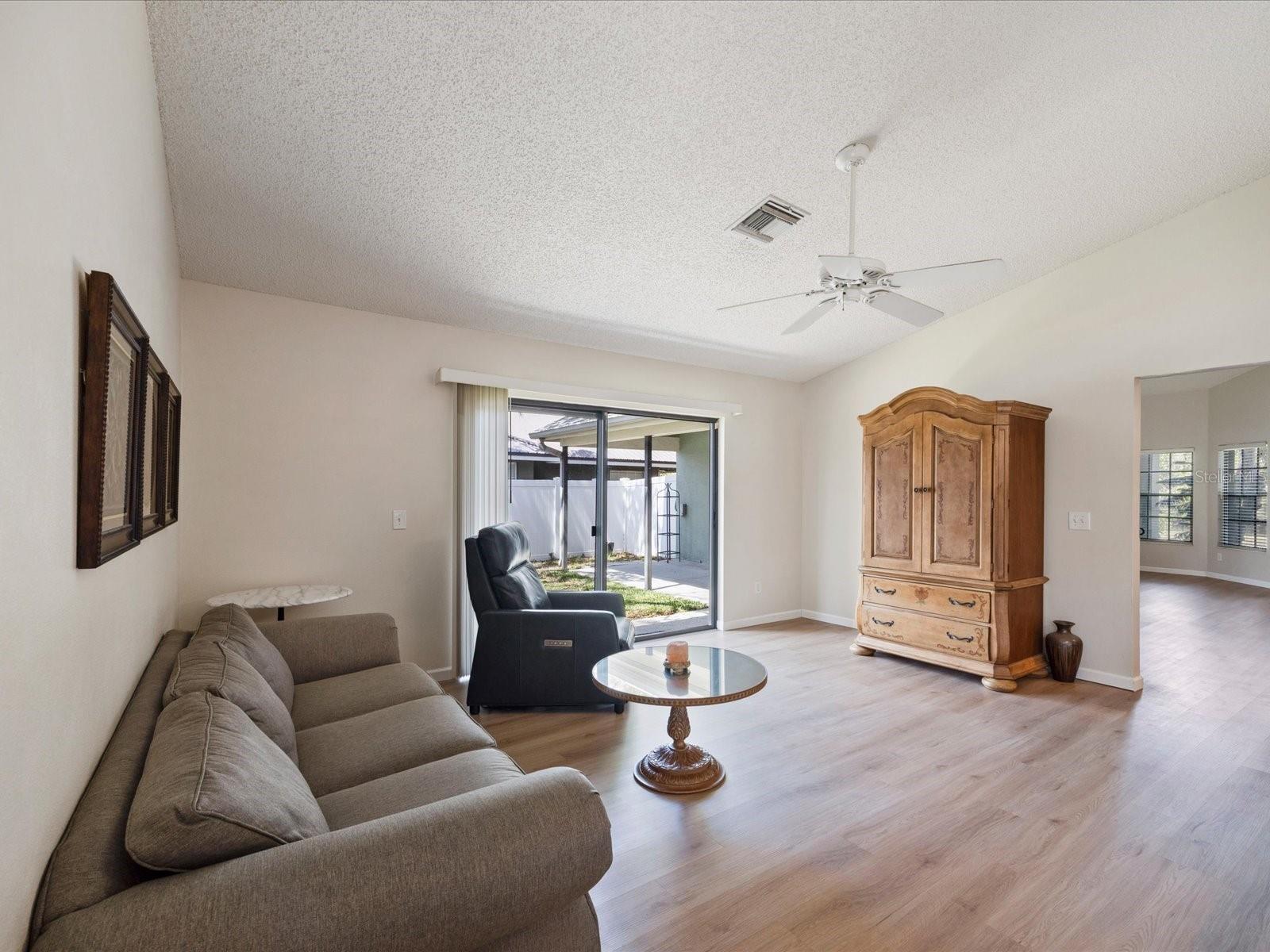 Within a few minutes of downtown Safety Harbor with its wide array of restaurants, unique shops, art gallery, Bayshore trail, and more, this home fits the bill of convenience along with architectural beauty. Positioned across the street from a lush, serene pond, this lovely home greets you with a look of fresh paint. As you walk through the front door you enter into a combined living room/dining room open plan complete with vaulted ceilings, sliding doors and windows all creating a large open feel. You will quickly notice the warm flow of new luxury vinyl flooring, carpet, and baseboards throughout the house installed in 2024. A Master ensuite is located on the right and has immediate access to the oversized porch through sliding glass doors. The vaulted ceilings, along with the light from the sliders provide a feeling of spaciousness. An updated Master bath offers Marble flooring with a wood vanity topped with quartz. The glass door enclosure for the shower allows the beauty of the matching Marble tiles that extend up the shower walls. A sliding door opens into a spacious walk-in closet. Near the back of the home, a family room combines with the kitchen area to provide great interaction with Family and friends. The custom wet bar, complete with granite top, provides another convenient entertaining feature while the breakfast bar is a great seating overflow. A breakfast nook at one end of the kitchen offers just the right space and a lovely view of the open backyard. An update of the kitchen included granite over custom stained wood cabinets complete with soft closing features. A new oven, refrigerator, and microwave were added in late 2022! Additional bedrooms share the 2nd updated bath with Marble floors, wood vanity with a solid surface countertop. The beauty of the lush backyard can be enjoyed from the covered porch at the back of the home or the lovely view of the pond at the start or end of your day. The backyard is large enough for a pool if one wants. Only a short walk will get you to both the local elementary and/or middle school. Newer items include a sprinkler system upgraded with a new timer and water-efficient heads in the front yard, garage door springs, water heater, and AC compressor