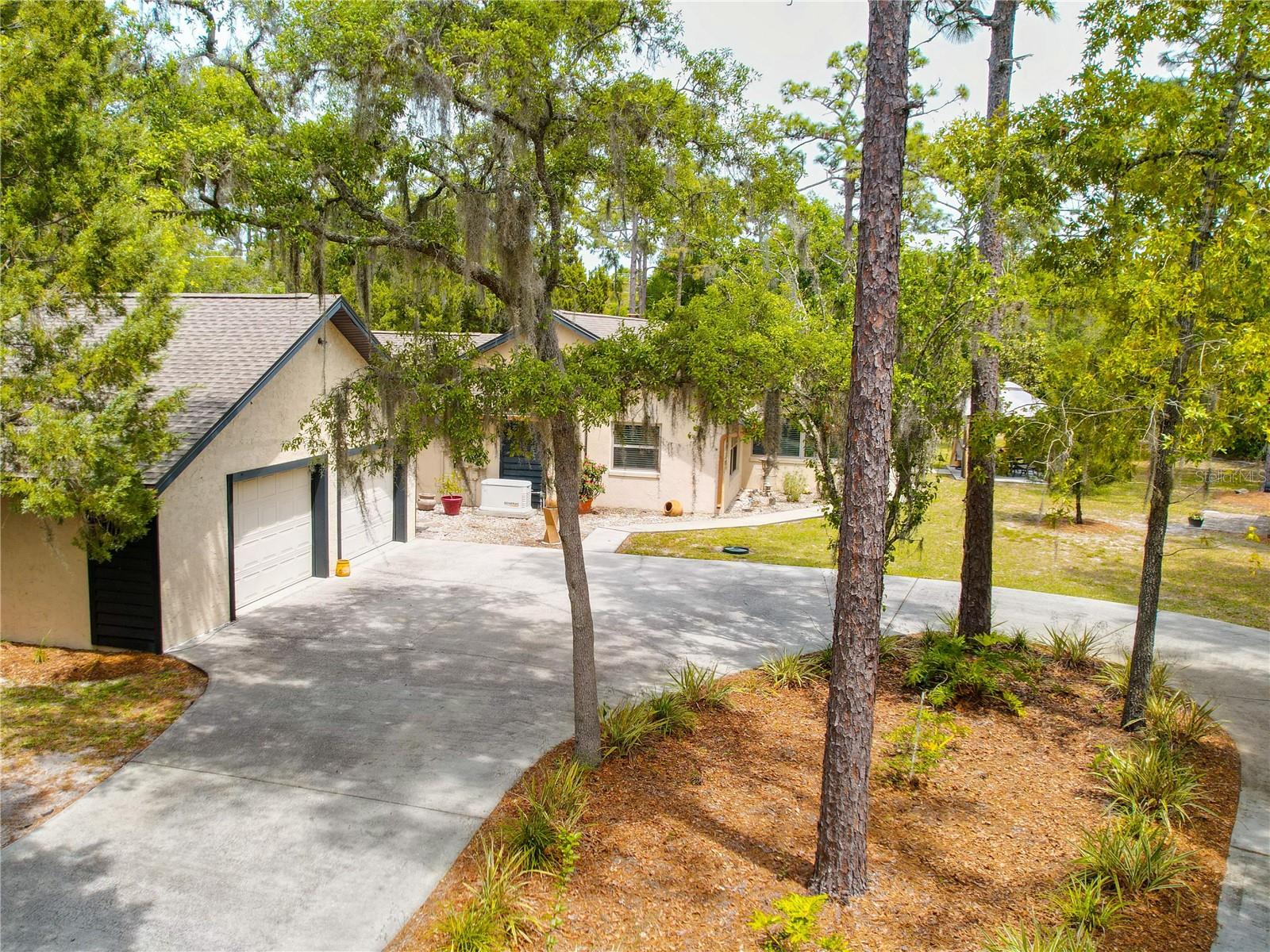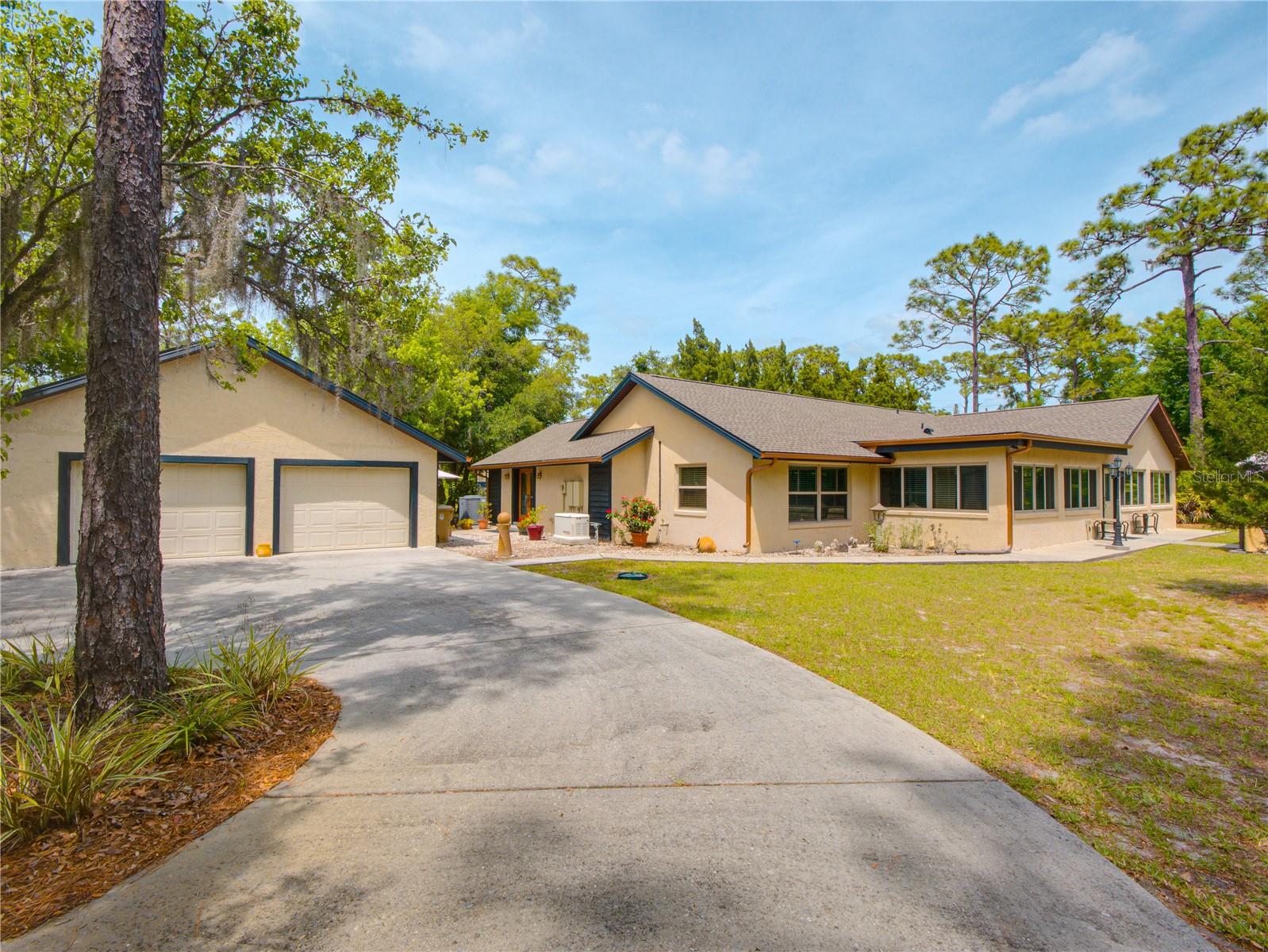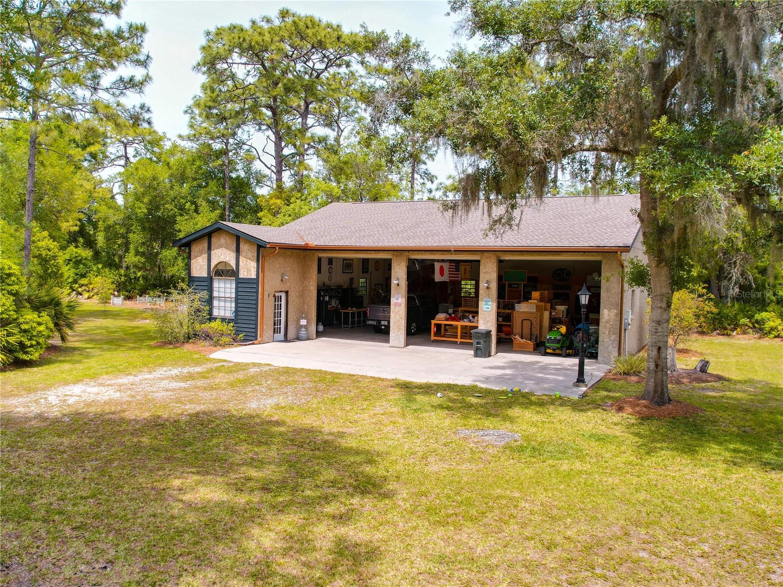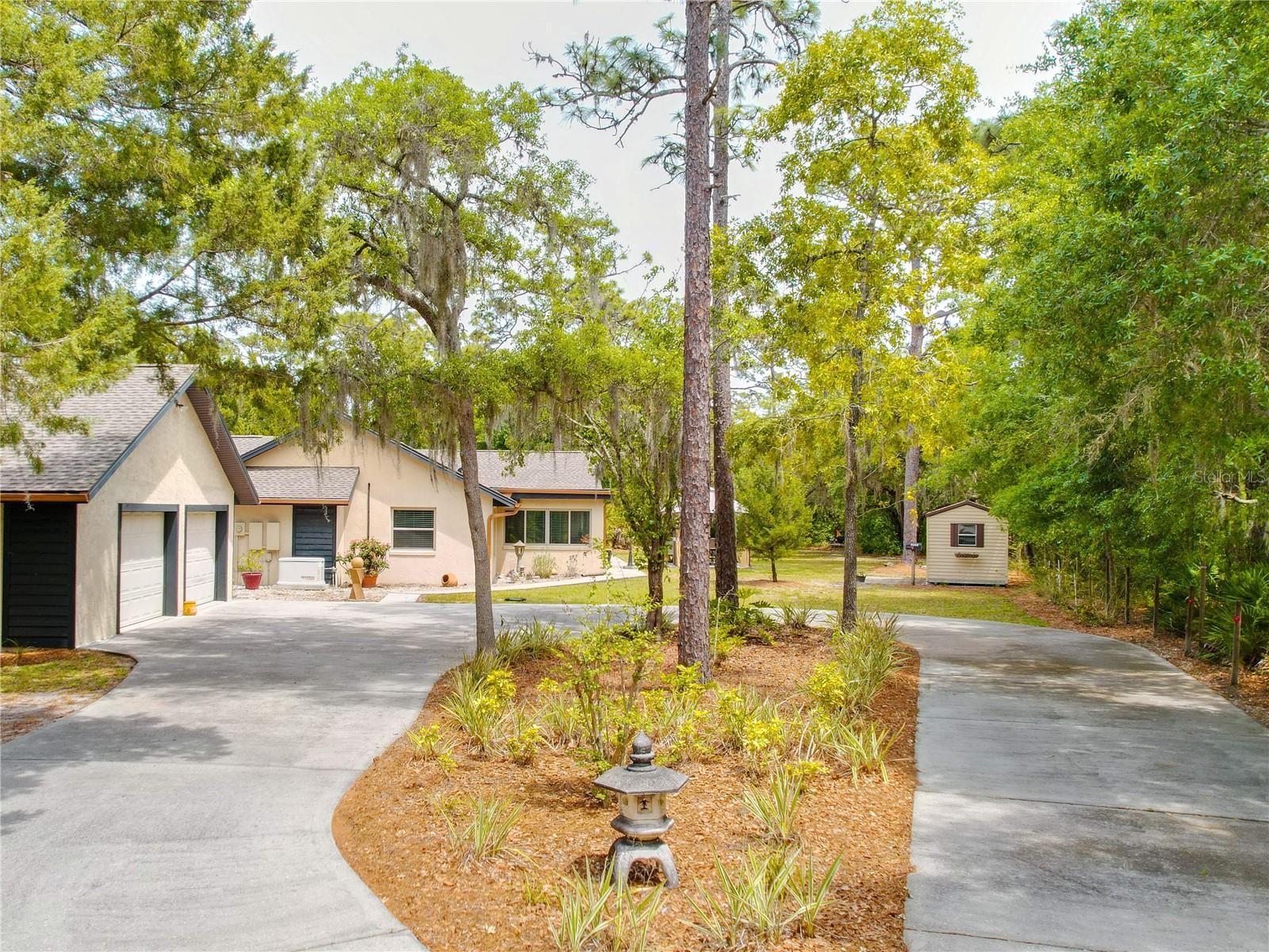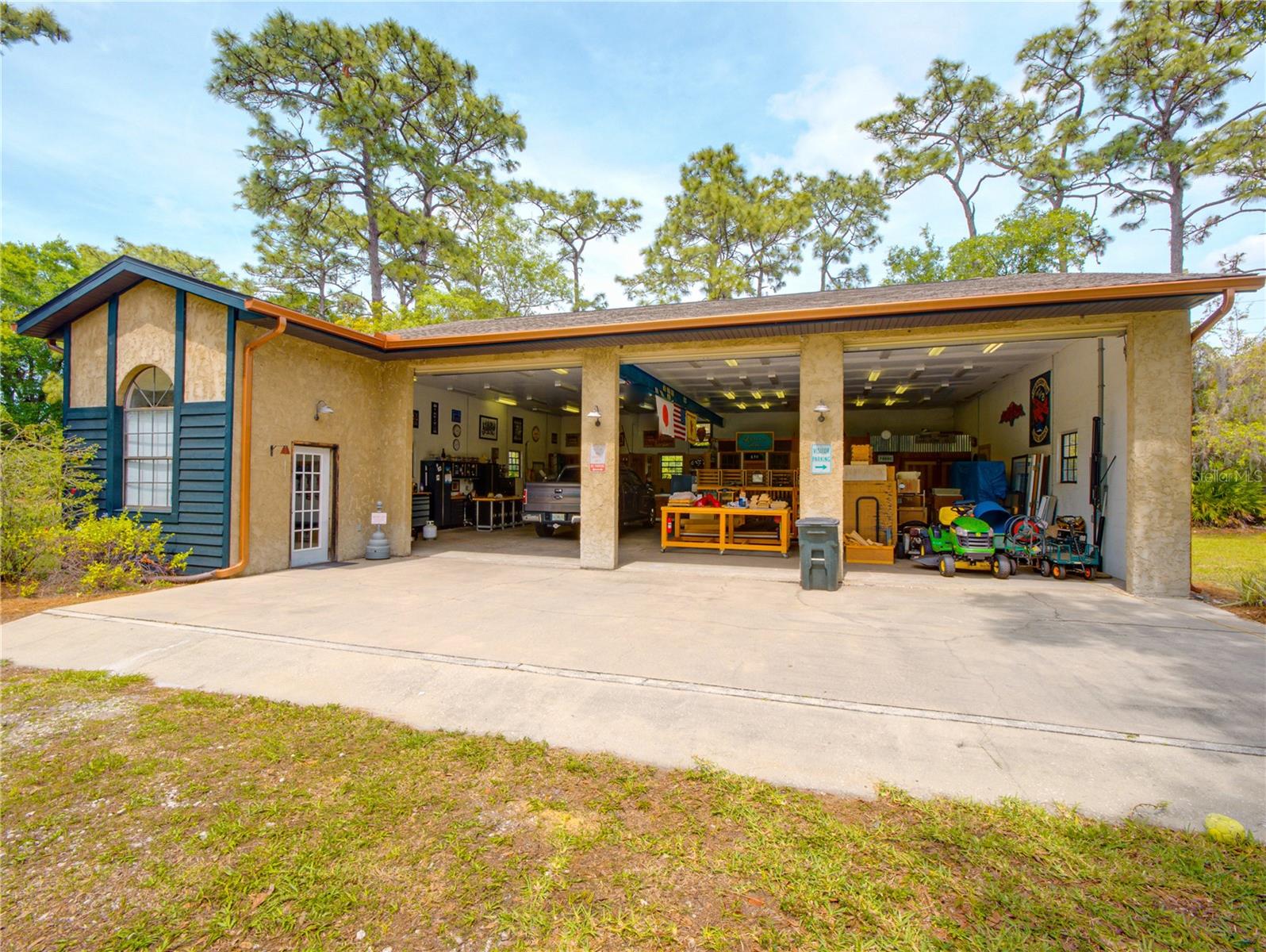 New Price and newly constructed wall and French doors for large 3rd bedroom/bonus room (7/2024). Rare find has room for all the space you need on private 2.42-acre mature wooded lot only 6 miles to Lake Nona area. Home has been renovated and updated top to bottom since 2017. Huge chefs' kitchen is centered in home with very open floor plan has access from all living areas with an abundance of solid surface quartz countertops, high-quality built-in appliances with pull out vented exhaust fan over cooktop, double ovens, 2 drawer dishwasher, custom built 42" cabinetry. Flooring was redone in all wood look porcelain tile with ceramic tile in bathrooms. All energy star double pane windows. Large primary bedroom featuring wood burning fireplace and adjacent office area, walk-in closet and ensuite bathroom. Need space for your business, RV, shop, or multicar garage? You found it here with separate 2380 sf is 50'x45'+12x10 attached office, solid block-built warehouse like space with 3-12-foot-high roll up doors, 2 end doors 14 feet wide and middle is 12 feet wide. Also has upgraded 200-amp service, separate from residence. Need more space? There is another 750 sf (30'x25') free-standing garage next to house off of the long circular driveway. Another 12x8 shed was built as grandkids playhouse. Exterior of residence was painted in 2022. All 3 roofs replaced 2021. Whole house re-plumbed and Generac generator with underground propane tank 2018. New 16 seer HVAC 4/2021. New well was done 1 year before current owner (2016).All of the 2.42 acres is wire fenced with 2 metal driveway gates.