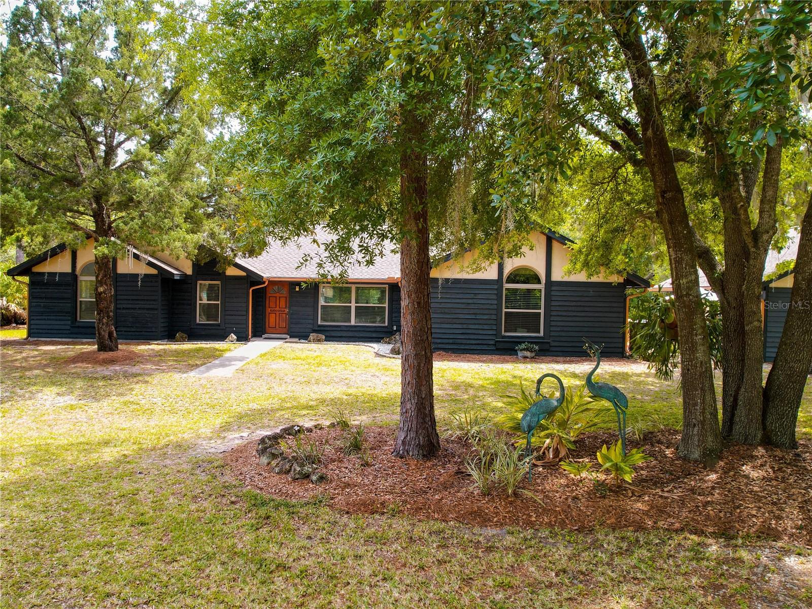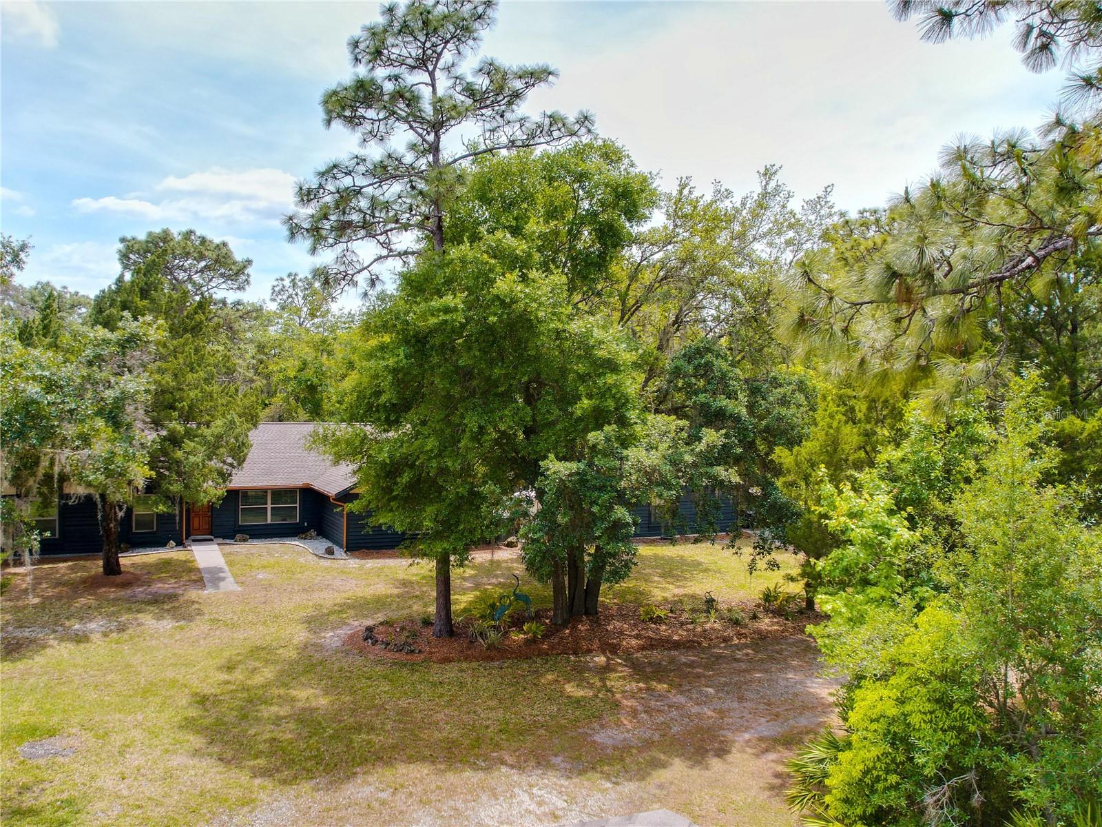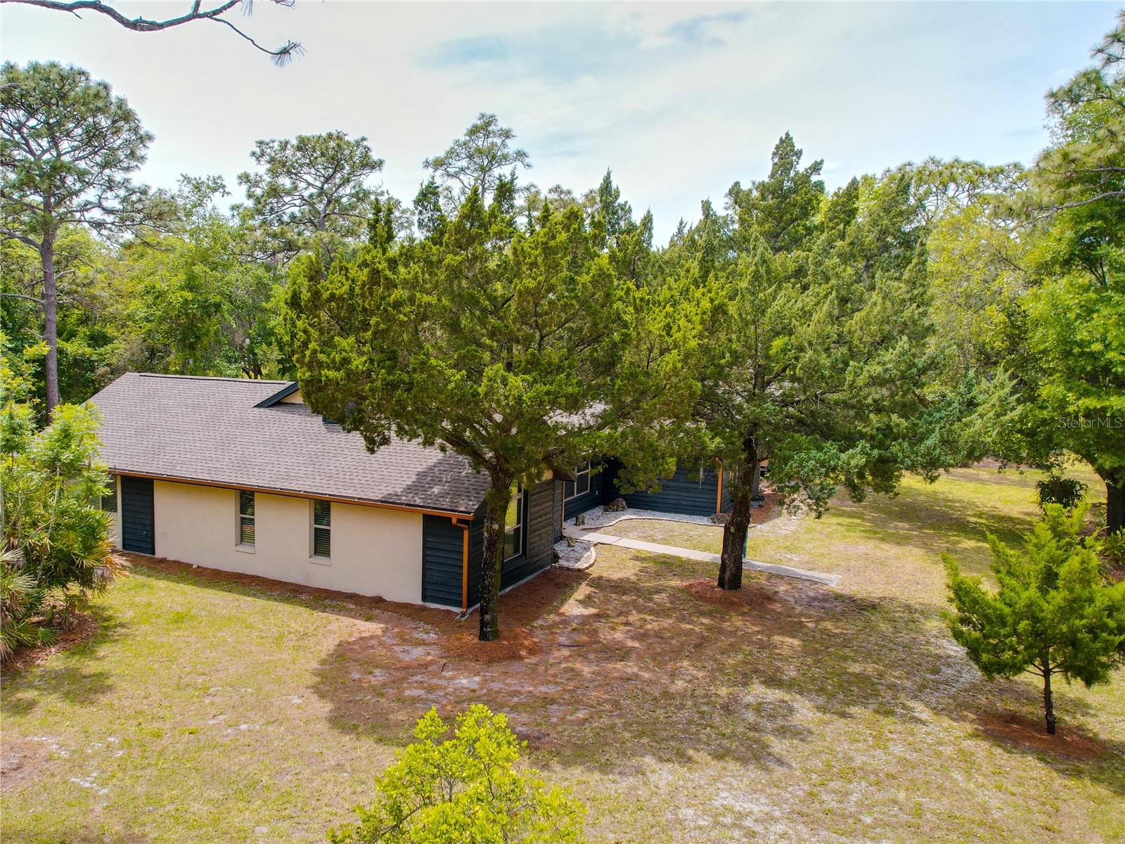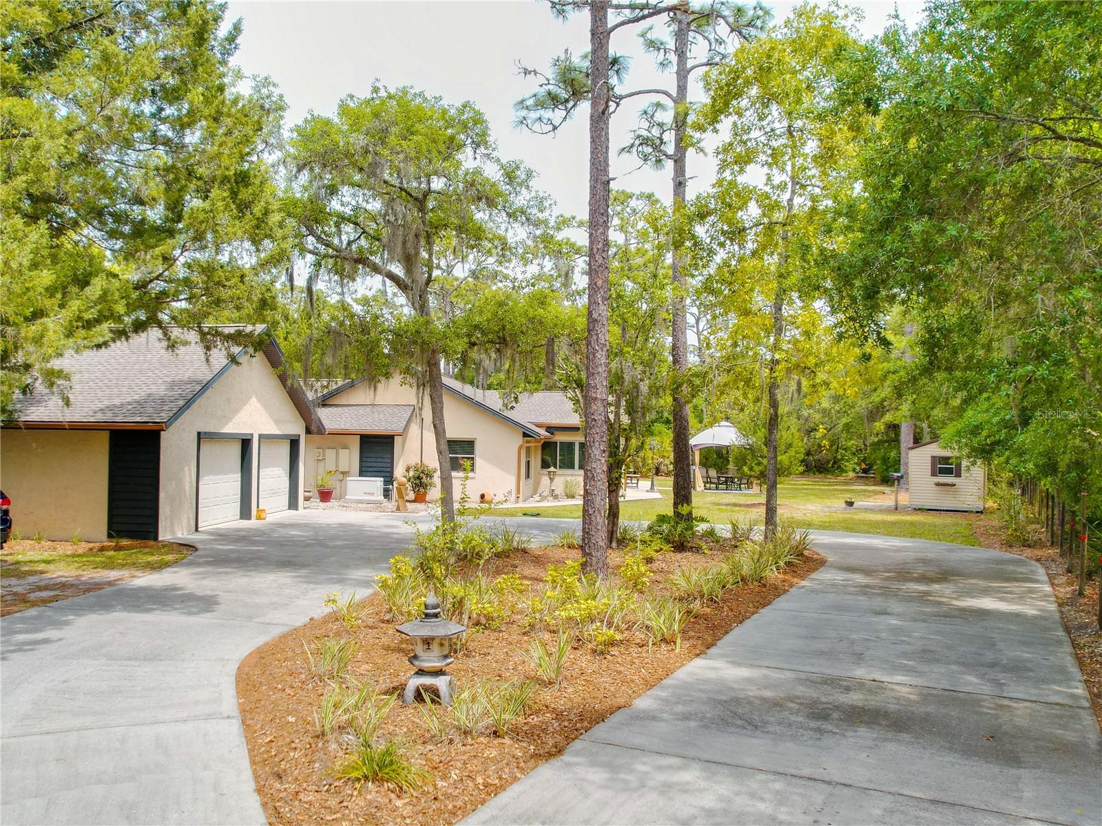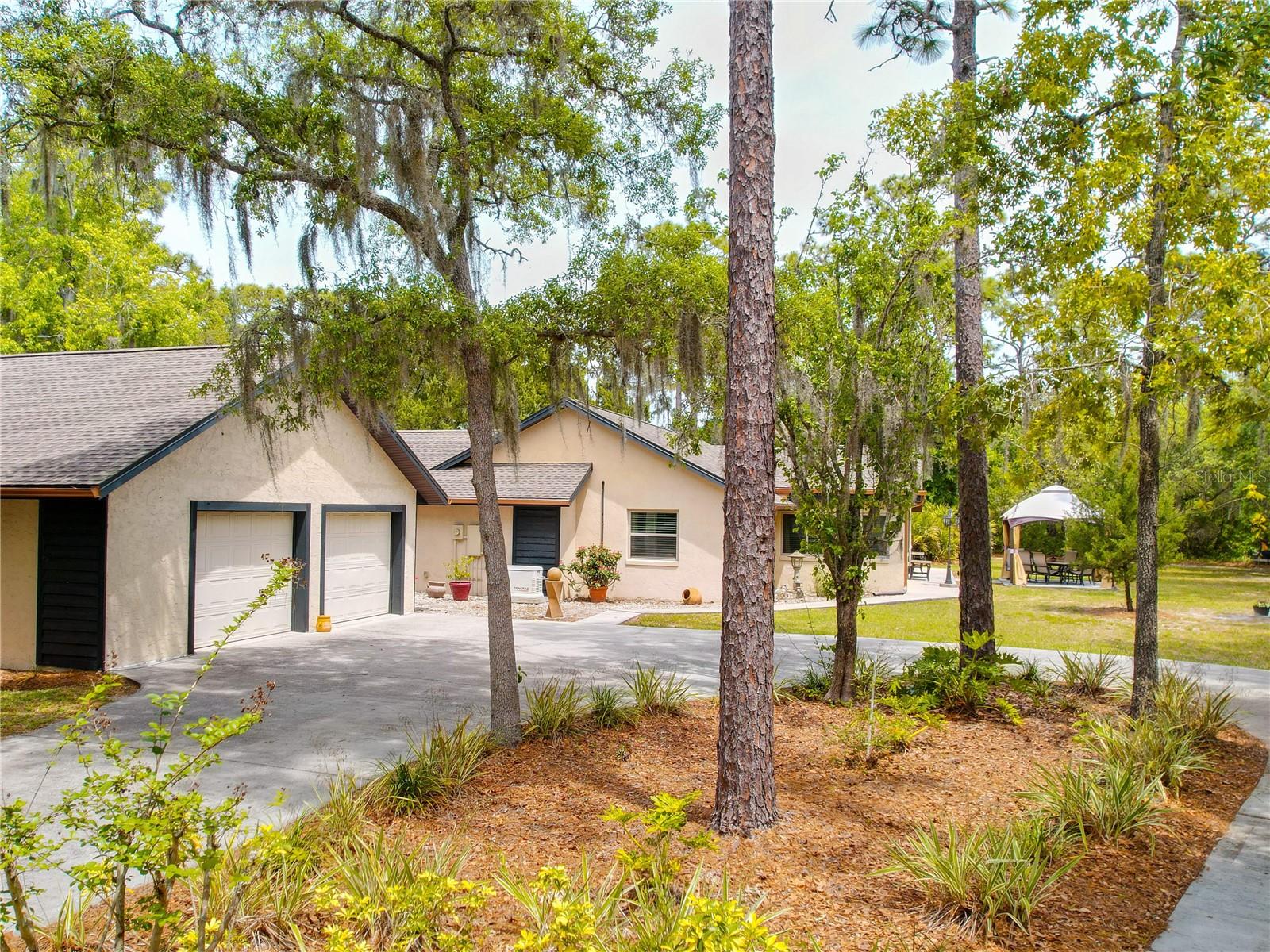 New Price and newly constructed wall and French doors for large 3rd bedroom/bonus room (7/2024). Rare find has room for all the space you need on private 2.42-acre mature wooded lot only 6 miles to Lake Nona area. Home has been renovated and updated top to bottom since 2017. Huge chefs' kitchen is centered in home with very open floor plan has access from all living areas with an abundance of solid surface quartz countertops, high-quality built-in appliances with pull out vented exhaust fan over cooktop, double ovens, 2 drawer dishwasher, custom built 42" cabinetry. Flooring was redone in all wood look porcelain tile with ceramic tile in bathrooms. All energy star double pane windows. Large primary bedroom featuring wood burning fireplace and adjacent office area, walk-in closet and ensuite bathroom. Need space for your business, RV, shop, or multicar garage? You found it here with separate 2380 sf is 50'x45'+12x10 attached office, solid block-built warehouse like space with 3-12-foot-high roll up doors, 2 end doors 14 feet wide and middle is 12 feet wide. Also has upgraded 200-amp service, separate from residence. Need more space? There is another 750 sf (30'x25') free-standing garage next to house off of the long circular driveway. Another 12x8 shed was built as grandkids playhouse. Exterior of residence was painted in 2022. All 3 roofs replaced 2021. Whole house re-plumbed and Generac generator with underground propane tank 2018. New 16 seer HVAC 4/2021. New well was done 1 year before current owner (2016).All of the 2.42 acres is wire fenced with 2 metal driveway gates.
