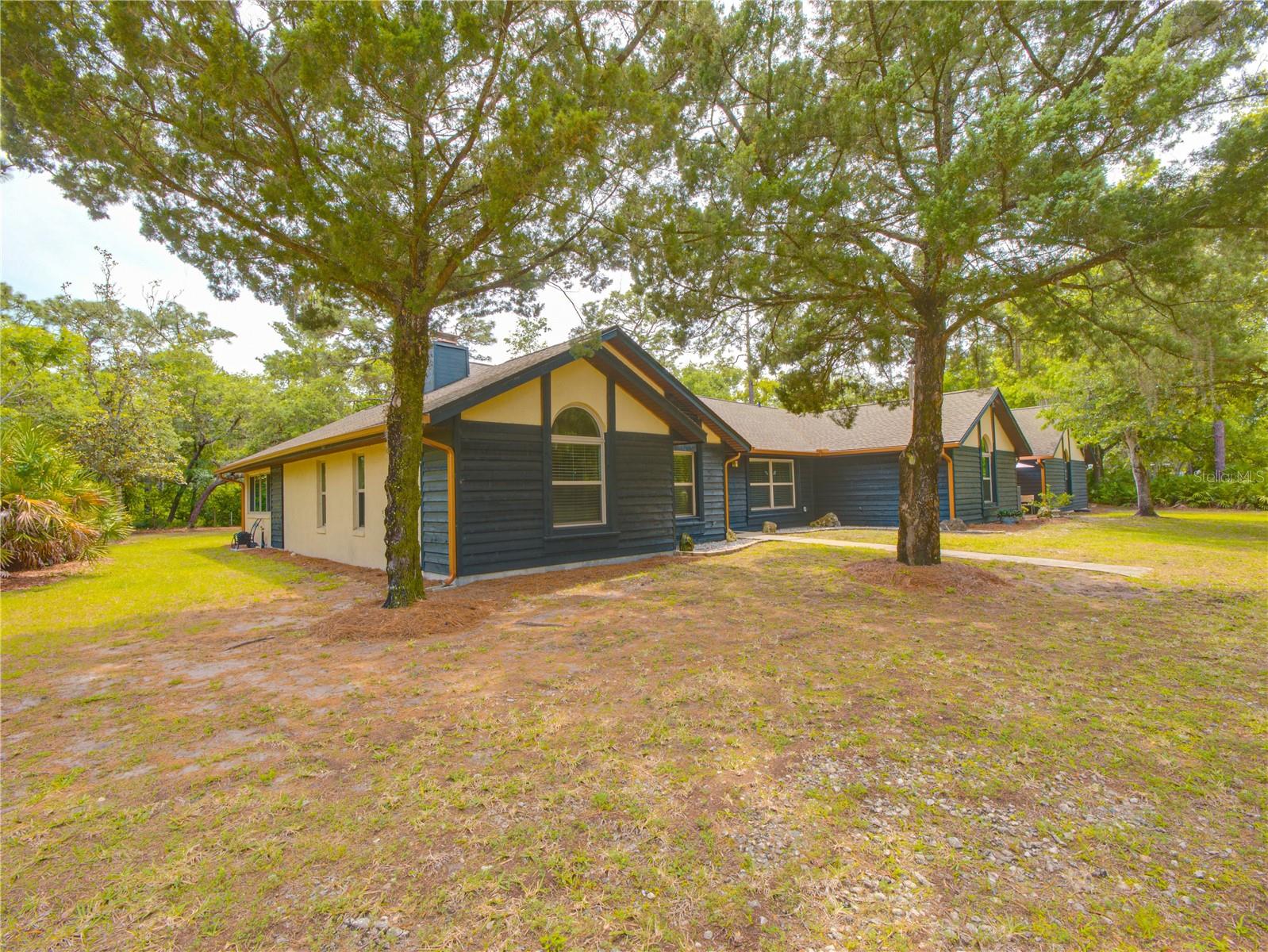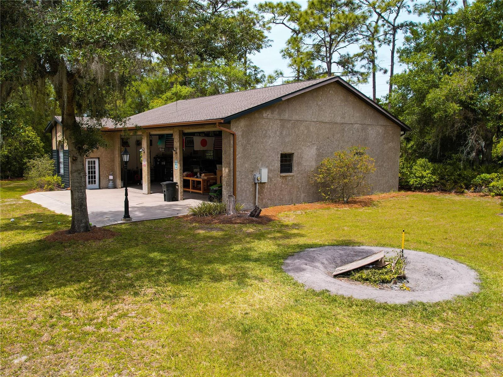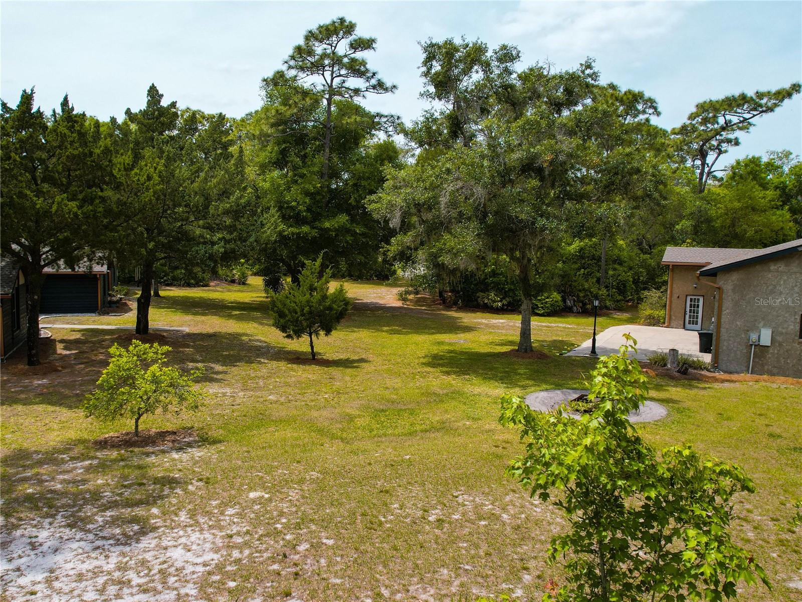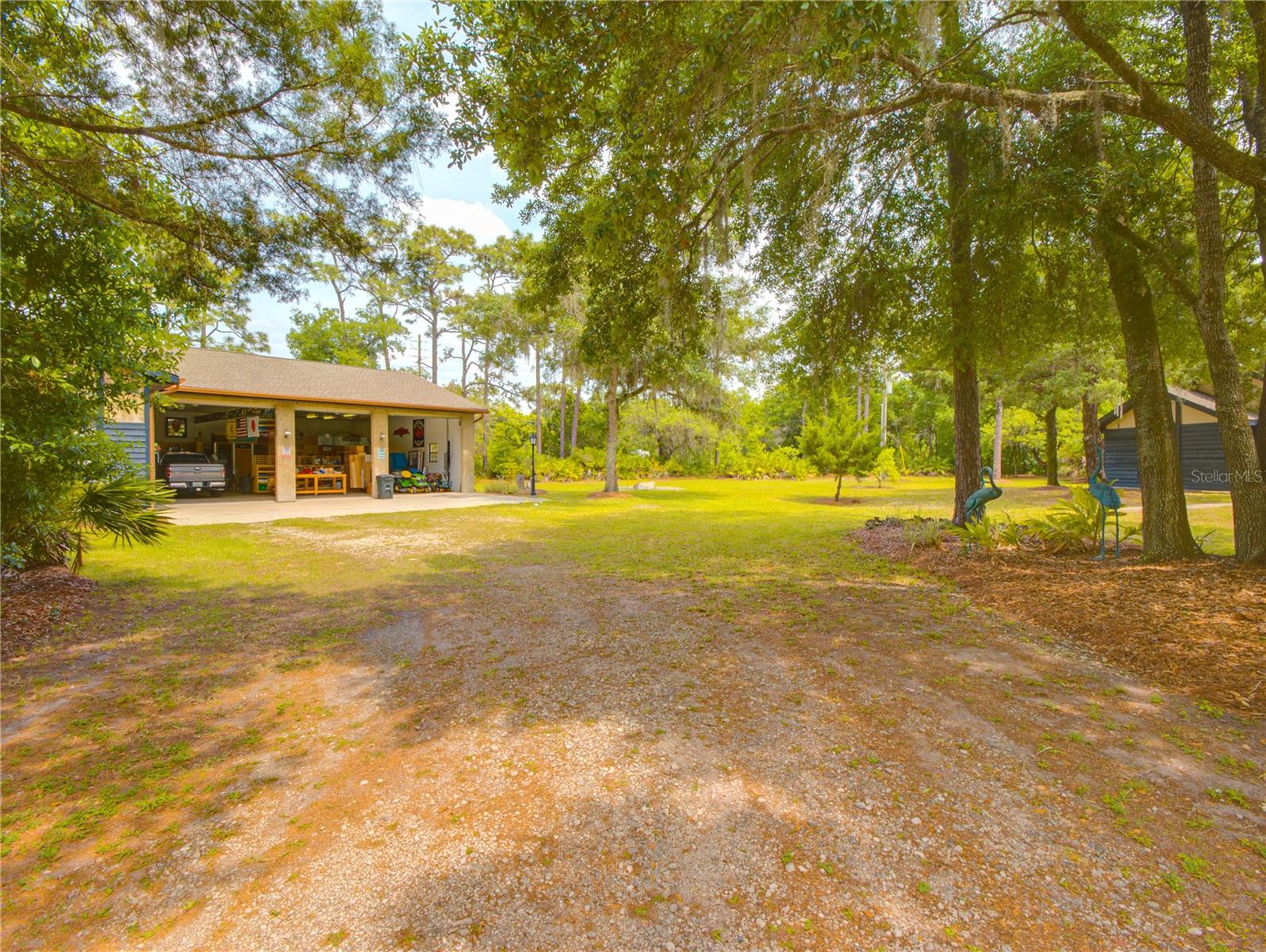 New Price and newly constructed wall and French doors for large 3rd bedroom/bonus room (7/2024). Rare find has room for all the space you need on private 2.42-acre mature wooded lot only 6 miles to Lake Nona area. Home has been renovated and updated top to bottom since 2017. Huge chefs' kitchen is centered in home with very open floor plan has access from all living areas with an abundance of solid surface quartz countertops, high-quality built-in appliances with pull out vented exhaust fan over cooktop, double ovens, 2 drawer dishwasher, custom built 42" cabinetry. Flooring was redone in all wood look porcelain tile with ceramic tile in bathrooms. All energy star double pane windows. Large primary bedroom featuring wood burning fireplace and adjacent office area, walk-in closet and ensuite bathroom. Need space for your business, RV, shop, or multicar garage? You found it here with separate 2380 sf is 50'x45'+12x10 attached office, solid block-built warehouse like space with 3-12-foot-high roll up doors, 2 end doors 14 feet wide and middle is 12 feet wide. Also has upgraded 200-amp service, separate from residence. Need more space? There is another 750 sf (30'x25') free-standing garage next to house off of the long circular driveway. Another 12x8 shed was built as grandkids playhouse. Exterior of residence was painted in 2022. All 3 roofs replaced 2021. Whole house re-plumbed and Generac generator with underground propane tank 2018. New 16 seer HVAC 4/2021. New well was done 1 year before current owner (2016).All of the 2.42 acres is wire fenced with 2 metal driveway gates.