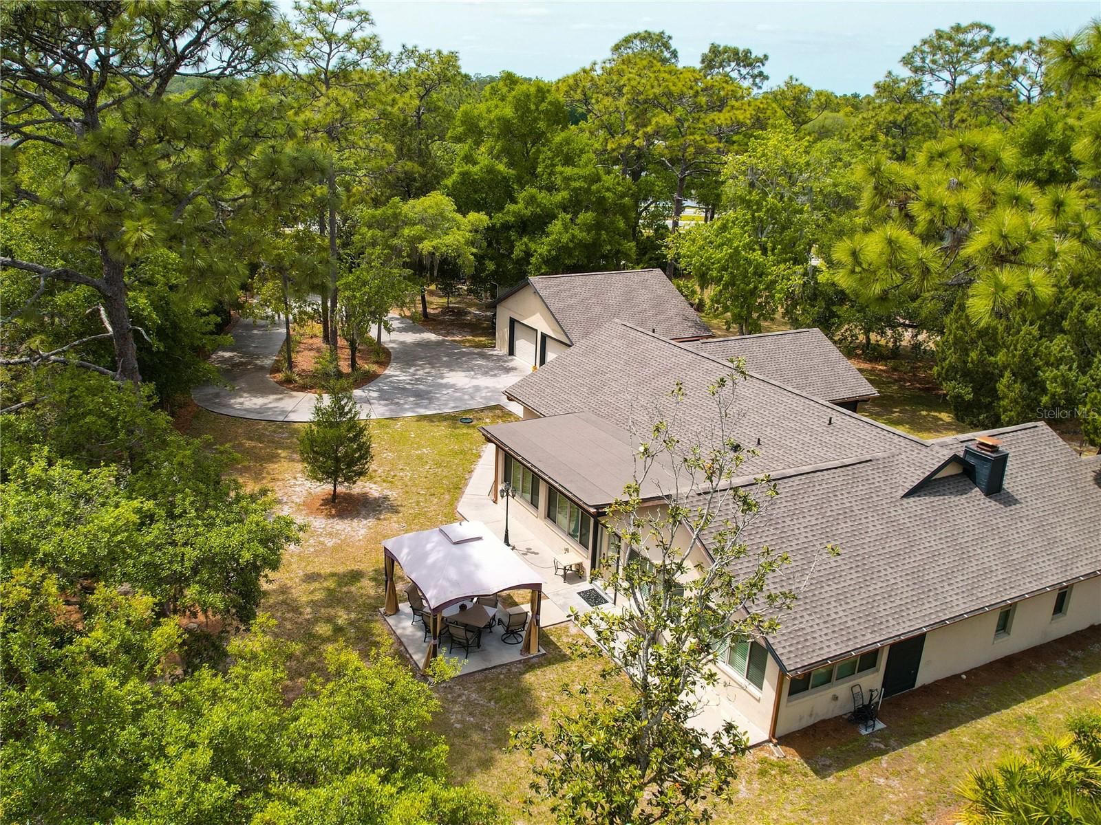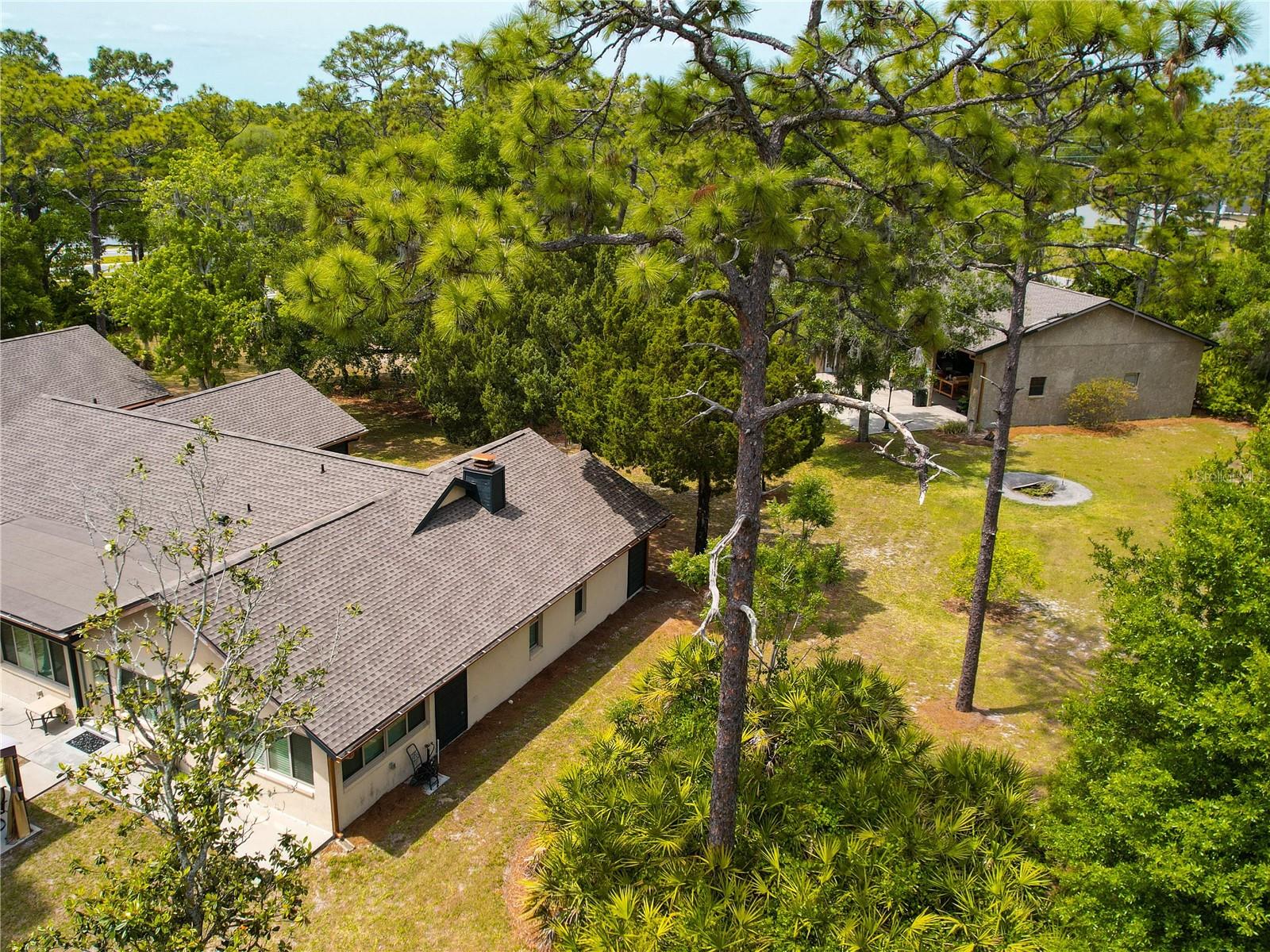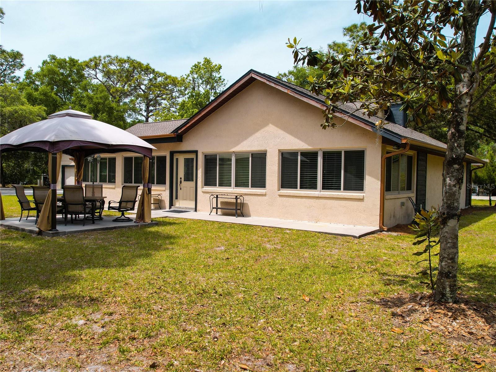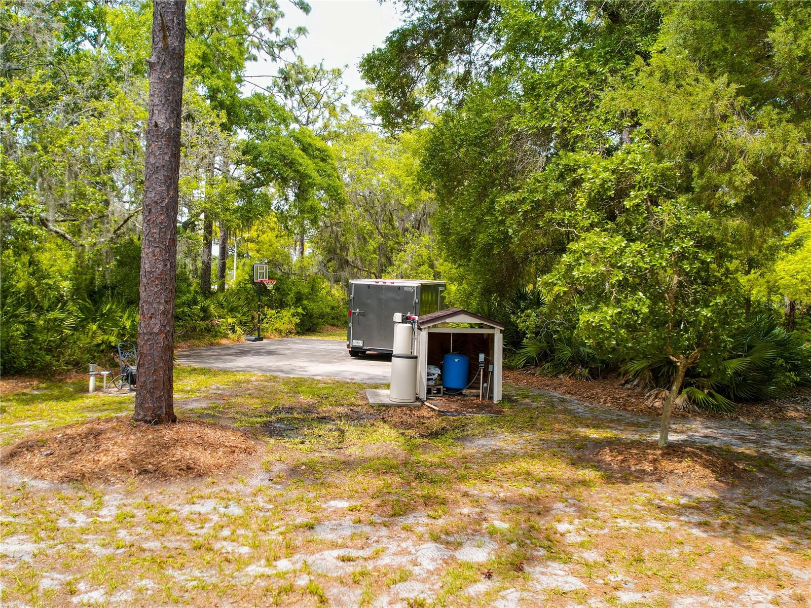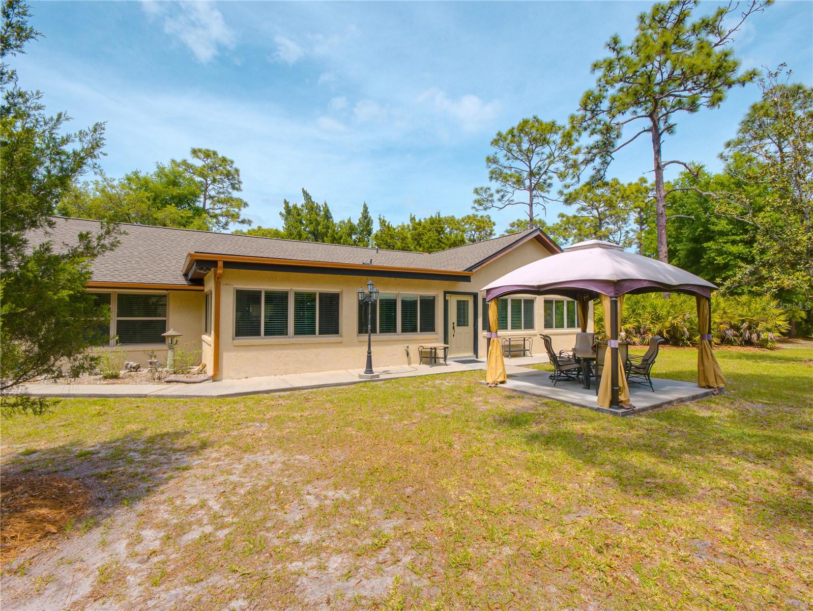 New Price and newly constructed wall and French doors for large 3rd bedroom/bonus room (7/2024). Rare find has room for all the space you need on private 2.42-acre mature wooded lot only 6 miles to Lake Nona area. Home has been renovated and updated top to bottom since 2017. Huge chefs' kitchen is centered in home with very open floor plan has access from all living areas with an abundance of solid surface quartz countertops, high-quality built-in appliances with pull out vented exhaust fan over cooktop, double ovens, 2 drawer dishwasher, custom built 42" cabinetry. Flooring was redone in all wood look porcelain tile with ceramic tile in bathrooms. All energy star double pane windows. Large primary bedroom featuring wood burning fireplace and adjacent office area, walk-in closet and ensuite bathroom. Need space for your business, RV, shop, or multicar garage? You found it here with separate 2380 sf is 50'x45'+12x10 attached office, solid block-built warehouse like space with 3-12-foot-high roll up doors, 2 end doors 14 feet wide and middle is 12 feet wide. Also has upgraded 200-amp service, separate from residence. Need more space? There is another 750 sf (30'x25') free-standing garage next to house off of the long circular driveway. Another 12x8 shed was built as grandkids playhouse. Exterior of residence was painted in 2022. All 3 roofs replaced 2021. Whole house re-plumbed and Generac generator with underground propane tank 2018. New 16 seer HVAC 4/2021. New well was done 1 year before current owner (2016).All of the 2.42 acres is wire fenced with 2 metal driveway gates.