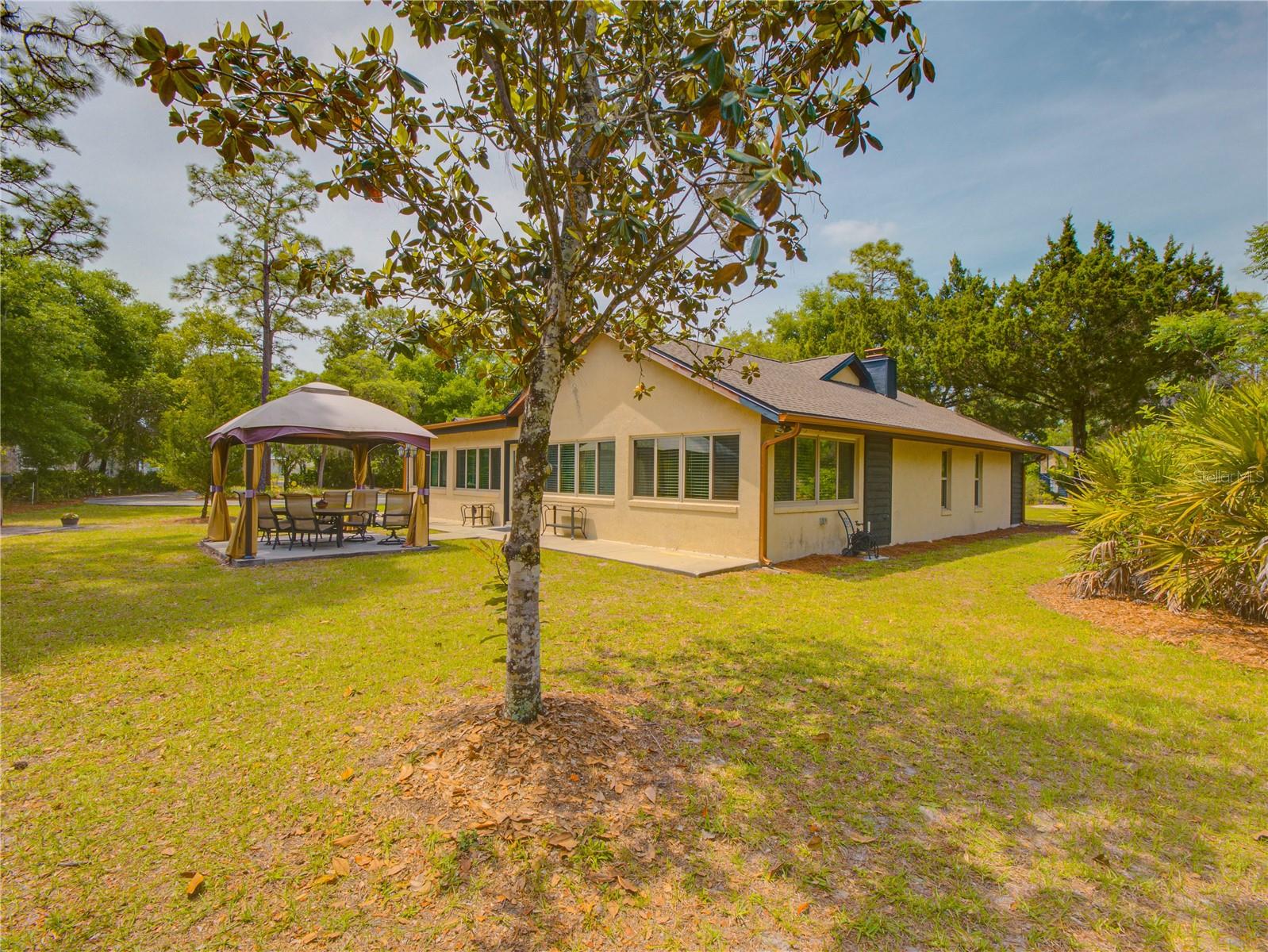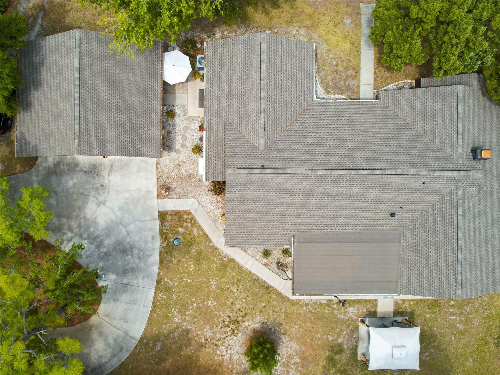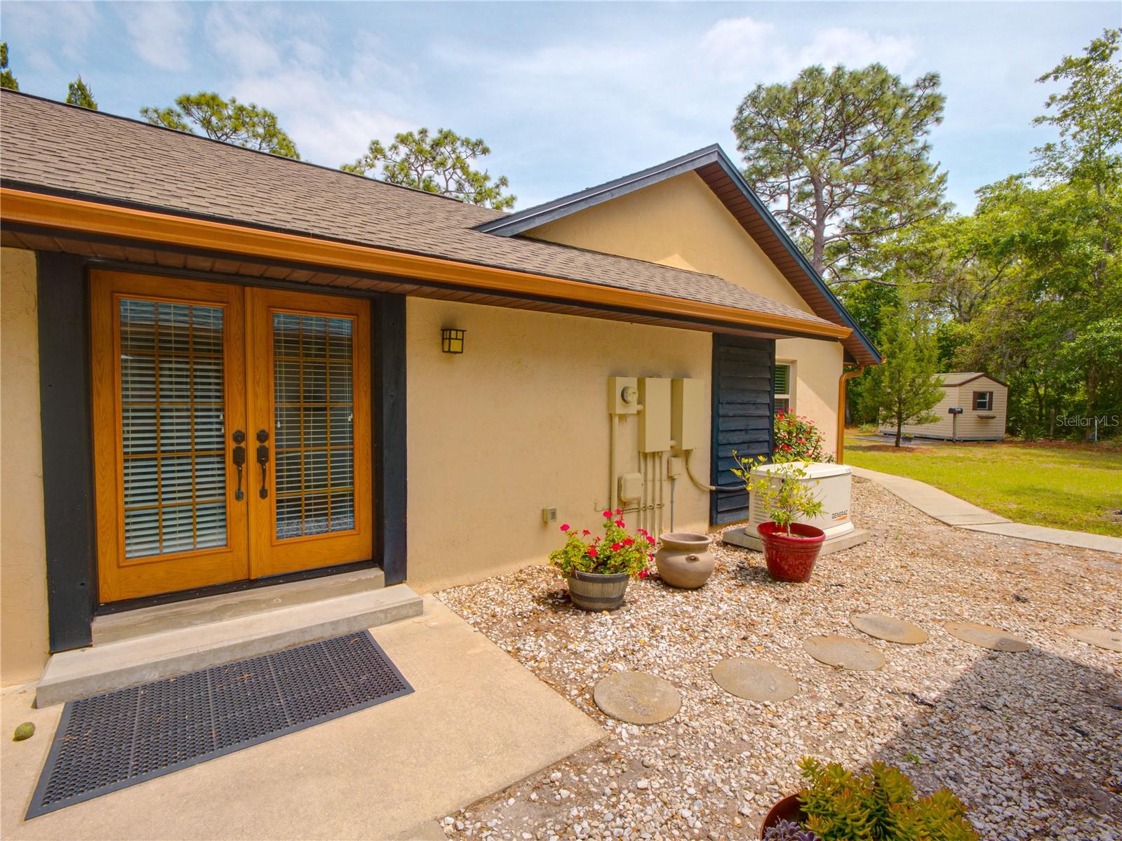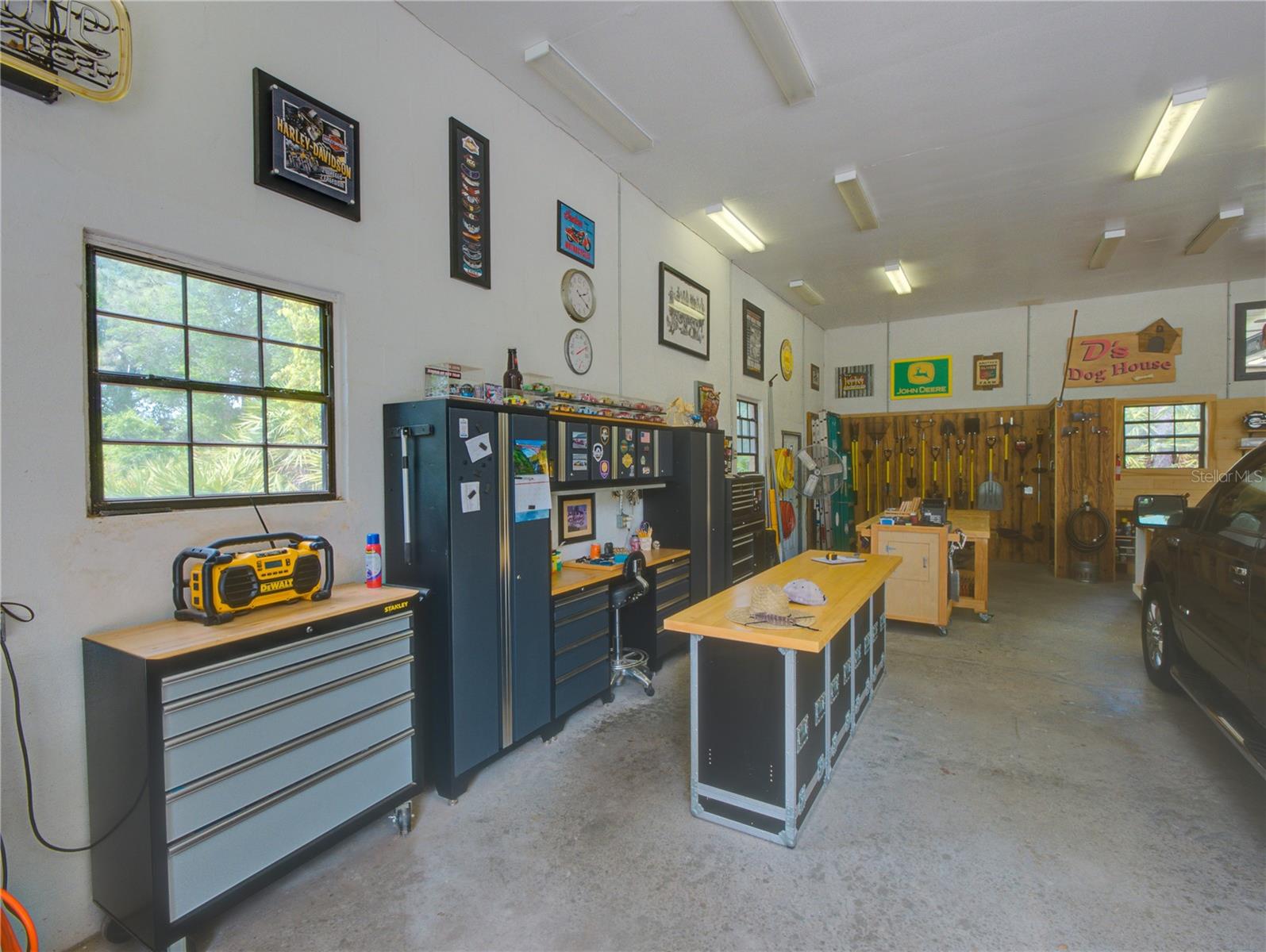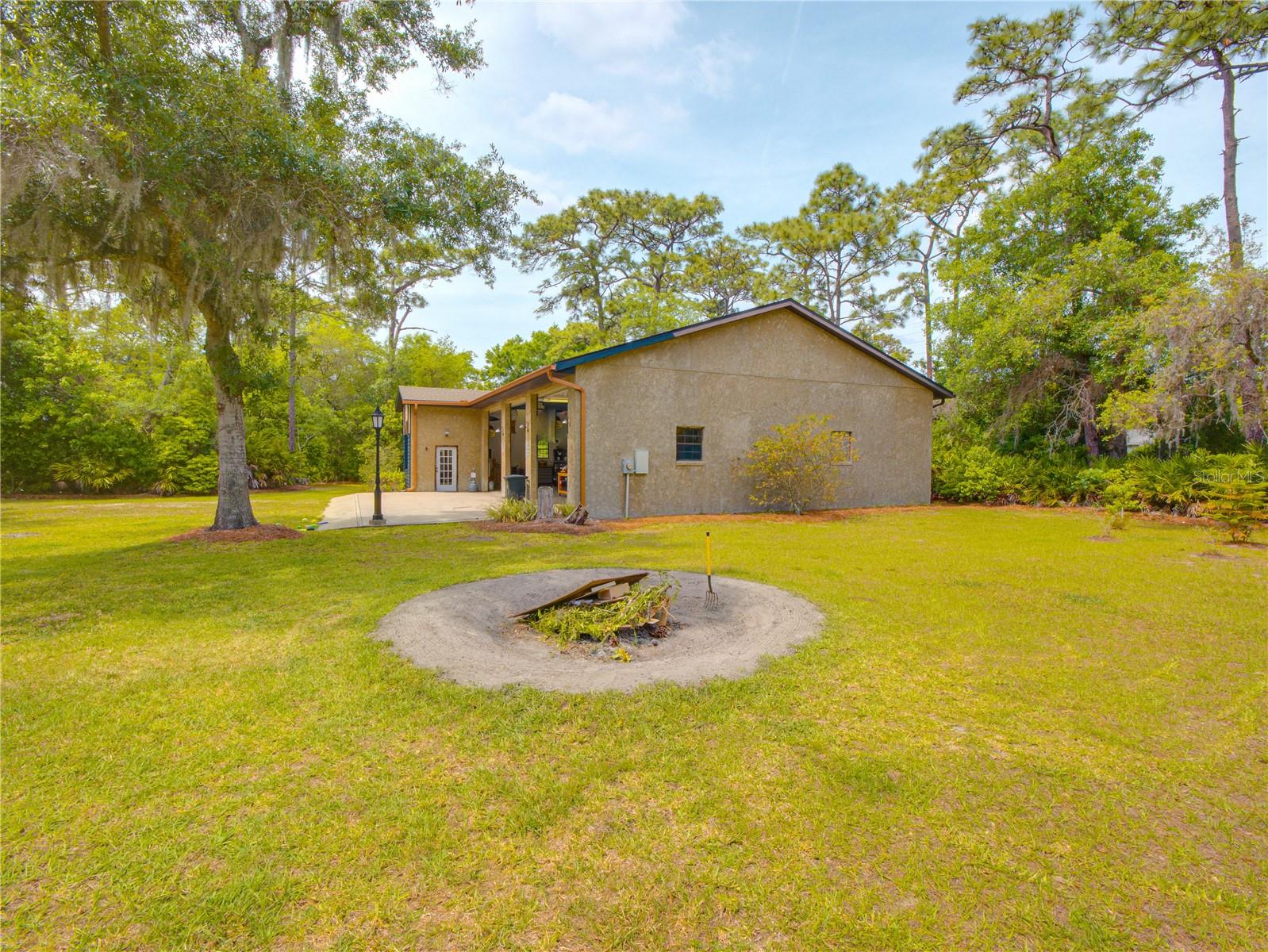 New Price and newly constructed wall and French doors for large 3rd bedroom/bonus room (7/2024). Rare find has room for all the space you need on private 2.42-acre mature wooded lot only 6 miles to Lake Nona area. Home has been renovated and updated top to bottom since 2017. Huge chefs' kitchen is centered in home with very open floor plan has access from all living areas with an abundance of solid surface quartz countertops, high-quality built-in appliances with pull out vented exhaust fan over cooktop, double ovens, 2 drawer dishwasher, custom built 42" cabinetry. Flooring was redone in all wood look porcelain tile with ceramic tile in bathrooms. All energy star double pane windows. Large primary bedroom featuring wood burning fireplace and adjacent office area, walk-in closet and ensuite bathroom. Need space for your business, RV, shop, or multicar garage? You found it here with separate 2380 sf is 50'x45'+12x10 attached office, solid block-built warehouse like space with 3-12-foot-high roll up doors, 2 end doors 14 feet wide and middle is 12 feet wide. Also has upgraded 200-amp service, separate from residence. Need more space? There is another 750 sf (30'x25') free-standing garage next to house off of the long circular driveway. Another 12x8 shed was built as grandkids playhouse. Exterior of residence was painted in 2022. All 3 roofs replaced 2021. Whole house re-plumbed and Generac generator with underground propane tank 2018. New 16 seer HVAC 4/2021. New well was done 1 year before current owner (2016).All of the 2.42 acres is wire fenced with 2 metal driveway gates.