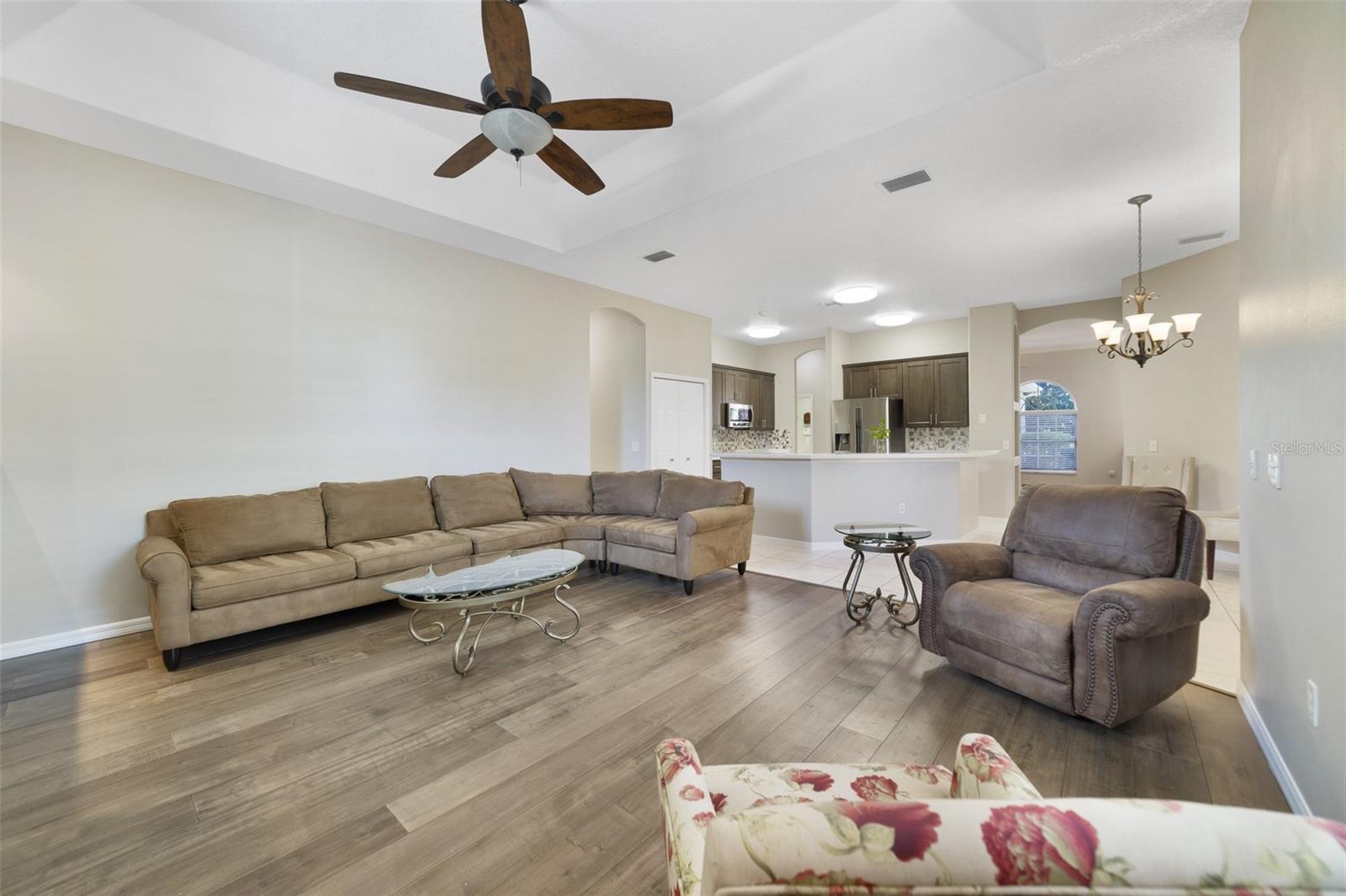 This is the Florida paradise you have been searching for. This beautiful 4 bedroom 2 bath, one story home has been freshly updated with new cabinets and engineered Hardwood that shows an elegant Kitchen and Family room combo that is perfect for entertaining. Master bath has also been updated! Toilets have been replaced with easy to stand up higher bowls. Separate formal living room and dining room insures that the home will be perfect for all your guests when they come to visit. Step out to the screened back porch and ease into your soothing and massaging hot tub that was recently added, or step out to get some Florida sun and take a swim in the pool! Home includes translucent hurricane shutters to allow some light in while using them. This community is located just minutes from the Florida turnpike which makes access to Downtown Orlando, Theme Parks and everything Central Florida offers very convenient. Camelot is also a gated community with large wide lots that give tons of space between homes, this lot is perfect because it's on a corner and has over a third of an acre. Communities like this one don't get built anymore with that much buffer between neighboring homes! Don't miss this amazing home, book your appointment now!